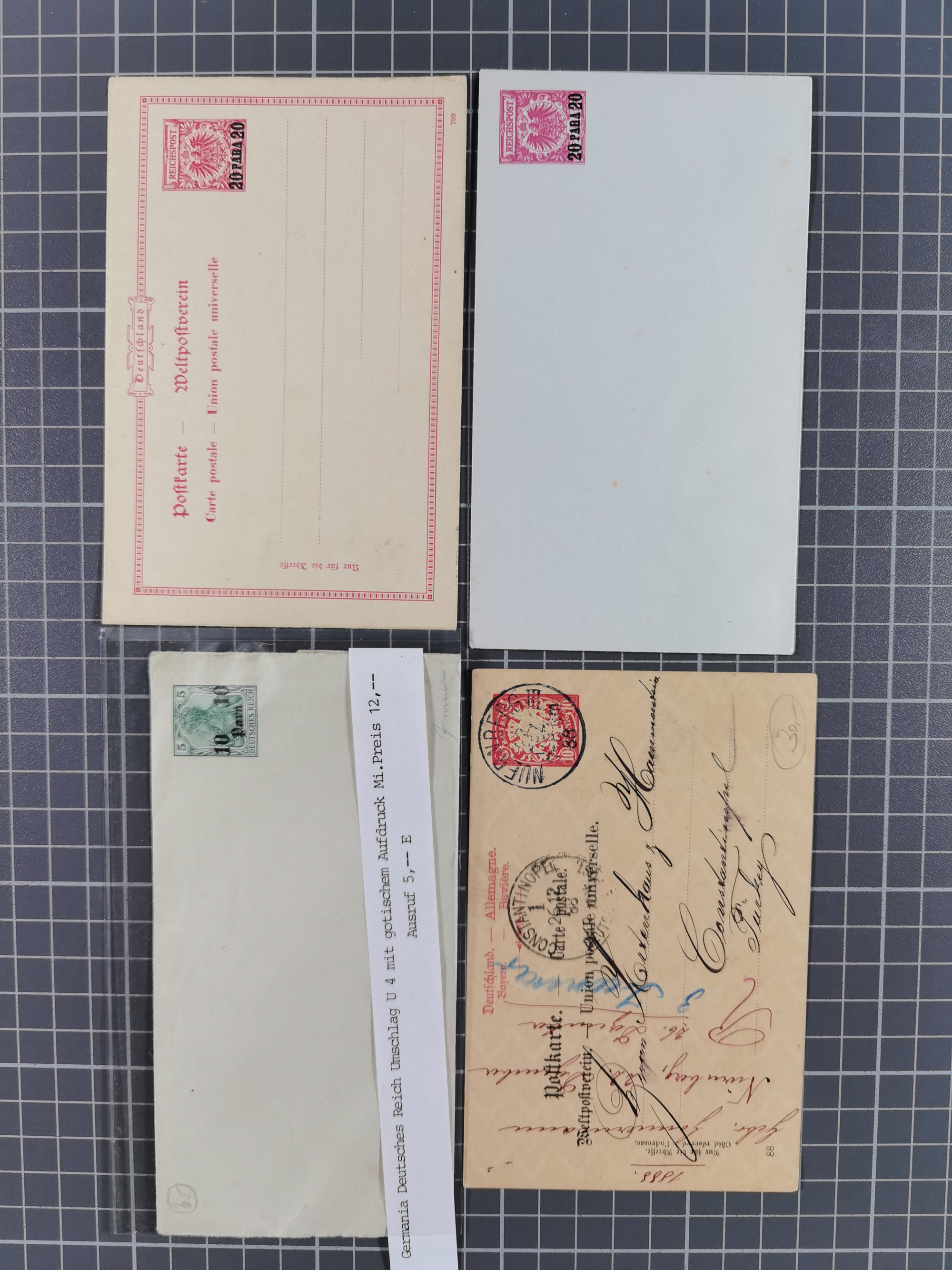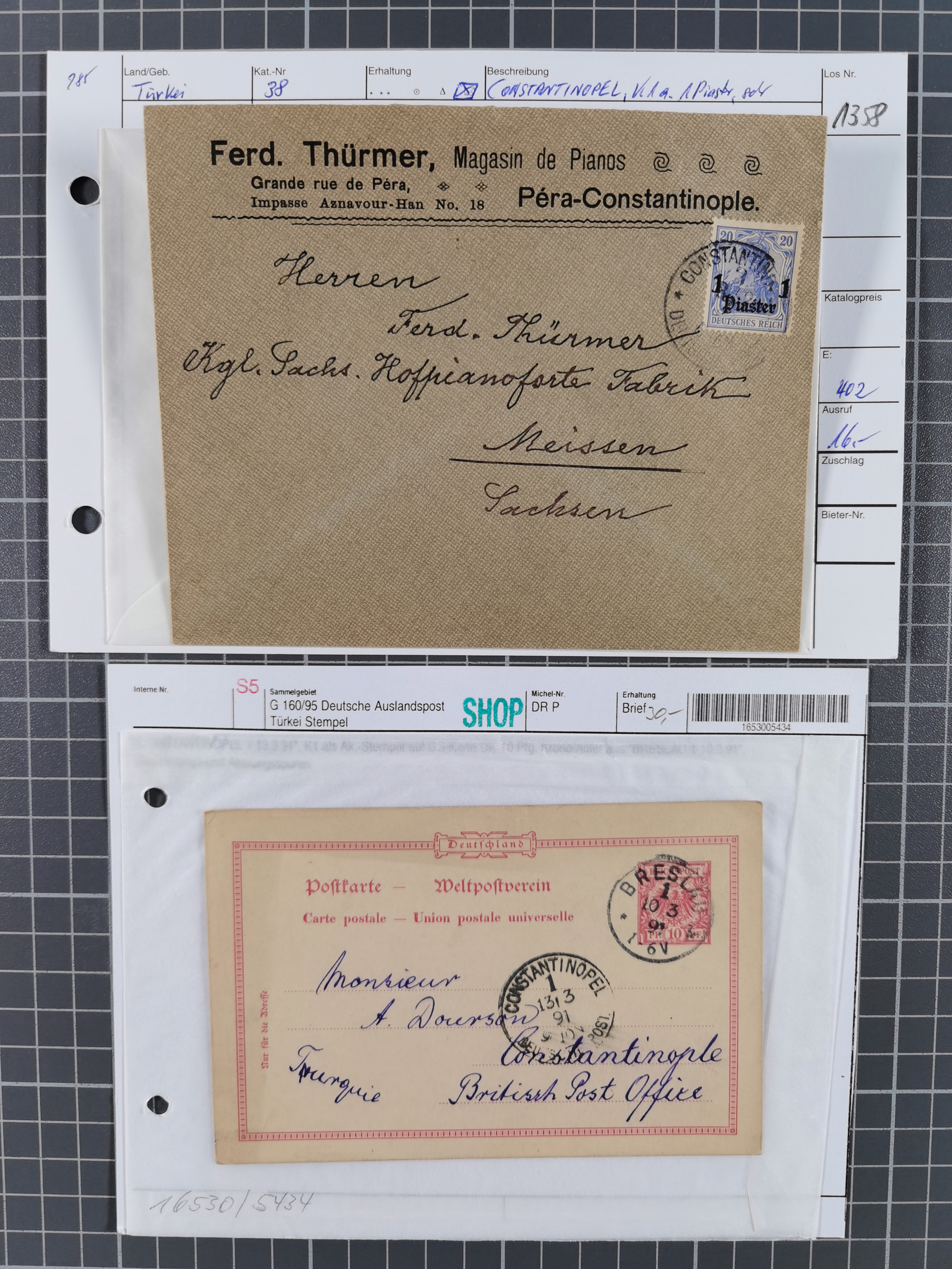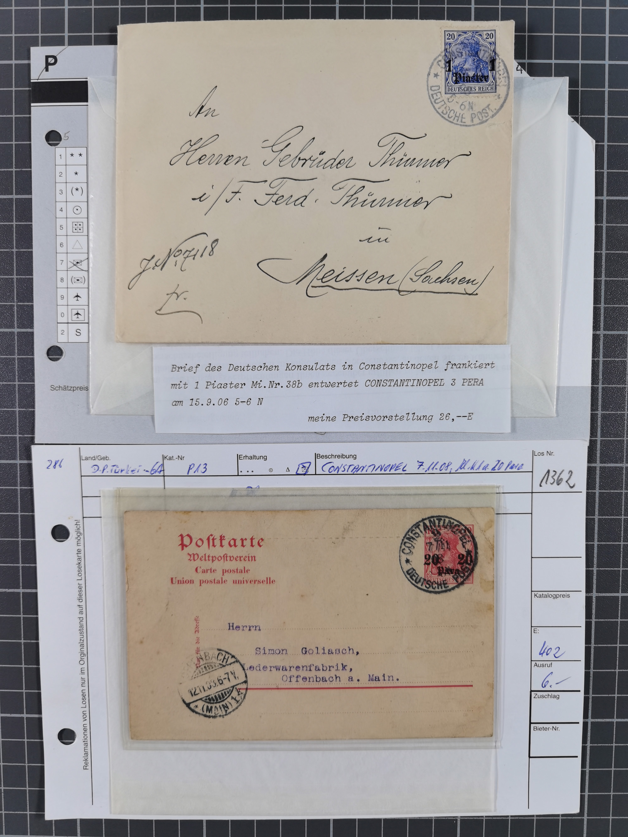 1890, 2 Mark dunkelrotkarmin im waagerechten Paar in Mischfrankatur mit Ausgabe1899 2½ Piaster auf 50 Pfennig lebhaftrötlichbraun im waagerechten Paar und senkrechtes Paar 20 Pfennig violettultramarin je mit Stempel “CONSTANTINOPEL DP 1 26.3.98” auf Paketkarten-Stammteil für drei Pakete via Rumänien und Dresden nach Leipzig mit Ankunftsstempel. Die obere Marke ist fehlerhaft und ein Wert der 2 Mark ist etwas fleckig sowie das Formular mit Bugspuren und etwas verfärbt. Trotz der Einschränkungen eine recht hohe und seltene Frankatur, signiert Pfenninger und Fotoattest R. Steuer BPP (2003)