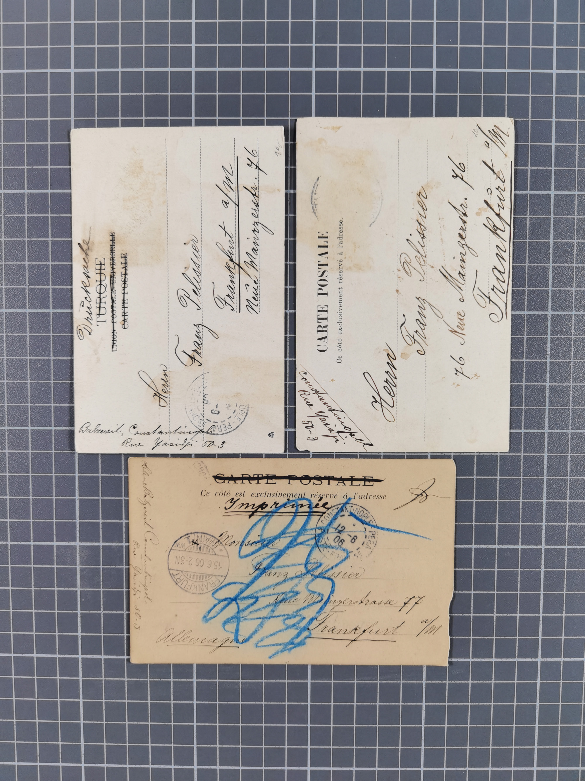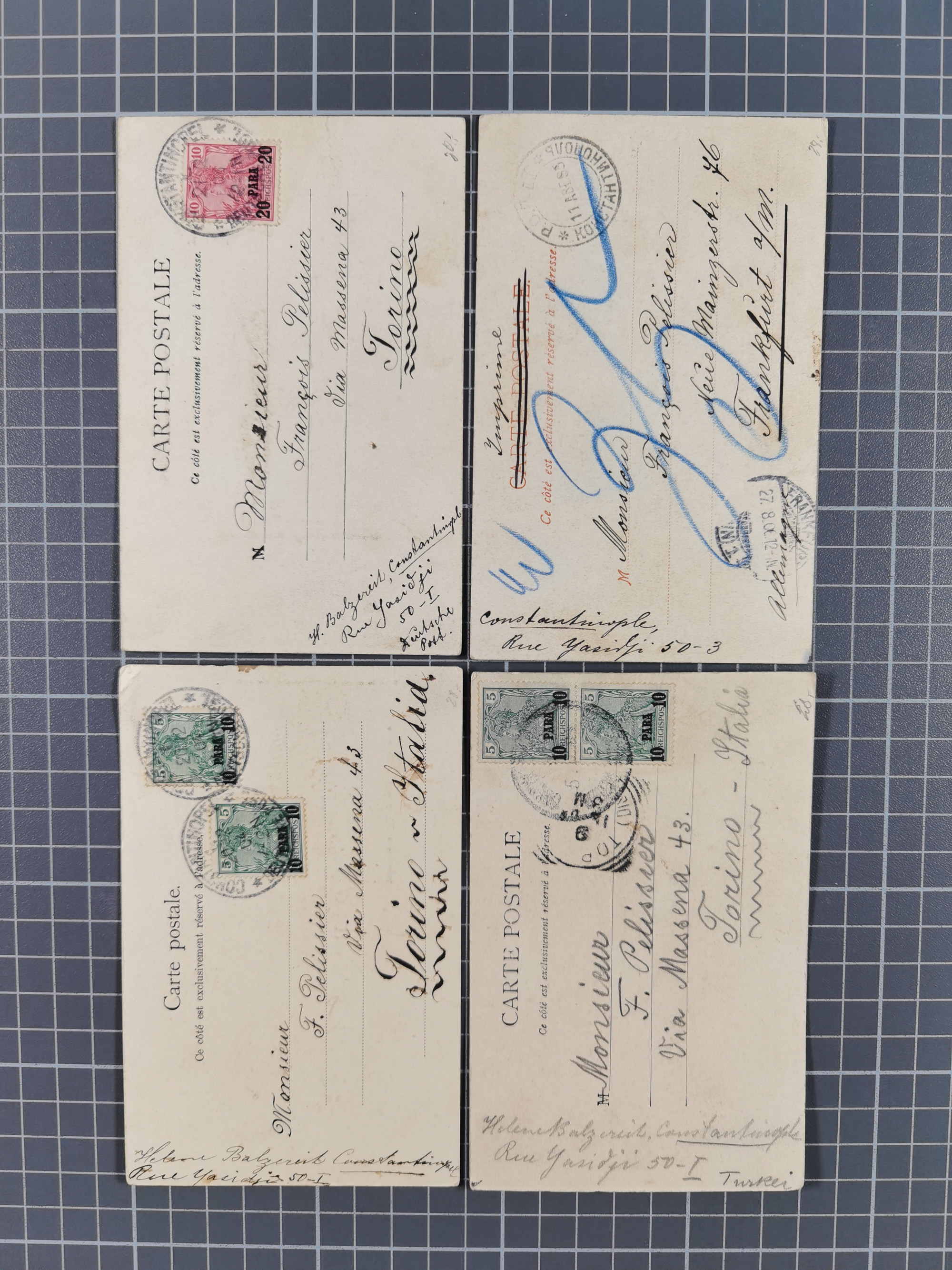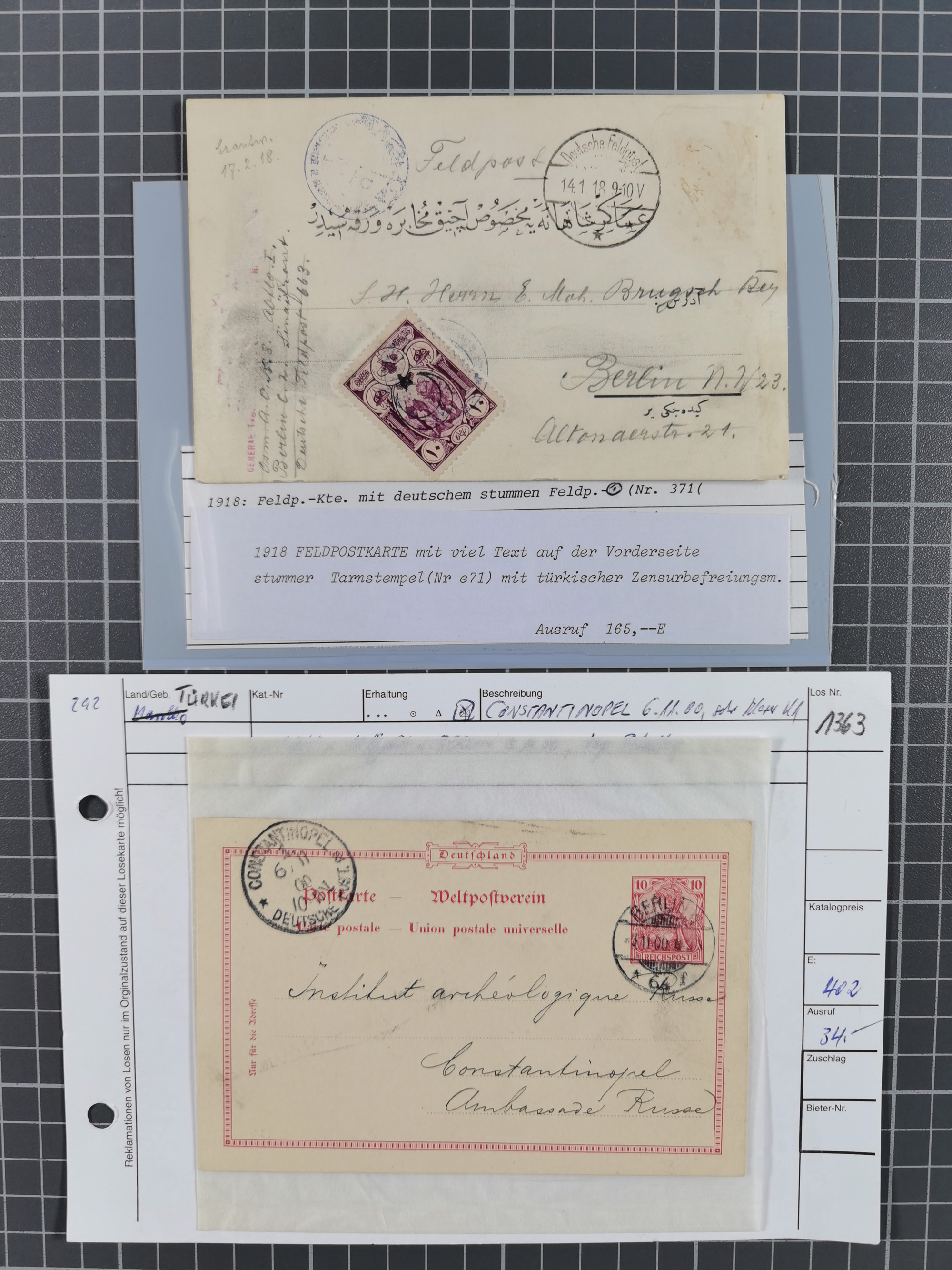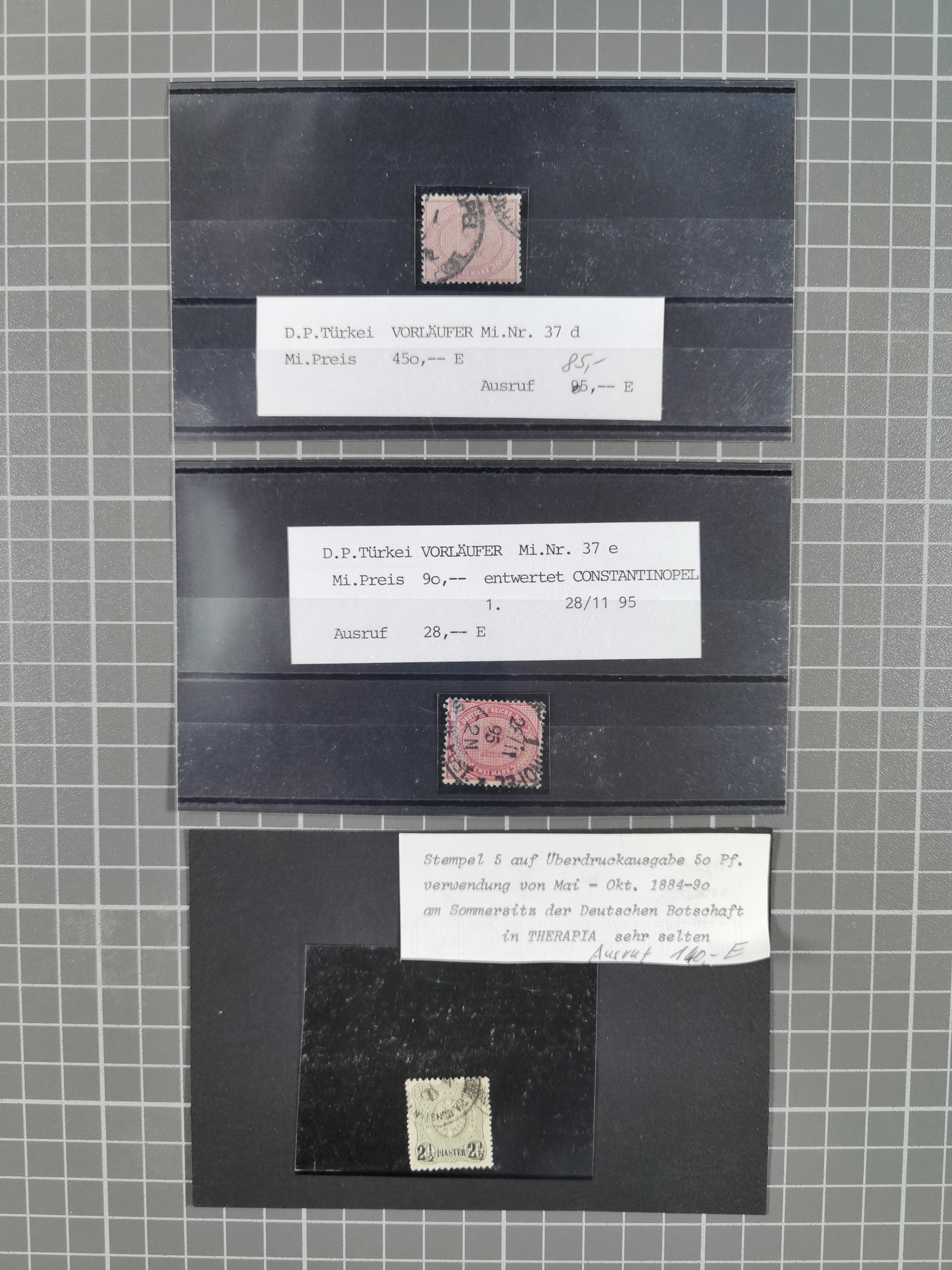1890, 2 Mark dunkelrotkarmin im waagerechten Paar in Mischfrankatur mit Ausgabe1899 2½ Piaster auf 50 Pfennig lebhaftrötlichbraun im waagerechten Paar und senkrechtes Paar 20 Pfennig violettultramarin je mit Stempel “CONSTANTINOPEL DP 1 26.3.98” auf Paketkarten-Stammteil für drei Pakete via Rumänien und Dresden nach Leipzig mit Ankunftsstempel. Die obere Marke ist fehlerhaft und ein Wert der 2 Mark ist etwas fleckig sowie das Formular mit Bugspuren und etwas verfärbt. Trotz der Einschränkungen eine recht hohe und seltene Frankatur, signiert Pfenninger und Fotoattest R. Steuer BPP (2003)