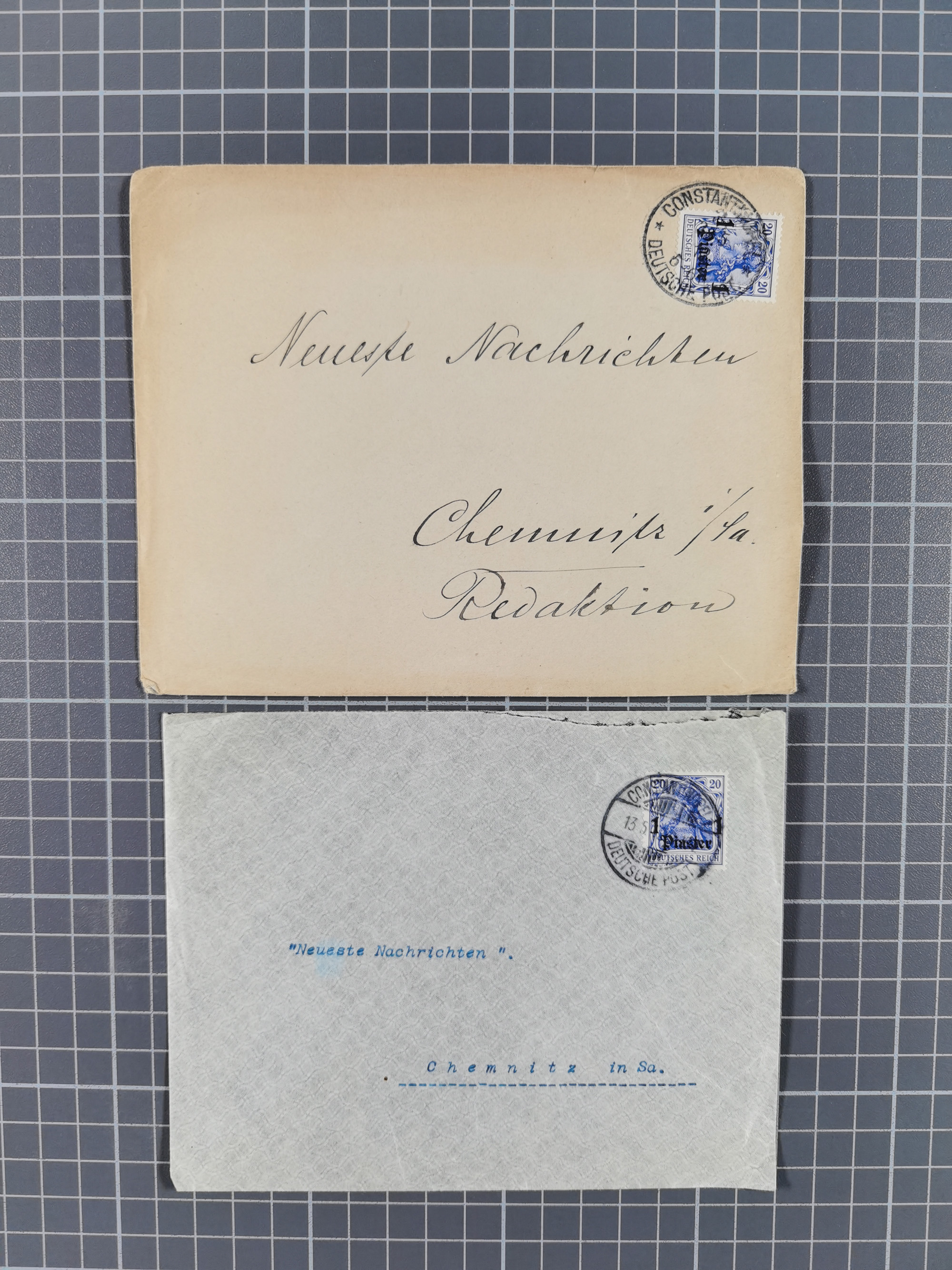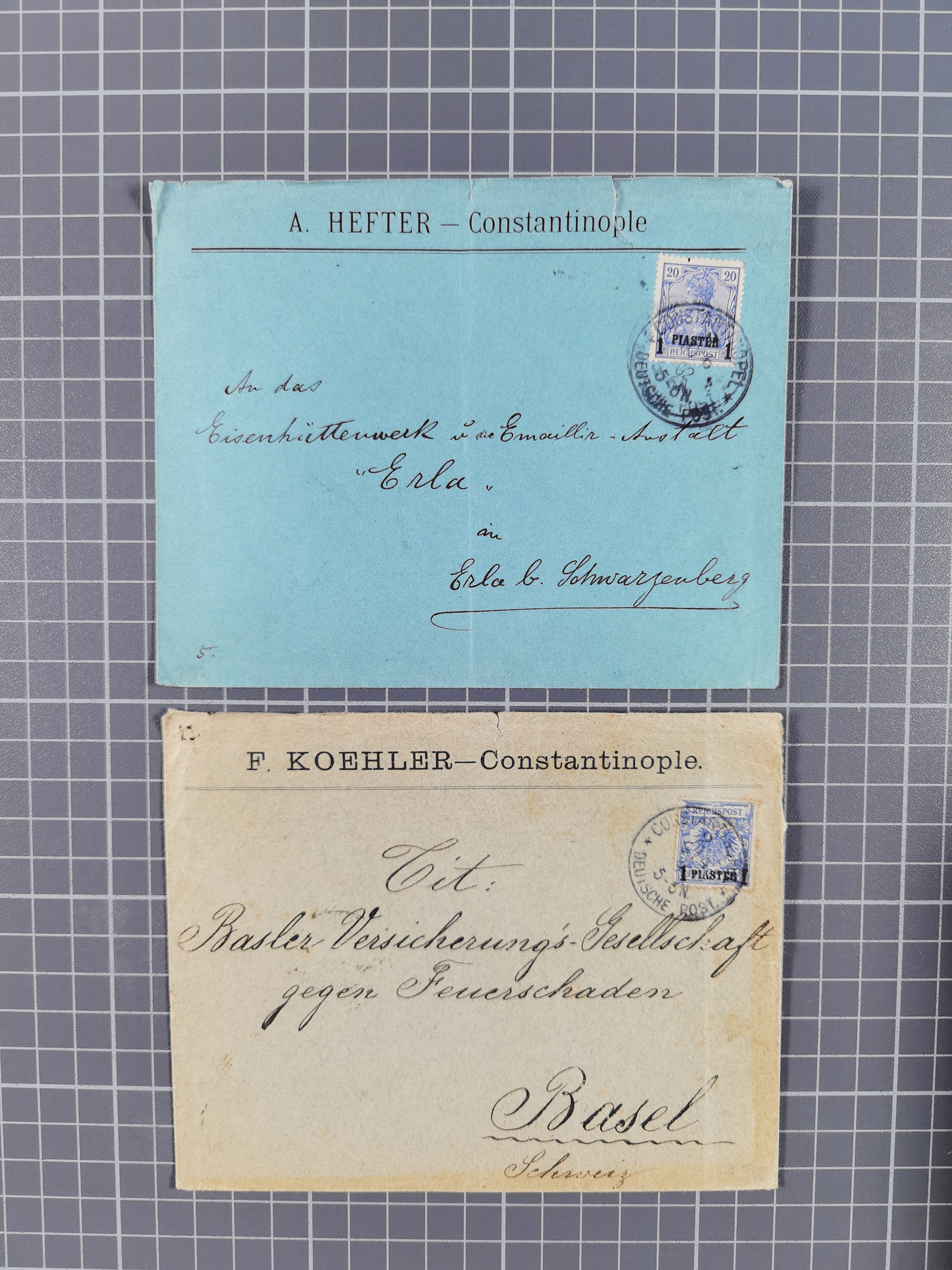 “KAIERL.DEUTSCH.P.A.CONSTANTINOPEL 7.9.86” sehr klar auf Ausgabe 1884 1 Piaster auf 20 Pfennig mit schwarzem Aufdruck als tarifgerechte Frankatur auf Brief-Kuvert nach Berlin mit Ankunftsstempel, in einwandfreier Erhaltung. Eine nicht häufige Wiederverwendung des Stempels am Sommersitz der deutschen Botschaft in Therapia