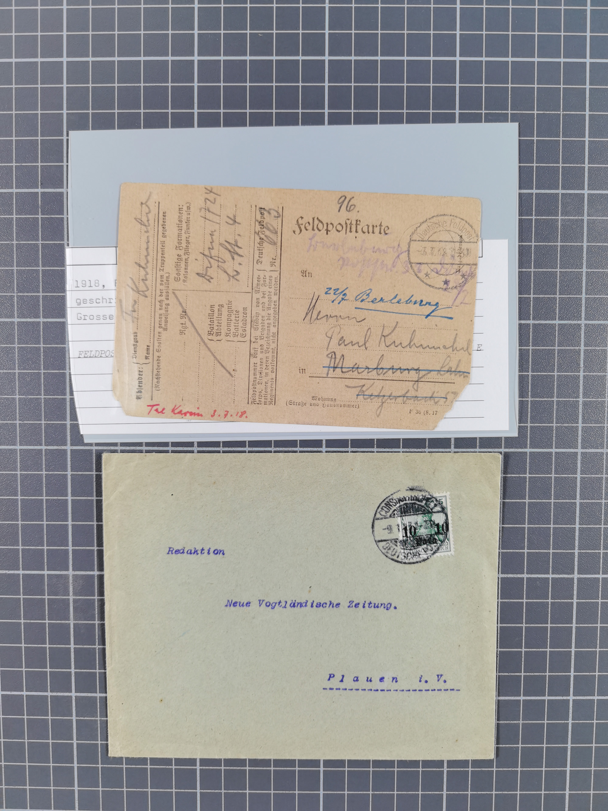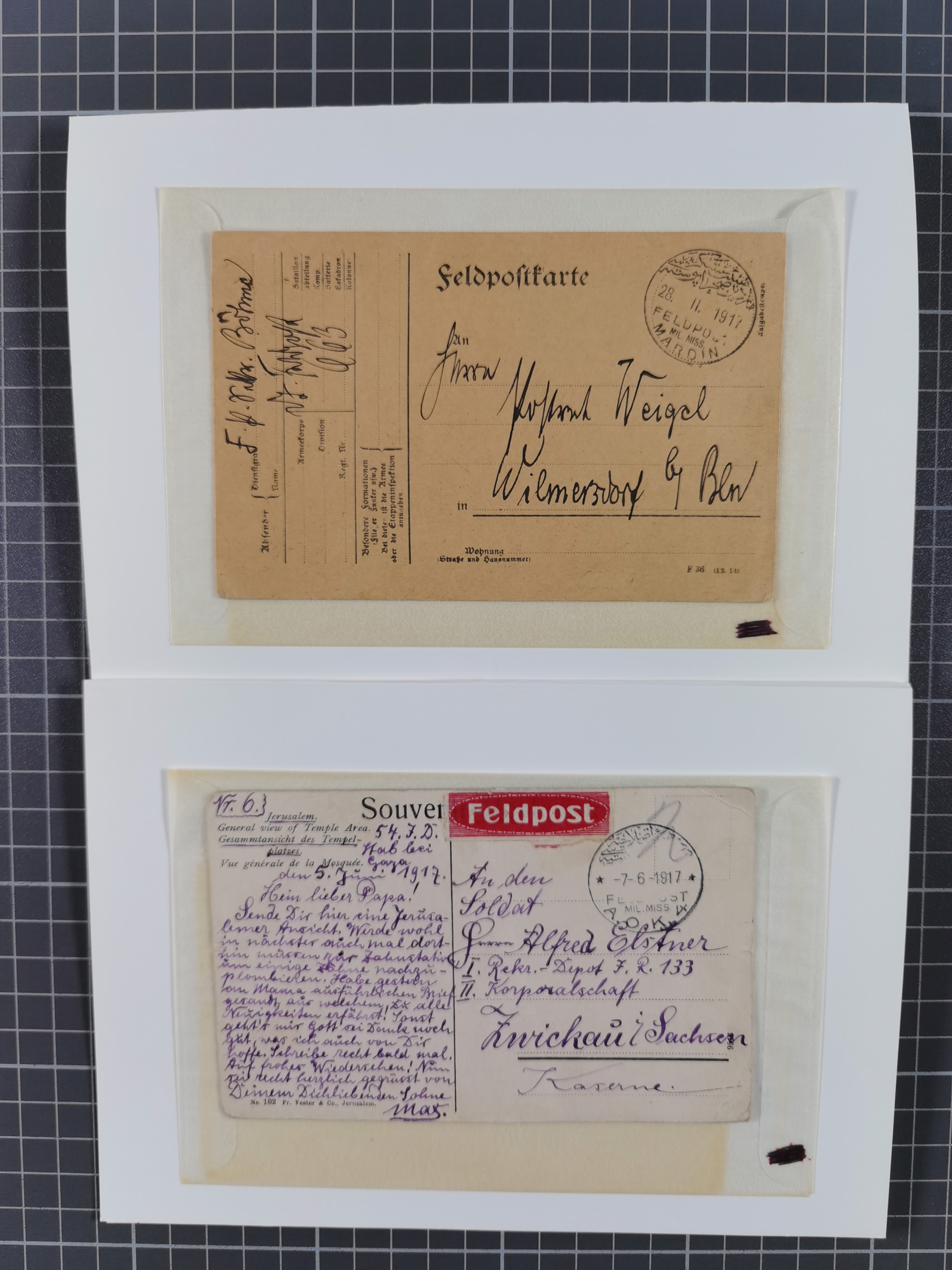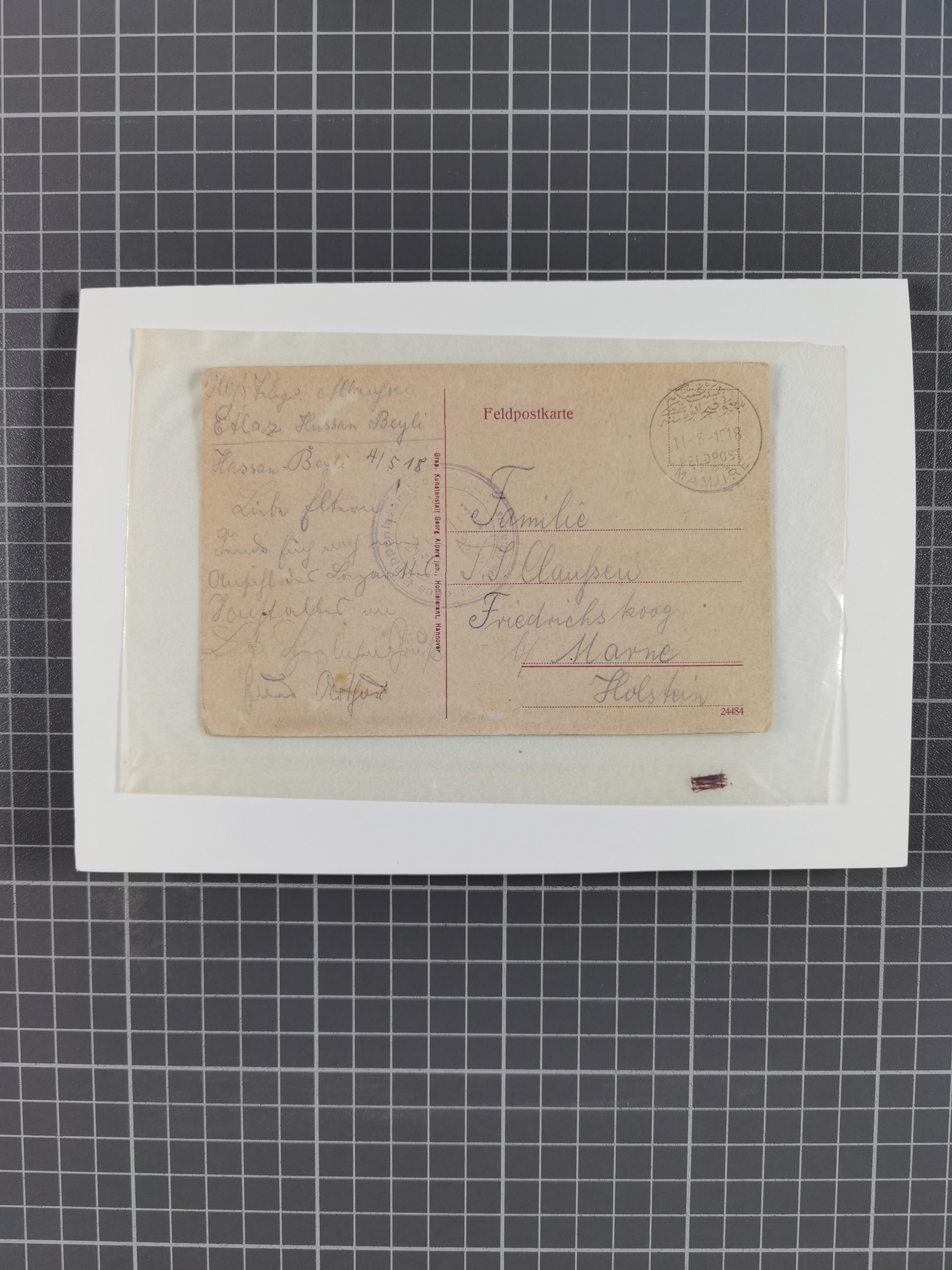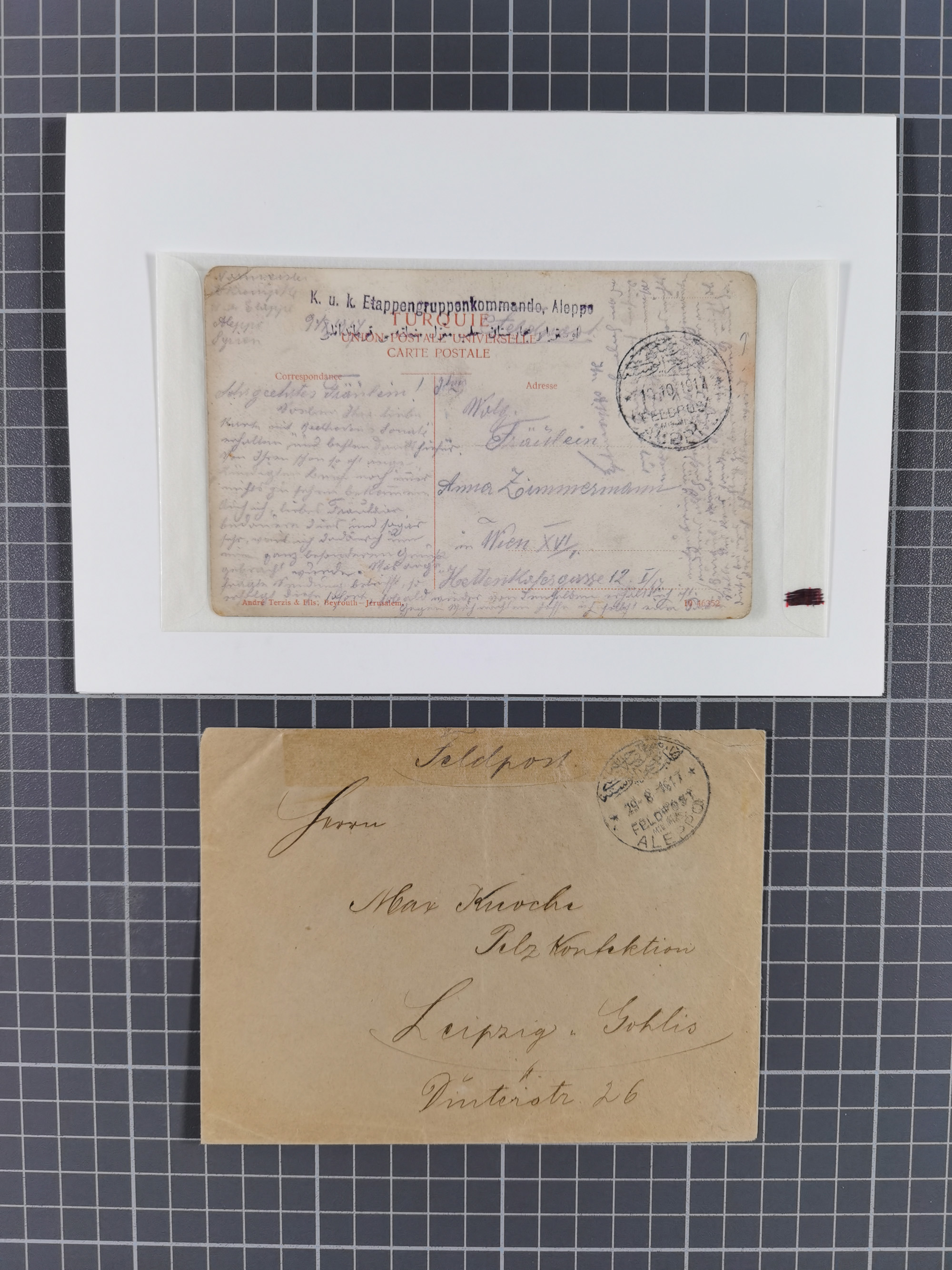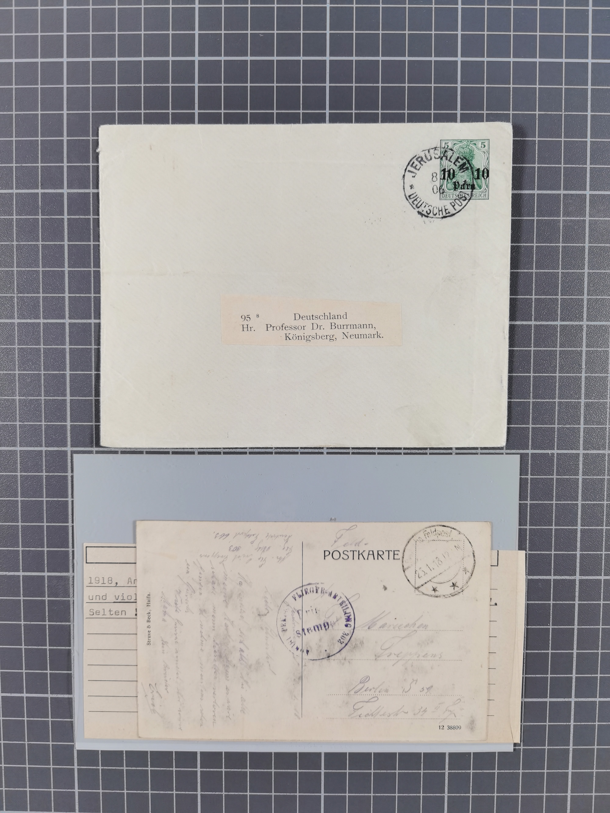 1905, 15 Piaster auf 3 Mark schwarzviolett (rotorange quarzend) und 20 Para auf 10 Pfennig ohne Wasserzeichen je mit Stempel “BEIRUT DP 23.2.06” vorder- und rückseitig auf kompletter Paketkarte via Potsdam nach Bornstedt mit Ankunftsstempel. Die Paketkarte mit zwei senkrechten Faltungen und kleinen Randfehlern, die Marken bis auf einen Eckzahnfehler bei der rückseitigen Marke in einwandfreier Erhaltung. Paketkarten mit den hohen Wertstufen sind selten und in nur ganz wenigen Exemplaren bekannt