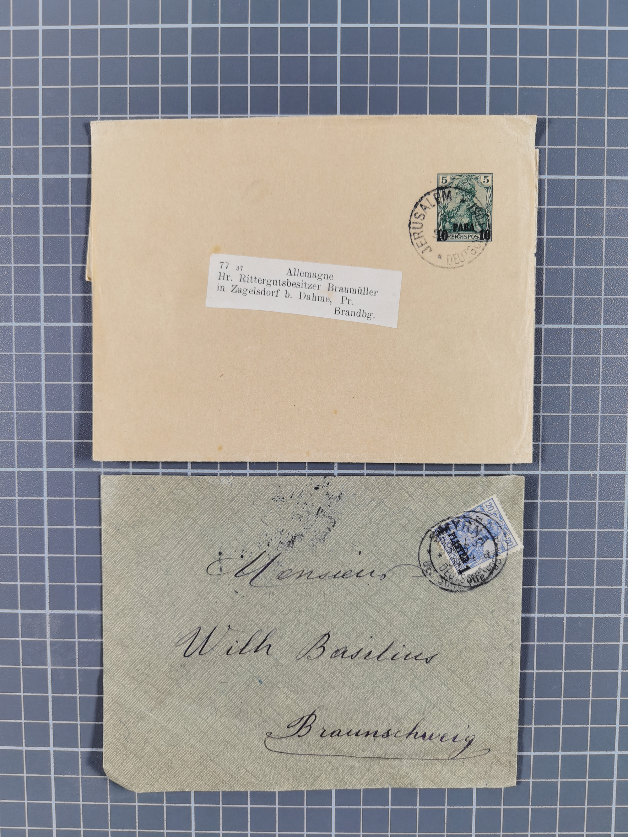 1900/04, 20 Para auf 10 Pfennig und senkrechtes Paar 1 Piaster auf 20 Pfennig je mit Stempel “JAFFA DP 24.3.01” auf Paketkarten-Stammteil nach Jerusalem mit Ankunftsstempel, in guter Erhaltung. Dekorative Paketkarte als Inlandsverwendung, signiert DR. Lantelme mit Fotoattest (1994)