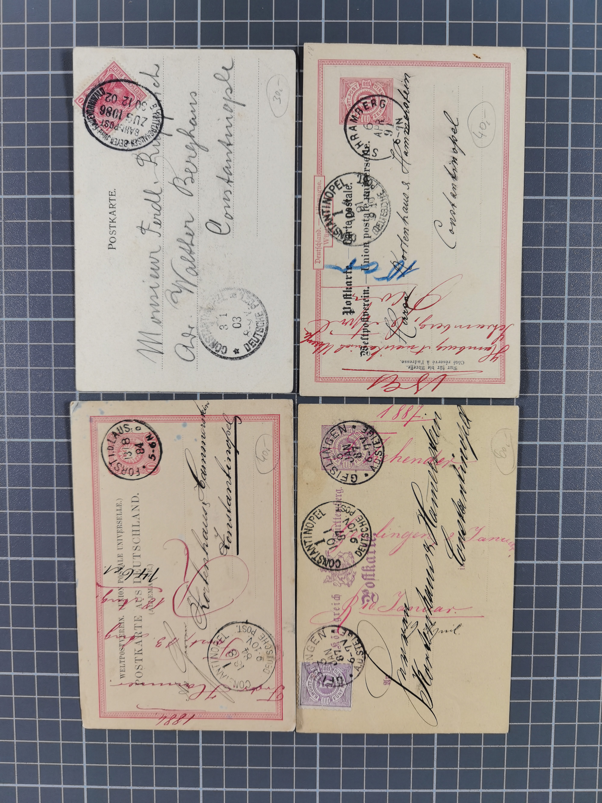 1875/99, 2 Mark mittelrosalila im waagerechten 10er-Streifen mit Zwischensteg-Paar und komplettem Unterrand sowie Bogenrändern links und rechts, mit übergehender handschriftlicher Entwertung “Constantinopel, den 7 Oktober 1884” sowie weitere Blau- und Rotstiftspuren. Die Einheit war vorgefaltet und angetrennte Zahnlöcher wurden hinterlegt, ansonsten eine optisch ansprechende, vermutlich einmalige Einheit. Eine große Vorläufer-Seltenheit, signiert Bothe BPP mit Fotoattest (1985)