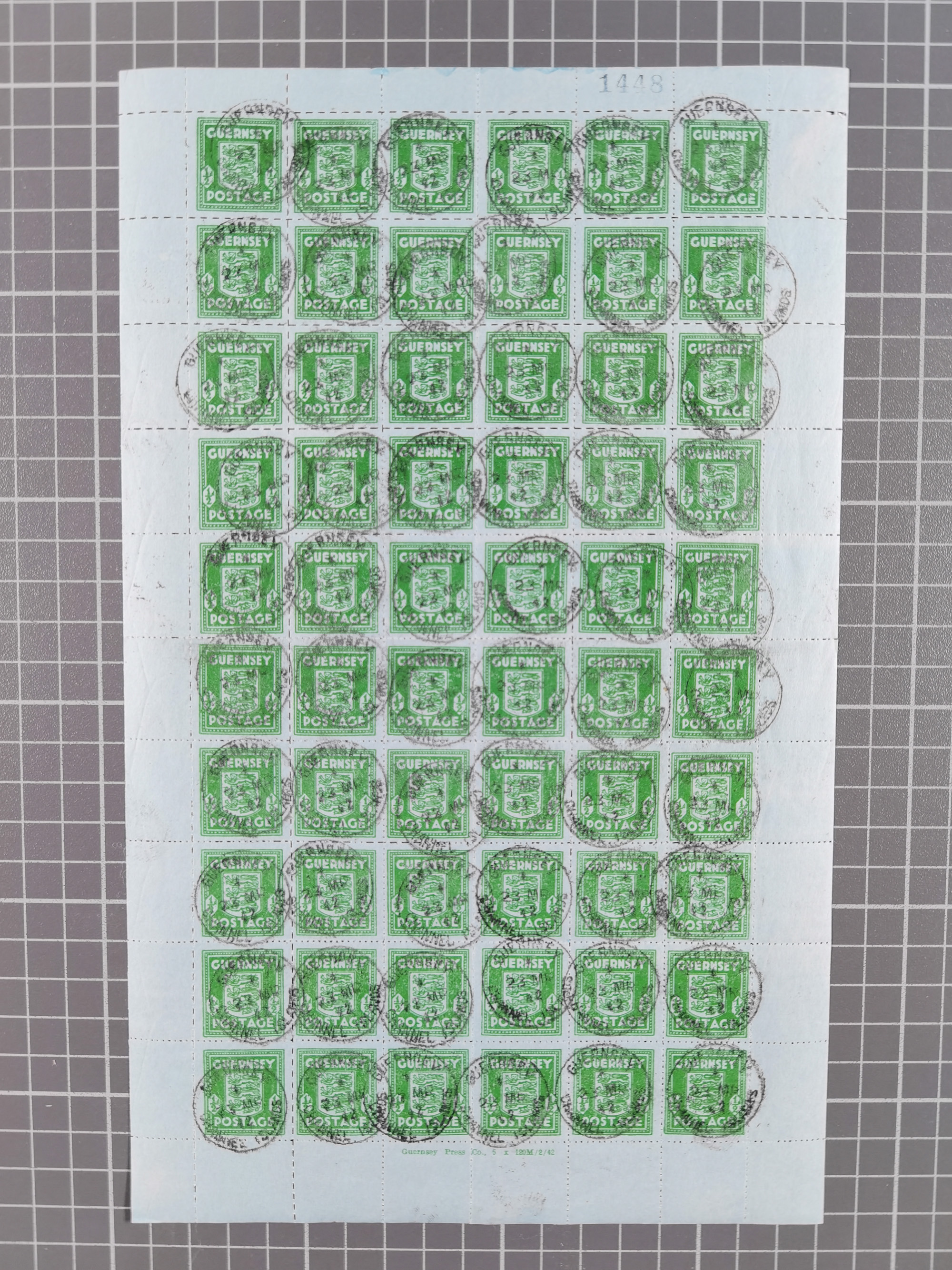 1942, Wappen auf Banknotenpapier ½ P. dunkelgrün, kompletter Bogen mit allen Rändern und Druckvermerk sowie Bogenzählnummer, sauber gestempelt “GUERNSEY 23 MR 42", tadellos
