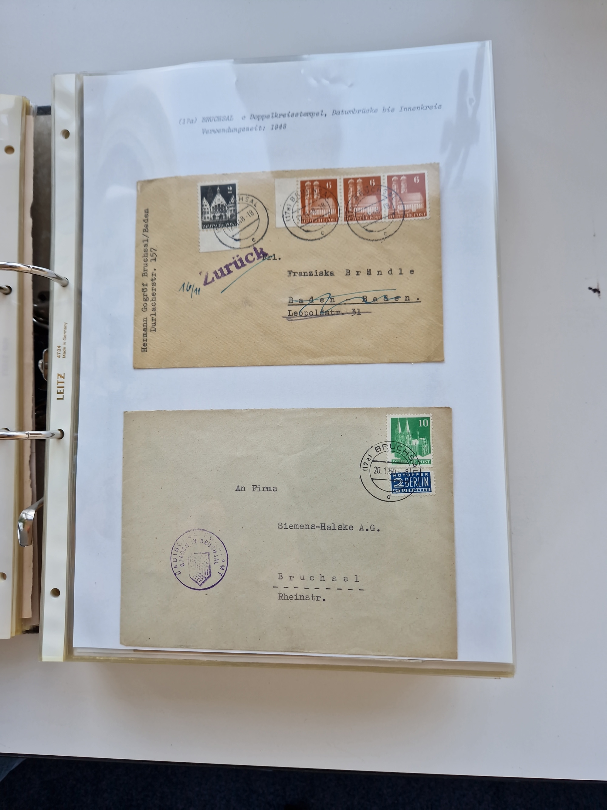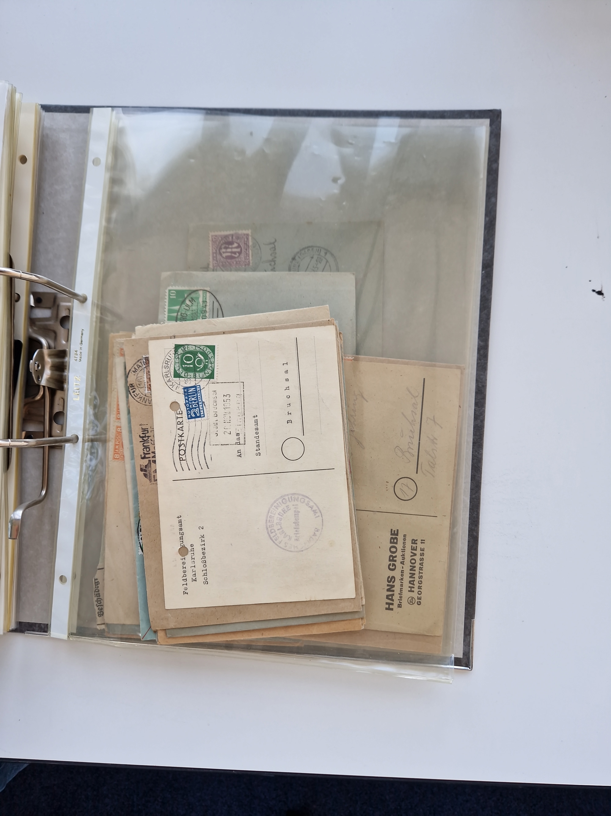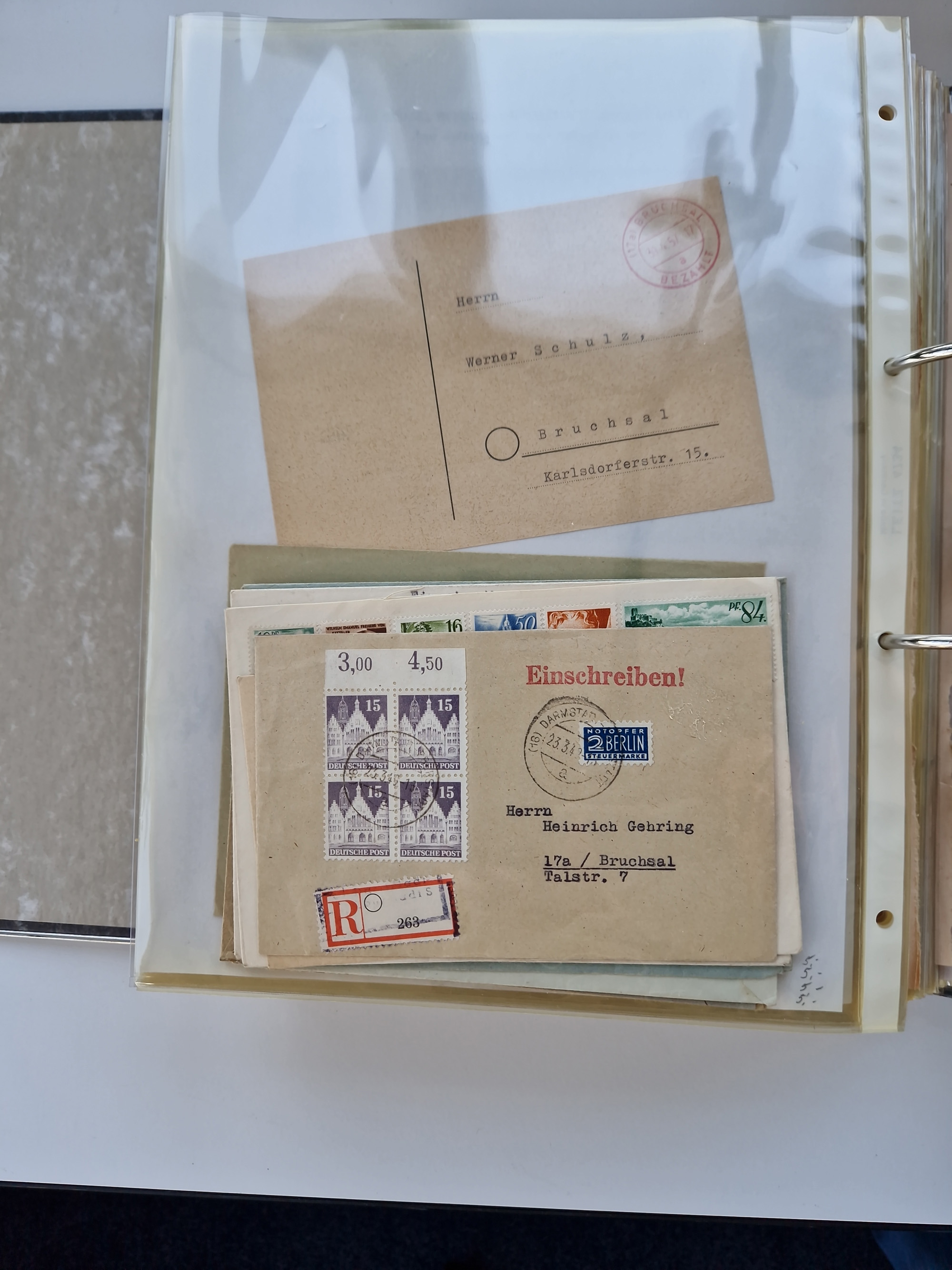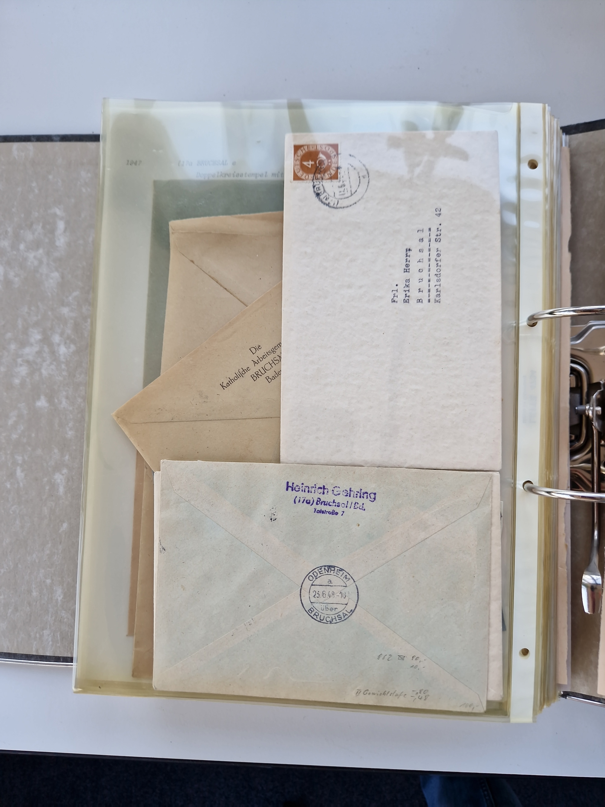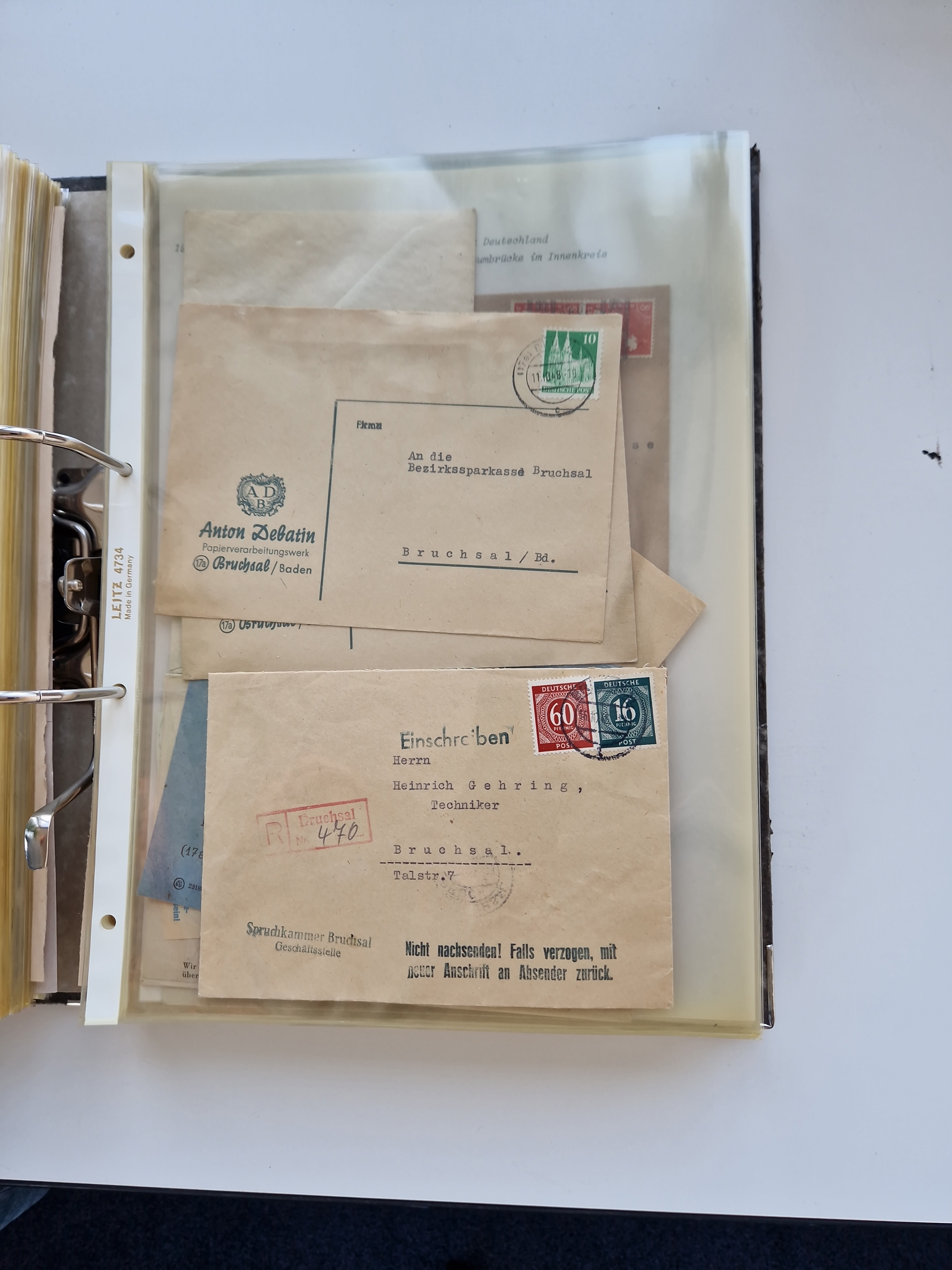 1870/2010 (ca.), Bruchsal und Umgebung, umfangreiche Heimatsammlung in 39 Ringordnern etwas unkonventionell, aber nichtsdestotrotz sehr inhaltsreich gesammelt mit zahlreichen Belegen ab Dt.Reich und auch losen Marken, u.a. Brustschilde mit Marken und besseren Frankaturen, Nachkriegszeit mit Besatzungszonen, auch eingehende Post aus Aller Welt.