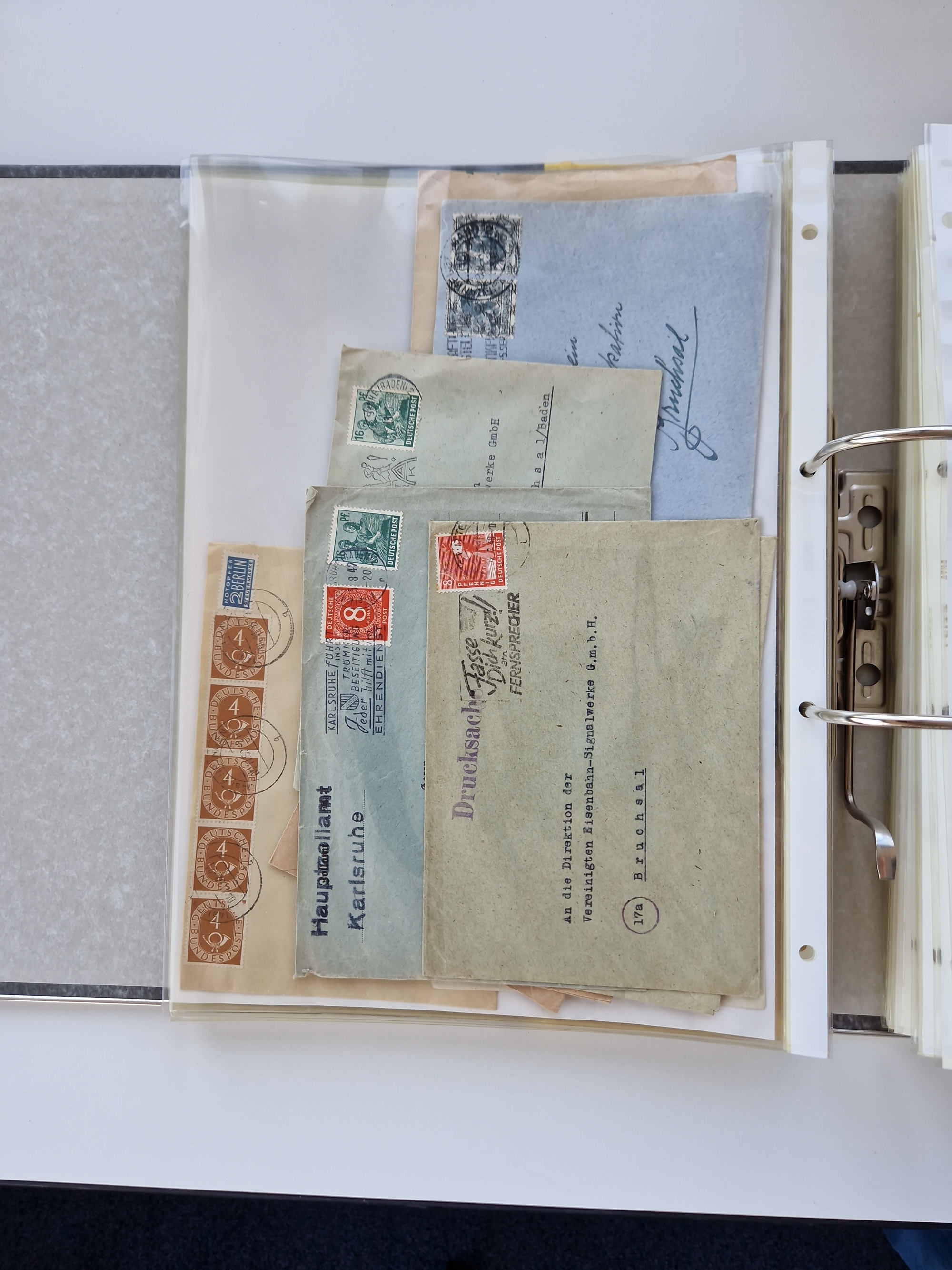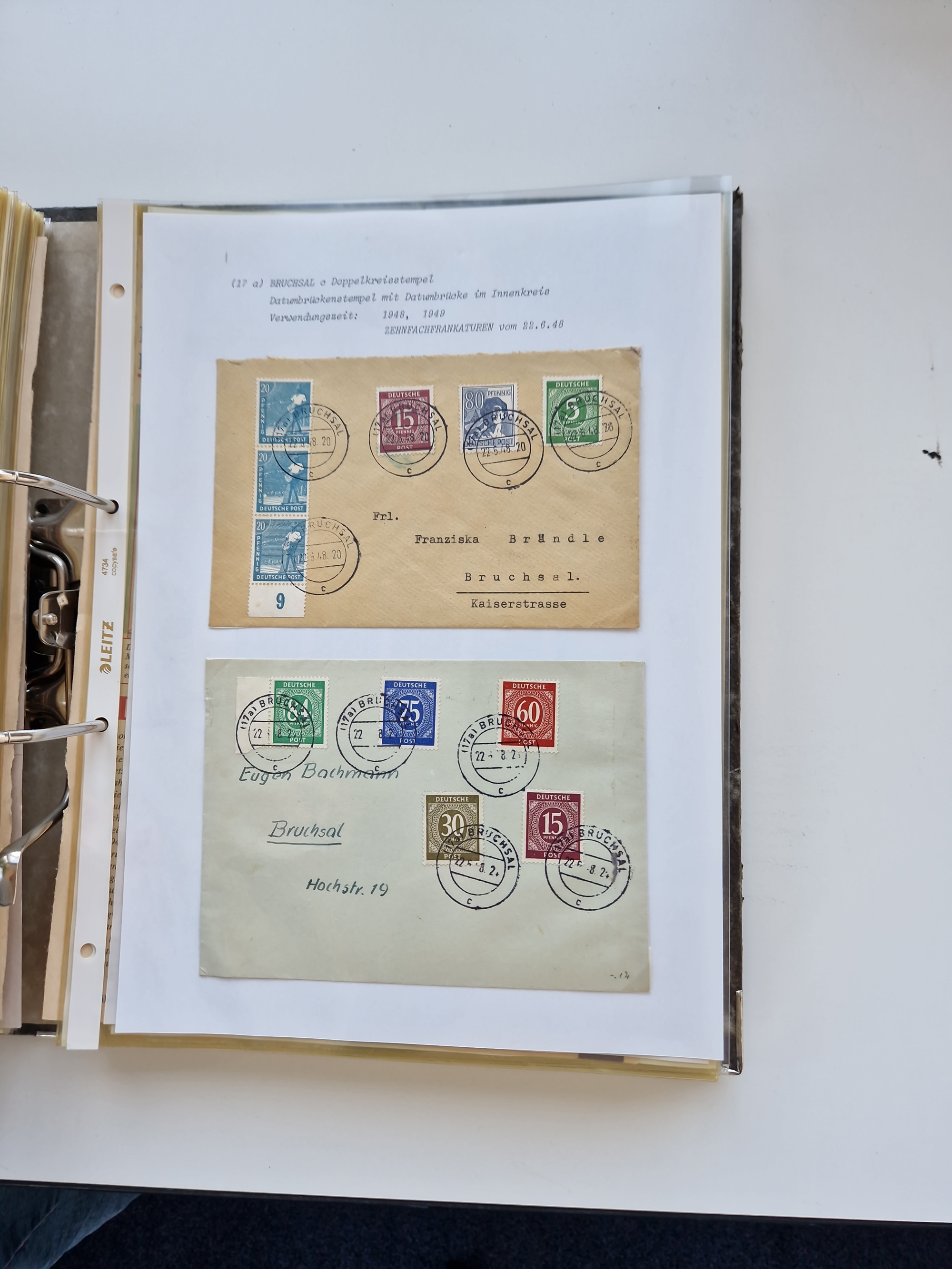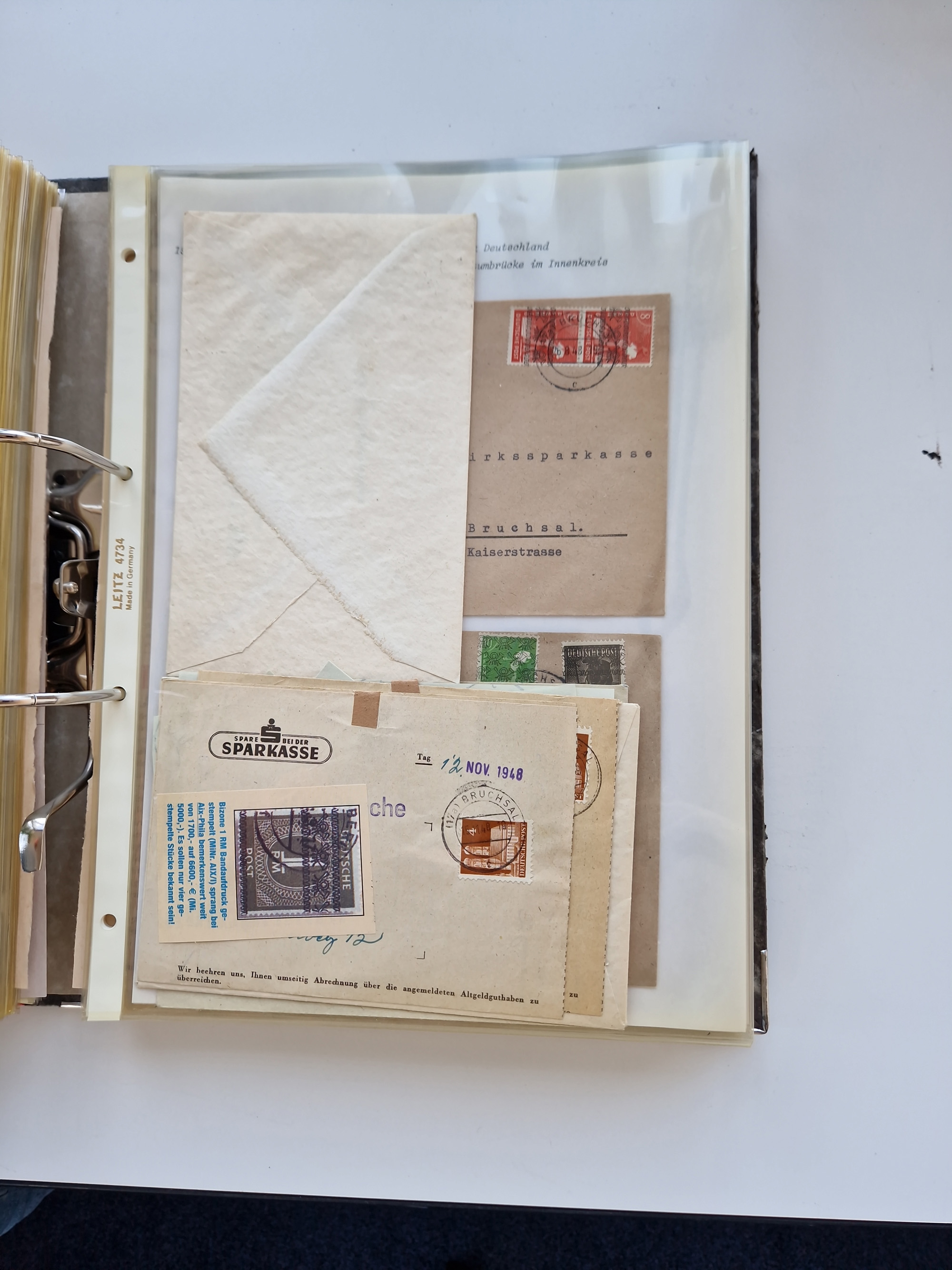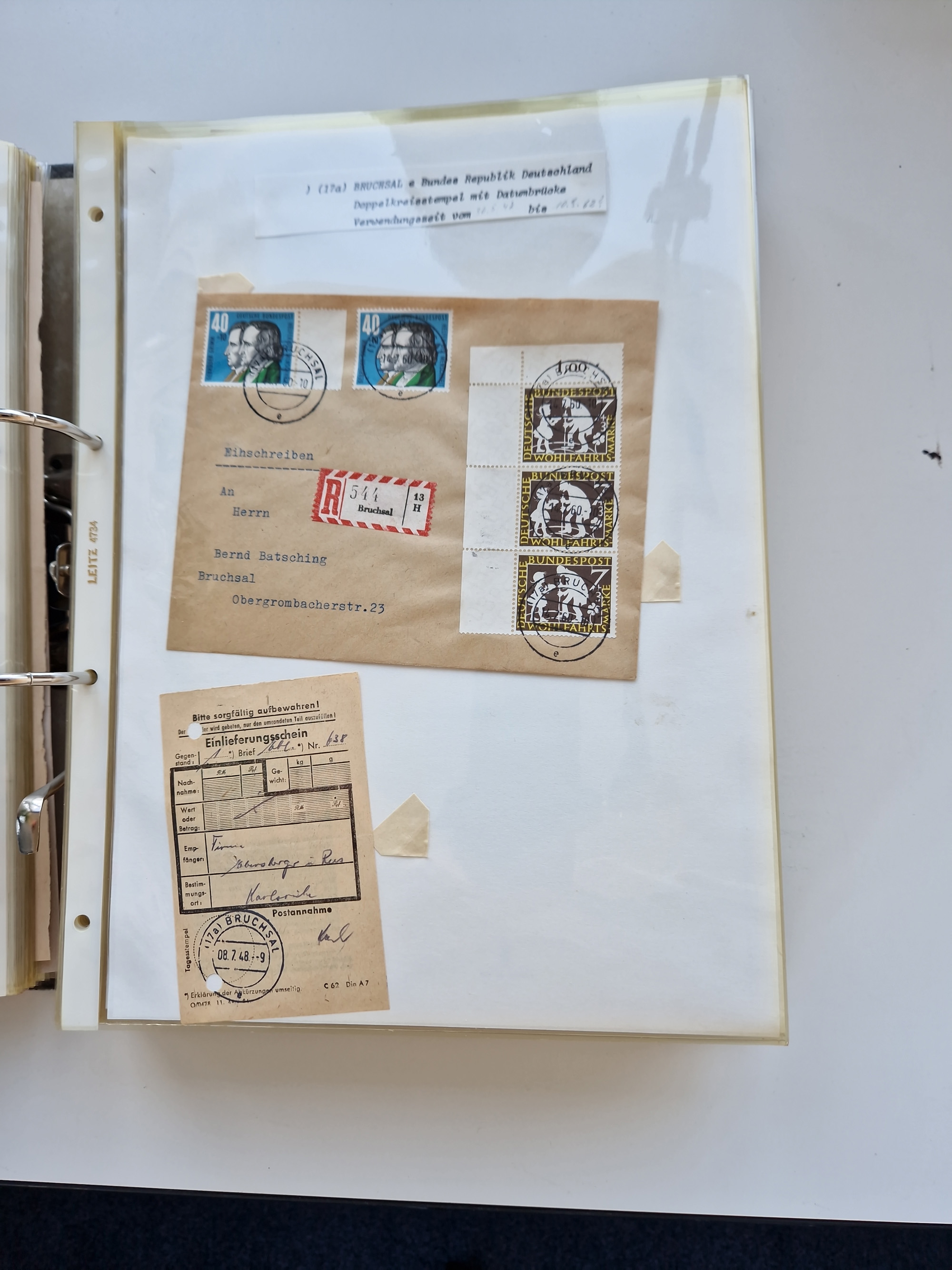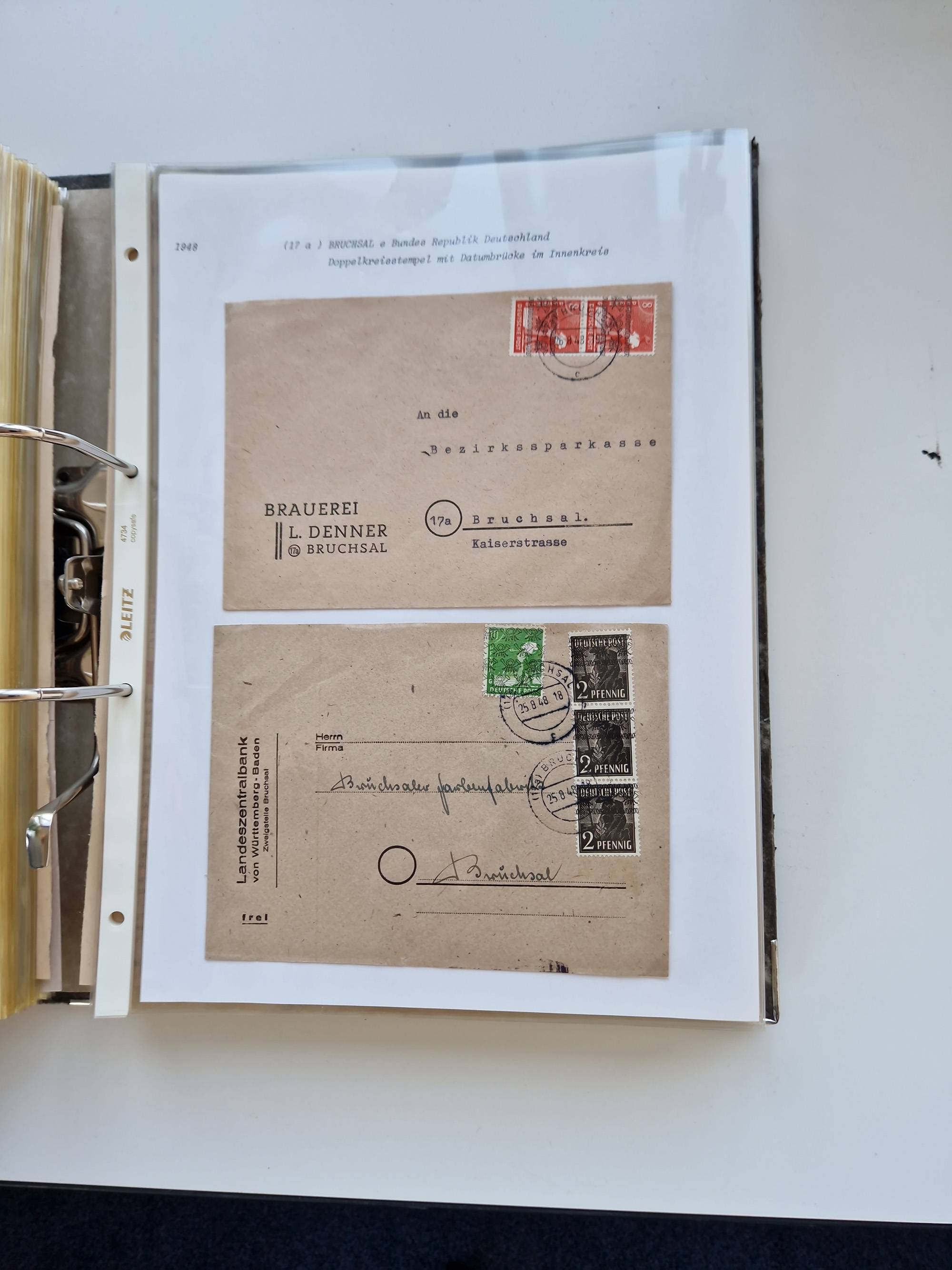1870/2010 (ca.), Bruchsal und Umgebung, umfangreiche Heimatsammlung in 39 Ringordnern etwas unkonventionell, aber nichtsdestotrotz sehr inhaltsreich gesammelt mit zahlreichen Belegen ab Dt.Reich und auch losen Marken, u.a. Brustschilde mit Marken und besseren Frankaturen, Nachkriegszeit mit Besatzungszonen, auch eingehende Post aus Aller Welt.