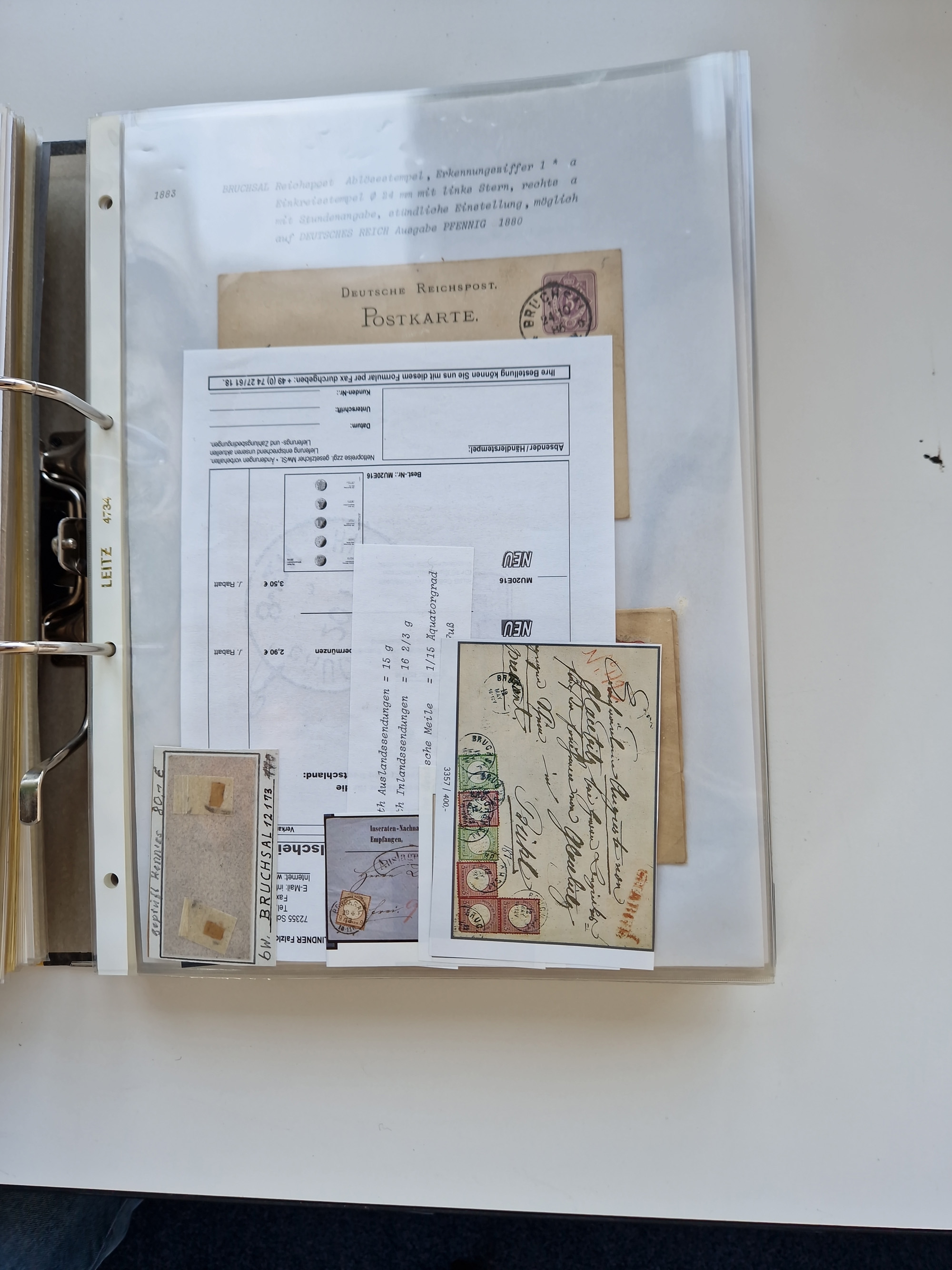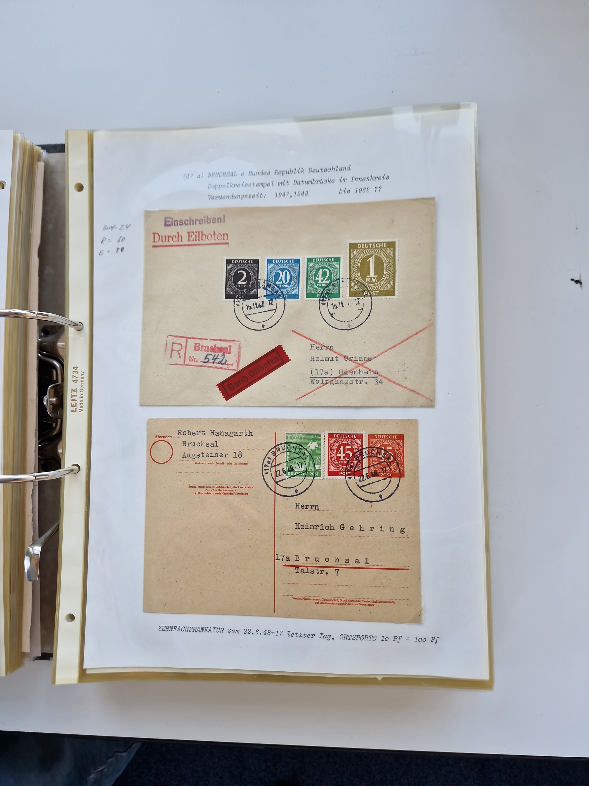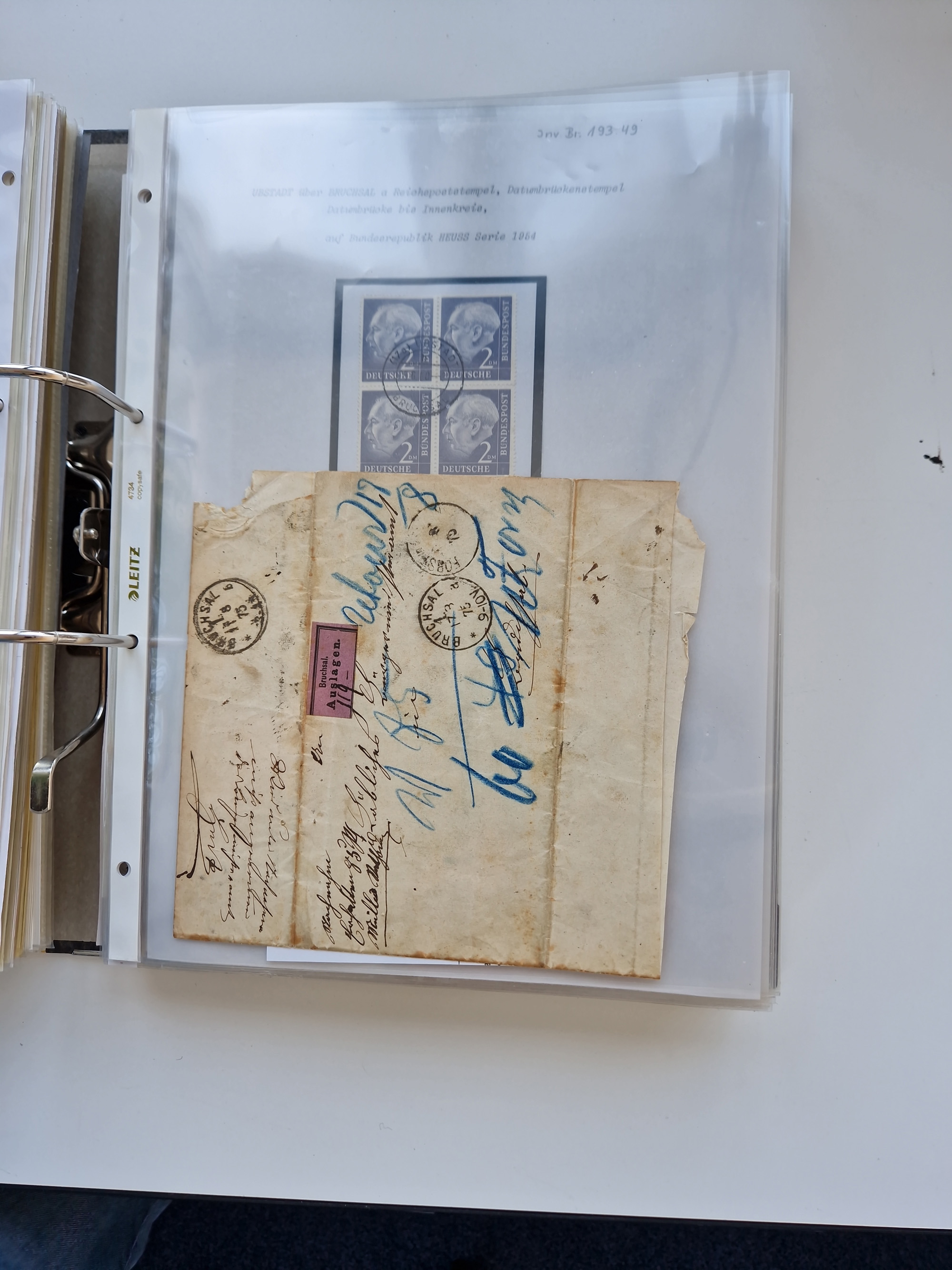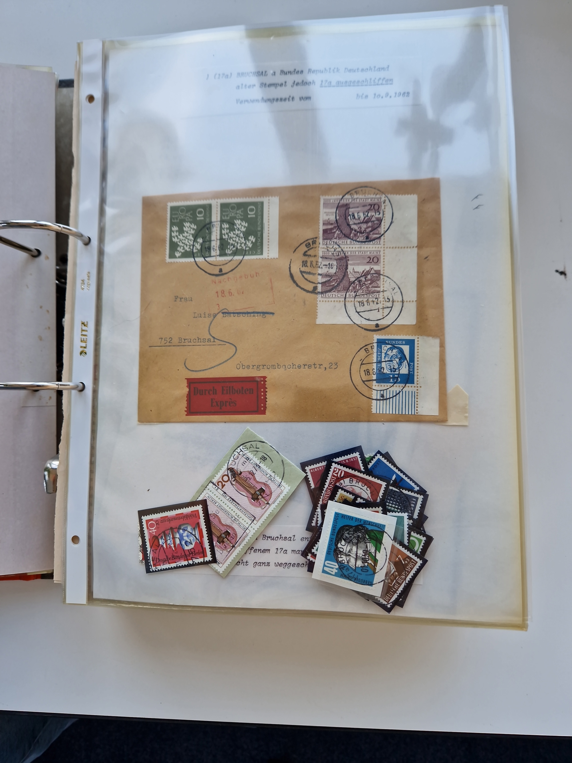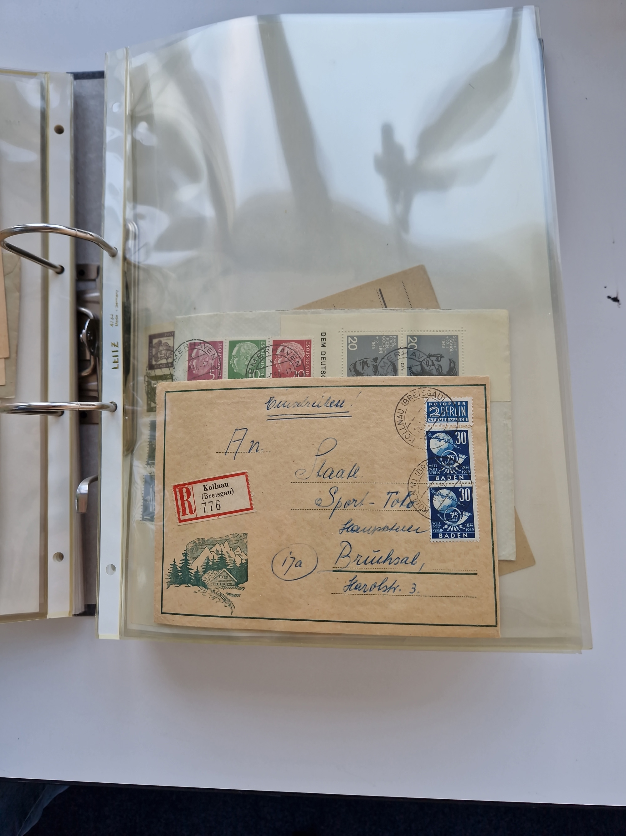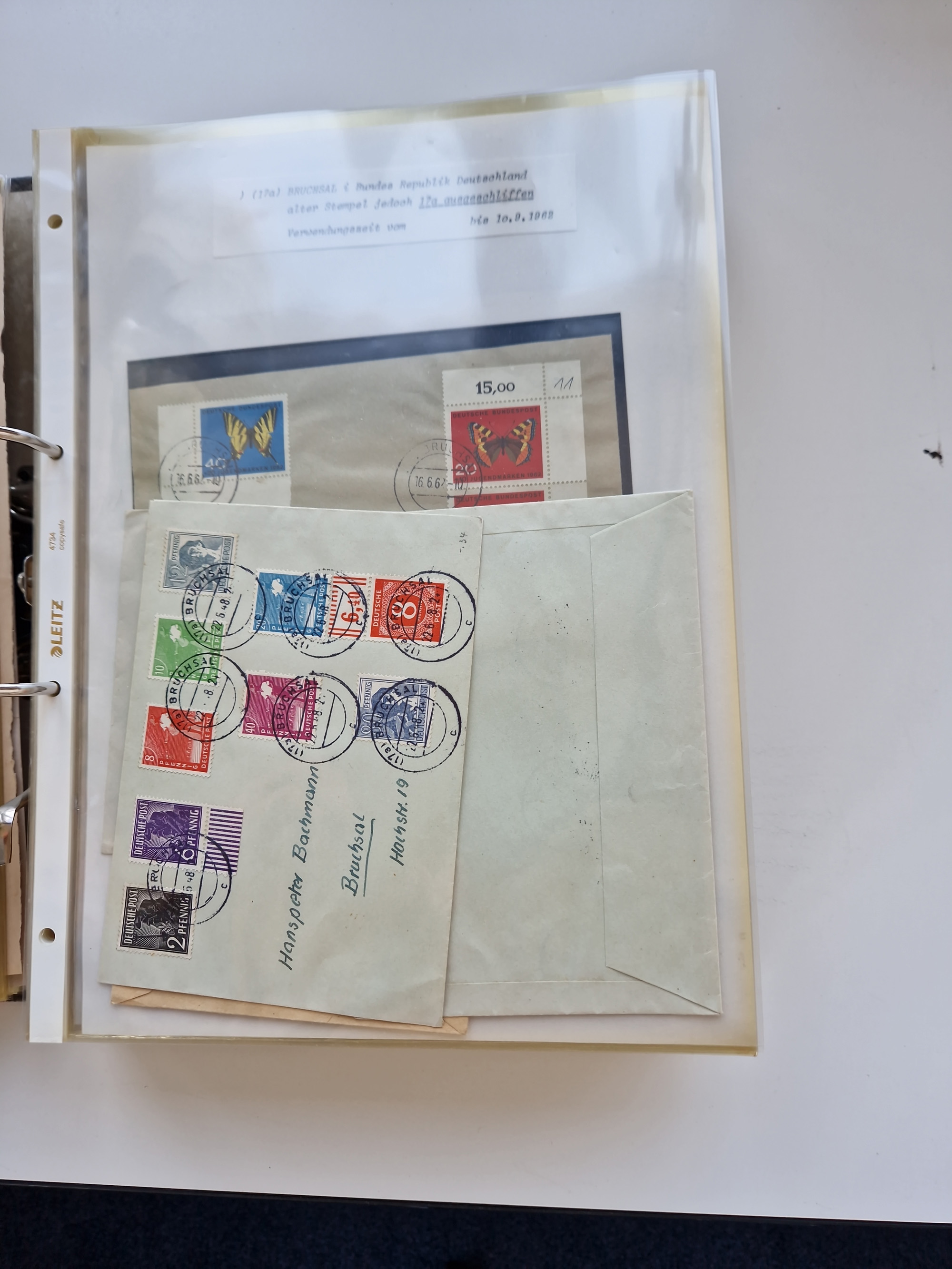 1870/2010 (ca.), Bruchsal und Umgebung, umfangreiche Heimatsammlung in 39 Ringordnern etwas unkonventionell, aber nichtsdestotrotz sehr inhaltsreich gesammelt mit zahlreichen Belegen ab Dt.Reich und auch losen Marken, u.a. Brustschilde mit Marken und besseren Frankaturen, Nachkriegszeit mit Besatzungszonen, auch eingehende Post aus Aller Welt.