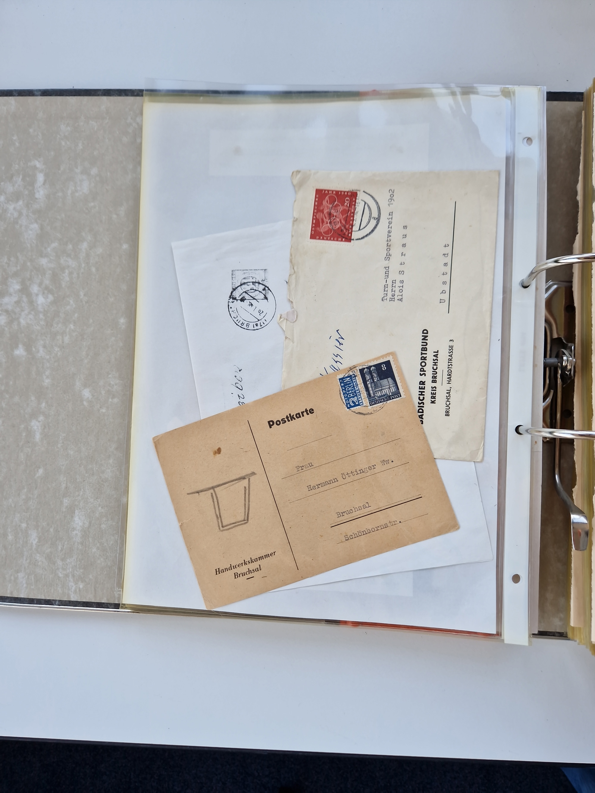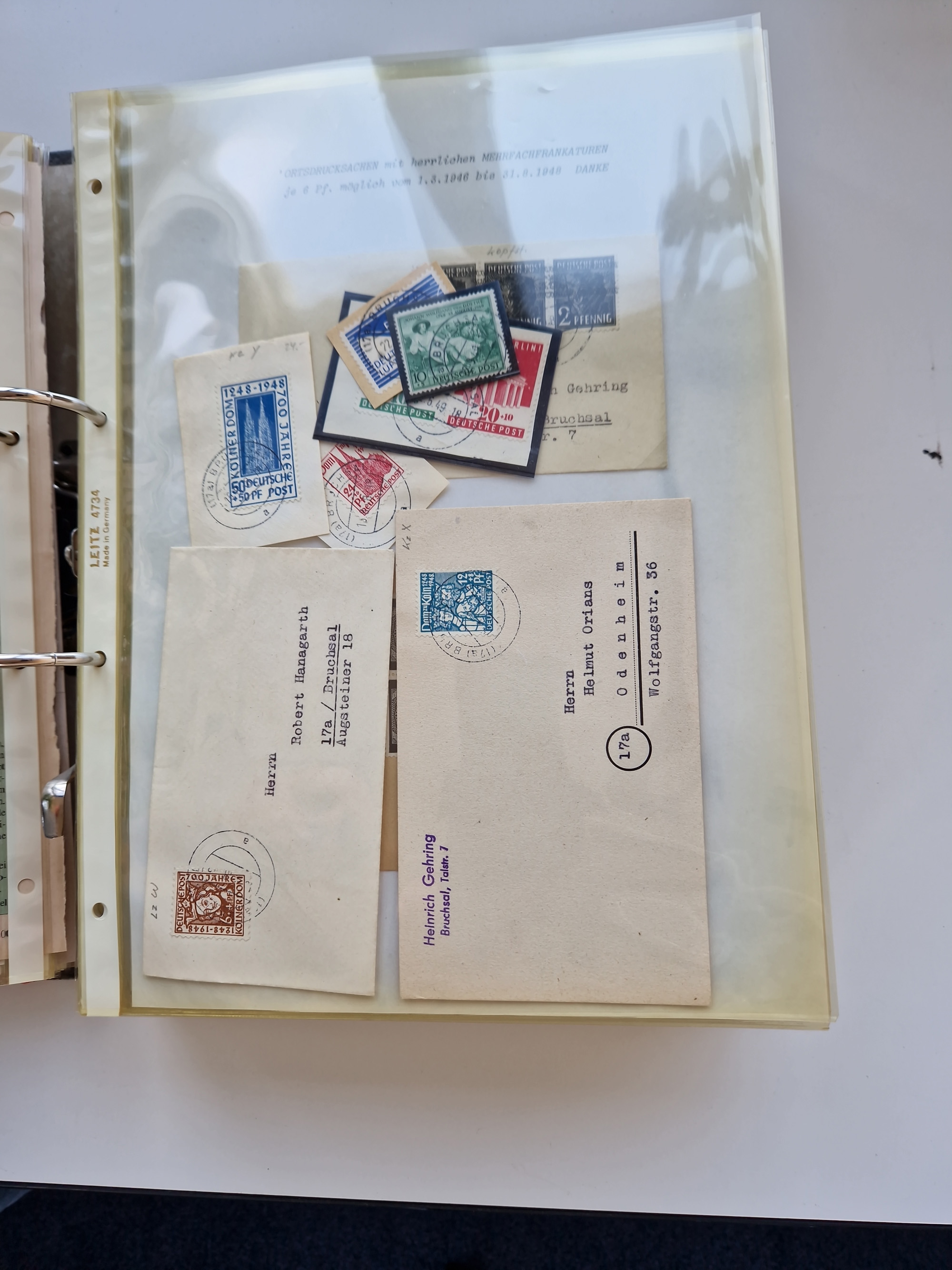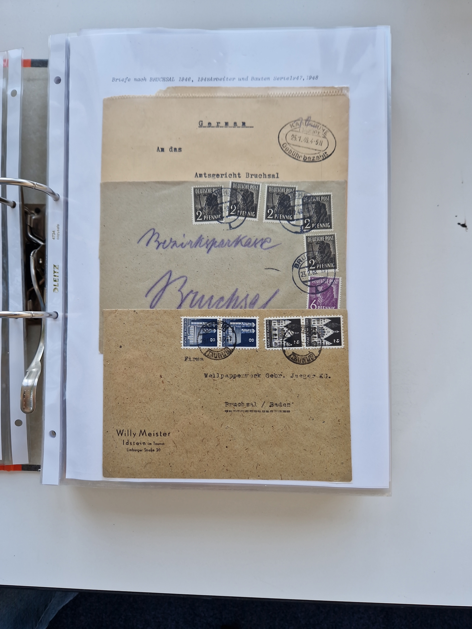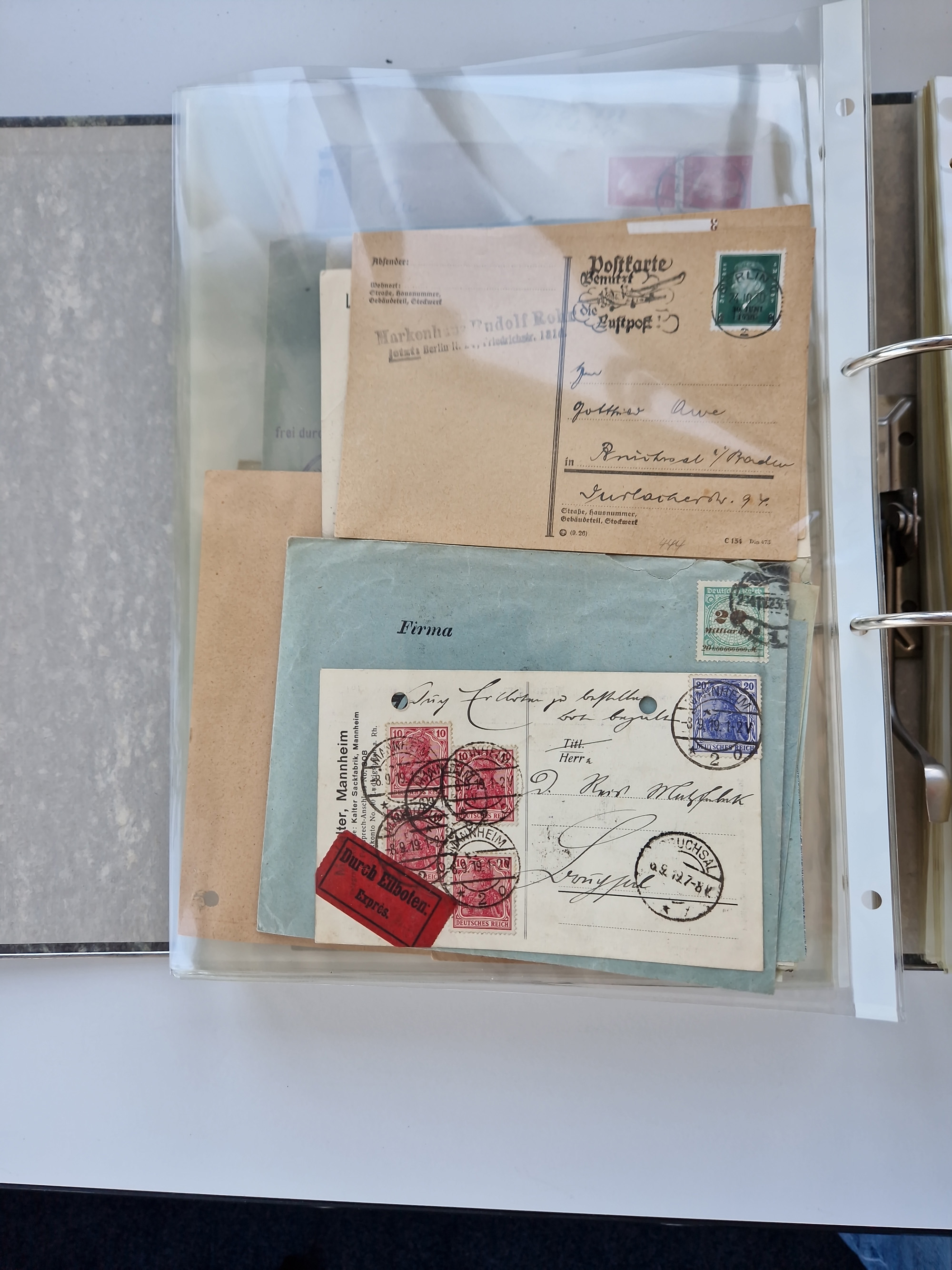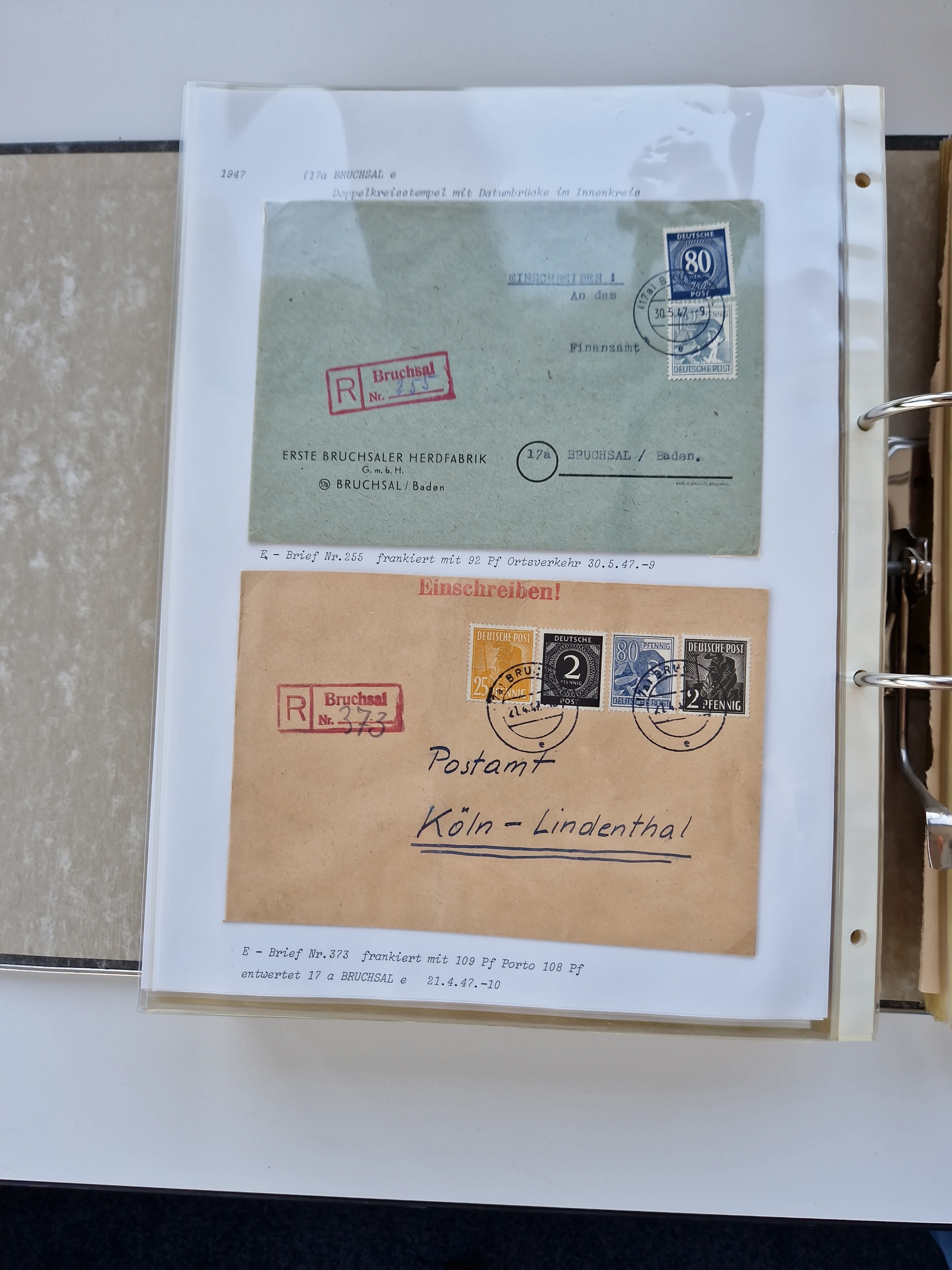1870/2010 (ca.), Bruchsal und Umgebung, umfangreiche Heimatsammlung in 39 Ringordnern etwas unkonventionell, aber nichtsdestotrotz sehr inhaltsreich gesammelt mit zahlreichen Belegen ab Dt.Reich und auch losen Marken, u.a. Brustschilde mit Marken und besseren Frankaturen, Nachkriegszeit mit Besatzungszonen, auch eingehende Post aus Aller Welt.
