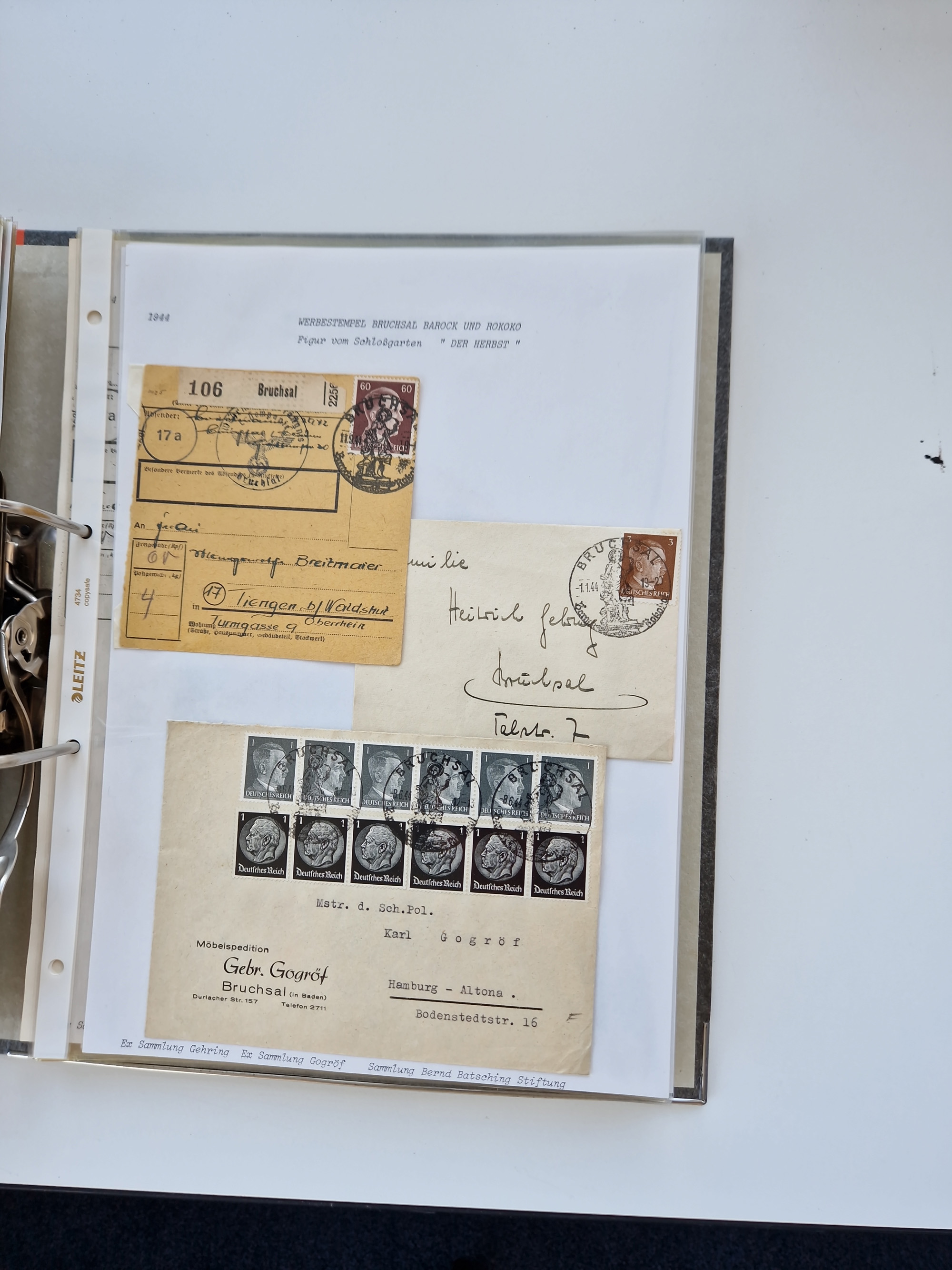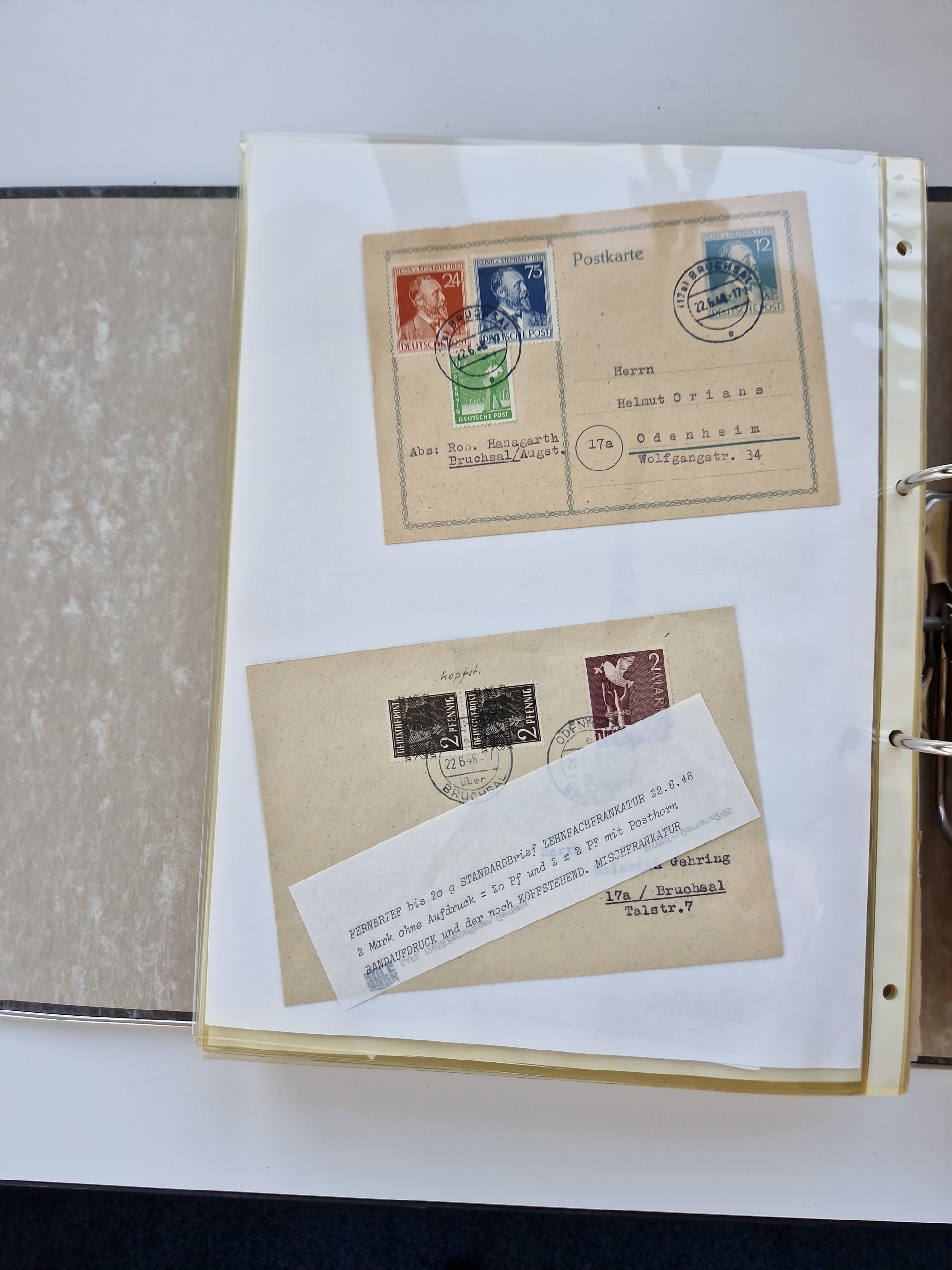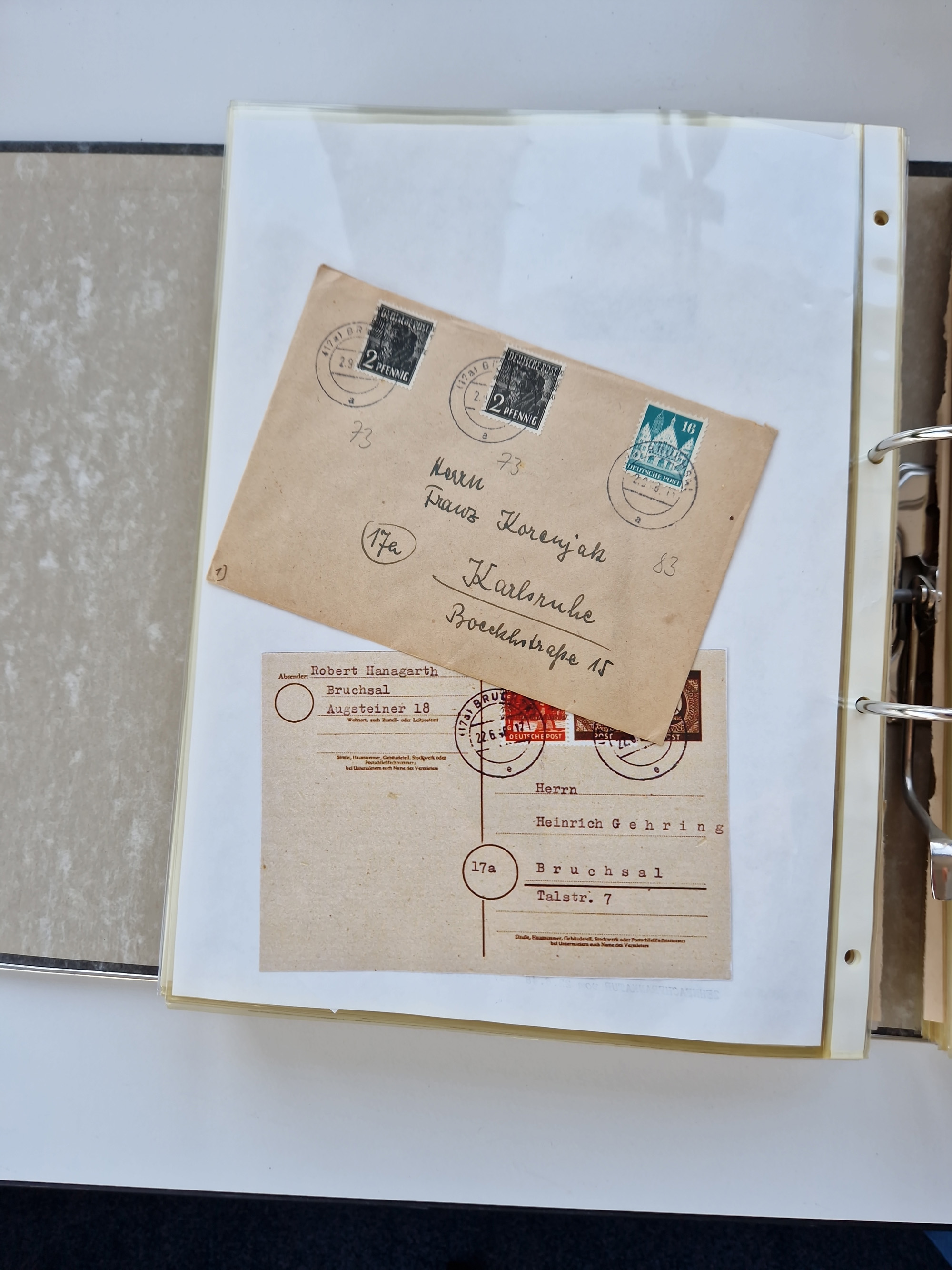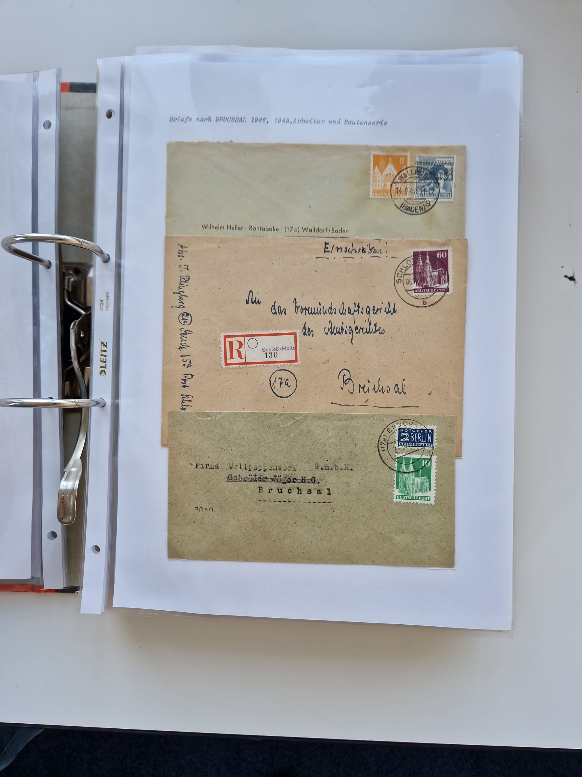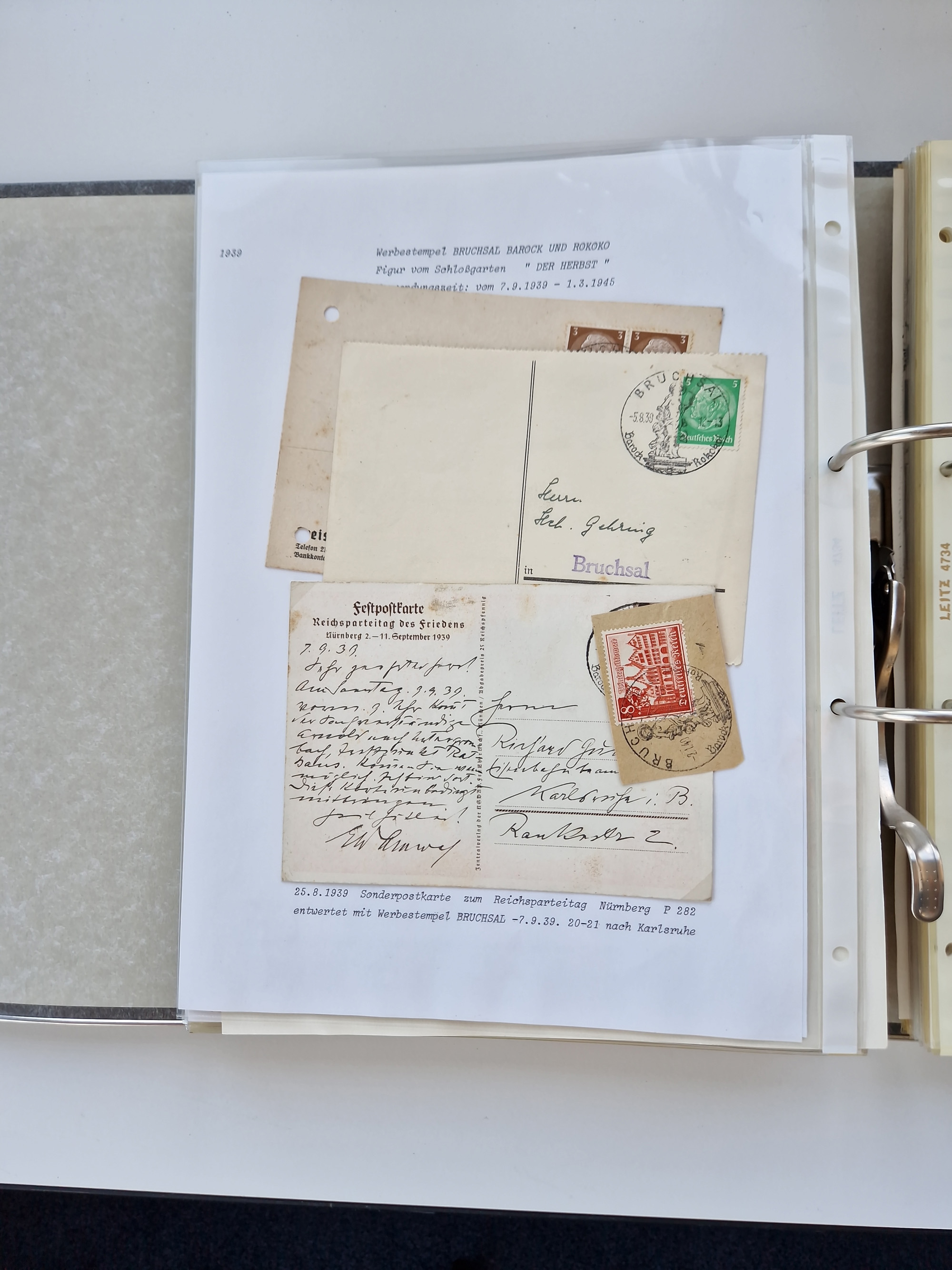 1870/2010 (ca.), Bruchsal und Umgebung, umfangreiche Heimatsammlung in 39 Ringordnern etwas unkonventionell, aber nichtsdestotrotz sehr inhaltsreich gesammelt mit zahlreichen Belegen ab Dt.Reich und auch losen Marken, u.a. Brustschilde mit Marken und besseren Frankaturen, Nachkriegszeit mit Besatzungszonen, auch eingehende Post aus Aller Welt.