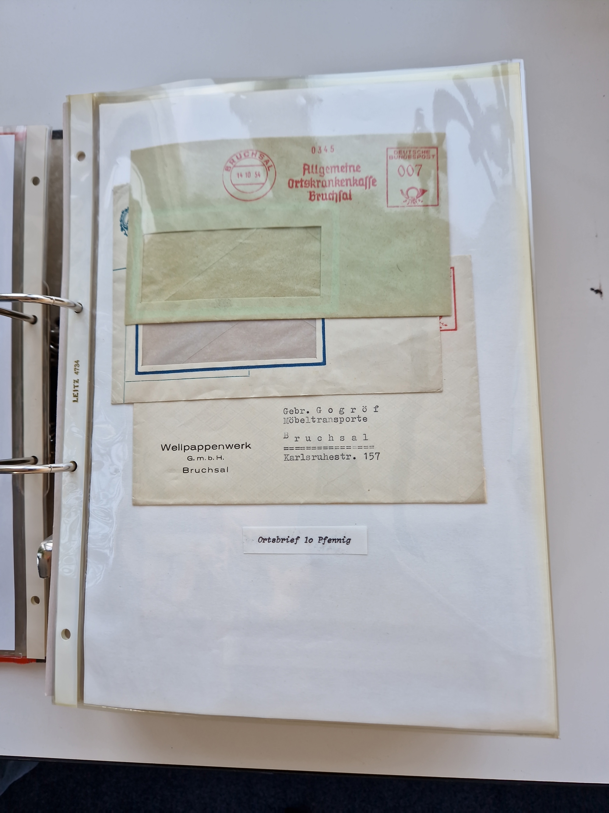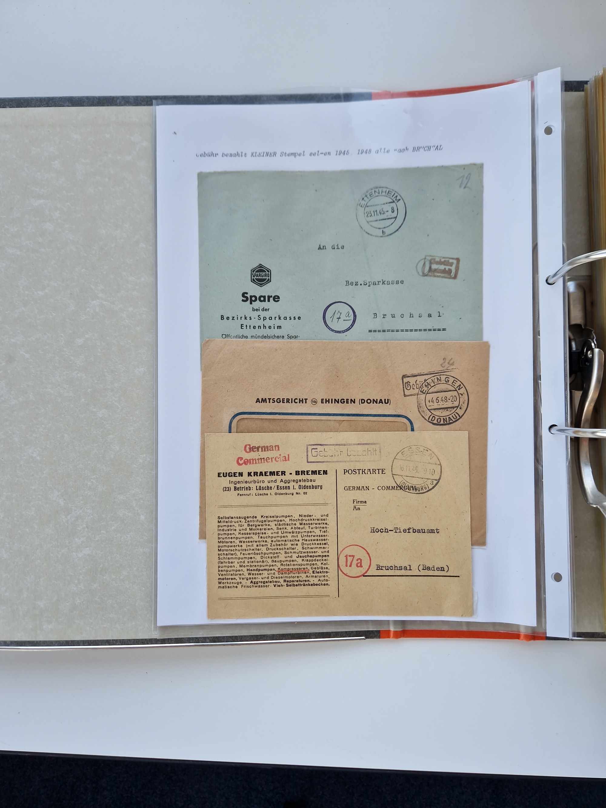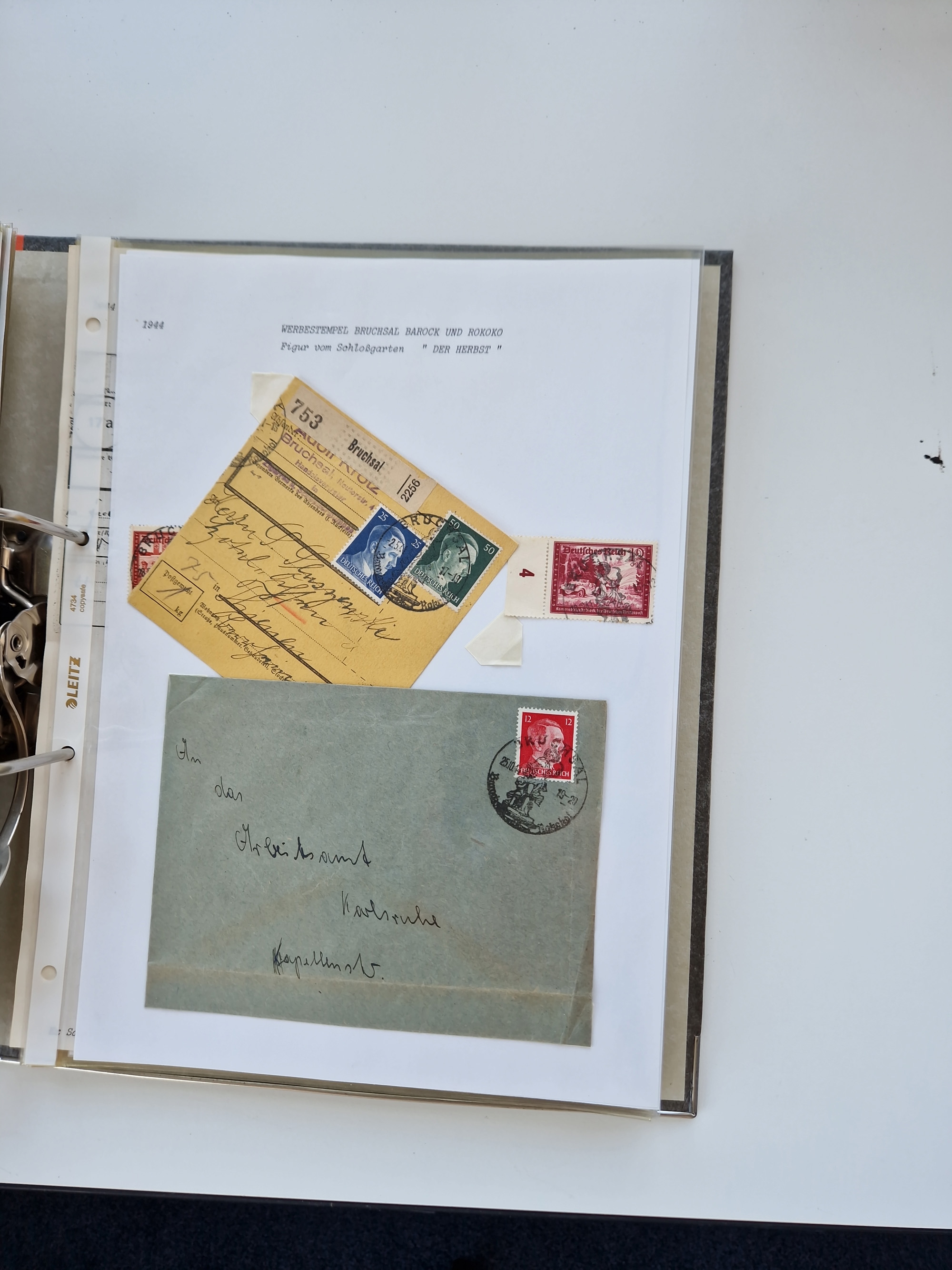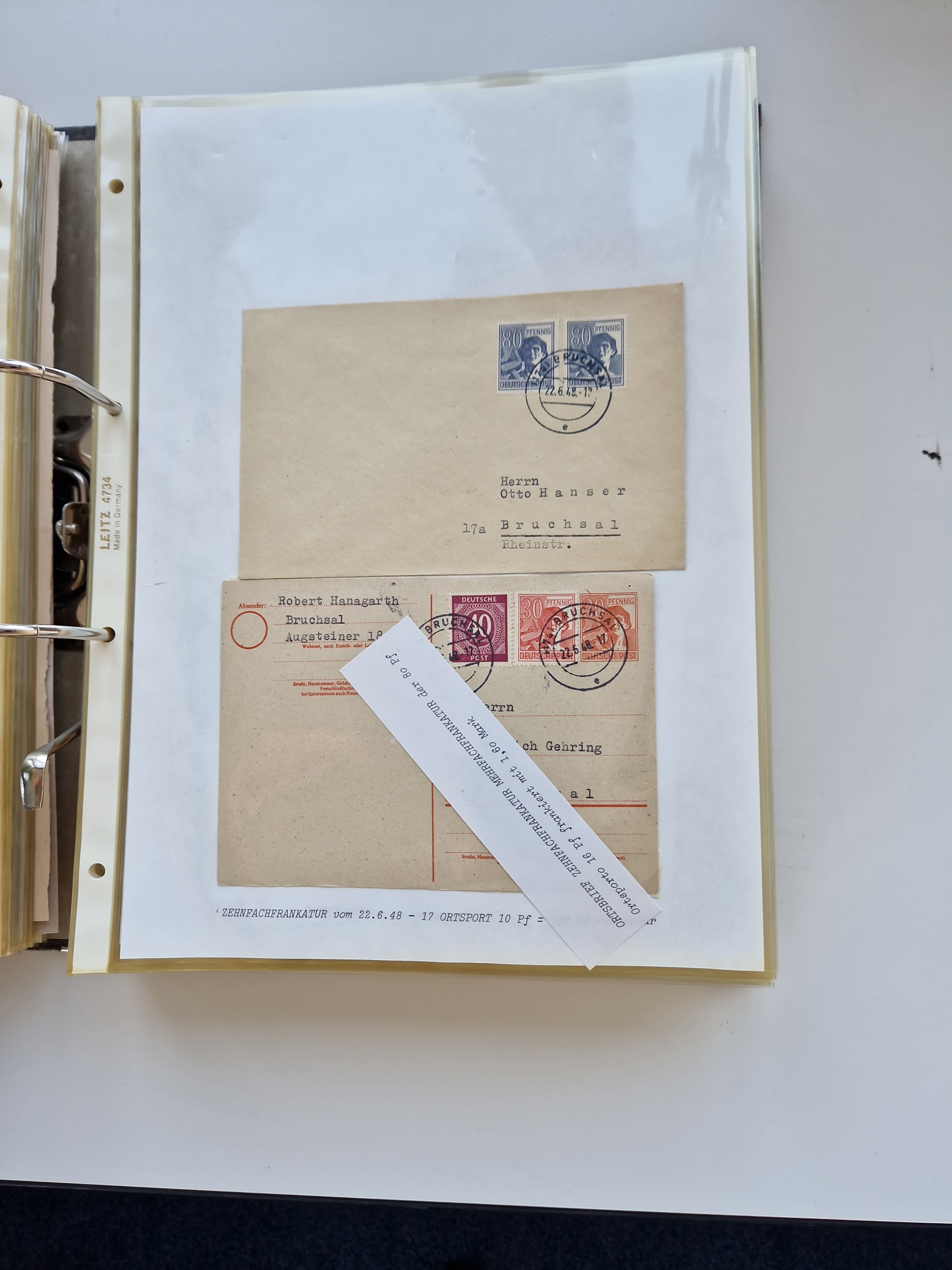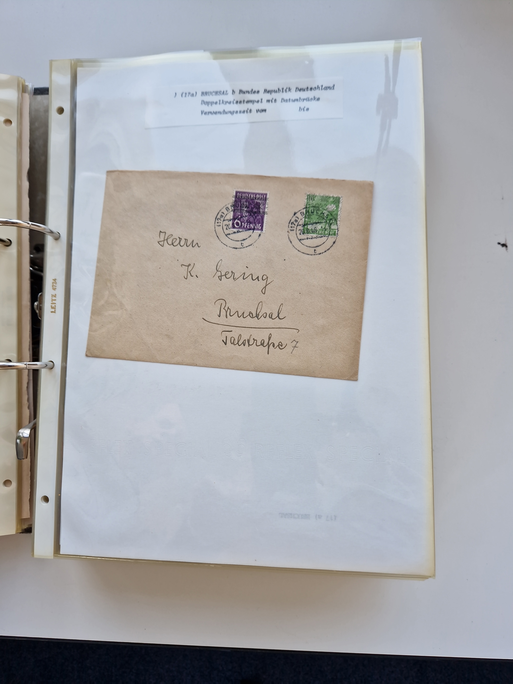 1870/2010 (ca.), Bruchsal und Umgebung, umfangreiche Heimatsammlung in 39 Ringordnern etwas unkonventionell, aber nichtsdestotrotz sehr inhaltsreich gesammelt mit zahlreichen Belegen ab Dt.Reich und auch losen Marken, u.a. Brustschilde mit Marken und besseren Frankaturen, Nachkriegszeit mit Besatzungszonen, auch eingehende Post aus Aller Welt.