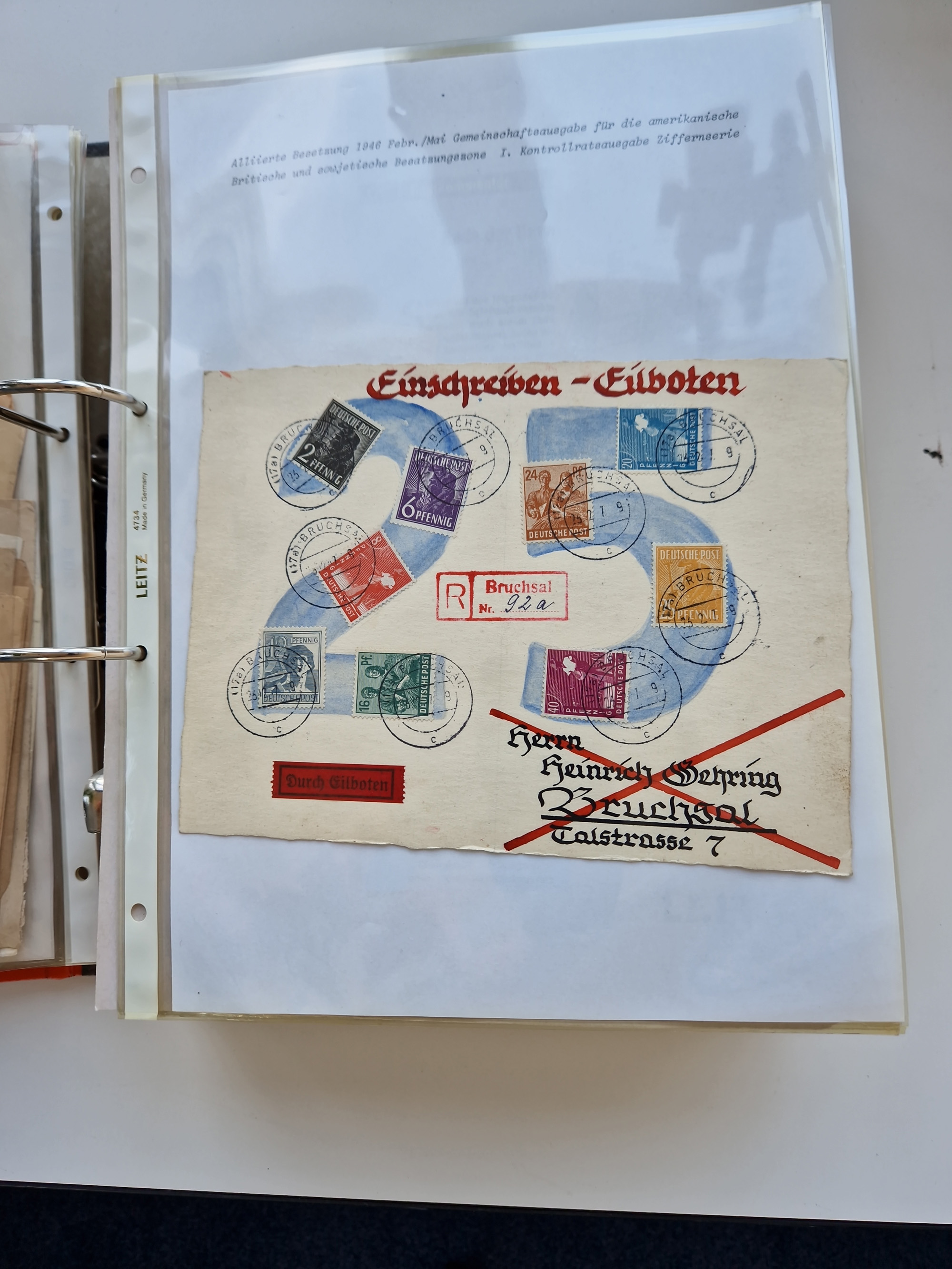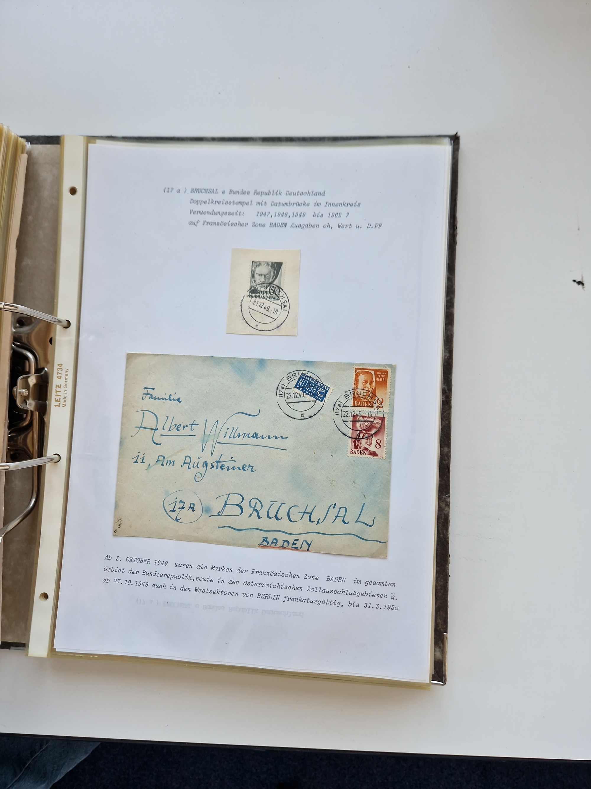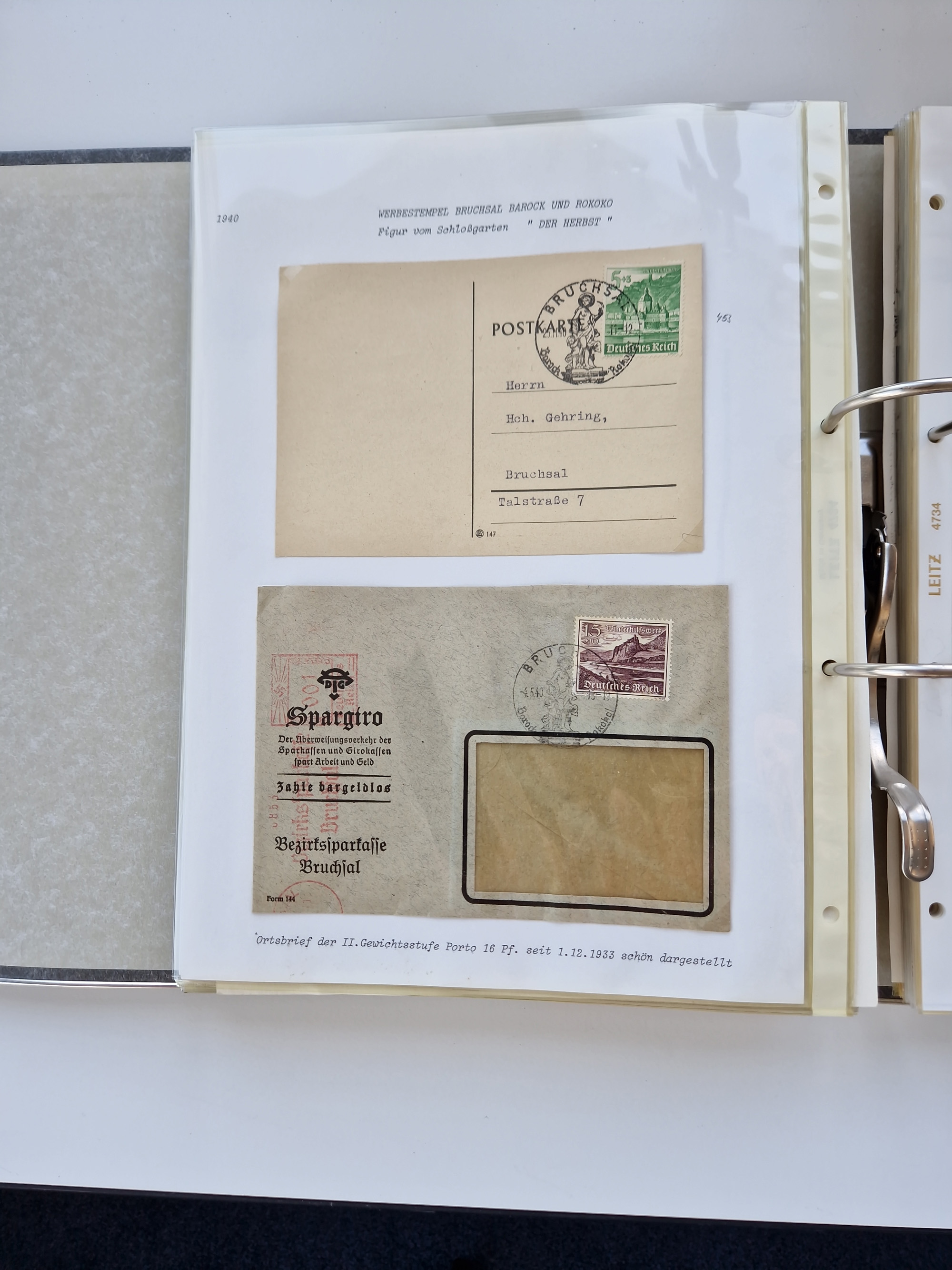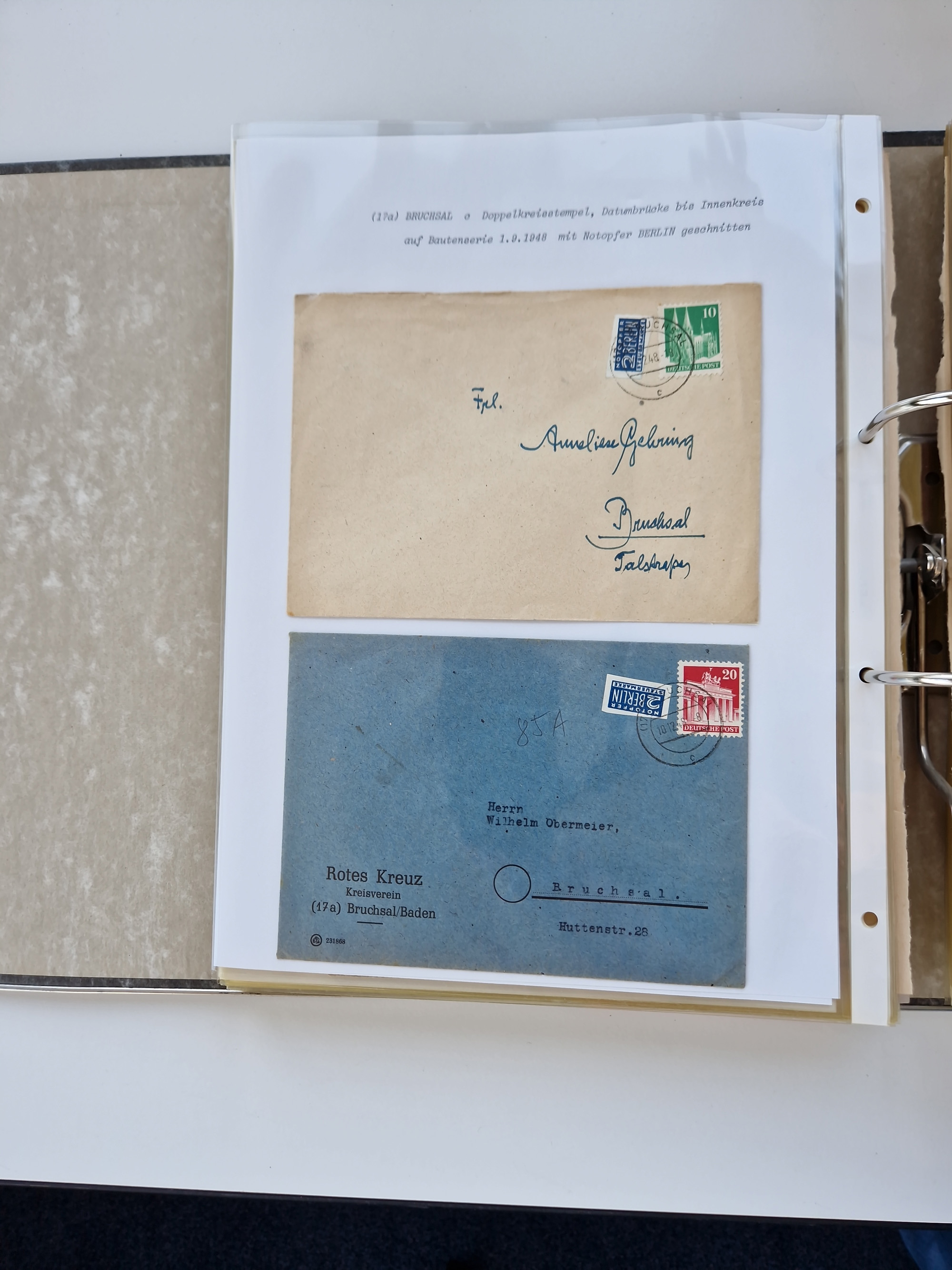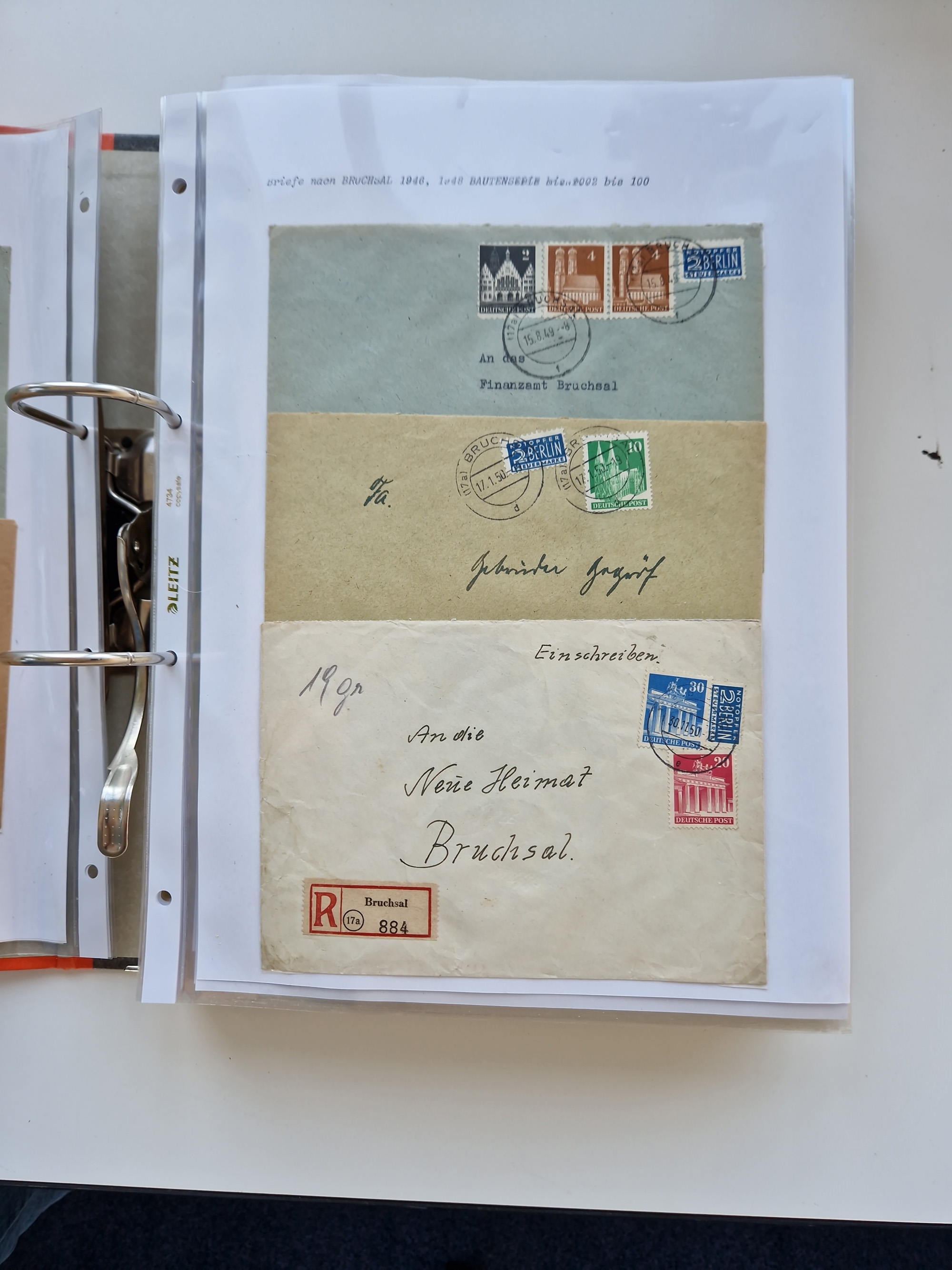 1870/2010 (ca.), Bruchsal und Umgebung, umfangreiche Heimatsammlung in 39 Ringordnern etwas unkonventionell, aber nichtsdestotrotz sehr inhaltsreich gesammelt mit zahlreichen Belegen ab Dt.Reich und auch losen Marken, u.a. Brustschilde mit Marken und besseren Frankaturen, Nachkriegszeit mit Besatzungszonen, auch eingehende Post aus Aller Welt.