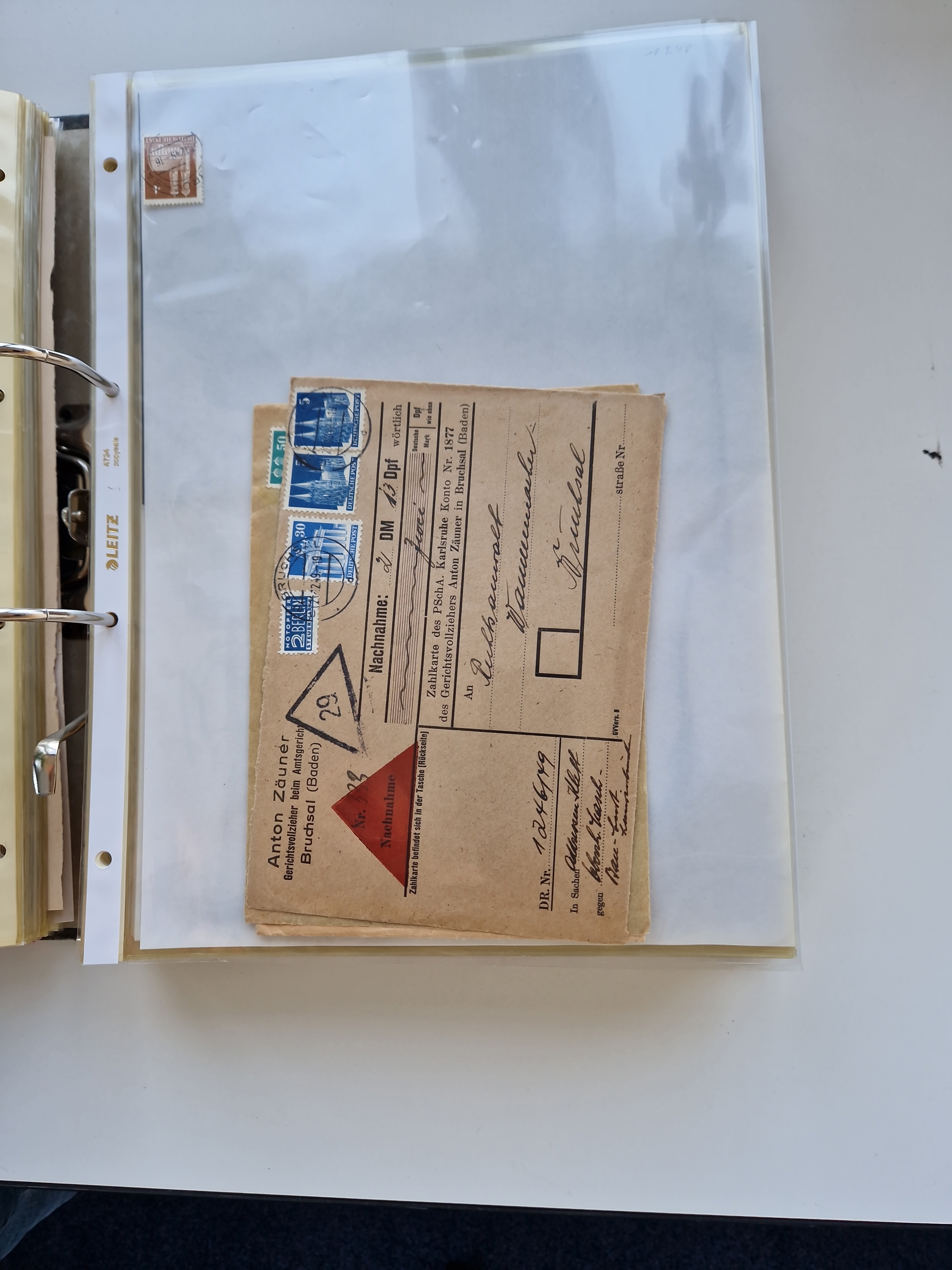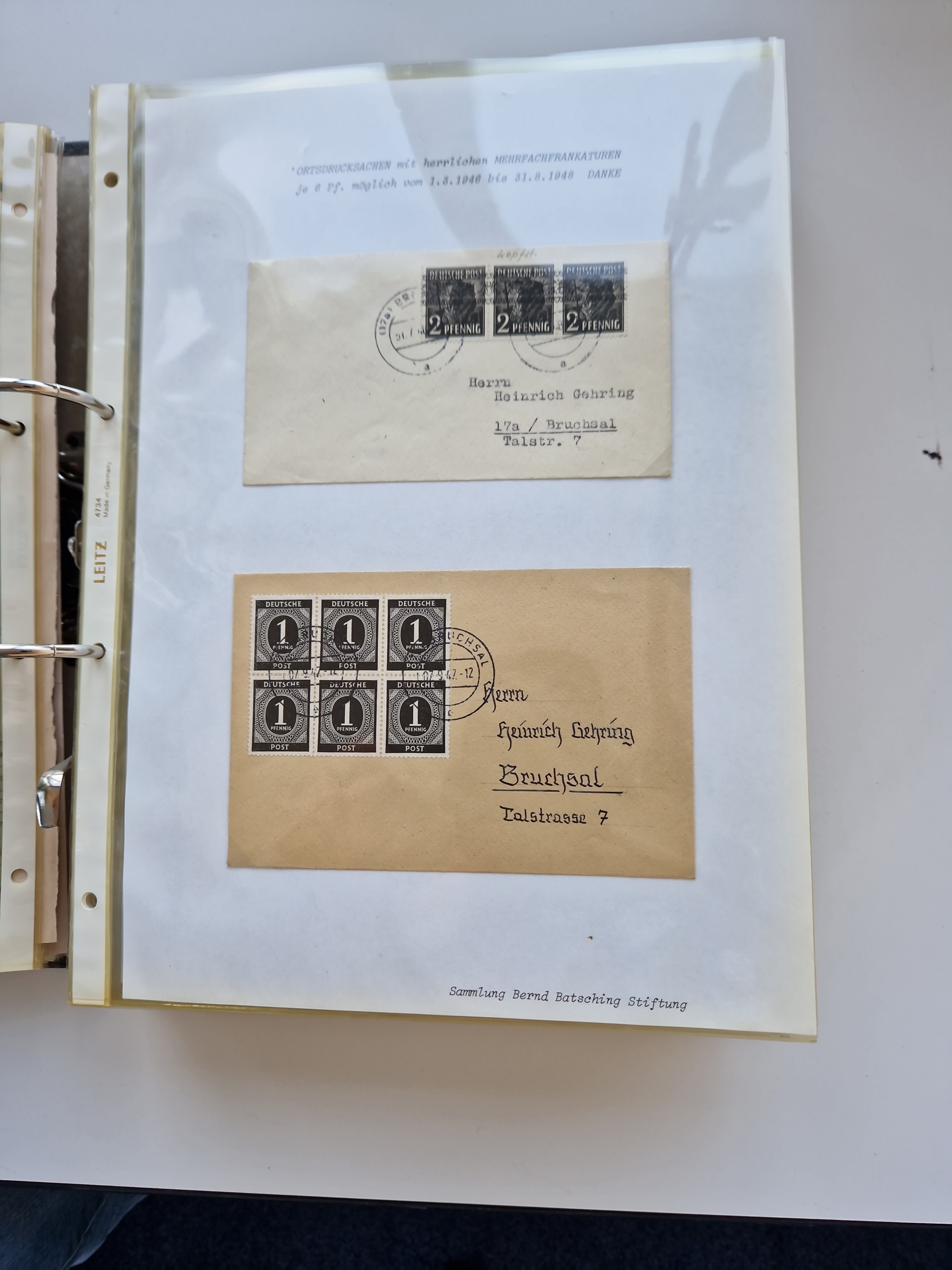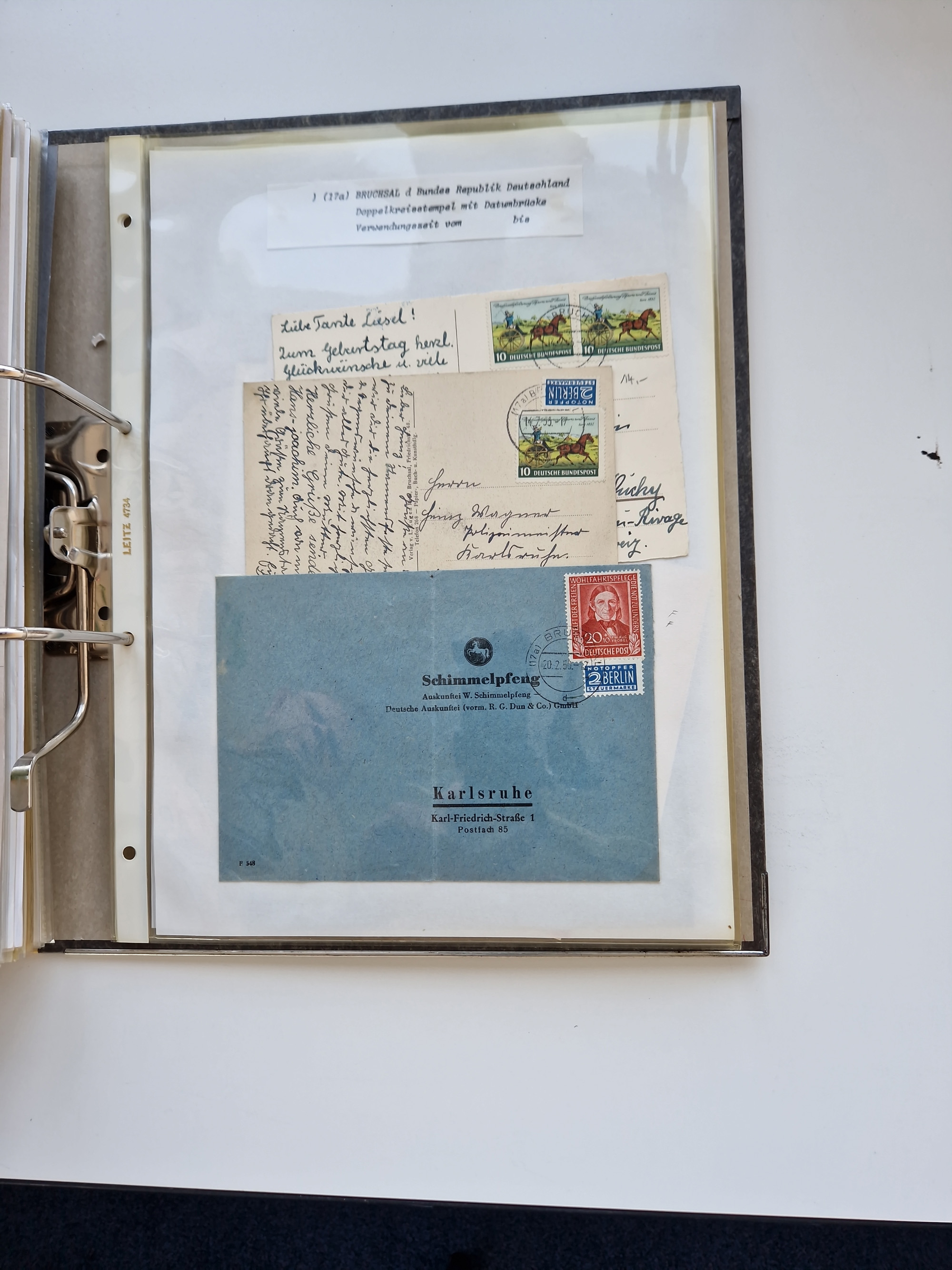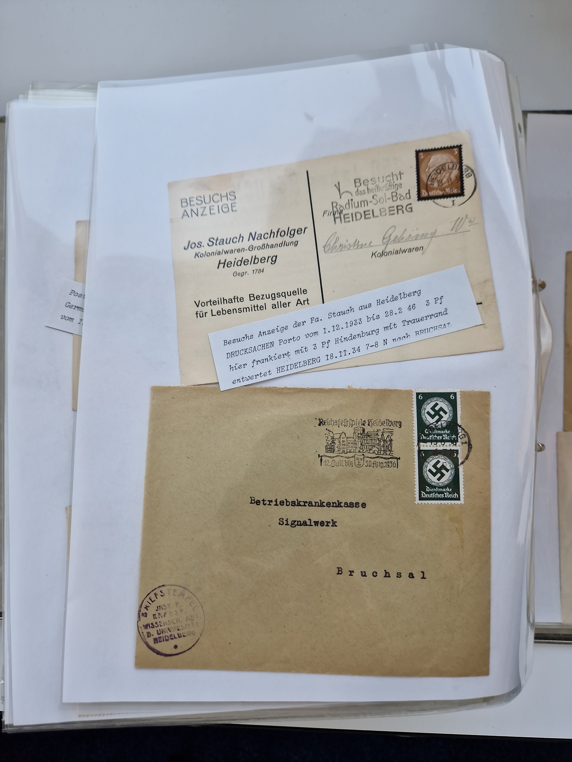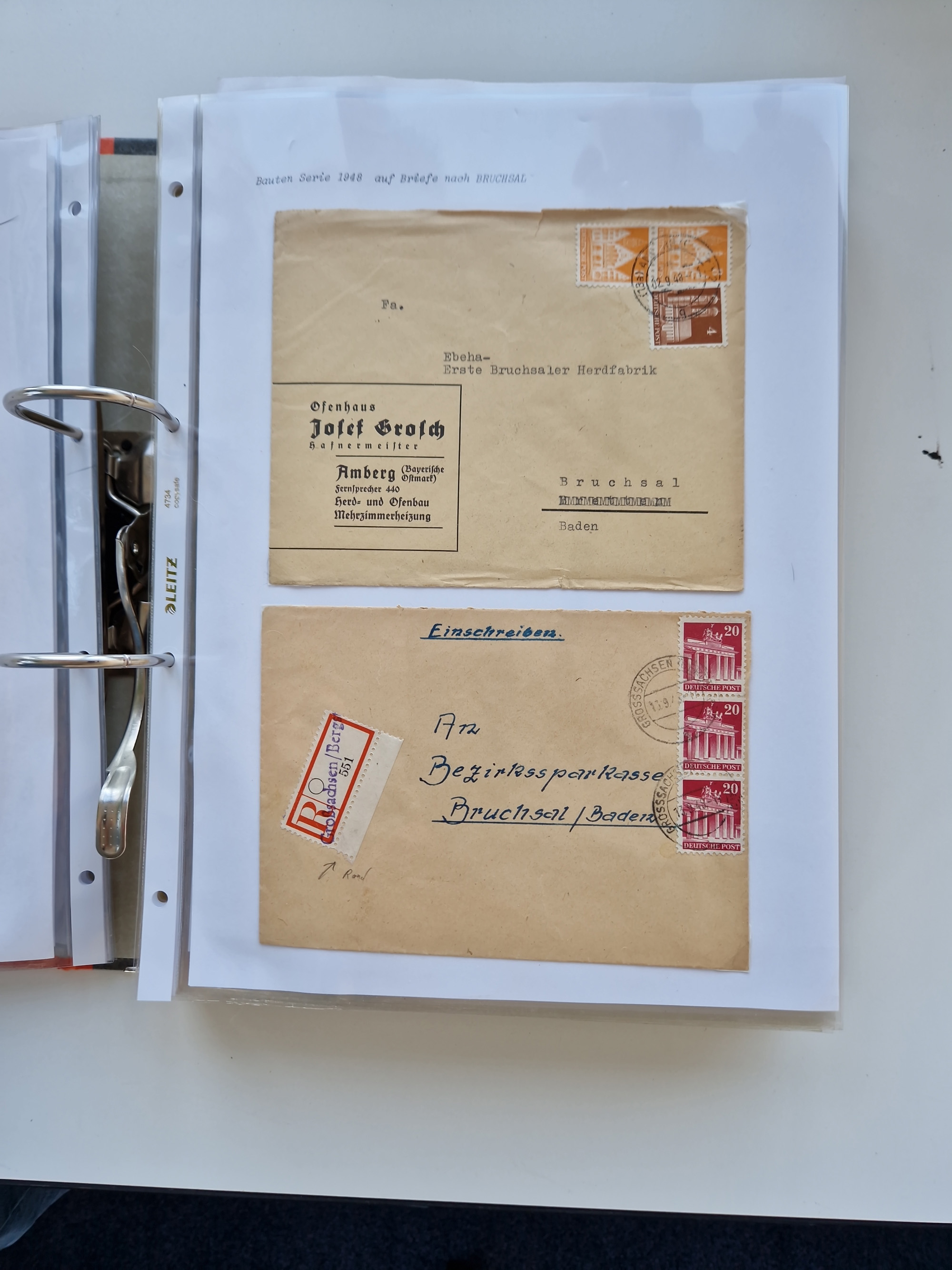 1870/2010 (ca.), Bruchsal und Umgebung, umfangreiche Heimatsammlung in 39 Ringordnern etwas unkonventionell, aber nichtsdestotrotz sehr inhaltsreich gesammelt mit zahlreichen Belegen ab Dt.Reich und auch losen Marken, u.a. Brustschilde mit Marken und besseren Frankaturen, Nachkriegszeit mit Besatzungszonen, auch eingehende Post aus Aller Welt.