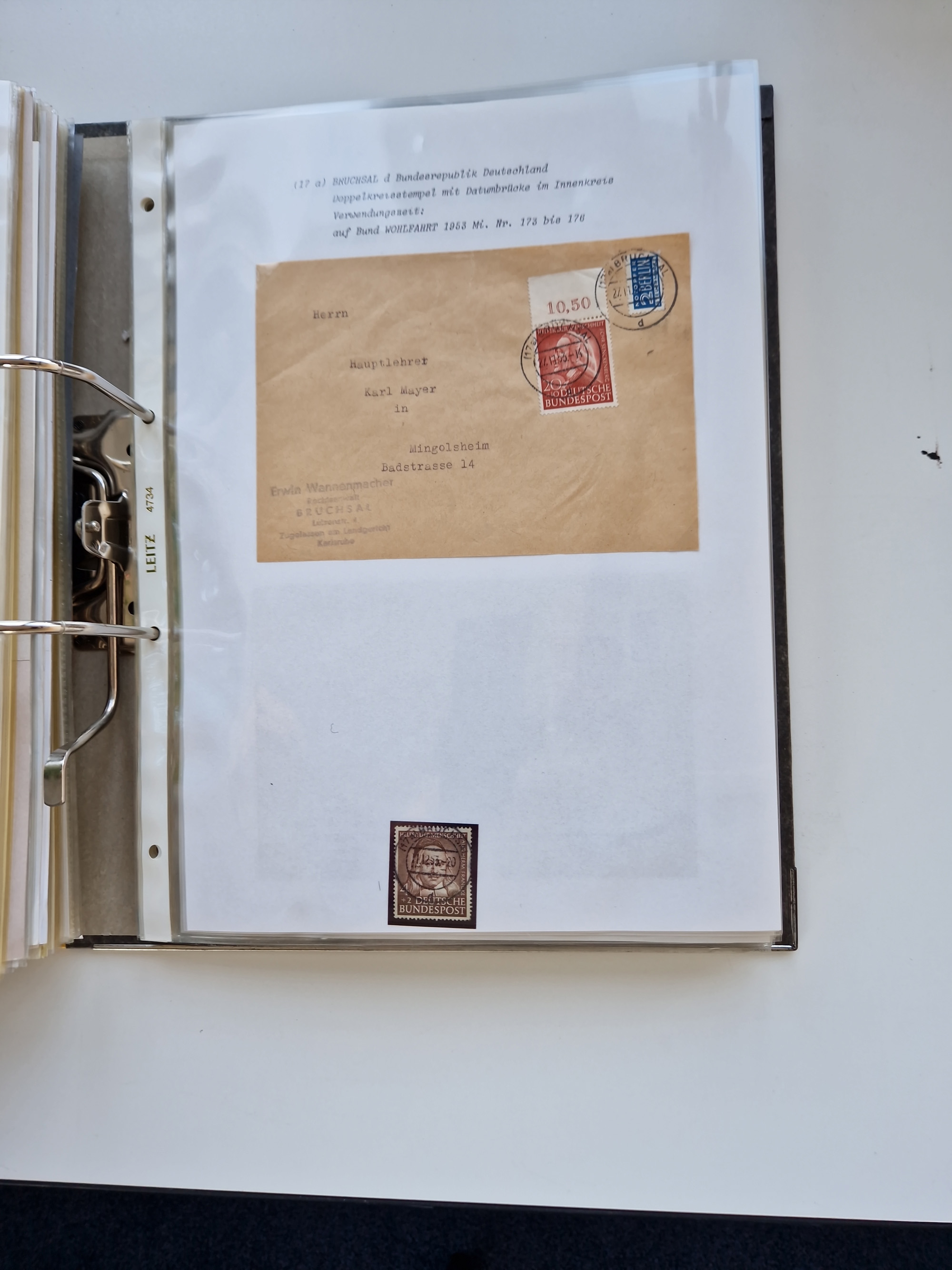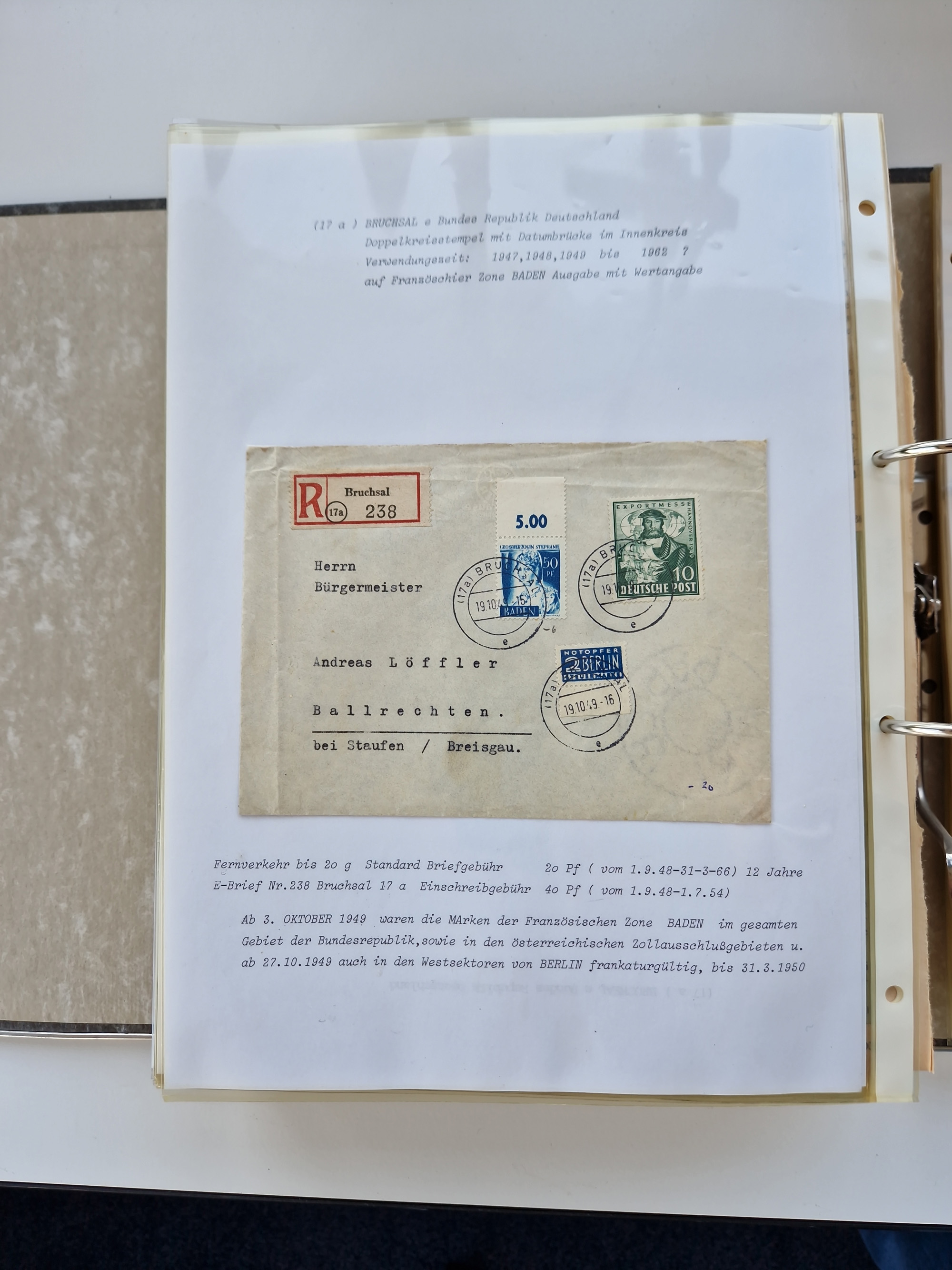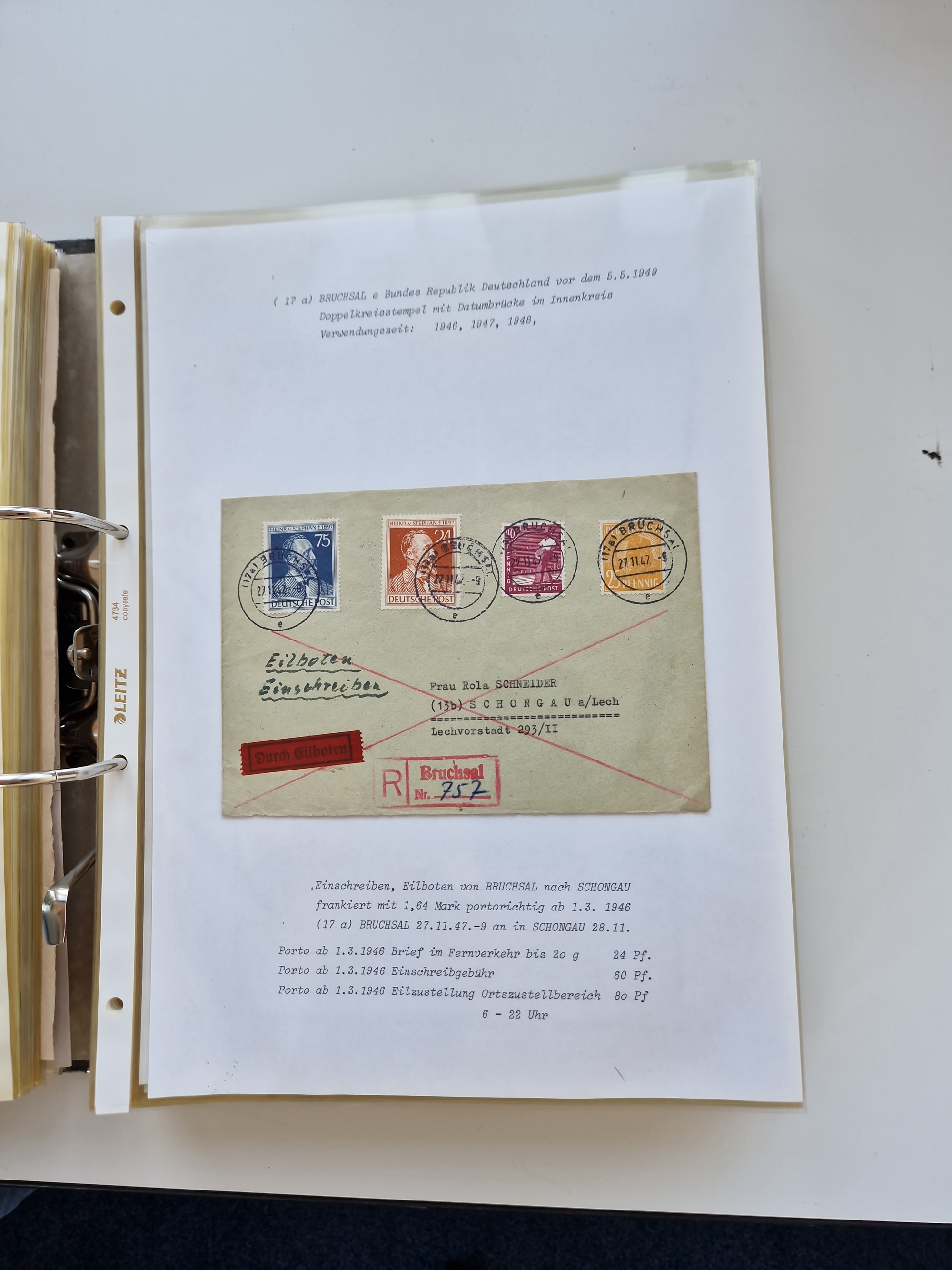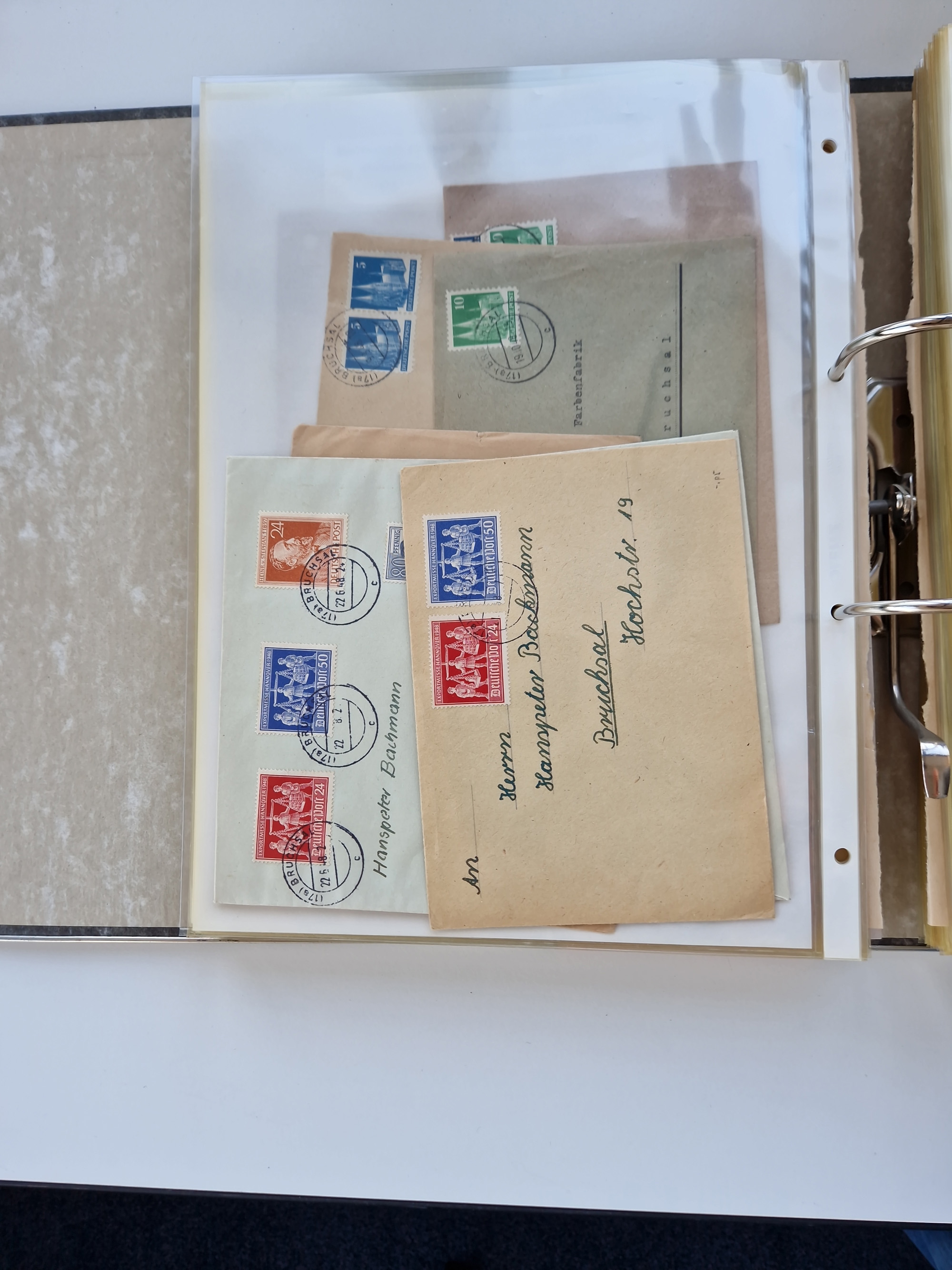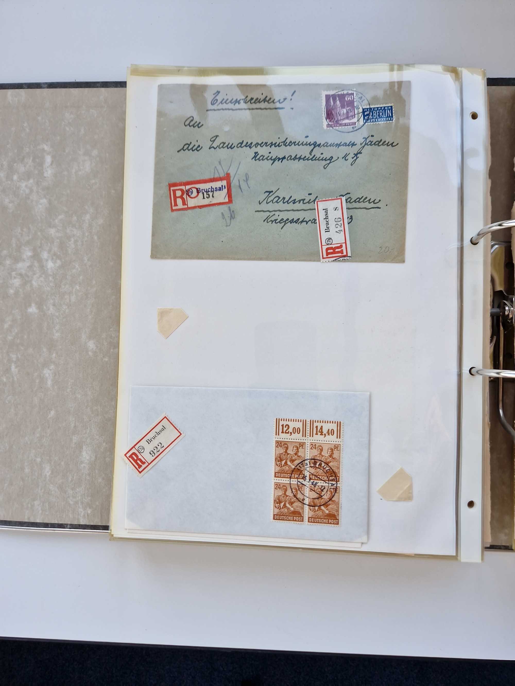 1870/2010 (ca.), Bruchsal und Umgebung, umfangreiche Heimatsammlung in 39 Ringordnern etwas unkonventionell, aber nichtsdestotrotz sehr inhaltsreich gesammelt mit zahlreichen Belegen ab Dt.Reich und auch losen Marken, u.a. Brustschilde mit Marken und besseren Frankaturen, Nachkriegszeit mit Besatzungszonen, auch eingehende Post aus Aller Welt.