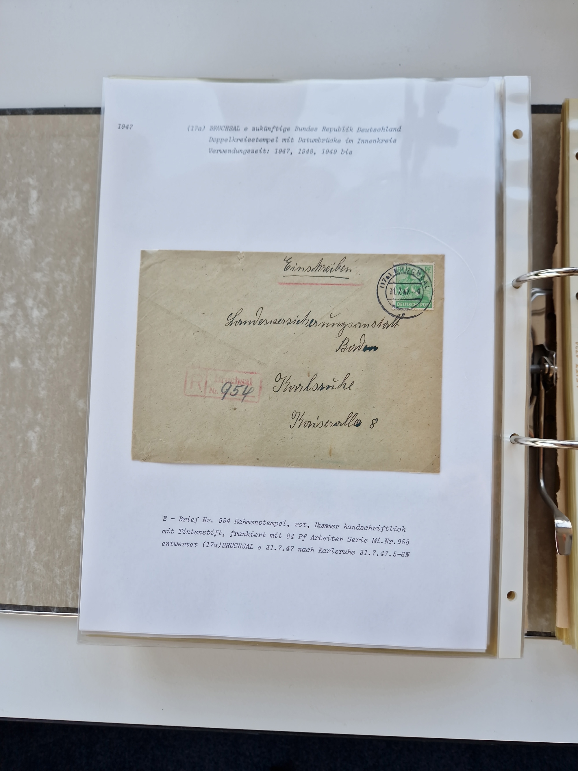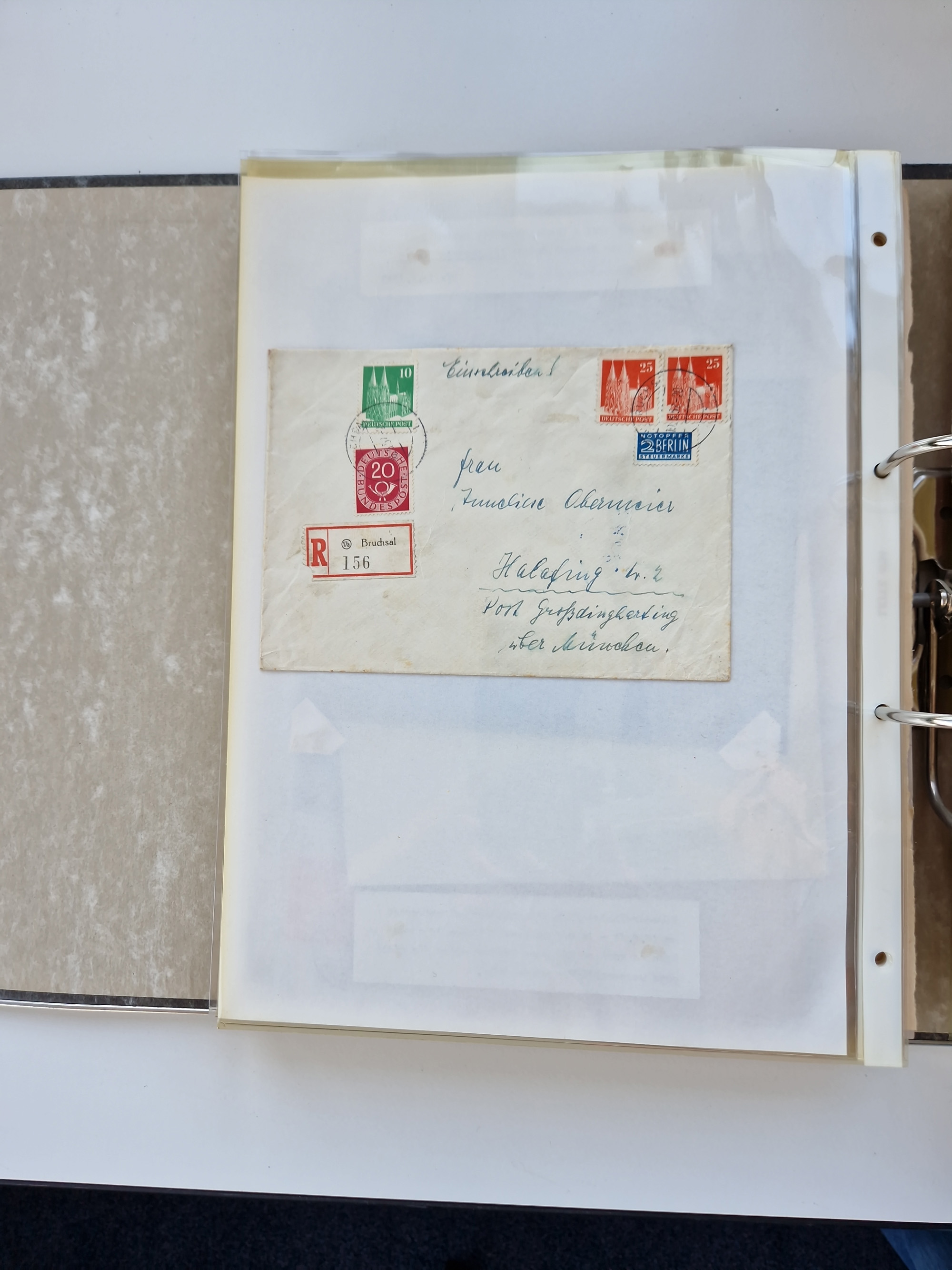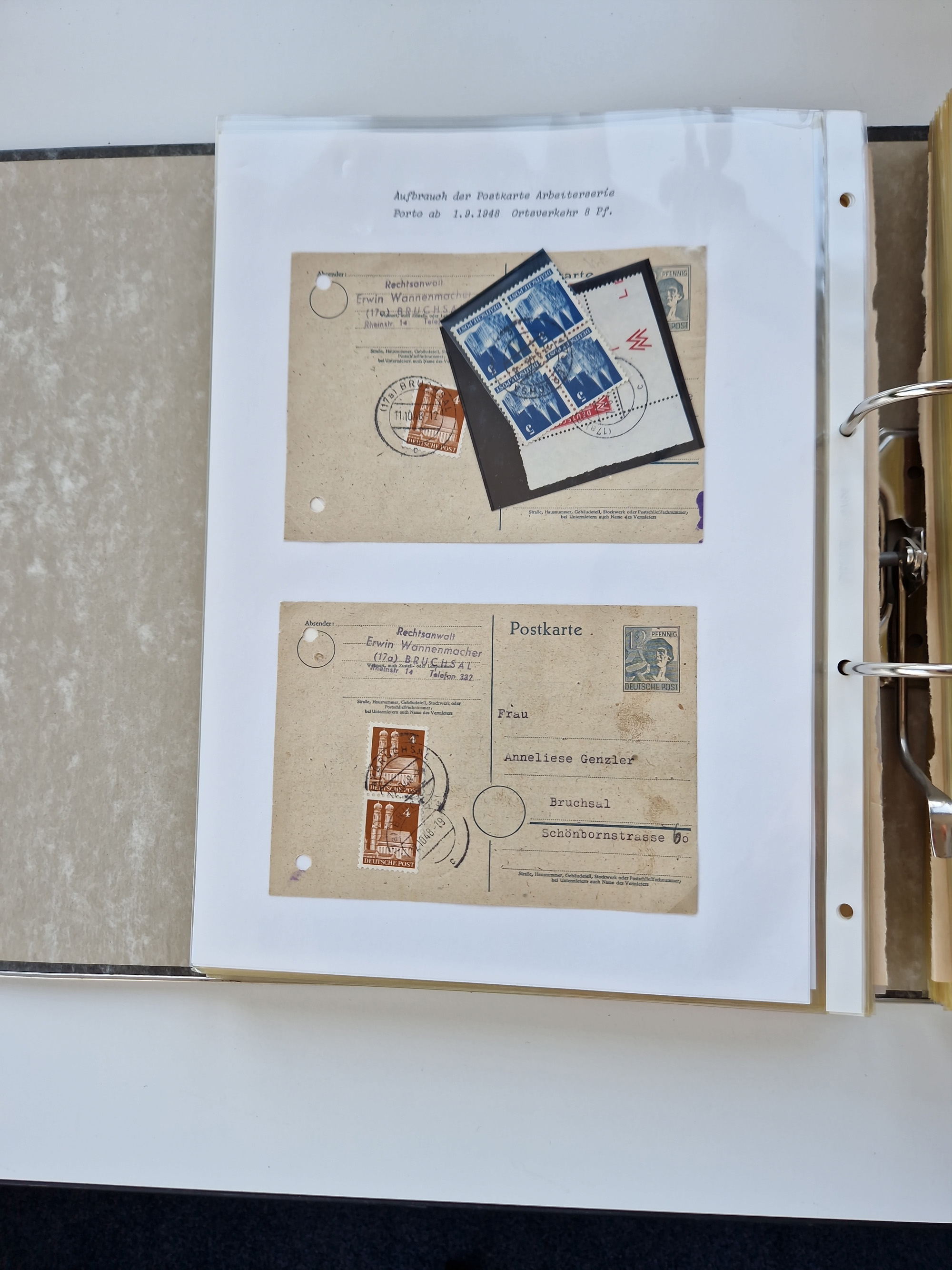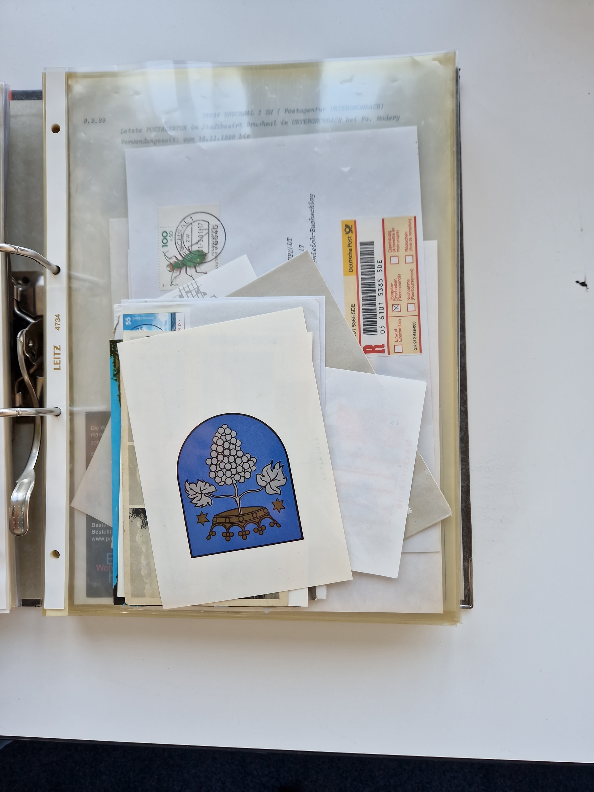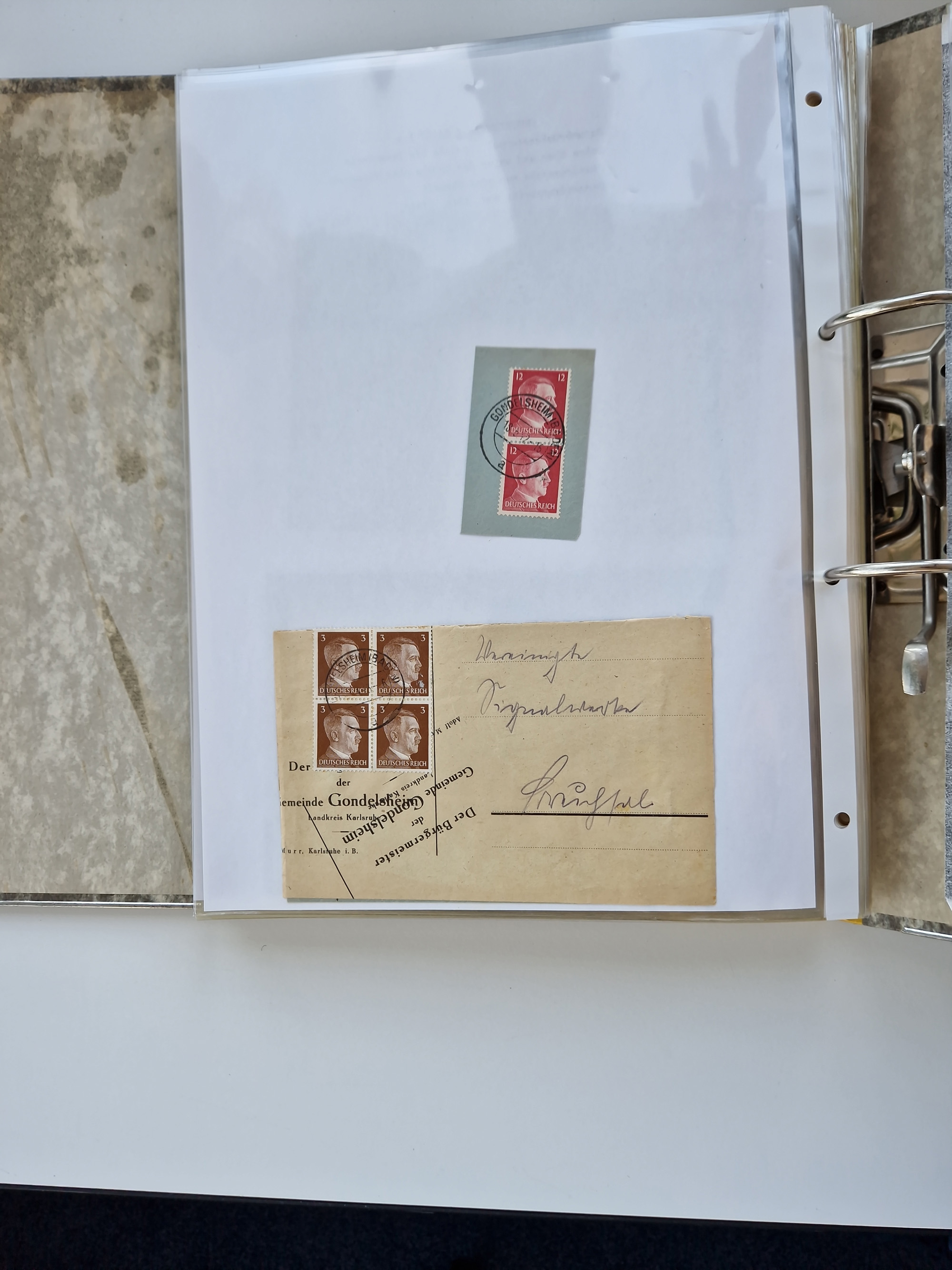 1870/2010 (ca.), Bruchsal und Umgebung, umfangreiche Heimatsammlung in 39 Ringordnern etwas unkonventionell, aber nichtsdestotrotz sehr inhaltsreich gesammelt mit zahlreichen Belegen ab Dt.Reich und auch losen Marken, u.a. Brustschilde mit Marken und besseren Frankaturen, Nachkriegszeit mit Besatzungszonen, auch eingehende Post aus Aller Welt.