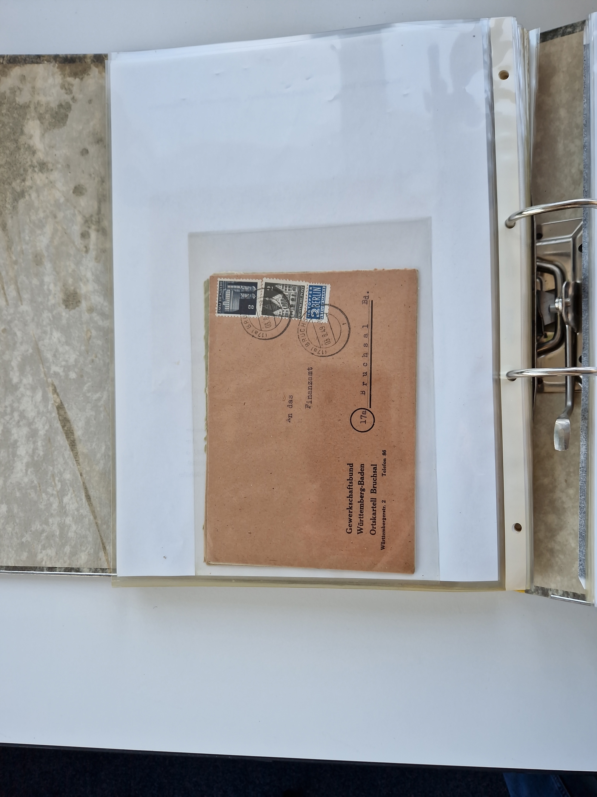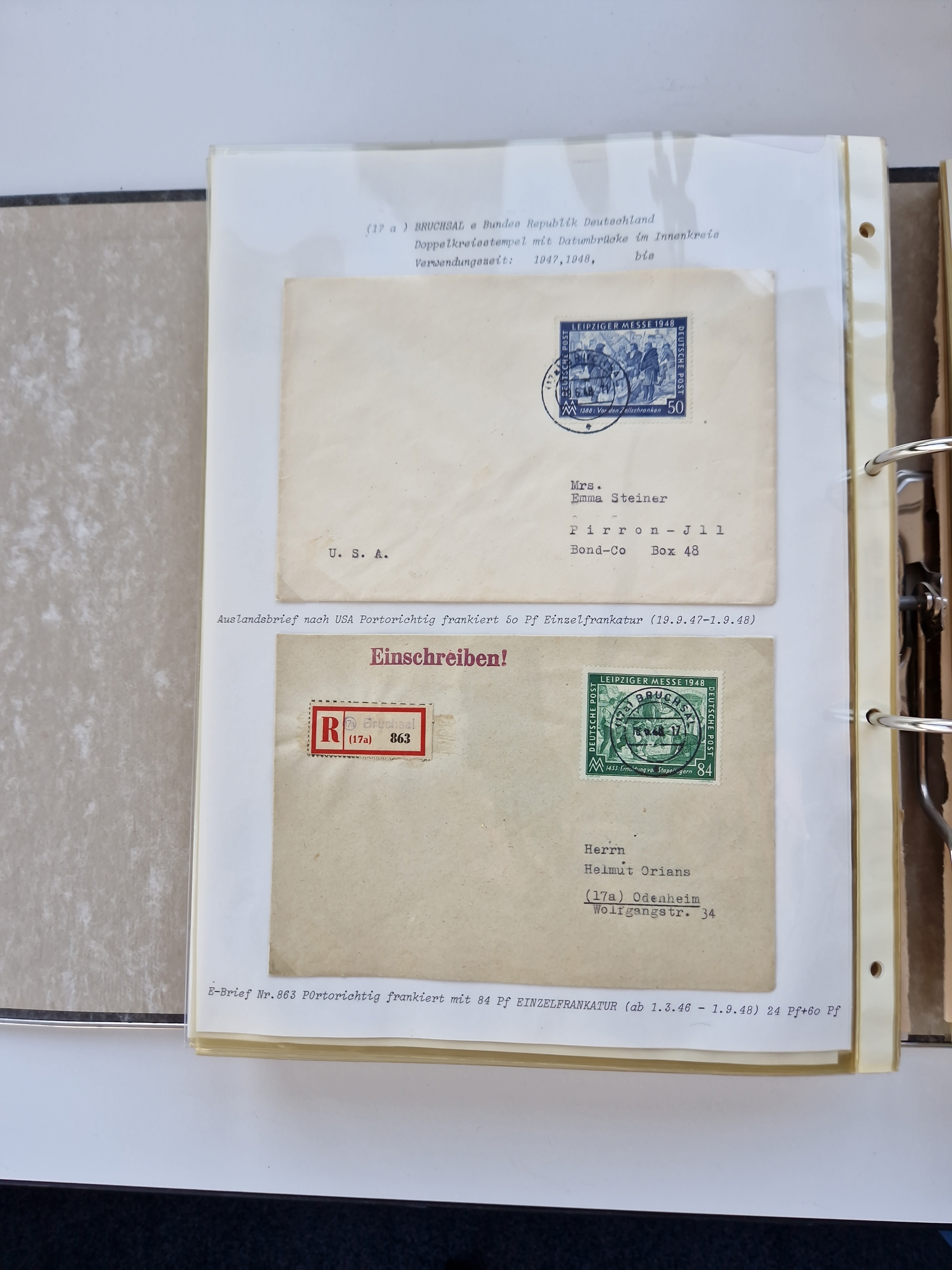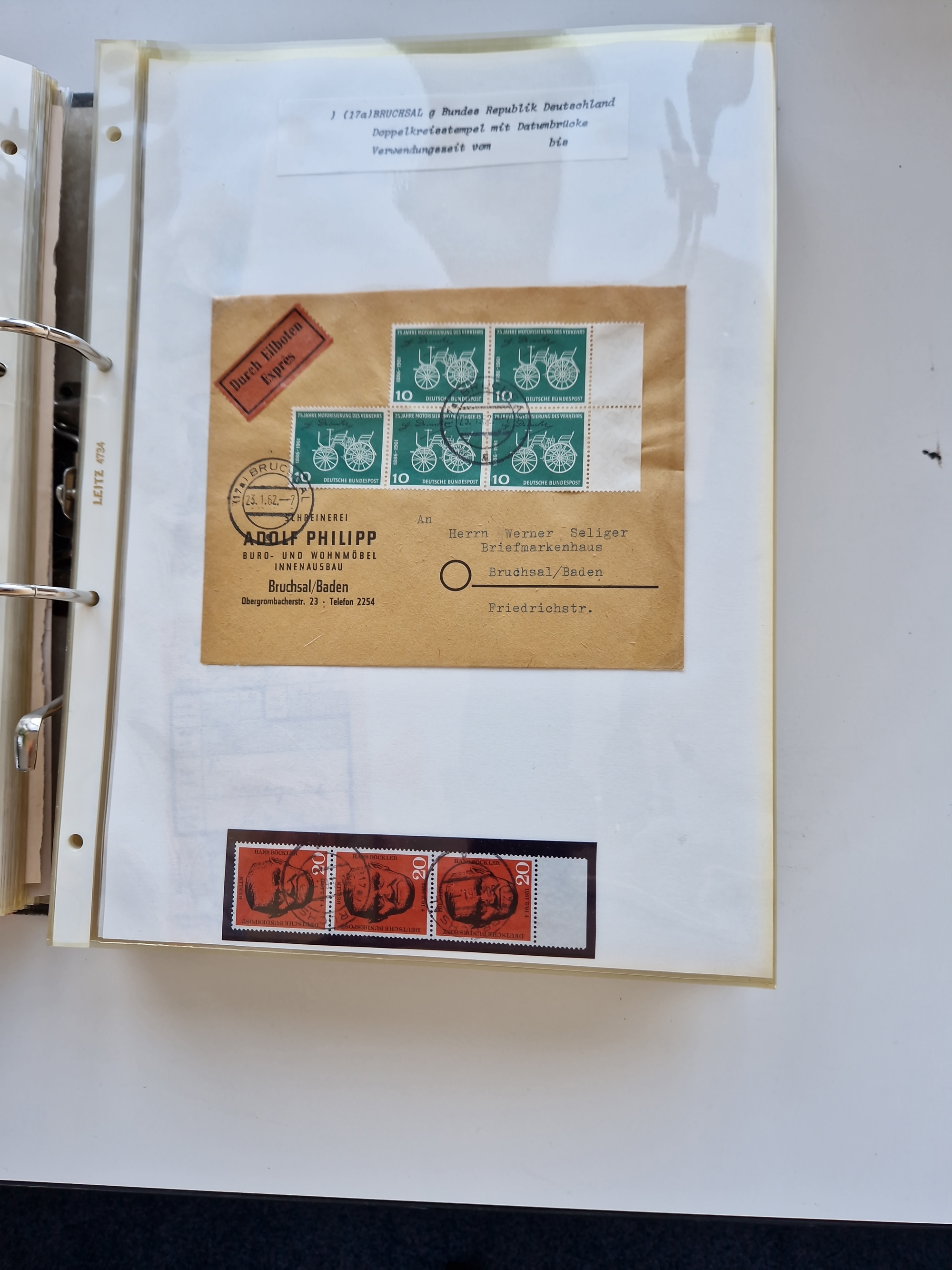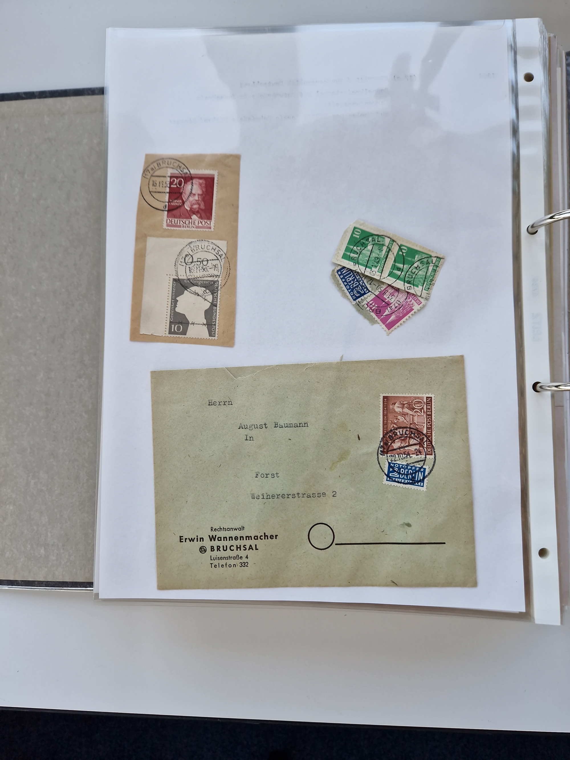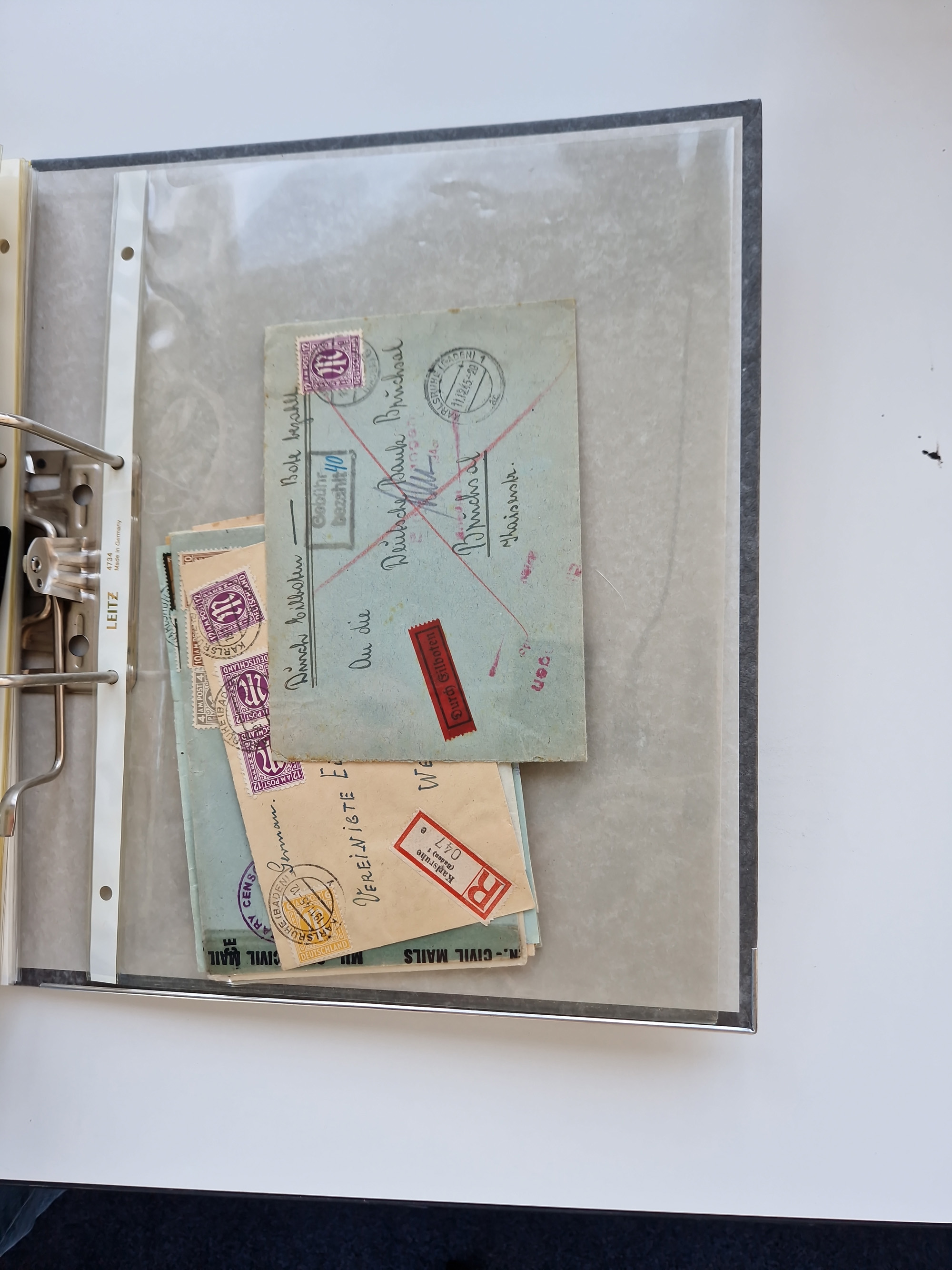 1870/2010 (ca.), Bruchsal und Umgebung, umfangreiche Heimatsammlung in 39 Ringordnern etwas unkonventionell, aber nichtsdestotrotz sehr inhaltsreich gesammelt mit zahlreichen Belegen ab Dt.Reich und auch losen Marken, u.a. Brustschilde mit Marken und besseren Frankaturen, Nachkriegszeit mit Besatzungszonen, auch eingehende Post aus Aller Welt.