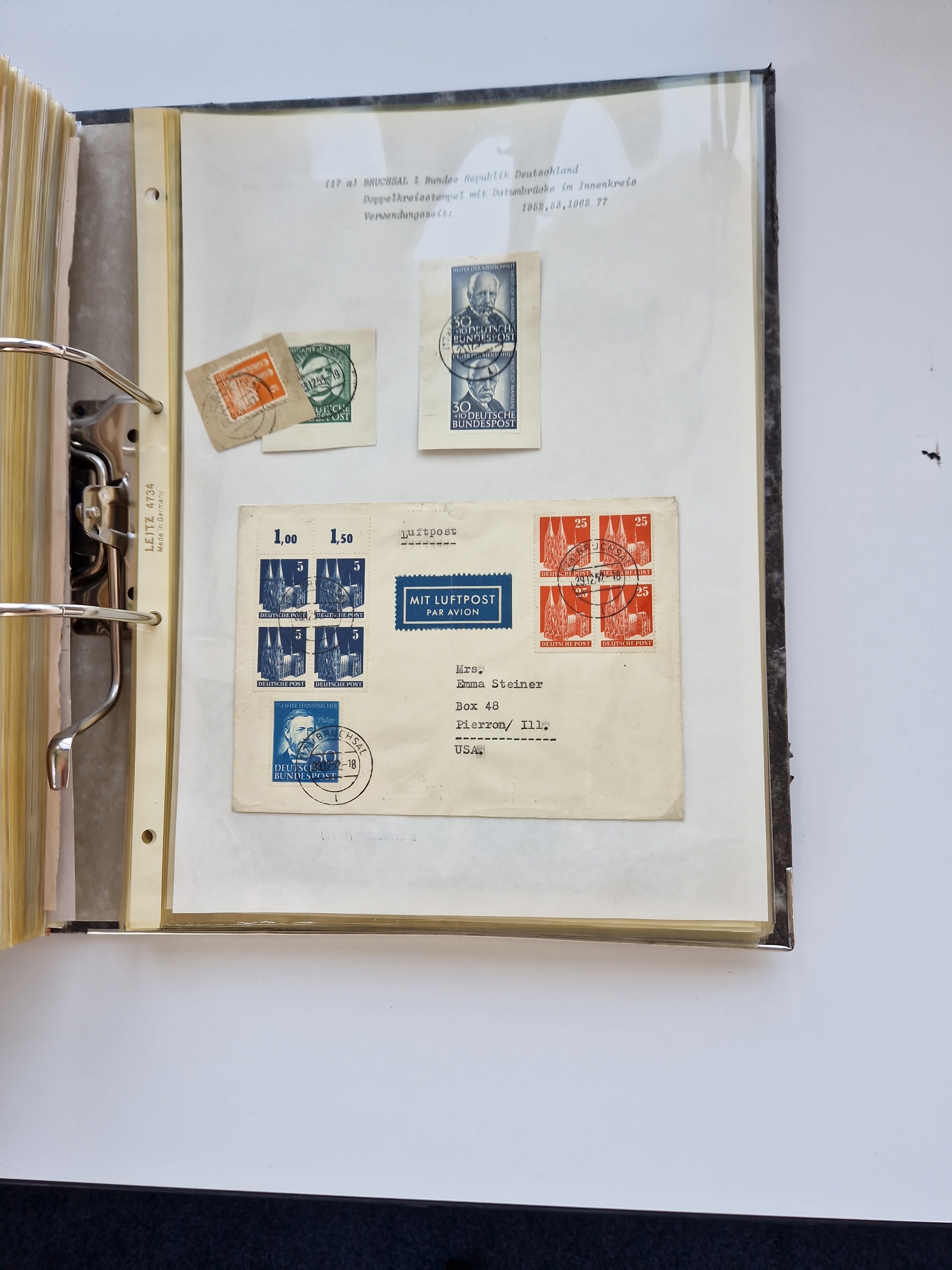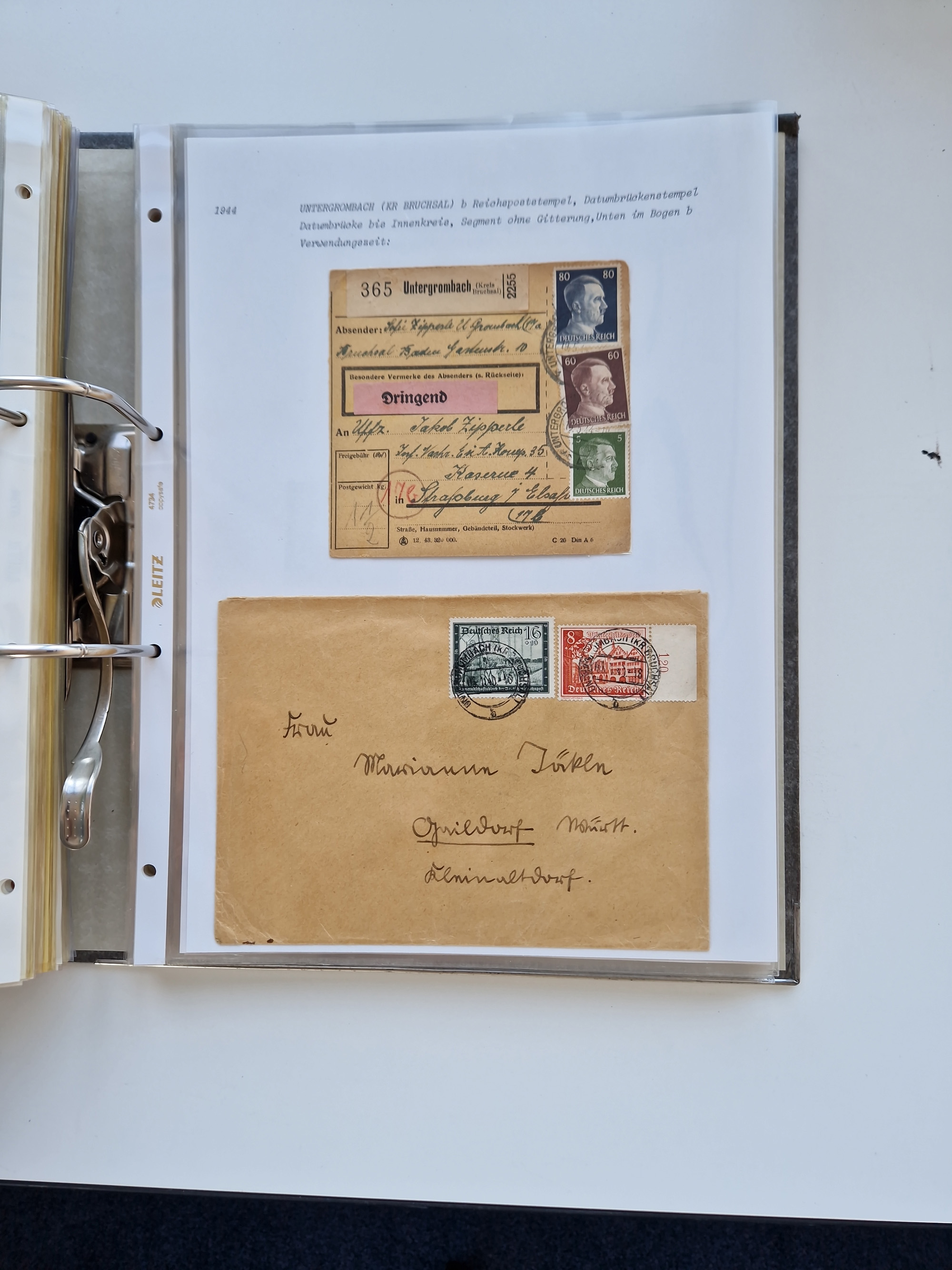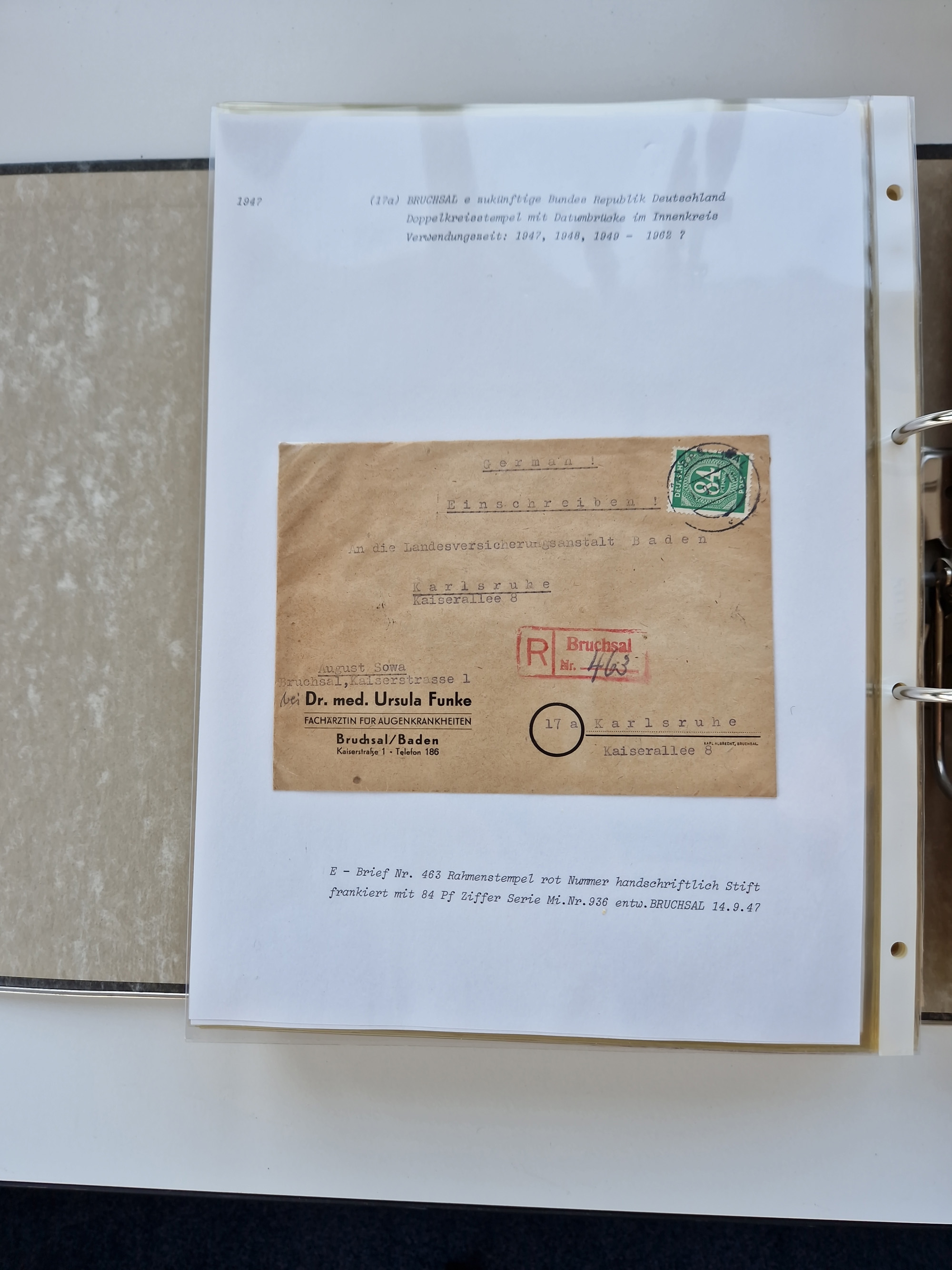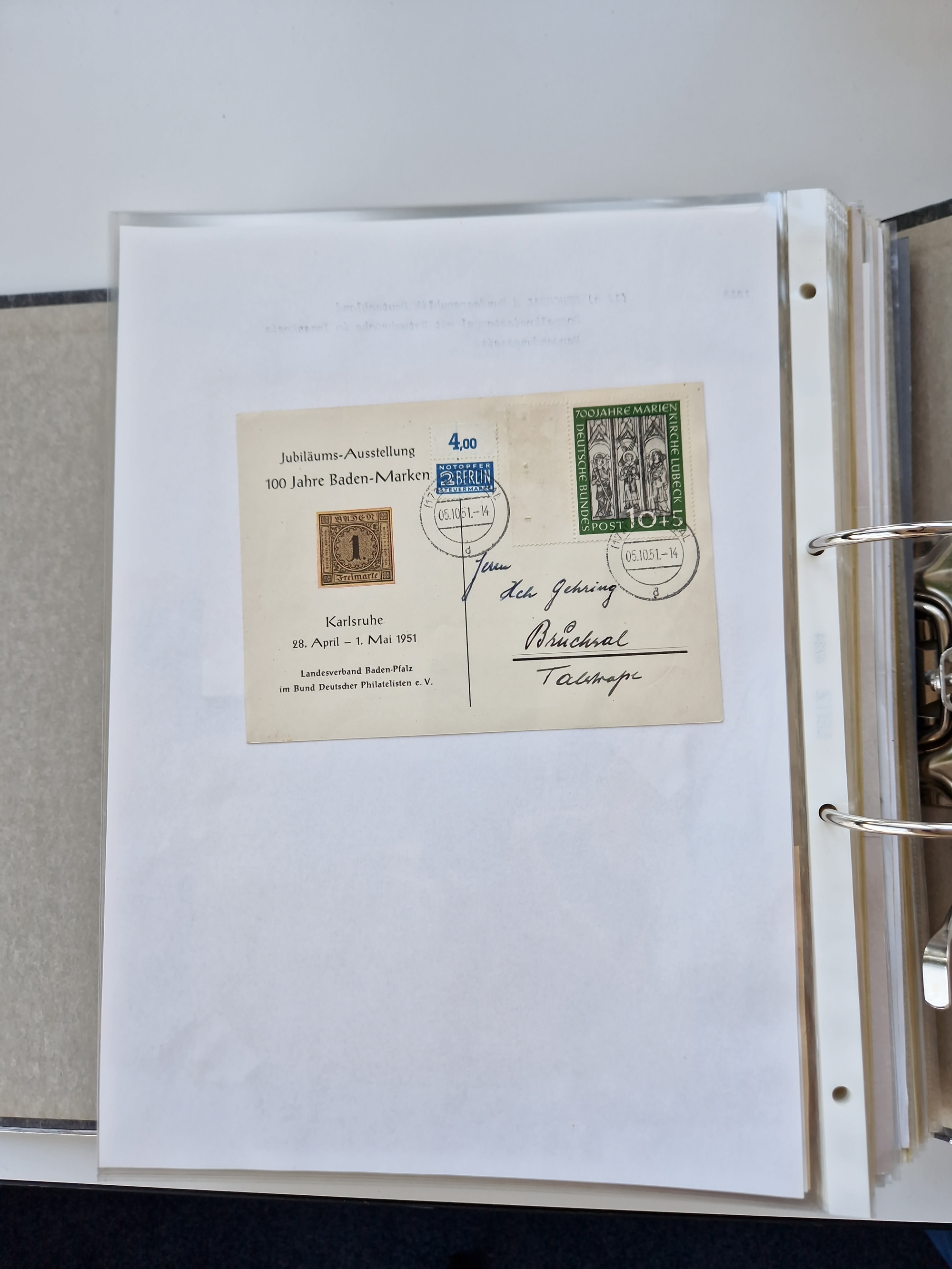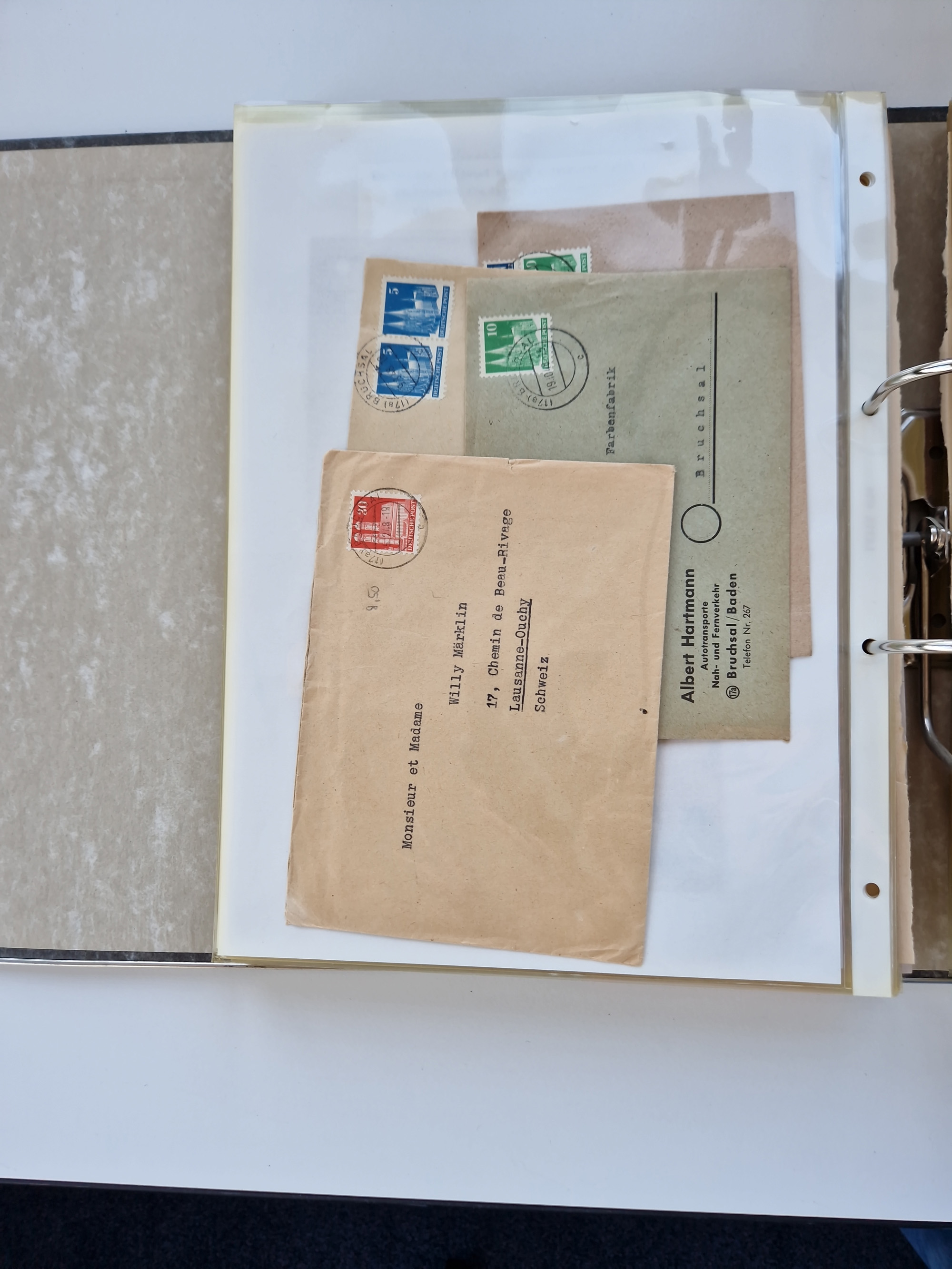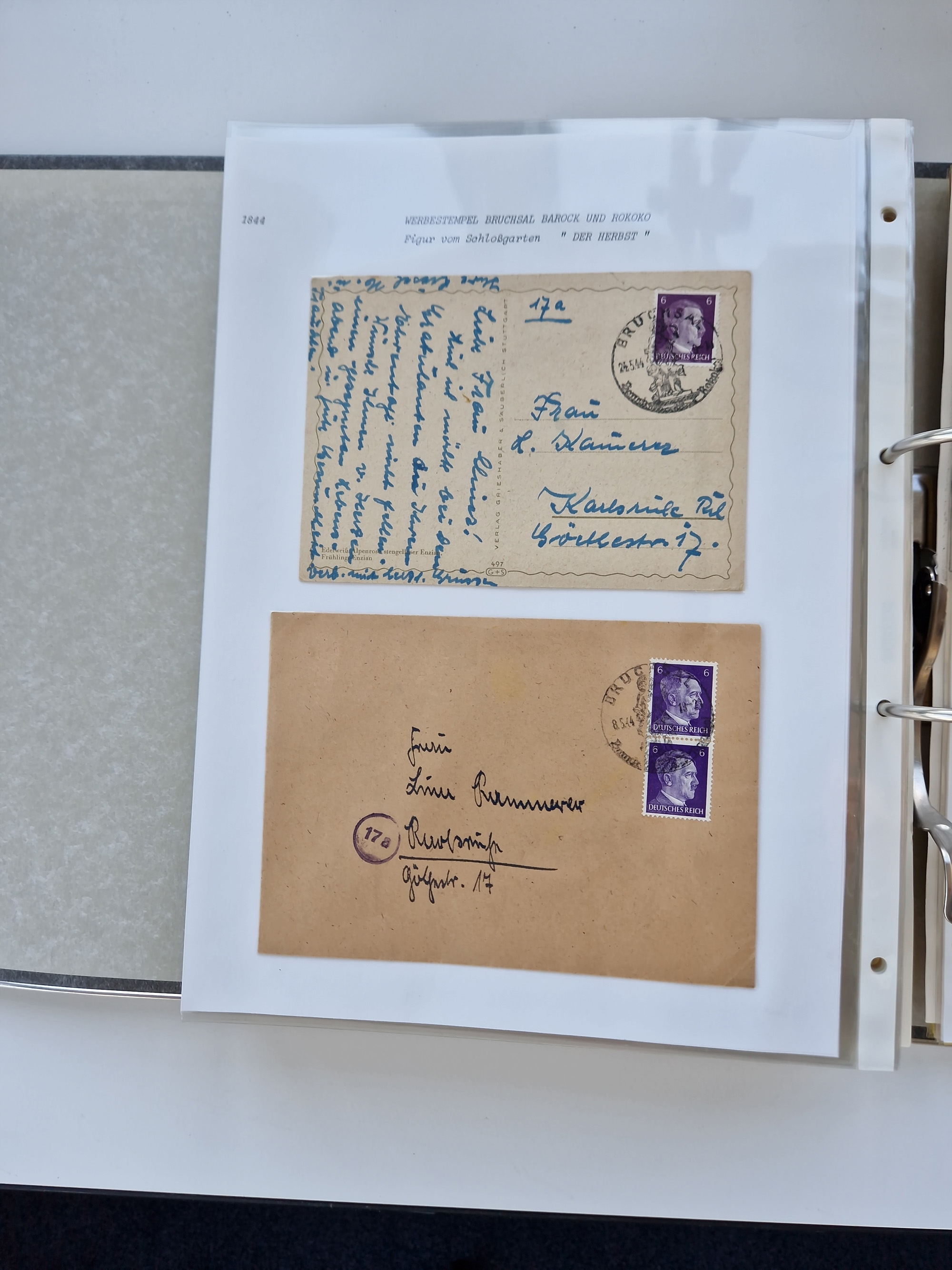 1870/2010 (ca.), Bruchsal und Umgebung, umfangreiche Heimatsammlung in 39 Ringordnern etwas unkonventionell, aber nichtsdestotrotz sehr inhaltsreich gesammelt mit zahlreichen Belegen ab Dt.Reich und auch losen Marken, u.a. Brustschilde mit Marken und besseren Frankaturen, Nachkriegszeit mit Besatzungszonen, auch eingehende Post aus Aller Welt.