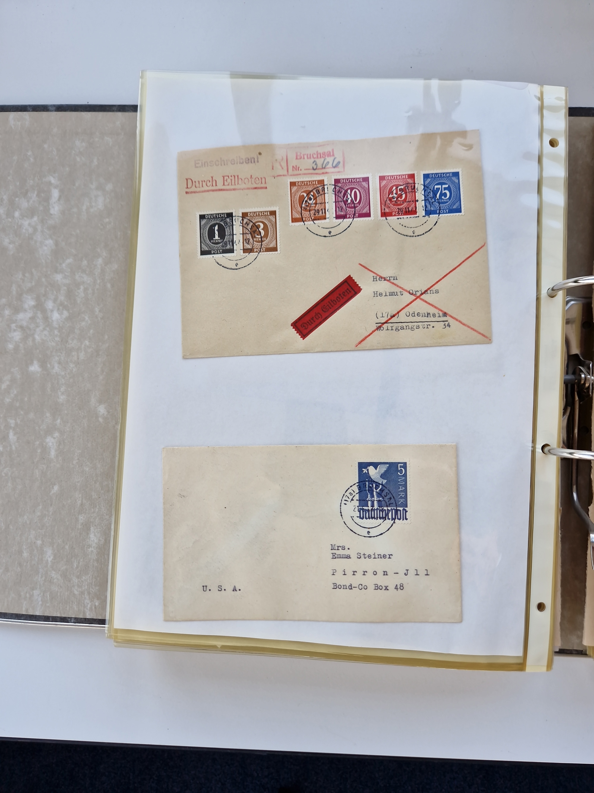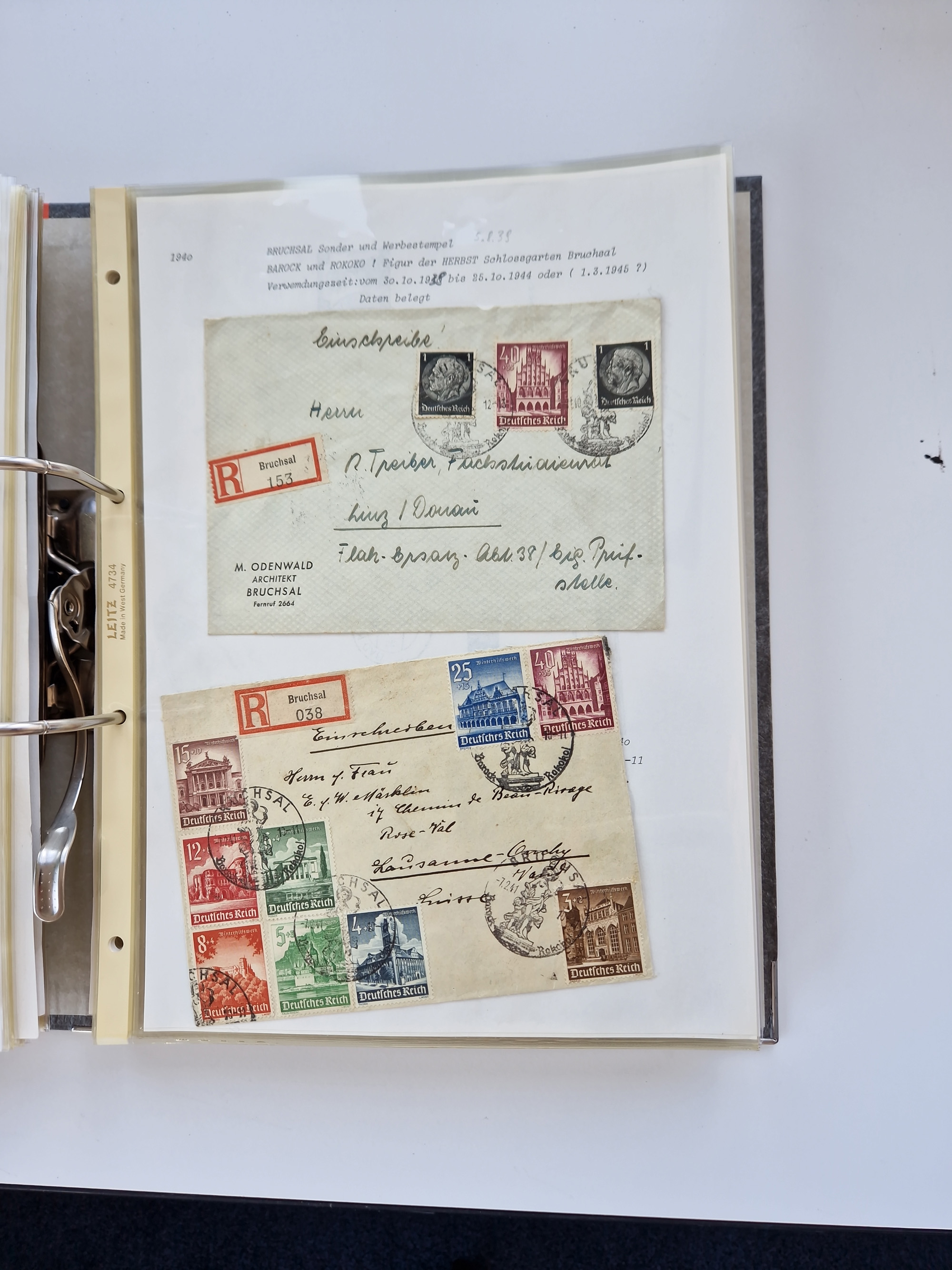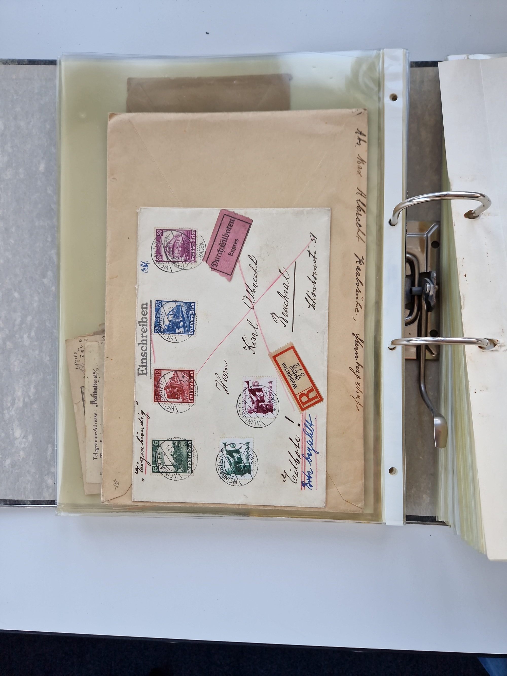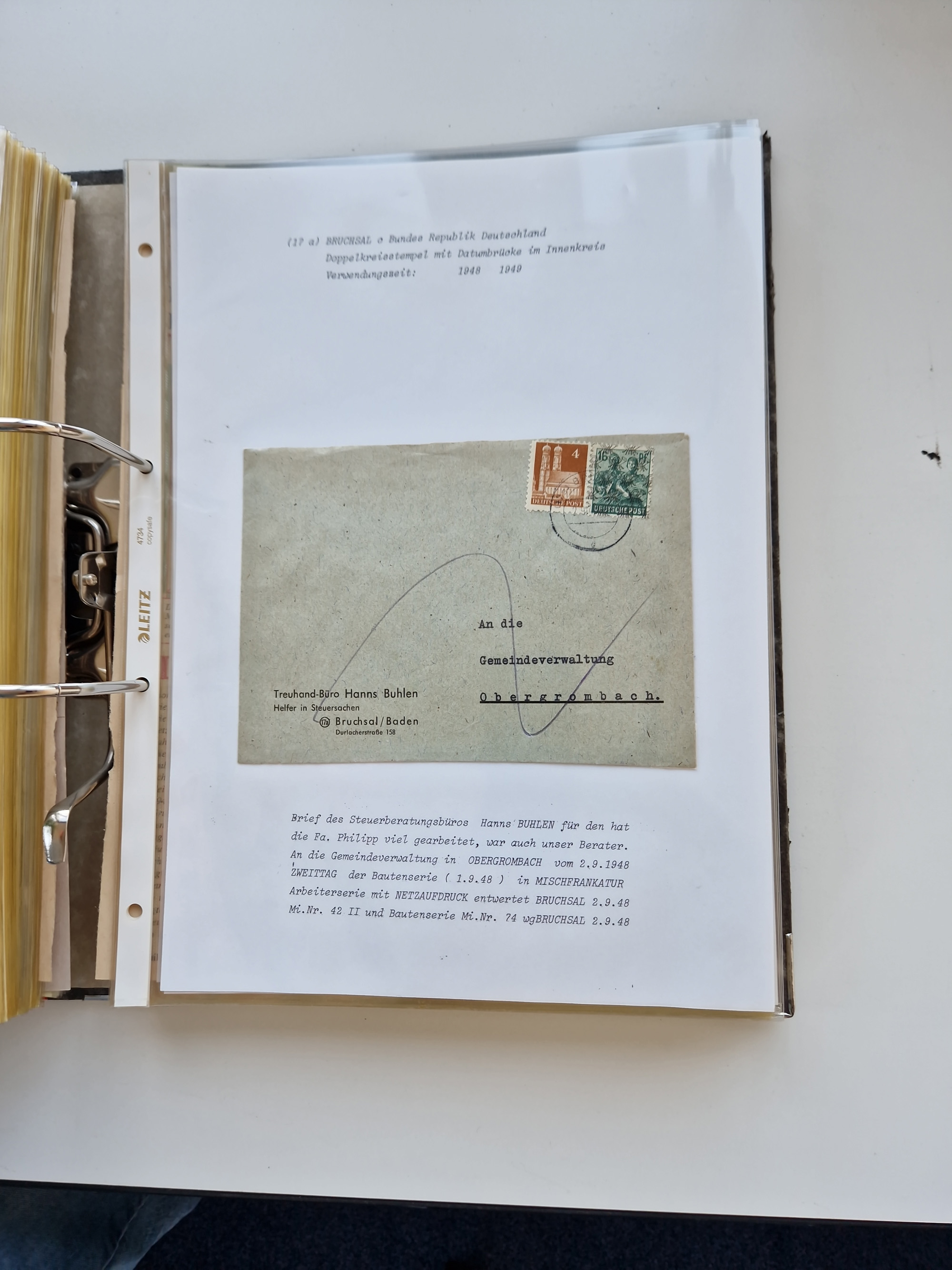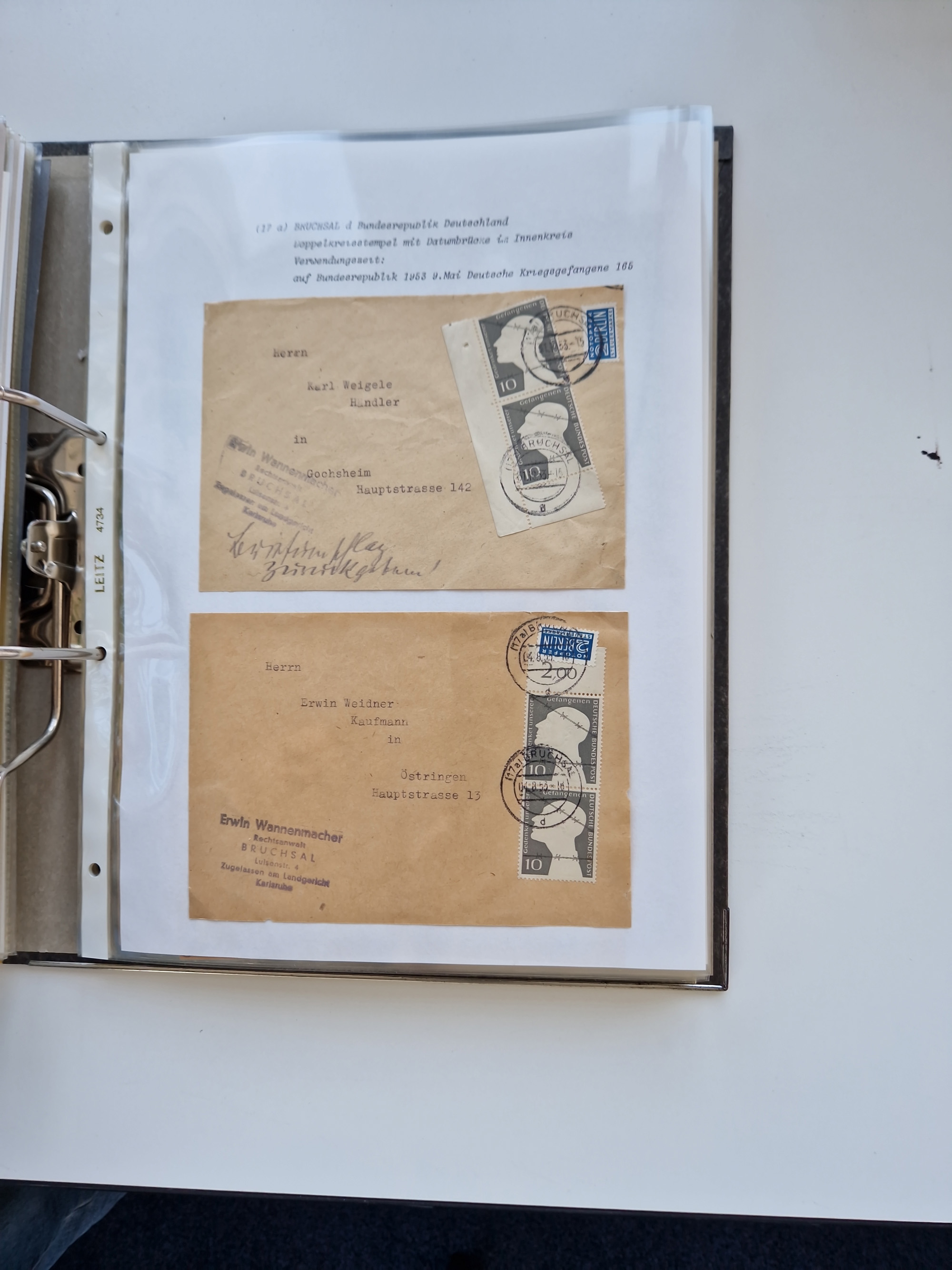 1870/2010 (ca.), Bruchsal und Umgebung, umfangreiche Heimatsammlung in 39 Ringordnern etwas unkonventionell, aber nichtsdestotrotz sehr inhaltsreich gesammelt mit zahlreichen Belegen ab Dt.Reich und auch losen Marken, u.a. Brustschilde mit Marken und besseren Frankaturen, Nachkriegszeit mit Besatzungszonen, auch eingehende Post aus Aller Welt.