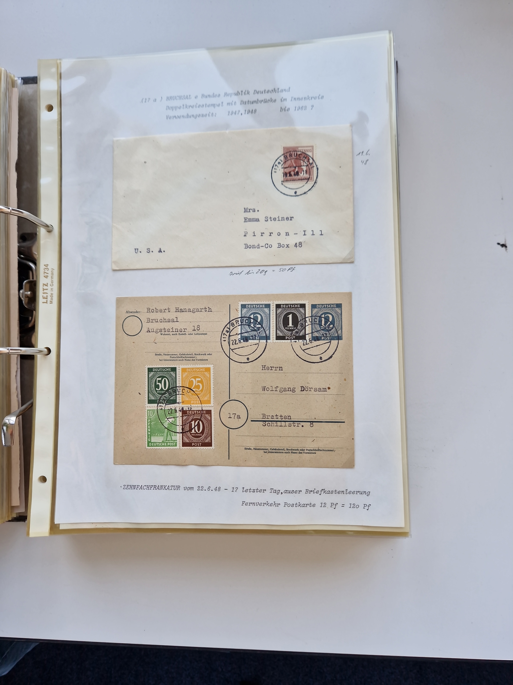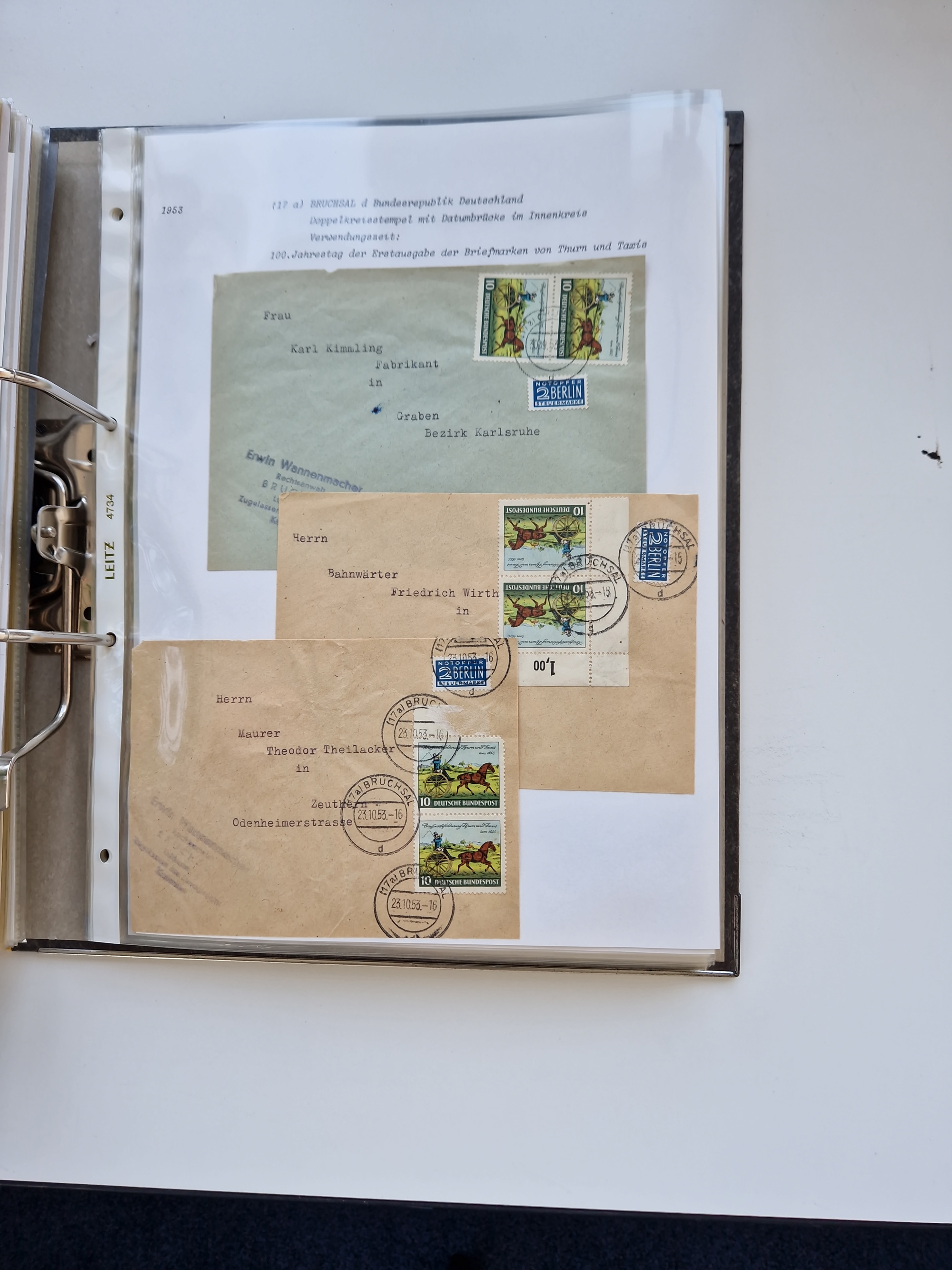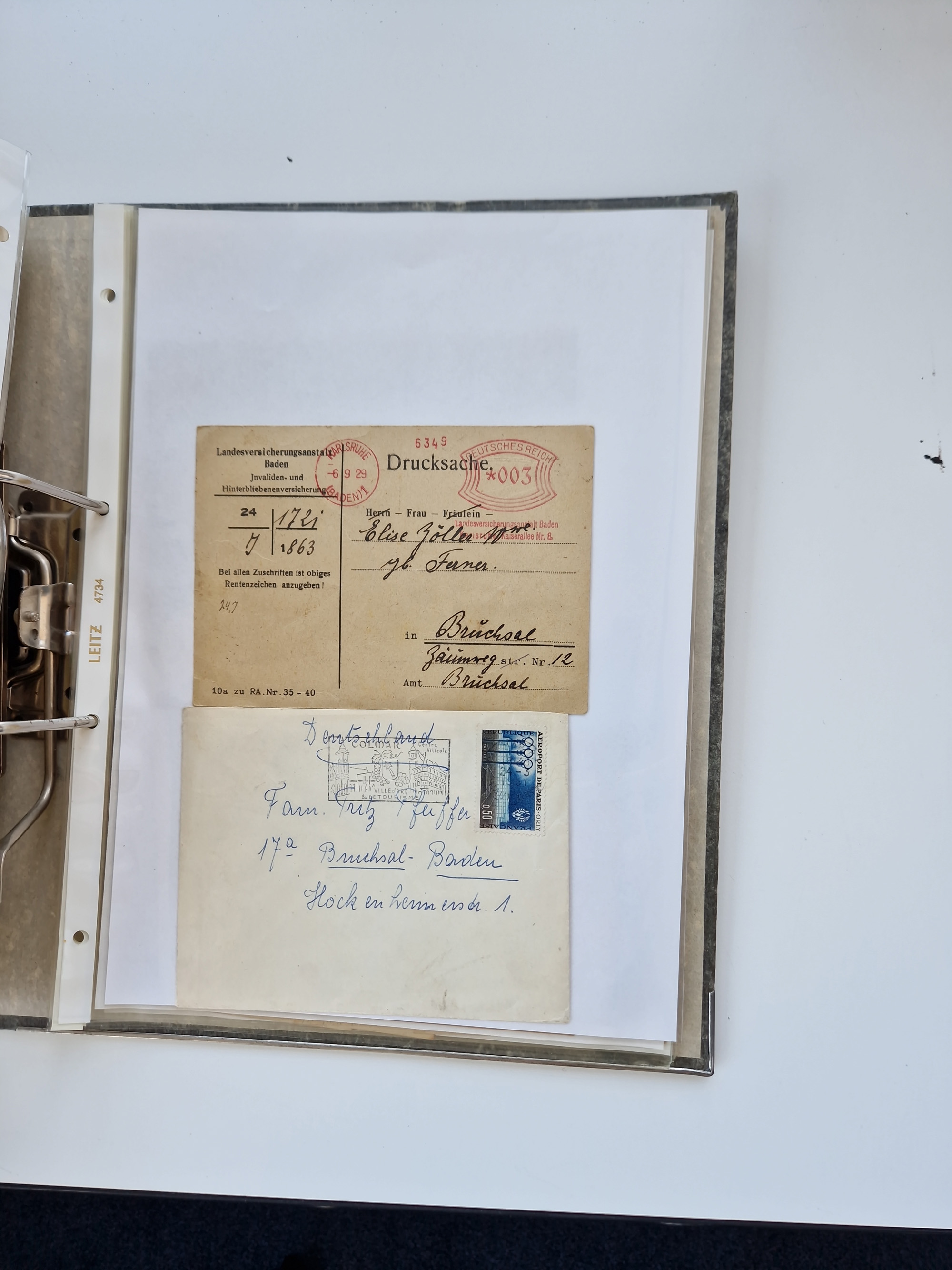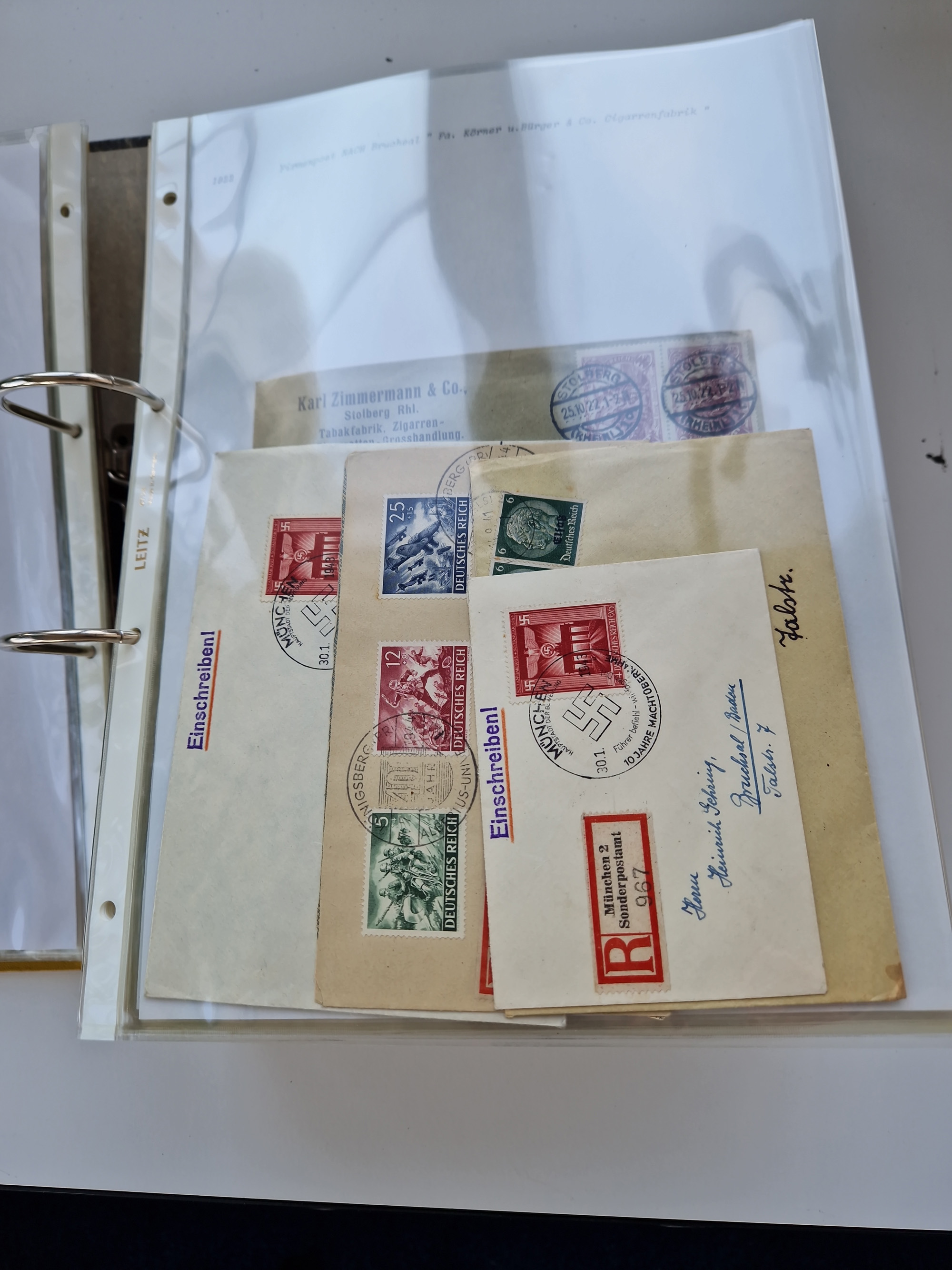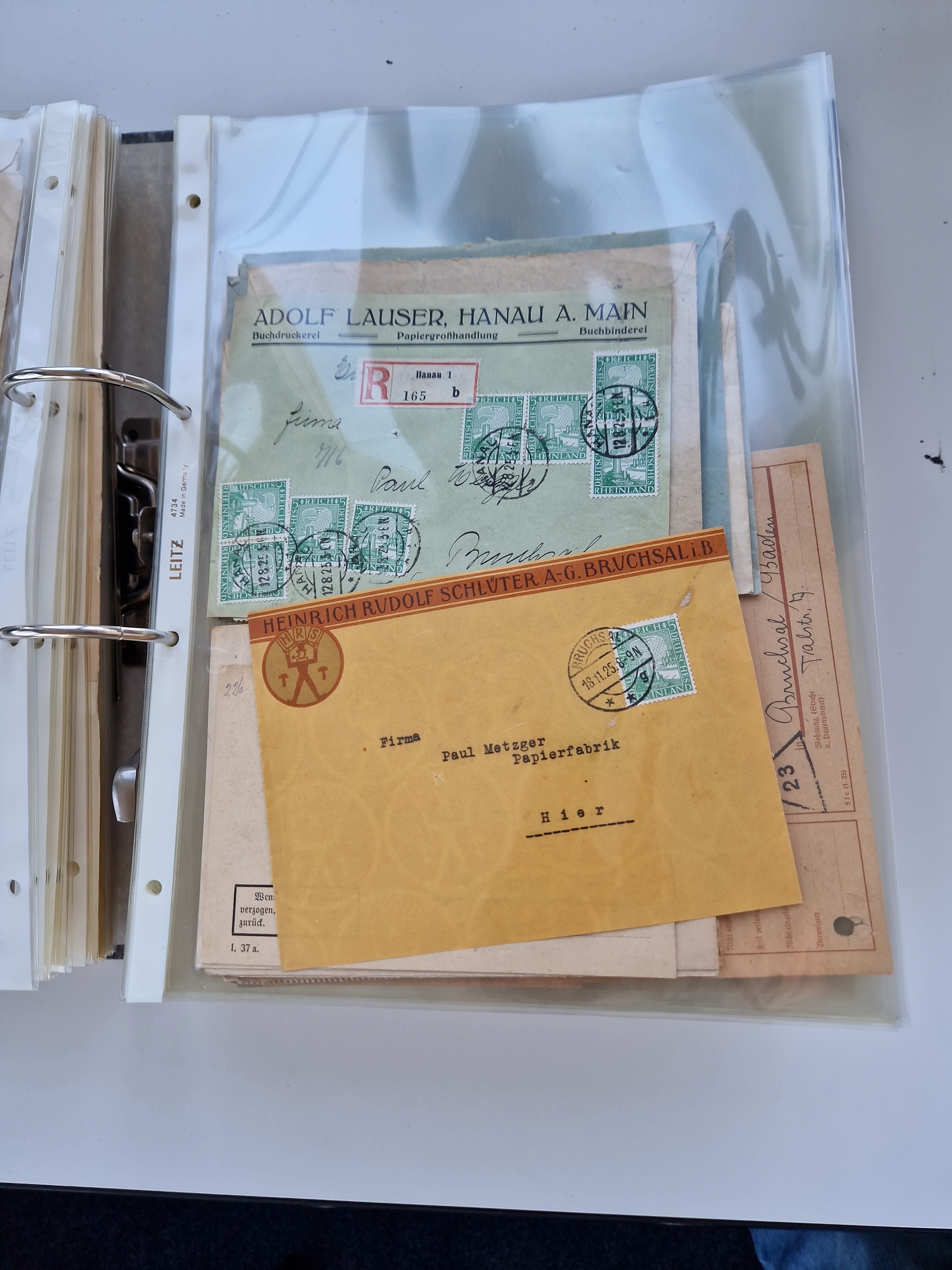 1870/2010 (ca.), Bruchsal und Umgebung, umfangreiche Heimatsammlung in 39 Ringordnern etwas unkonventionell, aber nichtsdestotrotz sehr inhaltsreich gesammelt mit zahlreichen Belegen ab Dt.Reich und auch losen Marken, u.a. Brustschilde mit Marken und besseren Frankaturen, Nachkriegszeit mit Besatzungszonen, auch eingehende Post aus Aller Welt.