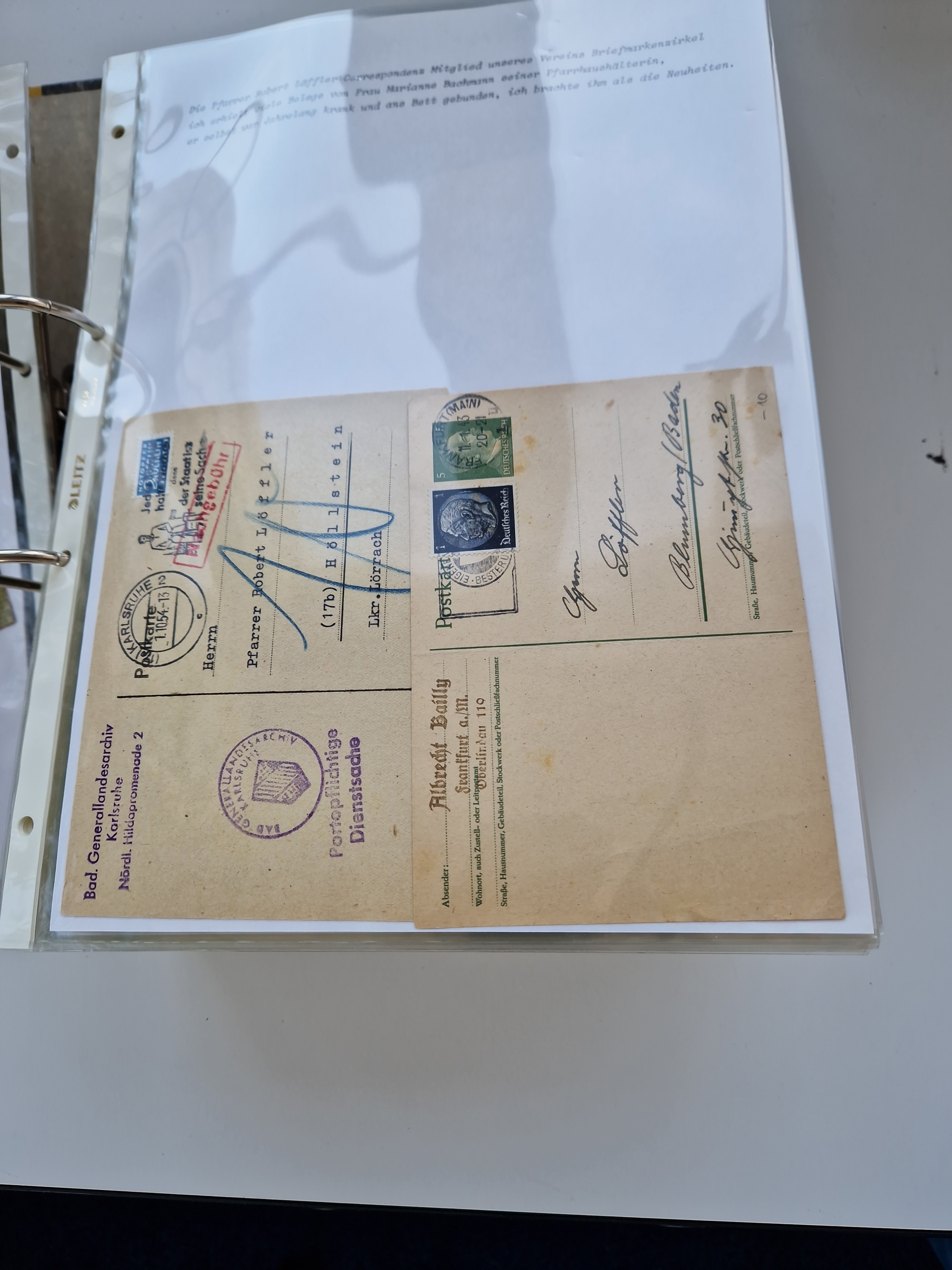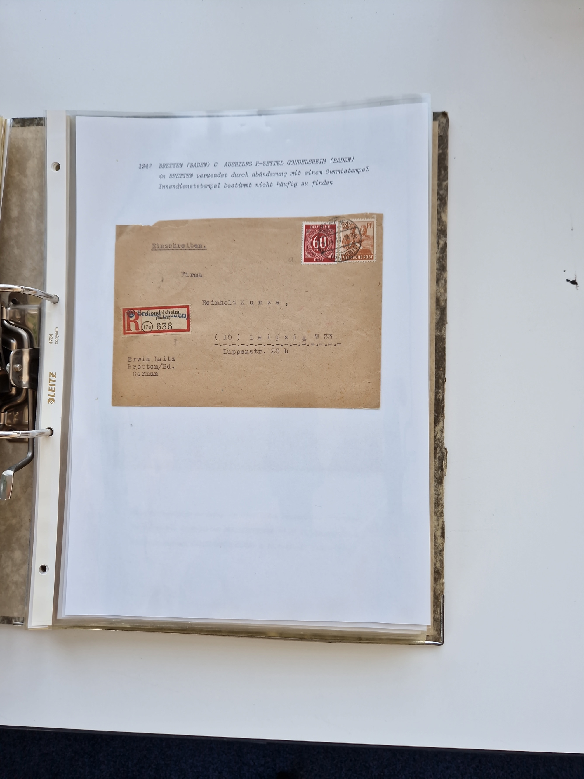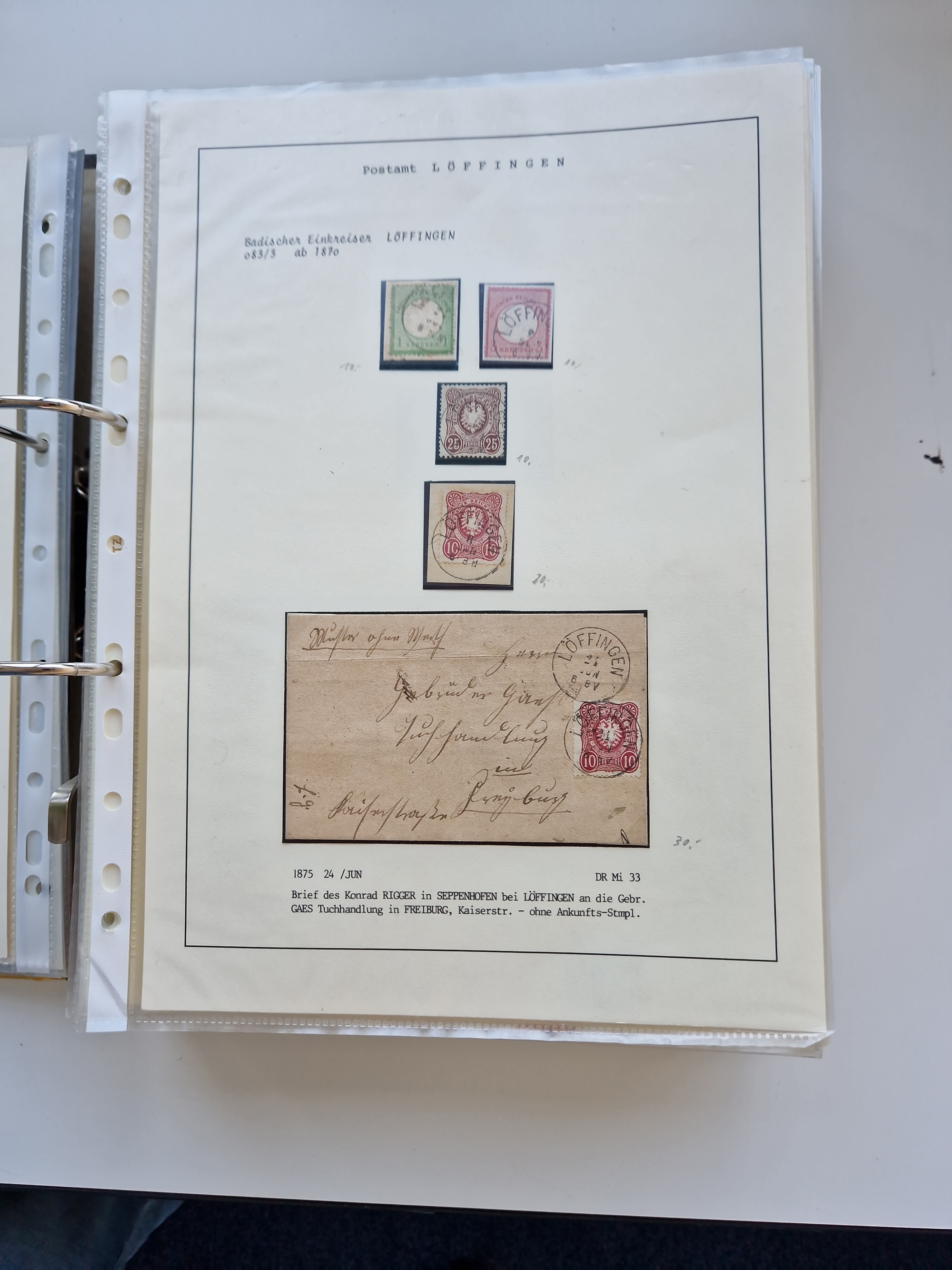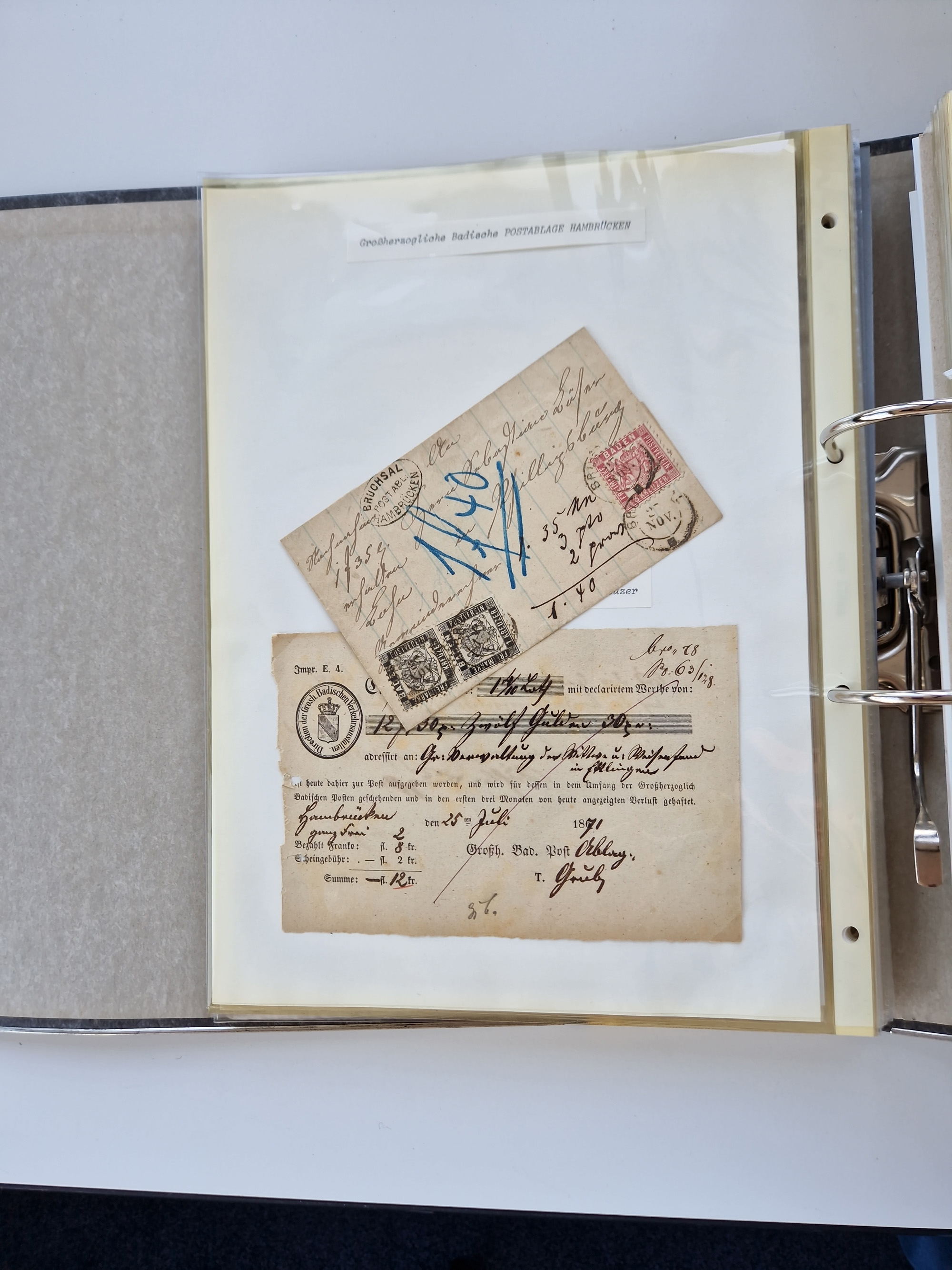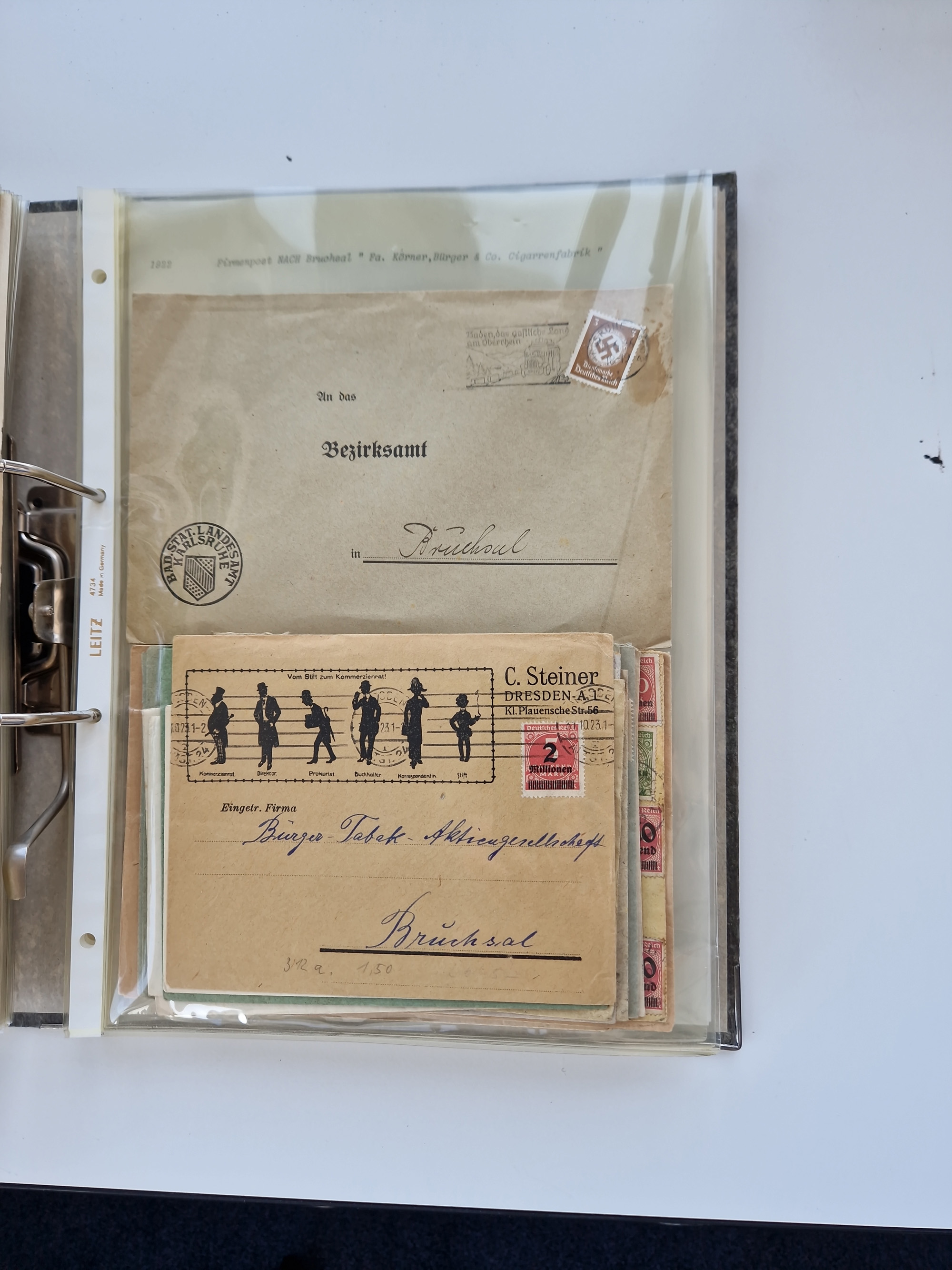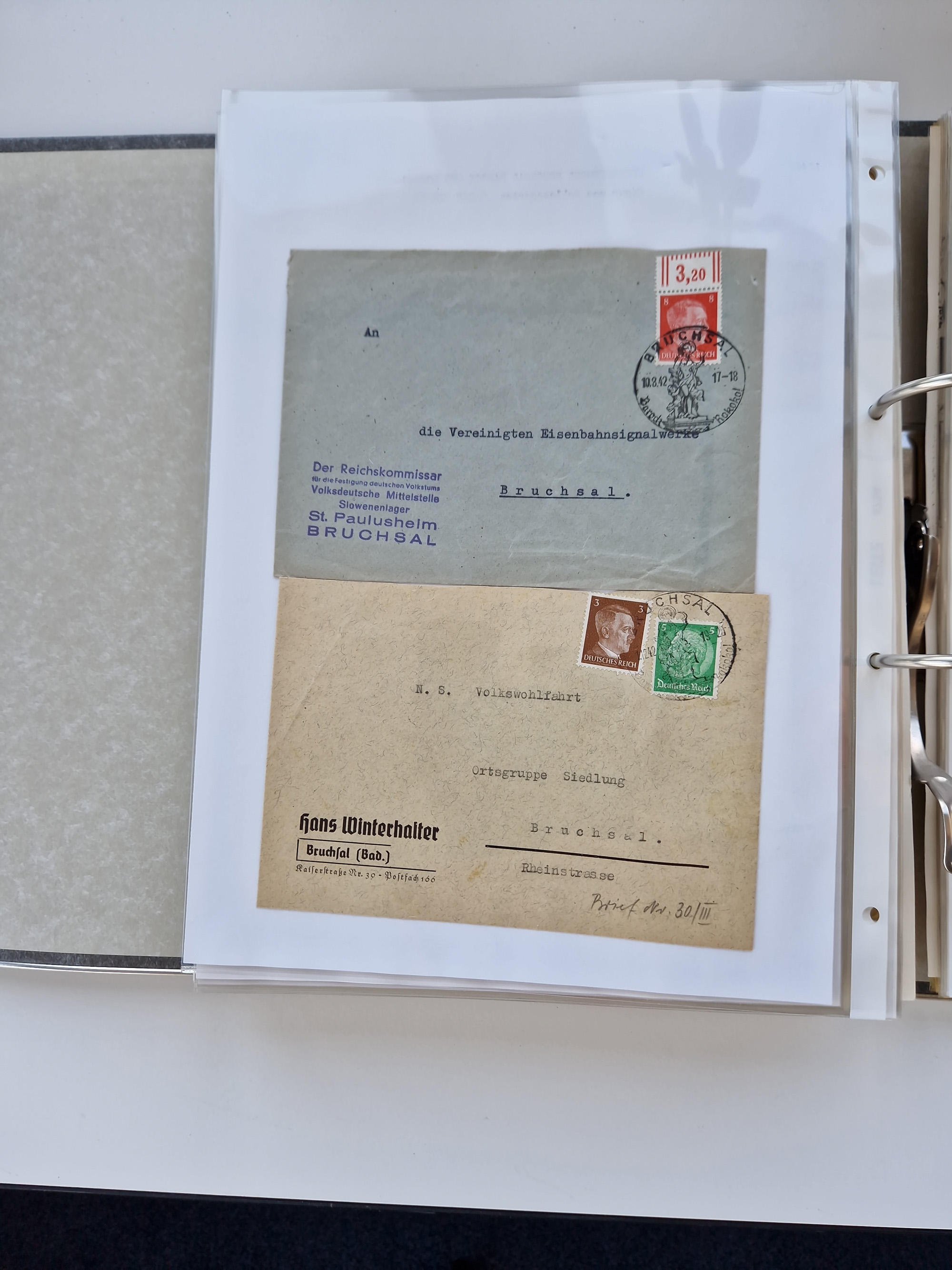 1870/2010 (ca.), Bruchsal und Umgebung, umfangreiche Heimatsammlung in 39 Ringordnern etwas unkonventionell, aber nichtsdestotrotz sehr inhaltsreich gesammelt mit zahlreichen Belegen ab Dt.Reich und auch losen Marken, u.a. Brustschilde mit Marken und besseren Frankaturen, Nachkriegszeit mit Besatzungszonen, auch eingehende Post aus Aller Welt.