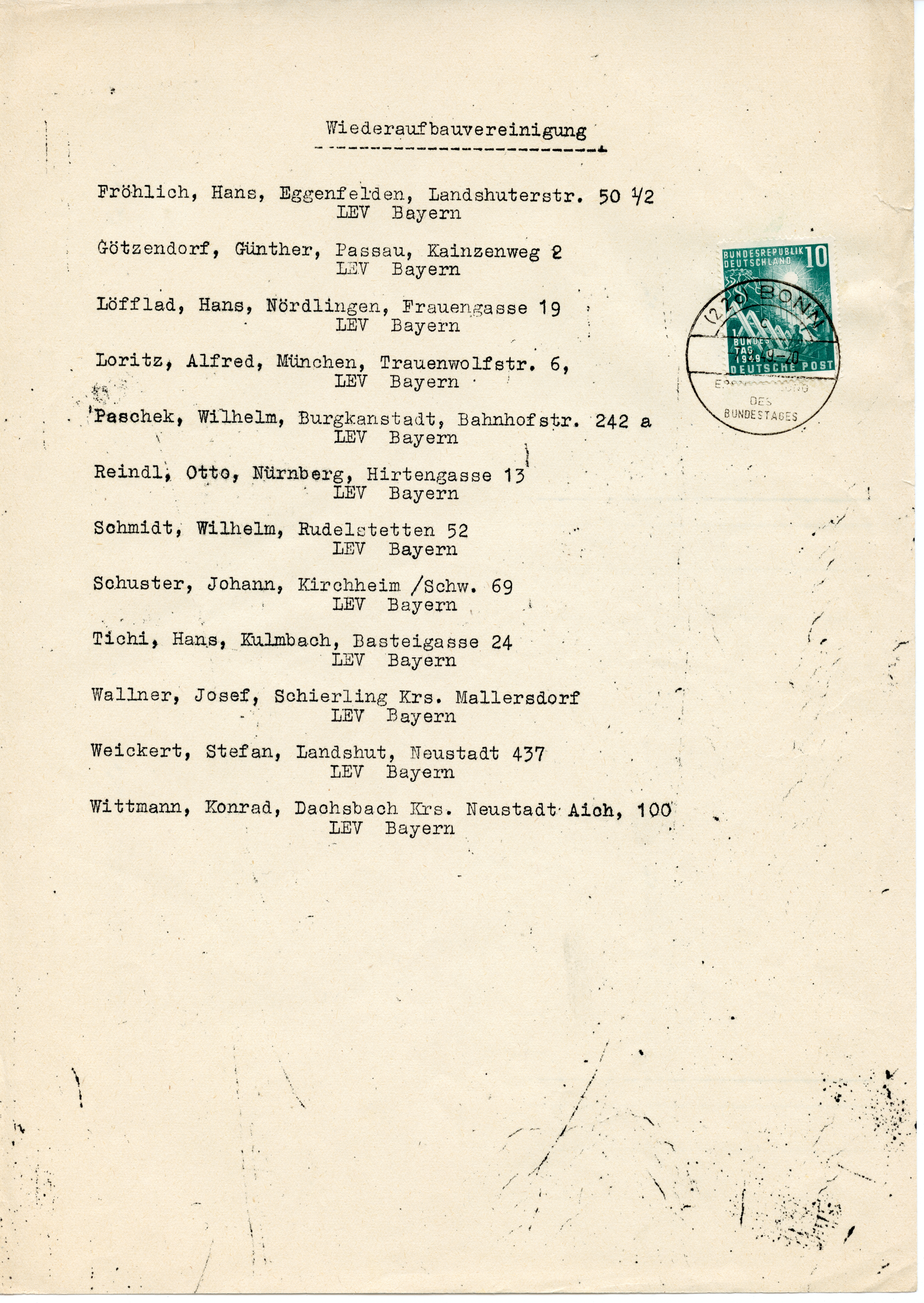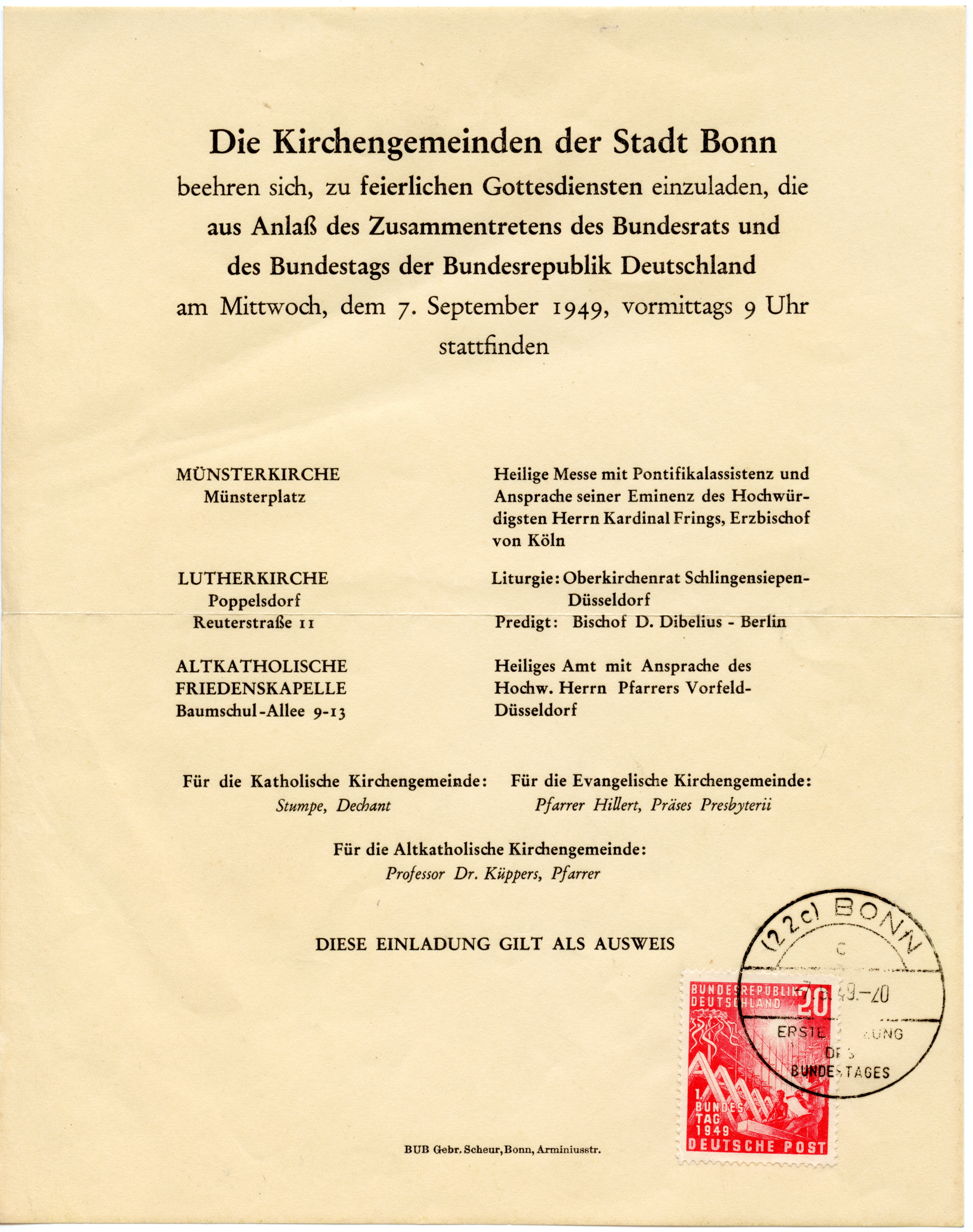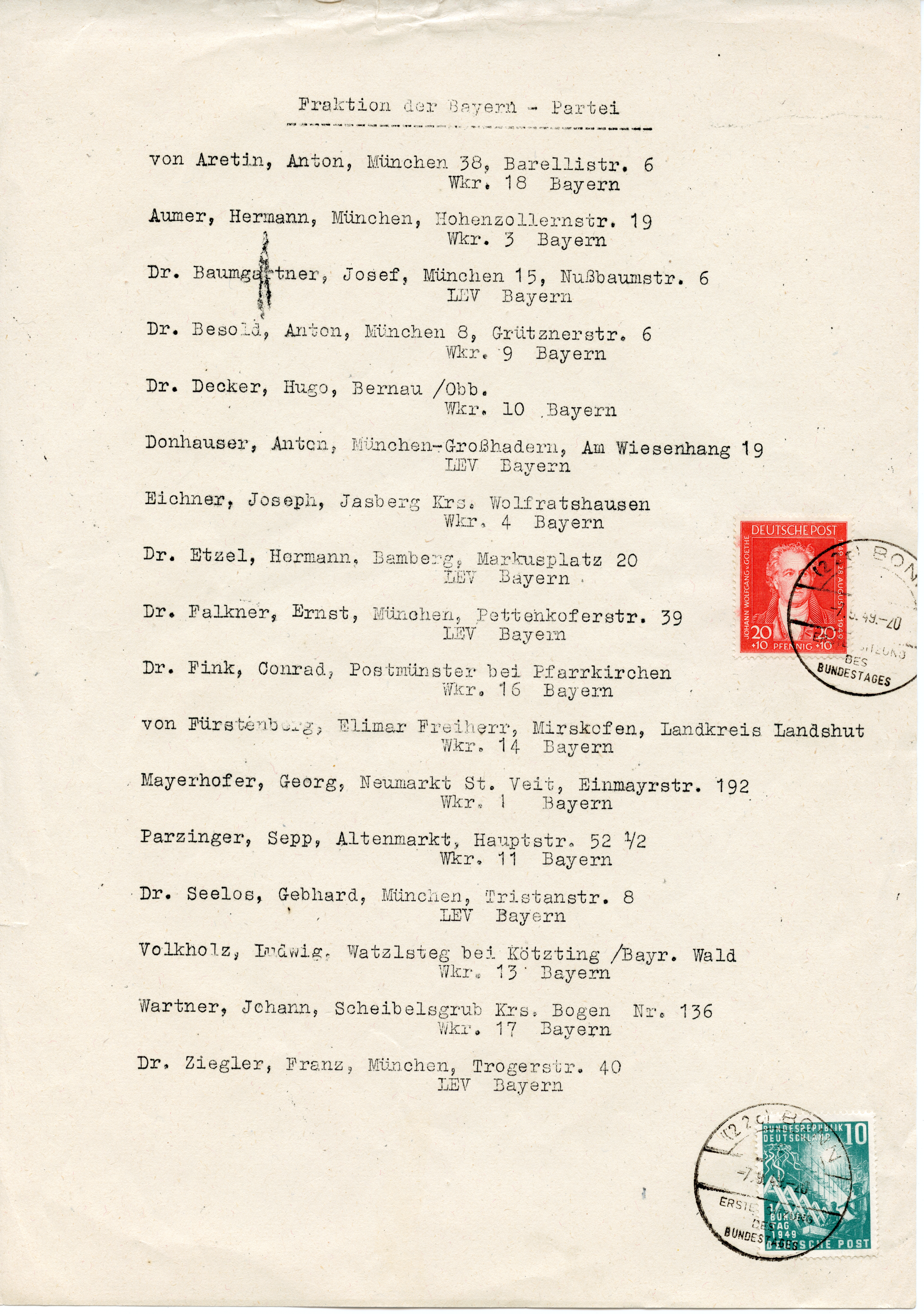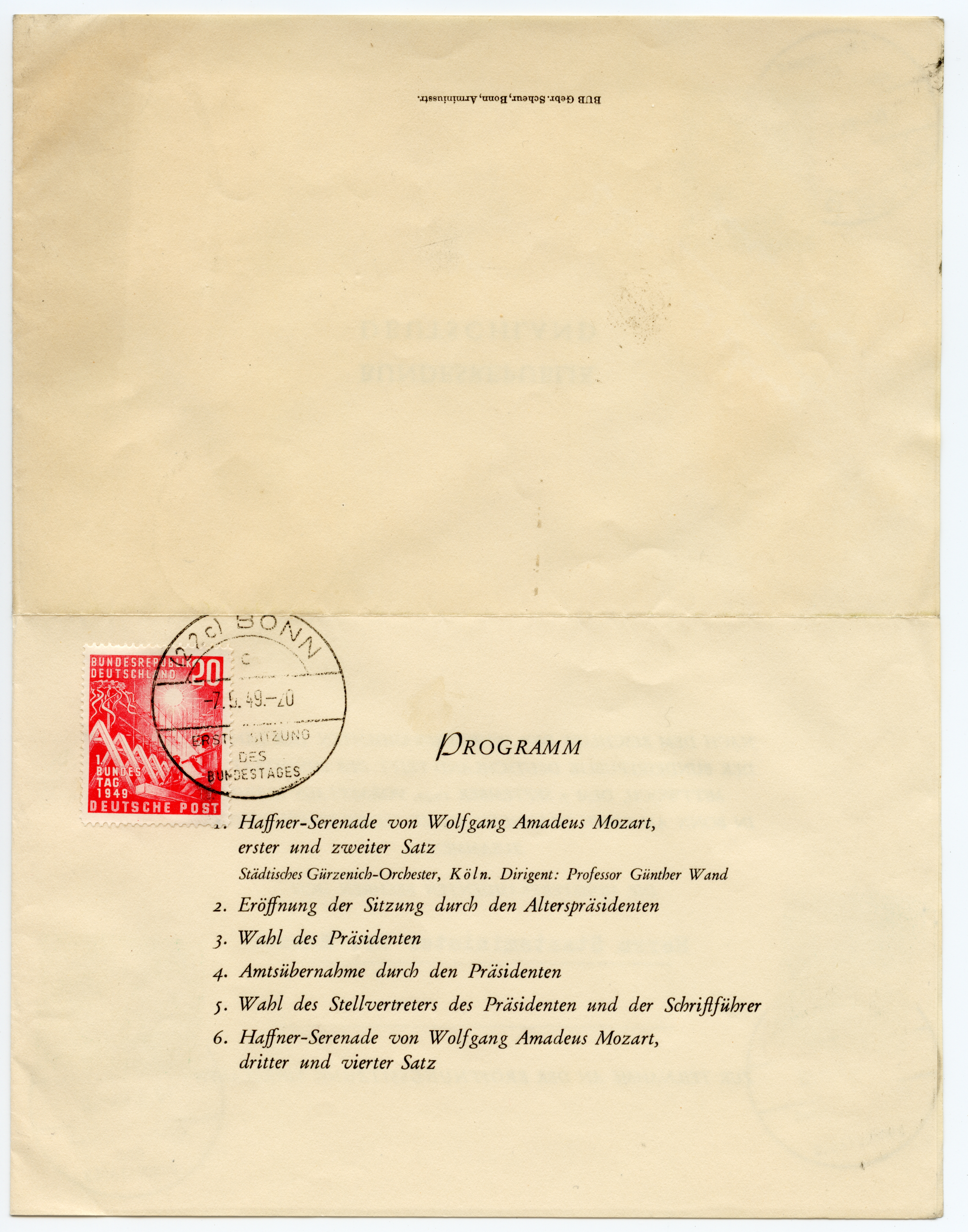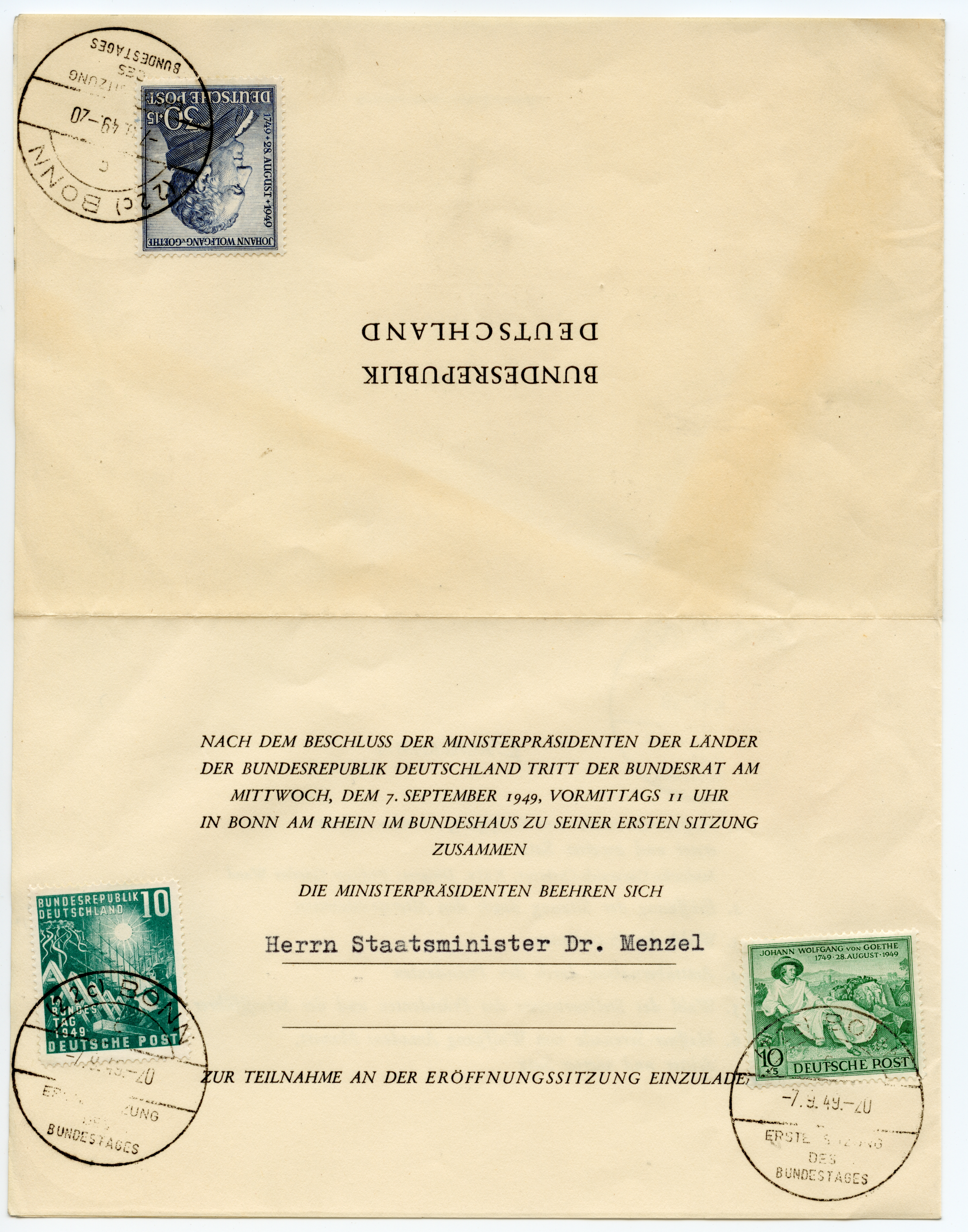 1949, Bundestag 10 und 20 Pfg. mehrfach mit Ersttag-Sonderstempel “BONN 7.9.49” auf fünf Dokumenten zur 1. Sitzung des Deutschen Bundestages, dabei Vordruckblatt “Tagesordnung”, zwei Seiten mit Namenslisten (u.a. Fraktion der Bayern-Partei), Einladungsblatt der Kirchengemeinden der Stadt Bonn und Einladungsblatt für den Staatsminister Dr. Menzel. Jedes Blatt ist mit mindestens einer Sondermarke mit Ersttagsstempel frankiert, übliche Faltspuren, in dieser Art vermutlich einmalige Zusammenstellung, ex Arndt