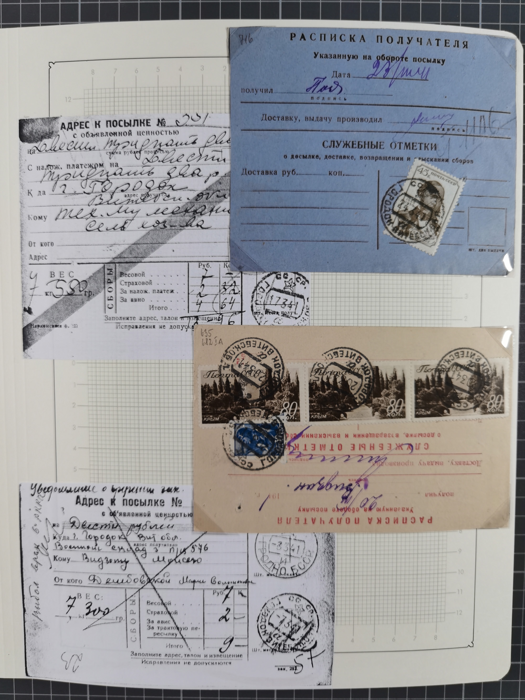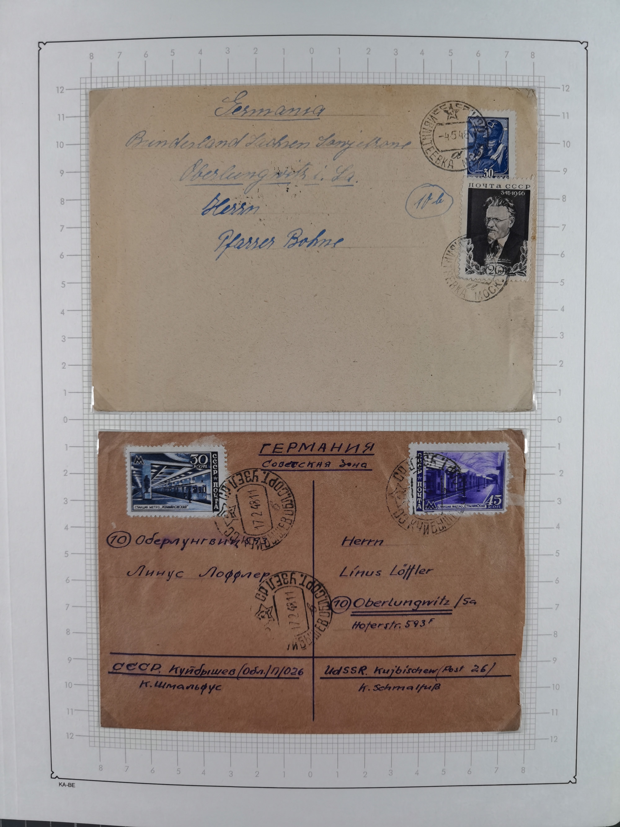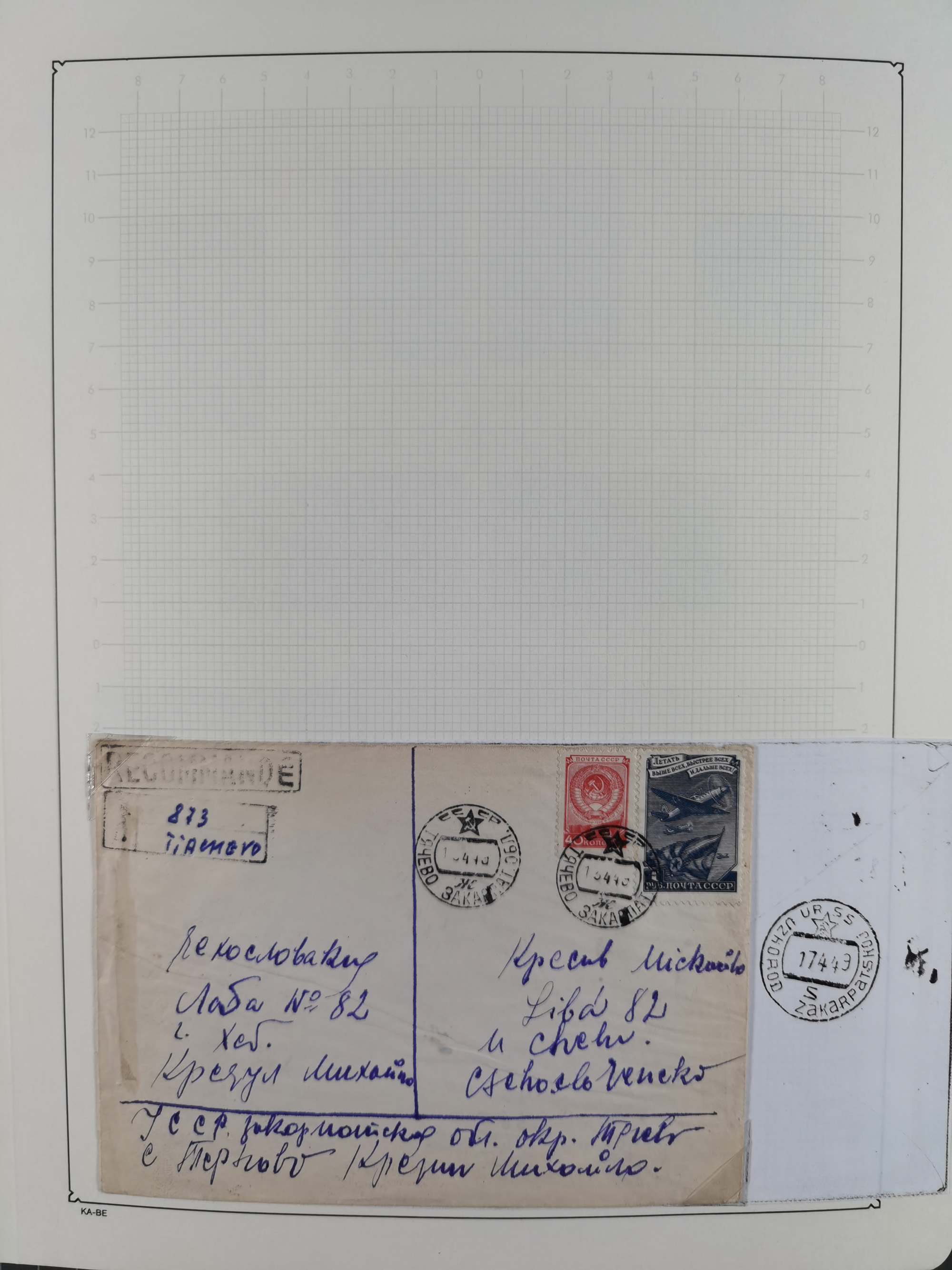 1918/27 (ca.), RSFSR and Soviet Travelling Post Offices and Railway Stations, collection of over 50 covers and cards, some better items with “1” PETROGRAD-MOSCOW 1921, “ROSTOV - 14 - MOSCOW” 1927, “ROSTOV - 20 - KHARKOV” 1923, “VYATKA - 34 - MOSCOW” 1925, “POLTAVA -KIYVSKAYA UKRAINA” 1928, “MOURMANSK - 36 - LENINMGRAD” 1930, “KRASNOYARKS - 188 - NIKOLAYEVSK” 1925, “KHABAROVSK - 285 - VLADIVOSTOK” 1925, “BAKHMACH - 309 - BIRZULA” 1927, etc., together with a group of used off and on pieces, many fine strikes. Mixed condition as to be expected, a most unusal assembly, neatly mounted on album pages in one binder