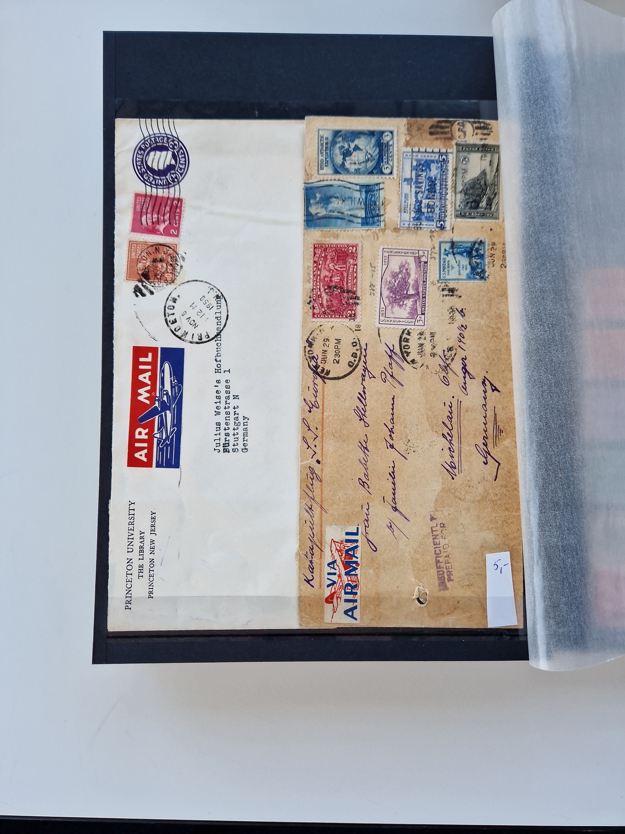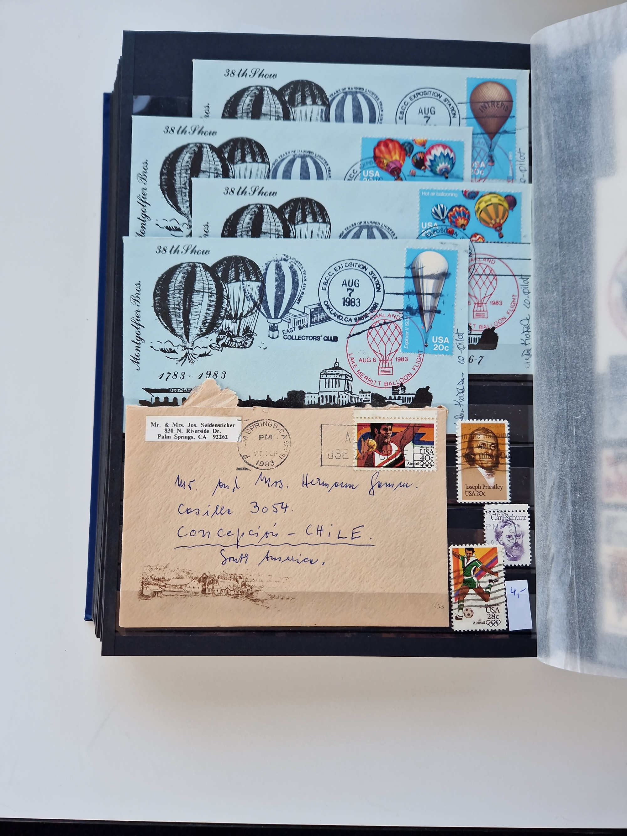 1927/59 (ca.), Egyptian Airmail collection with over 85 covers, strength before the 1940s, starting with the 1910 Heliopolis Air Meeting perforated vignette in black/red/yellow unused, the collection follows with an abundance of First Flight covers with many better items like 1931 First Flight Africa-England(4), 1931 Premier Vol Louxor-Mwanza, 1929 Egypt-Crete and 1932 Egypt-Transval by Imperial Airways, a very rare set of eight covers each with blue oval cachet “First Flight Egypt-South-America By Imperial Airways and Berlin-Buenos Aires Airline 4th June 1935”, most “retour” or “rebut” or “return to sender”, scarce 1933 First Flight Cairo-Singapore with Straits Settlements 30 c. applied on arrival, 1940 Eastern horseshoe route from Cairo via Australia and San Francisco, together with some incoming airmail from Germany with Zeppelin LZ 127 Orientfahrt 1929, Zeppelin LZ 127 1931 Return Flight with special cancellations from Port Said(2), Alexandrie(3), Caire(2), etc. Mixed condition with some occasional toning, overall fine, neatly mounted and expertly described on exhibition pages, in 3 albums