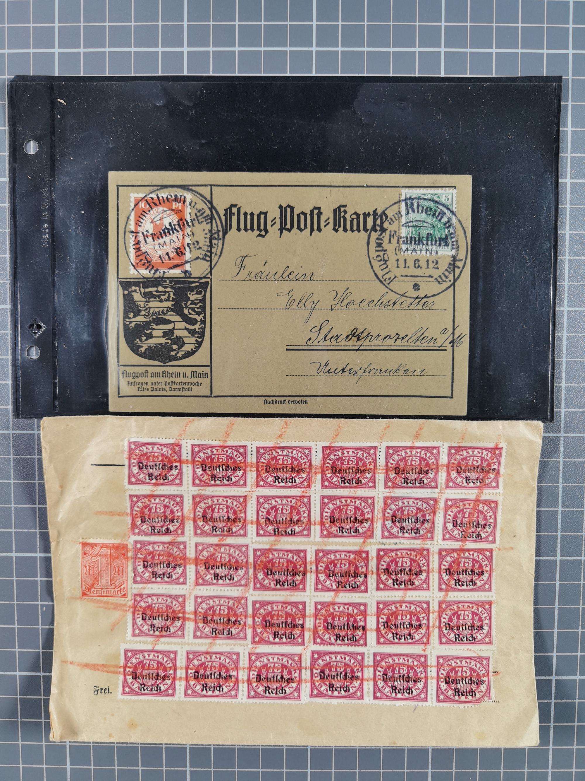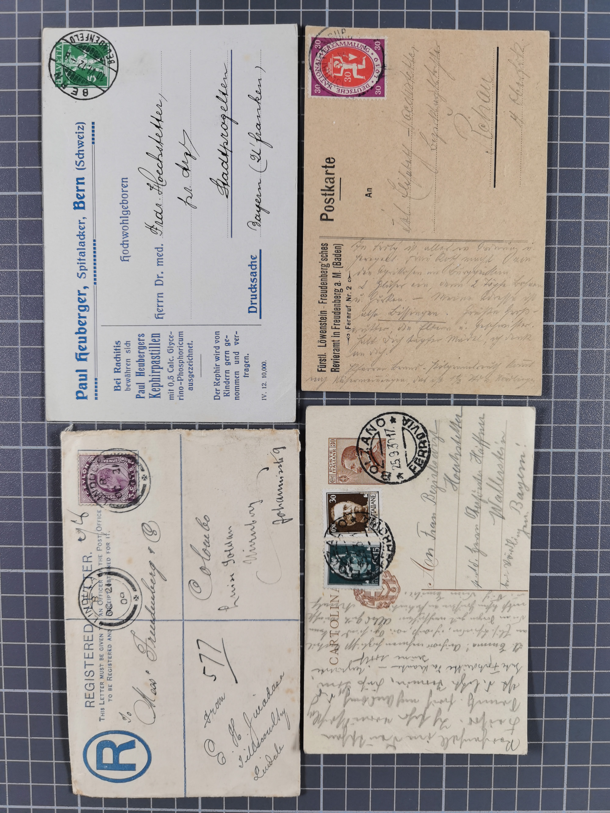 1850/1935 (ca.), varied and interesting accumulation of several hundred covers and other postal history items form all over the world in two larg albums. The most substantial section being Germany and related Areas with Mi.-Nos. 446-9 with exhibition postmark on airmail cover, Württemberg Officials Mi.-Nos. D129 and 248-50 as rare single frankings on declared value or registered items, Saar Mi.-Nos. 11-17 on cover and Togo Mi.-Nos. 1-6 on registered letter from Lome to Pforzheim. Also some Switzerland with illicit use of 1922, 10 c. postal stationery indicum on Postcard to the Belgian Congo or 1927 SCADTA-Airmail cover from Zürich to Bogota, Great Britain with 1902 7d grey-black (SG 90) and 2d on 1910 Express cover from Southampton to Germany, some Russian P.O. in Constantinople and some better South America.