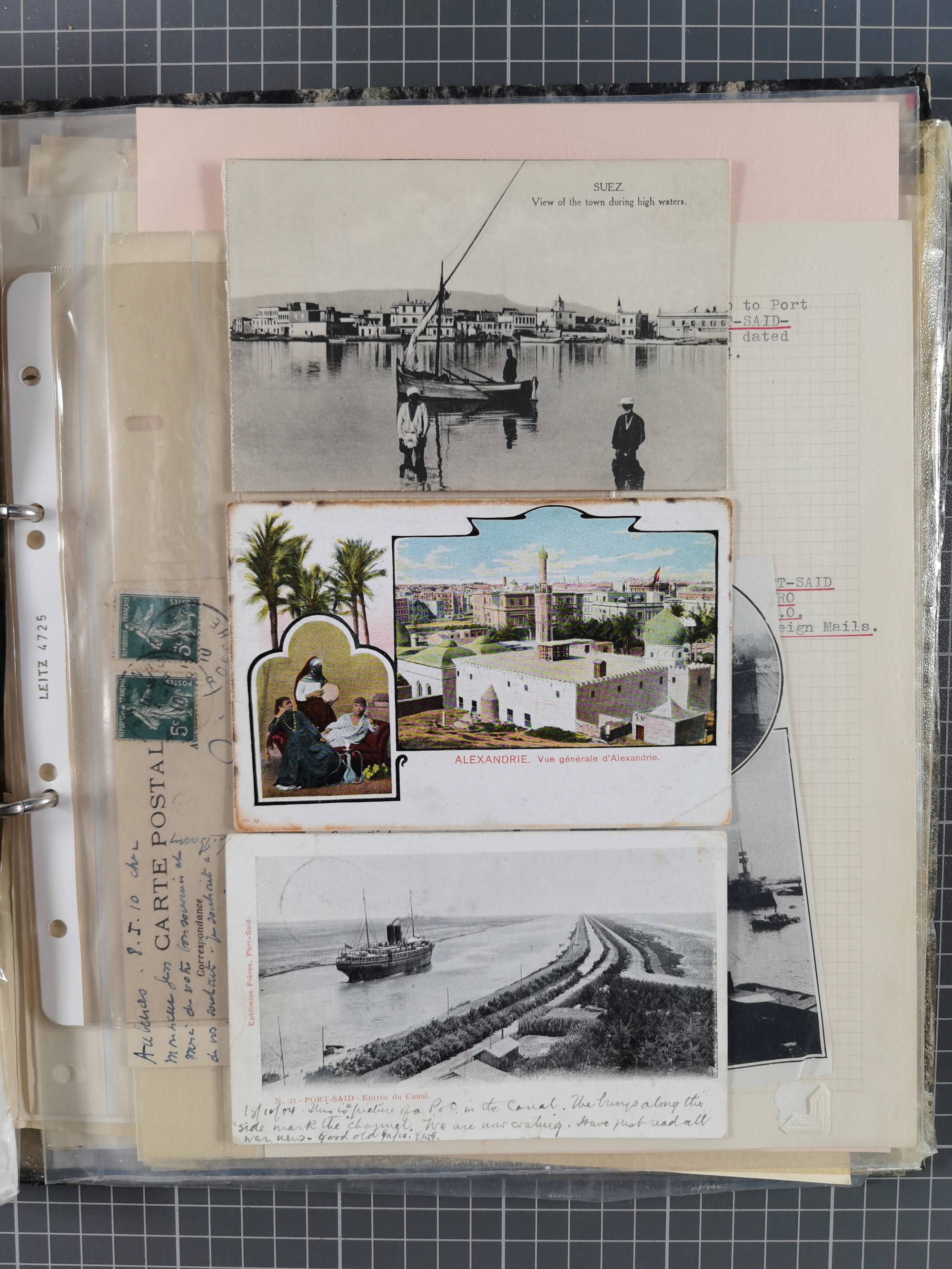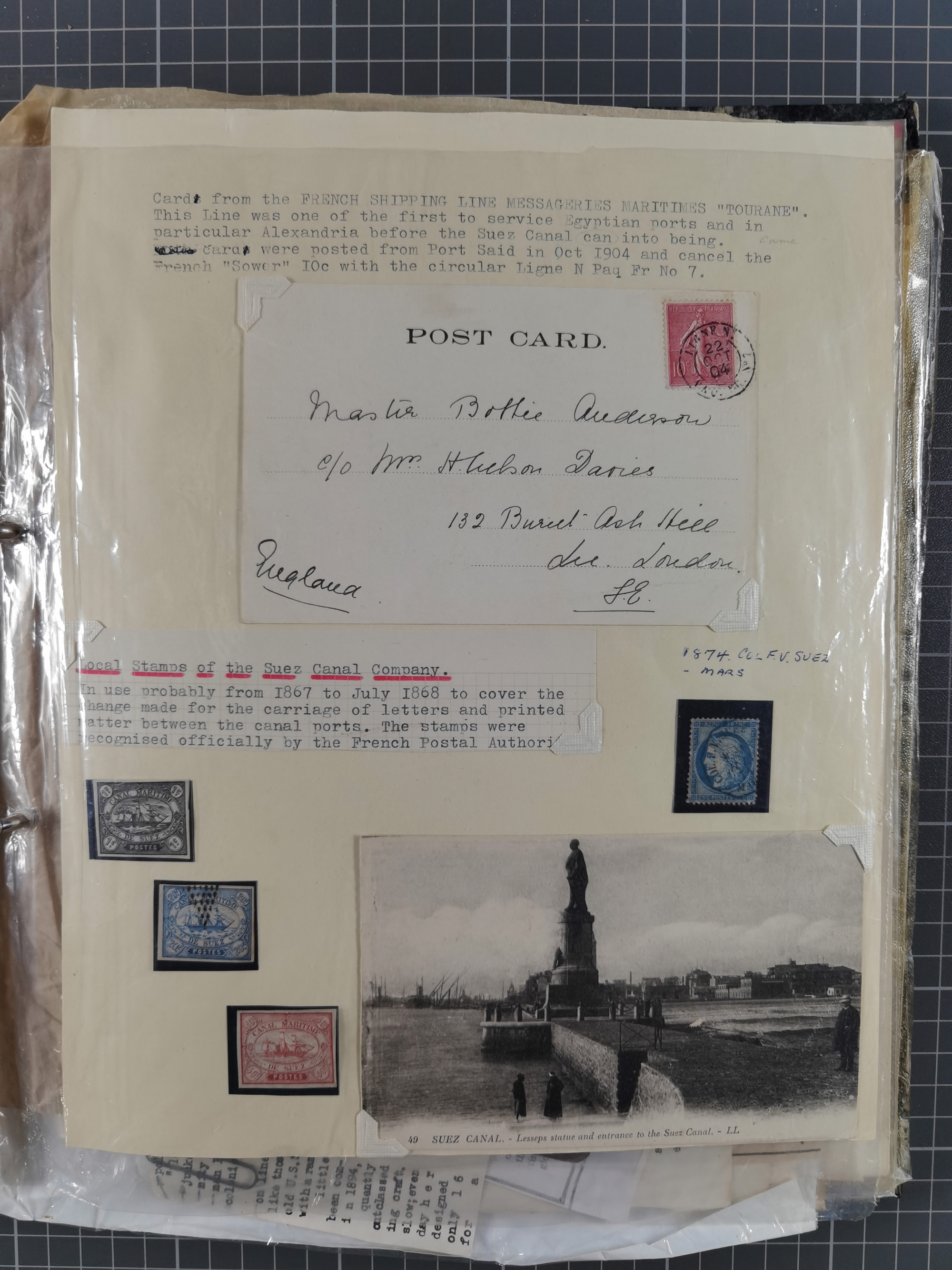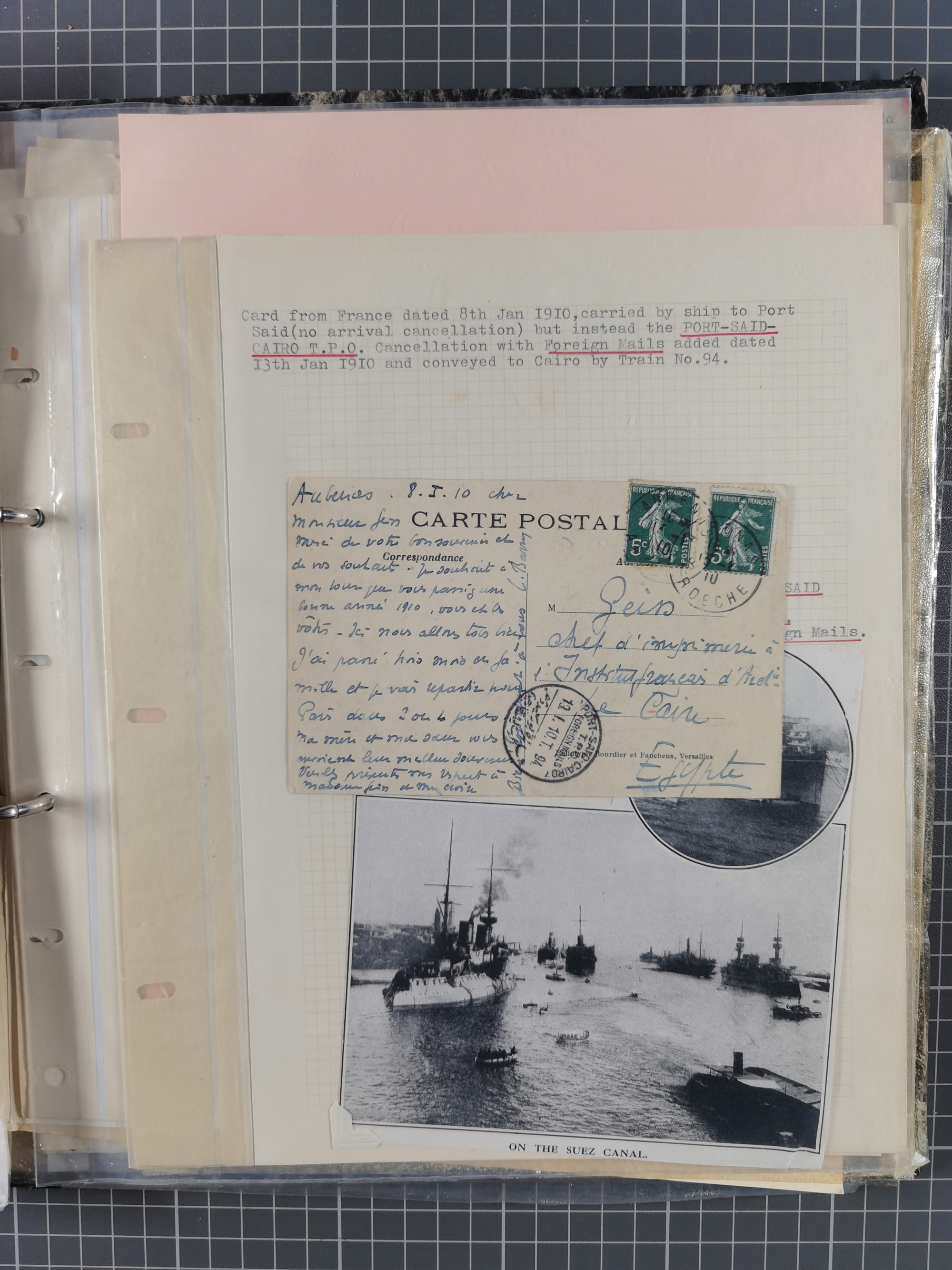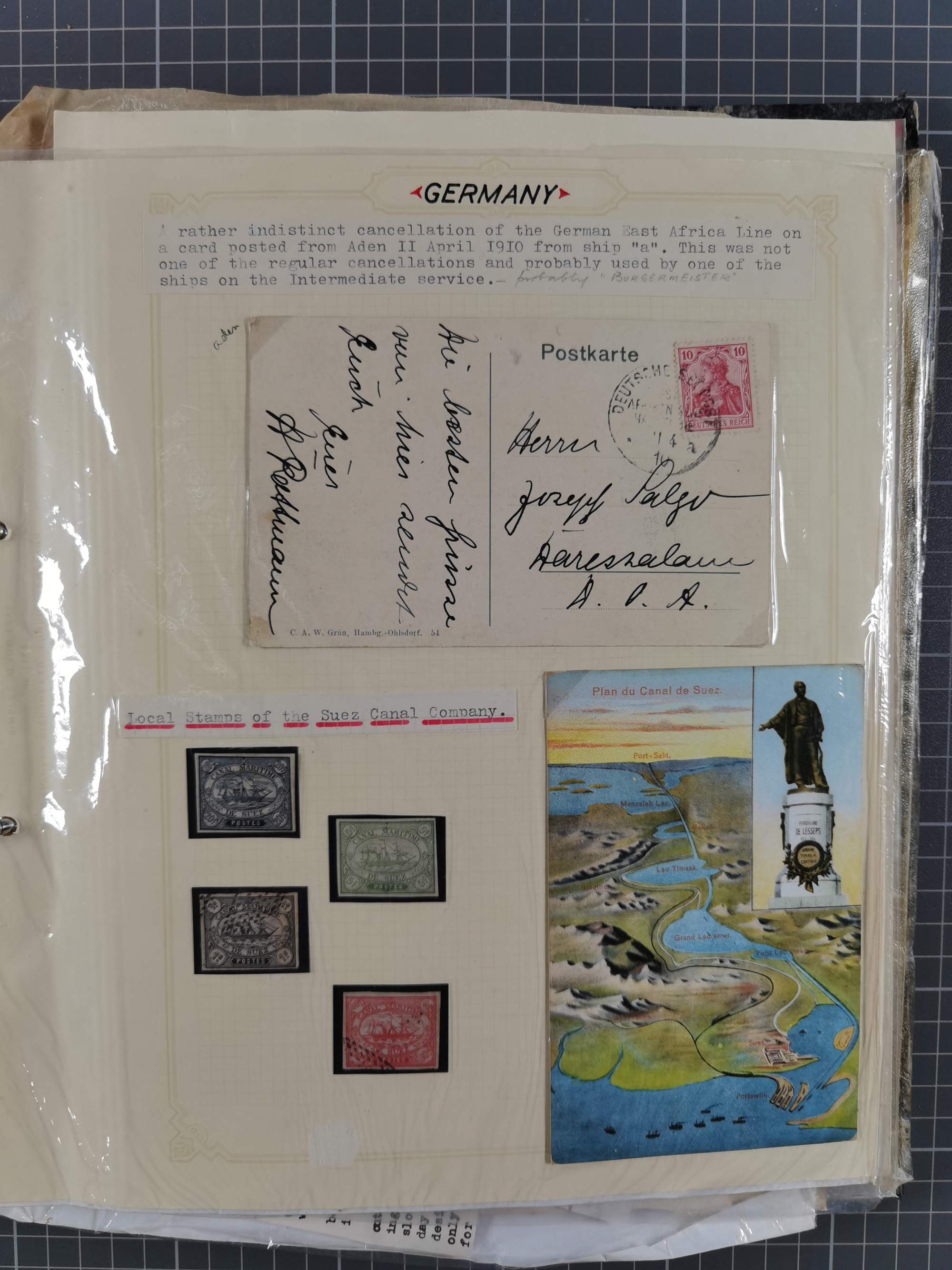 1910/49 (ca.), interessante kleine Sammlung Schiffspost mit Hauptaugenmerk auf den Suez Kanal, dabei etwas über 30 Briefe und Karten mit interessanten Stempeln sowie ferner Landkarten, Zeitungsausschnitte, etc., im Ordner