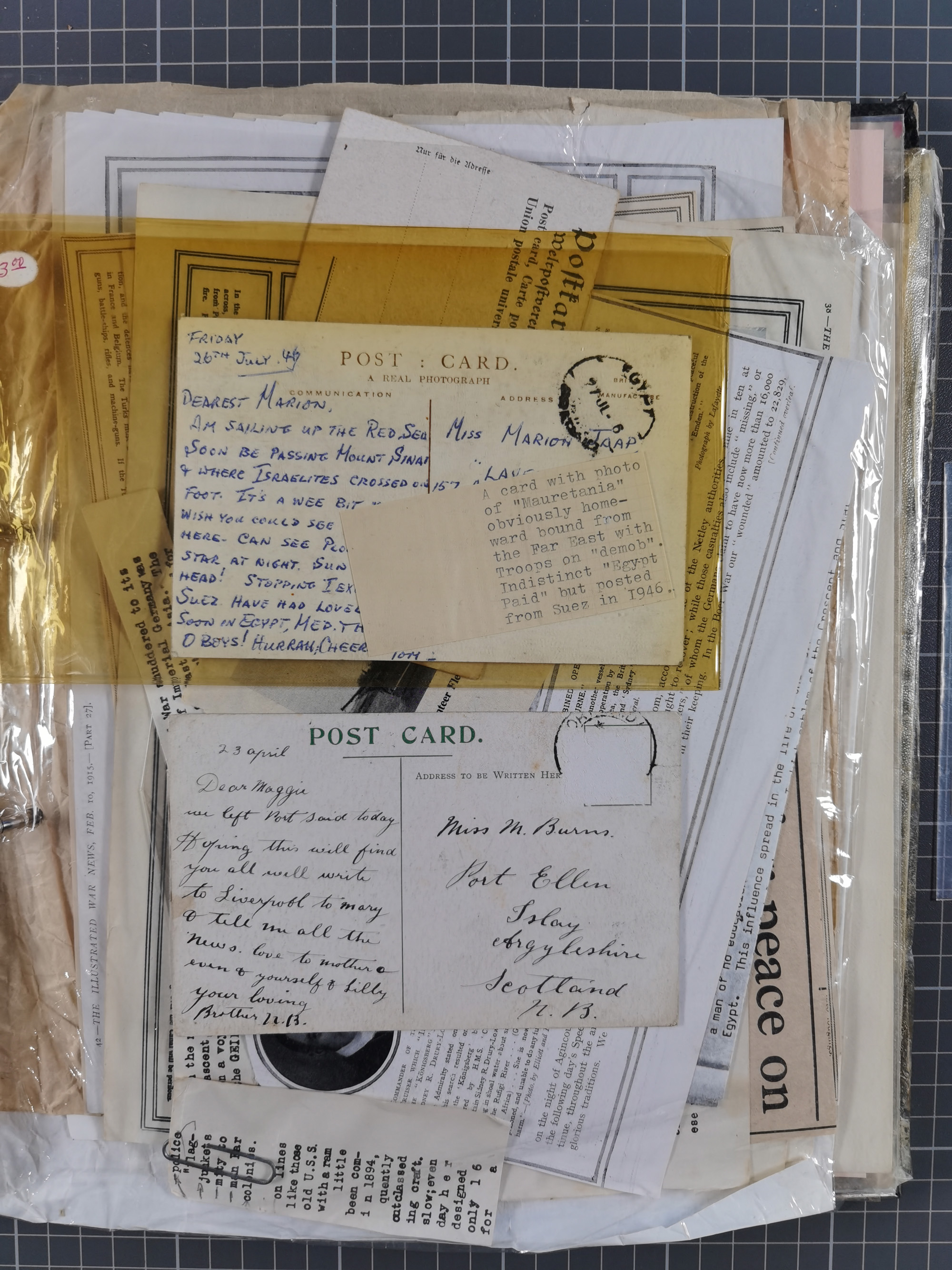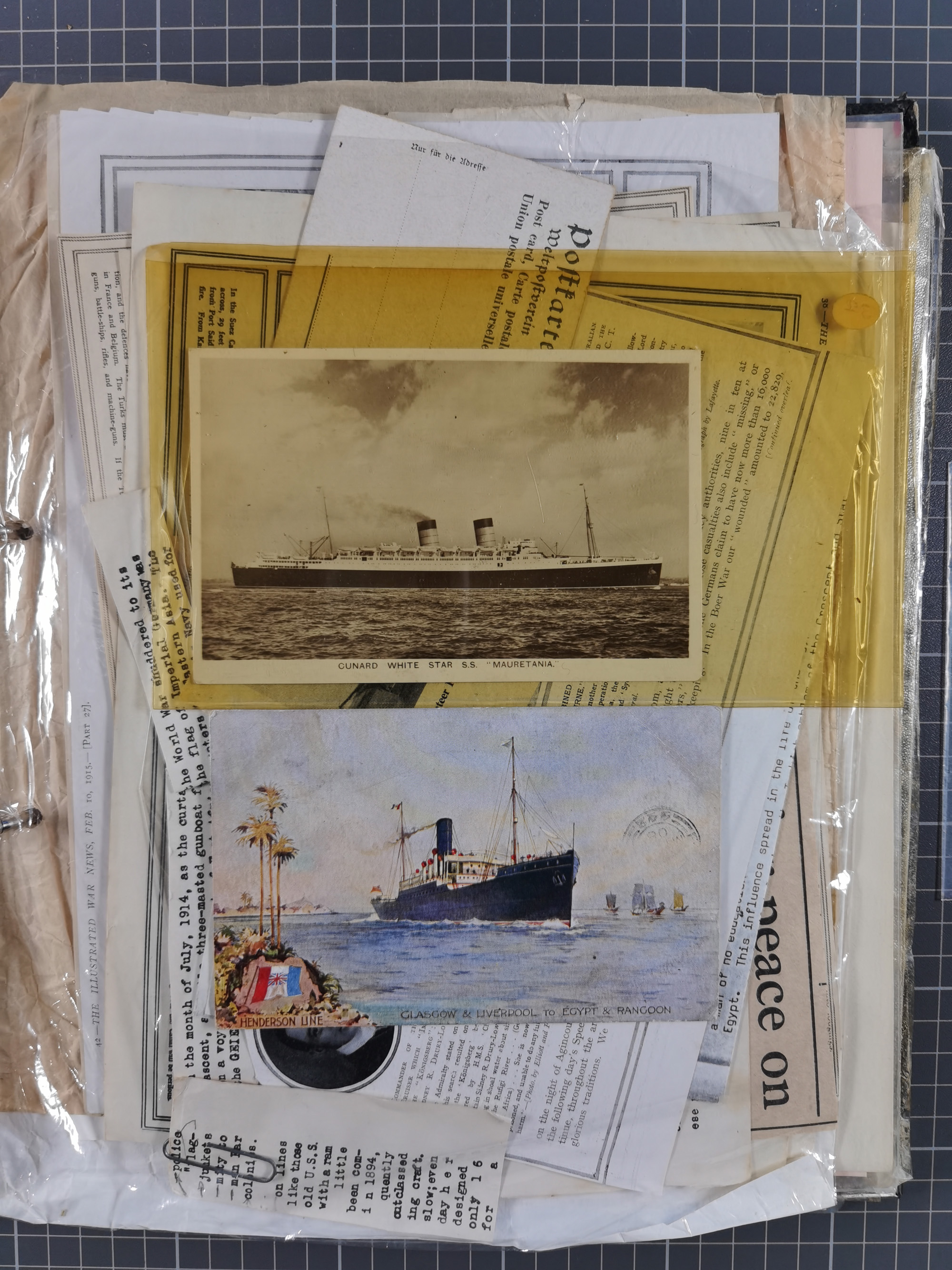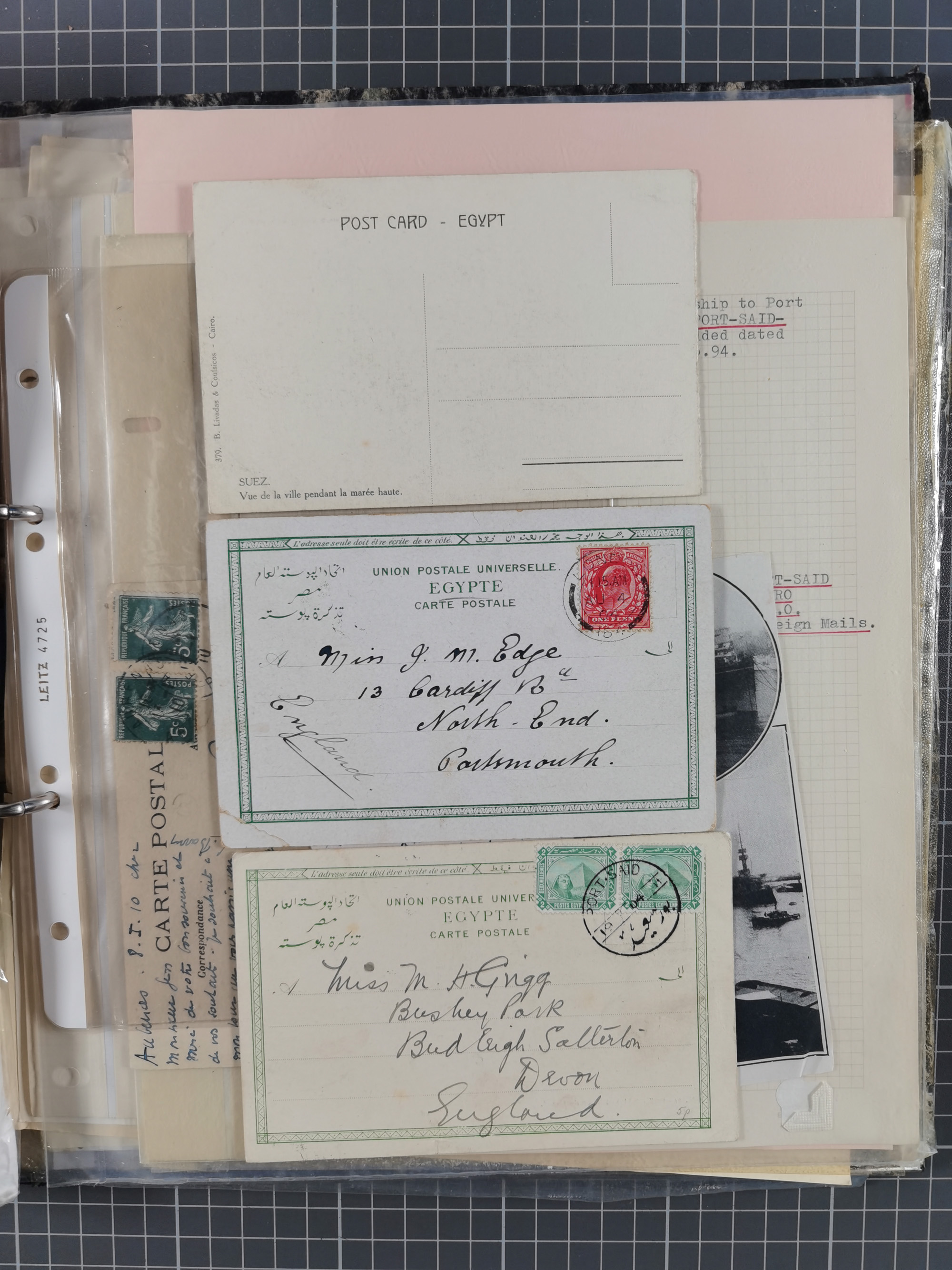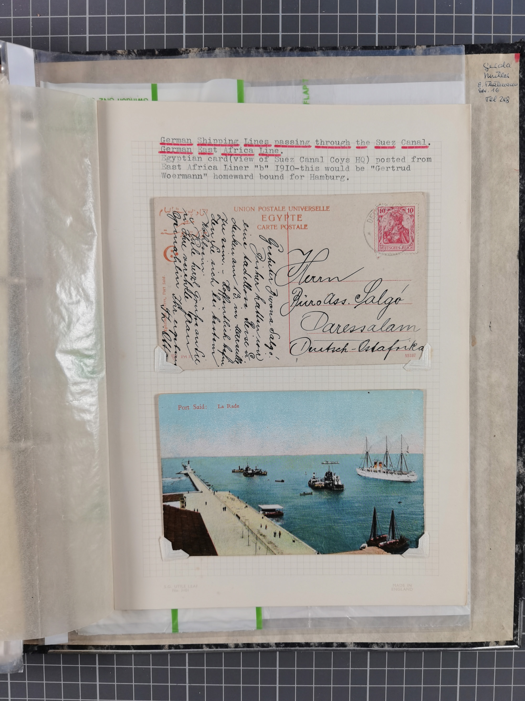 1910/49 (ca.), interessante kleine Sammlung Schiffspost mit Hauptaugenmerk auf den Suez Kanal, dabei etwas über 30 Briefe und Karten mit interessanten Stempeln sowie ferner Landkarten, Zeitungsausschnitte, etc., im Ordner