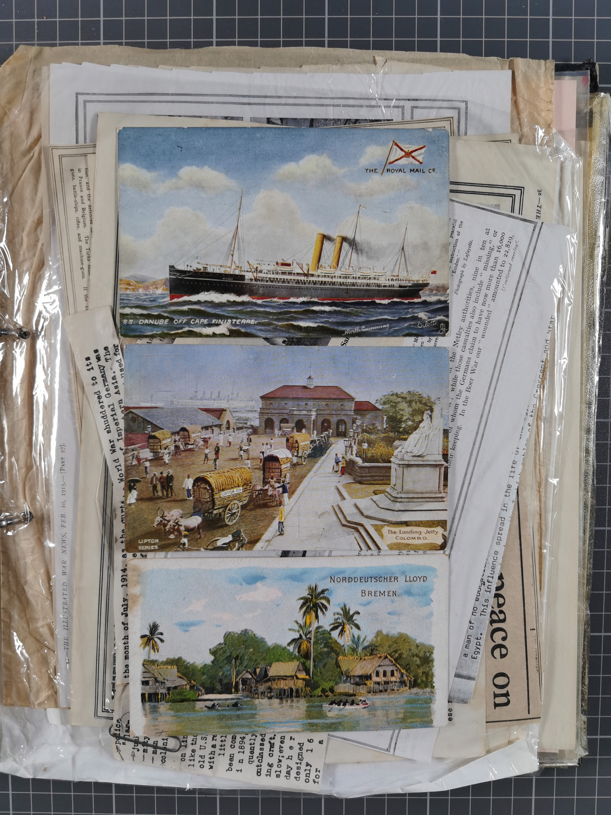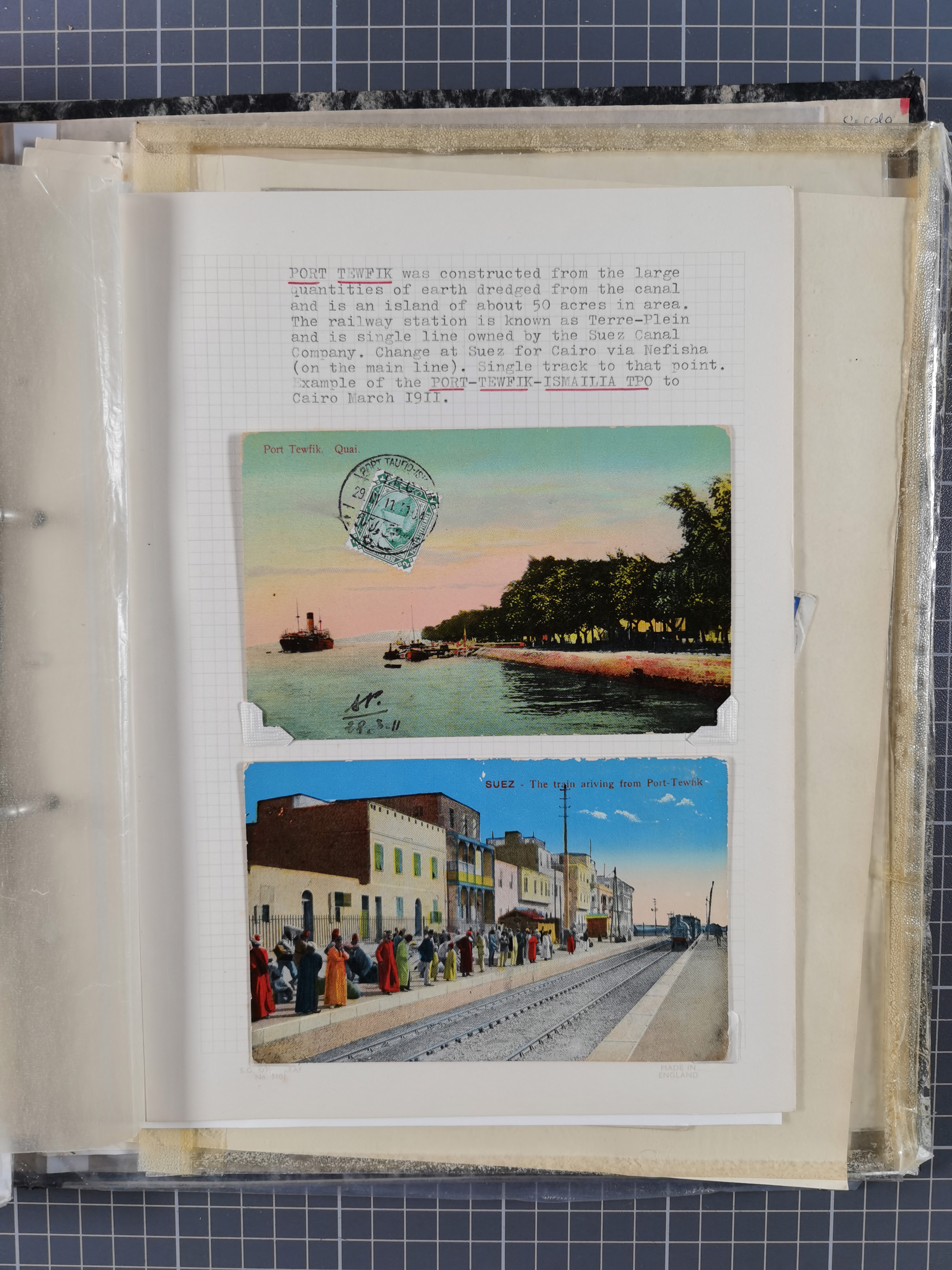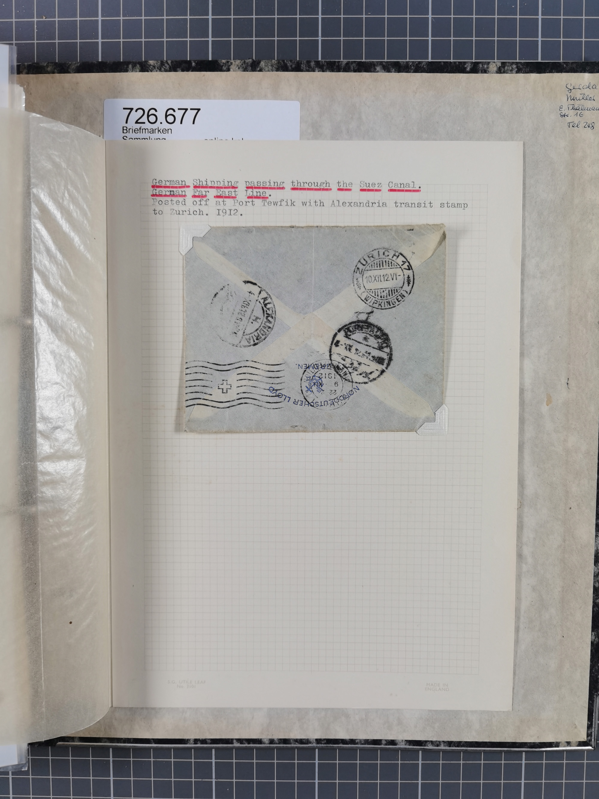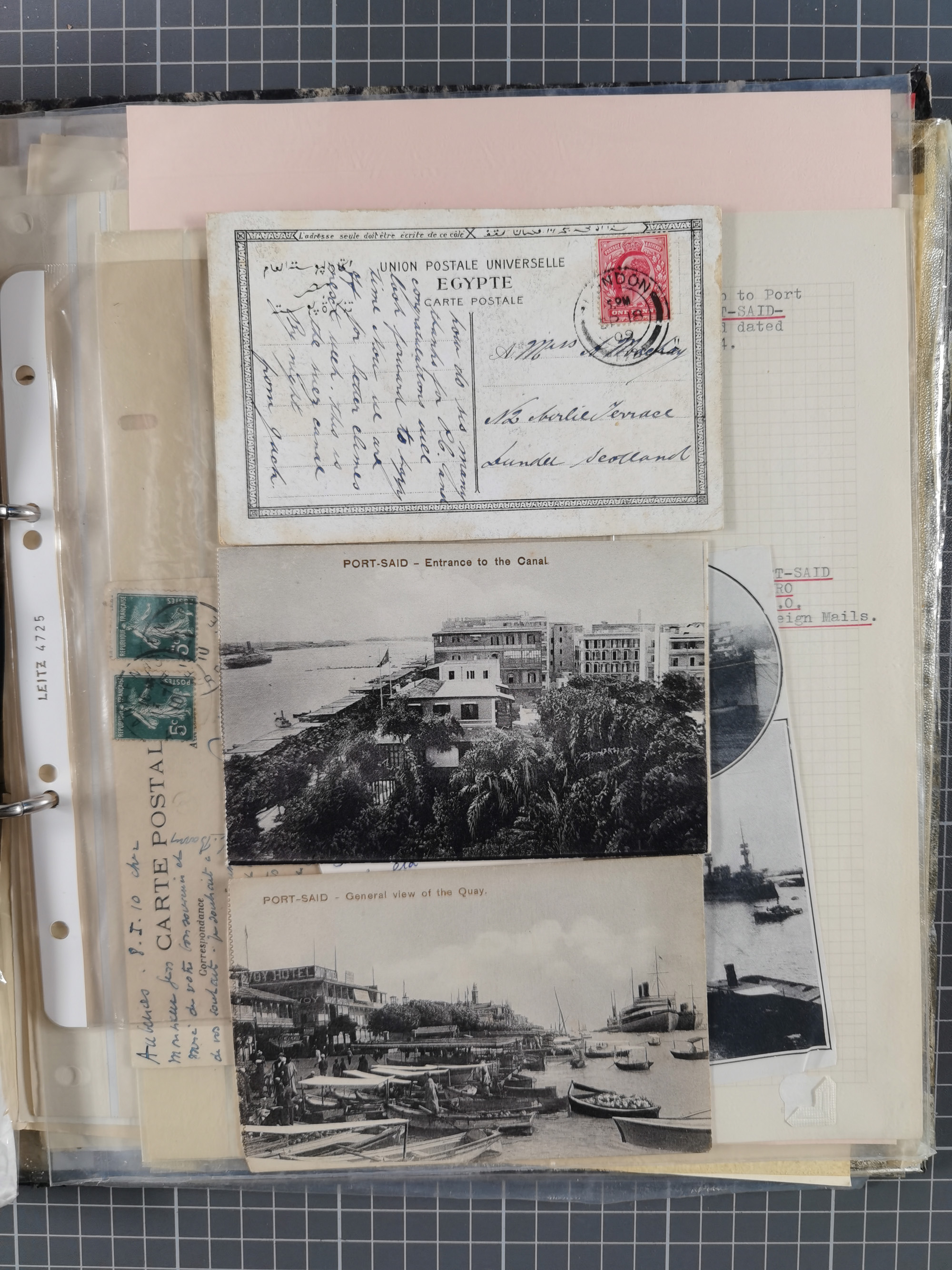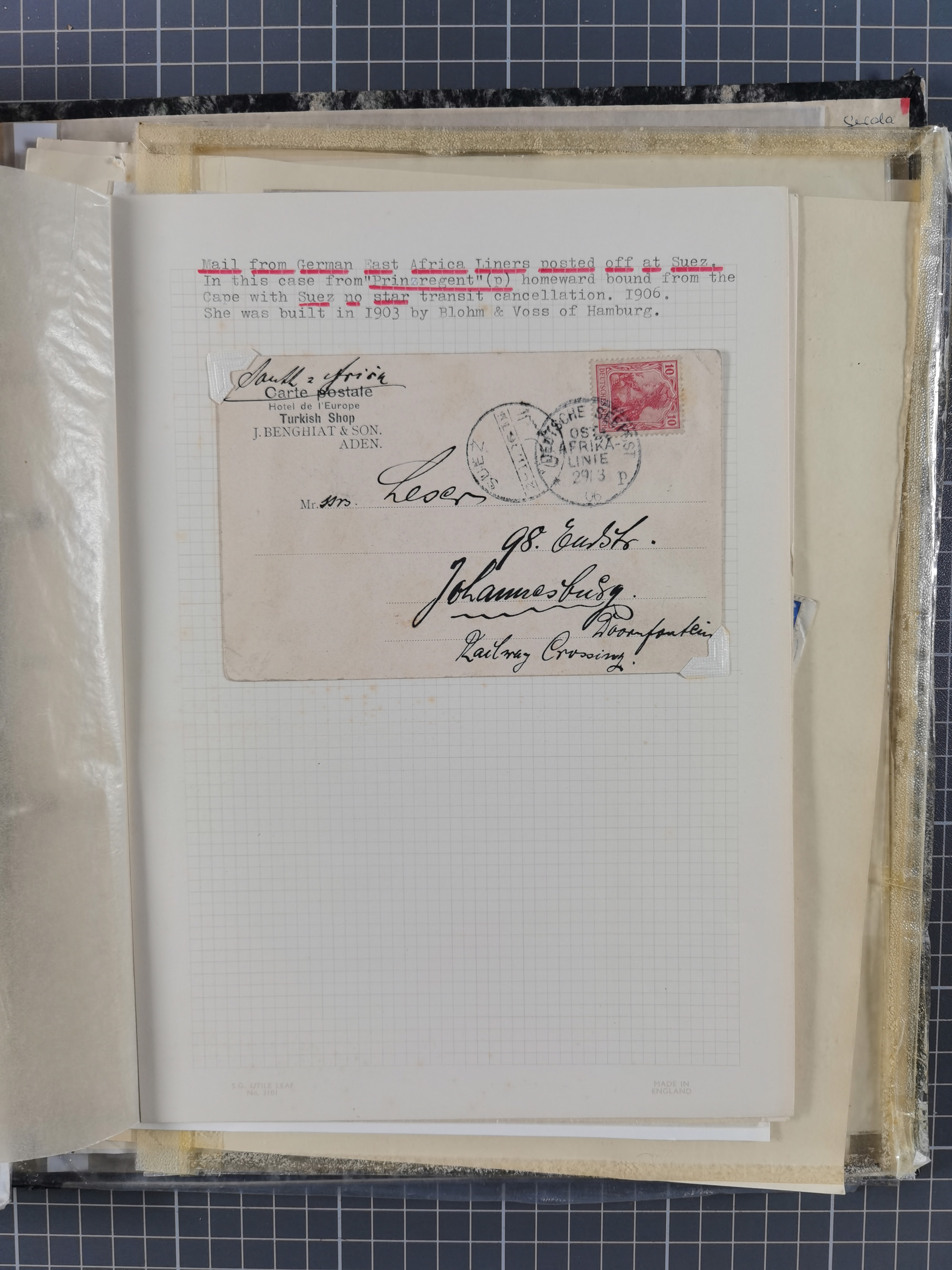 1910/49 (ca.), interessante kleine Sammlung Schiffspost mit Hauptaugenmerk auf den Suez Kanal, dabei etwas über 30 Briefe und Karten mit interessanten Stempeln sowie ferner Landkarten, Zeitungsausschnitte, etc., im Ordner