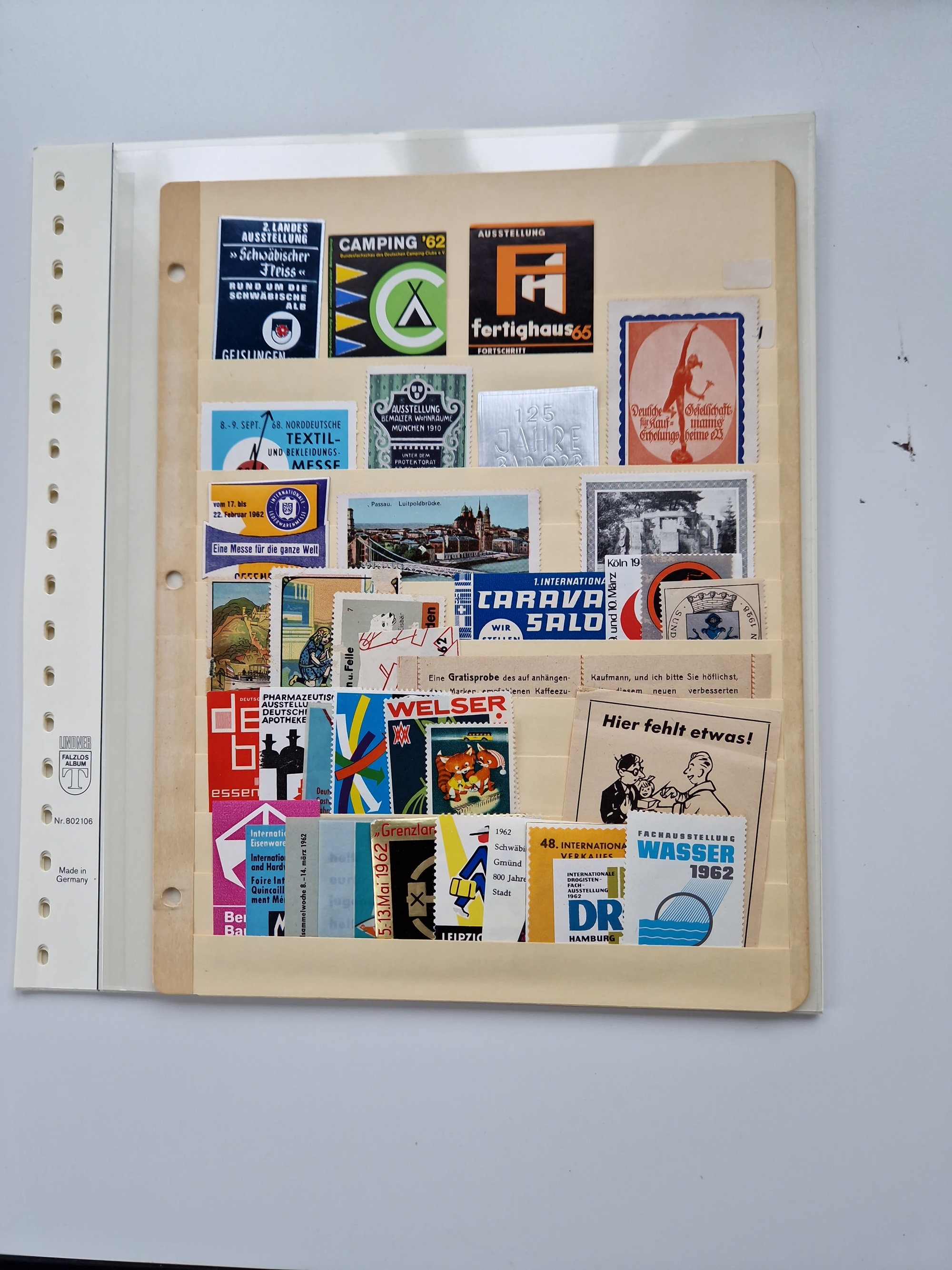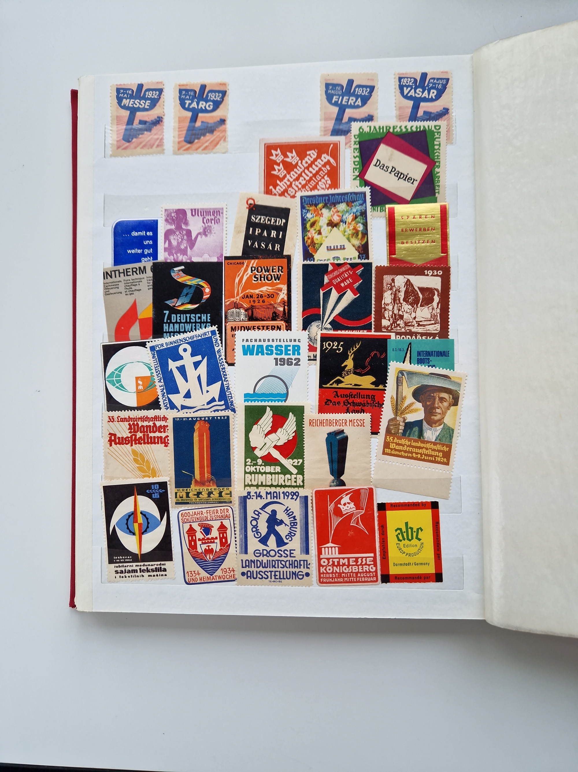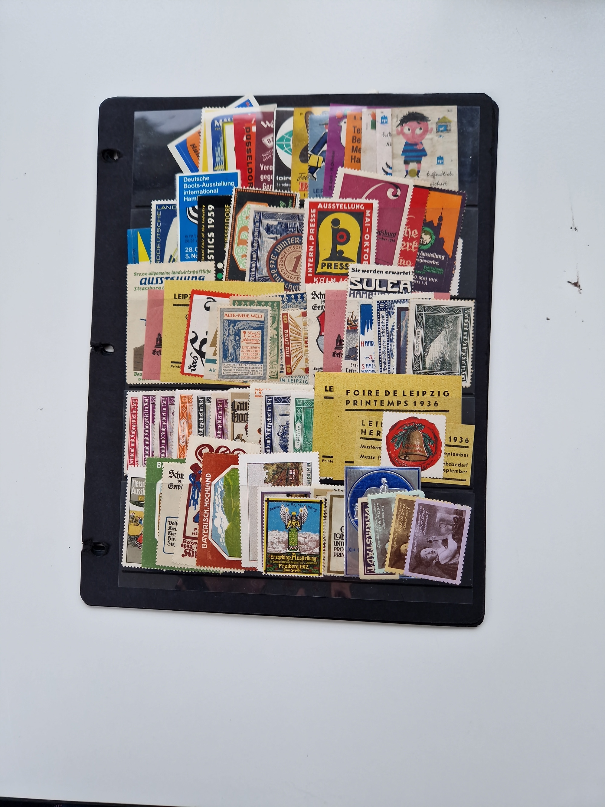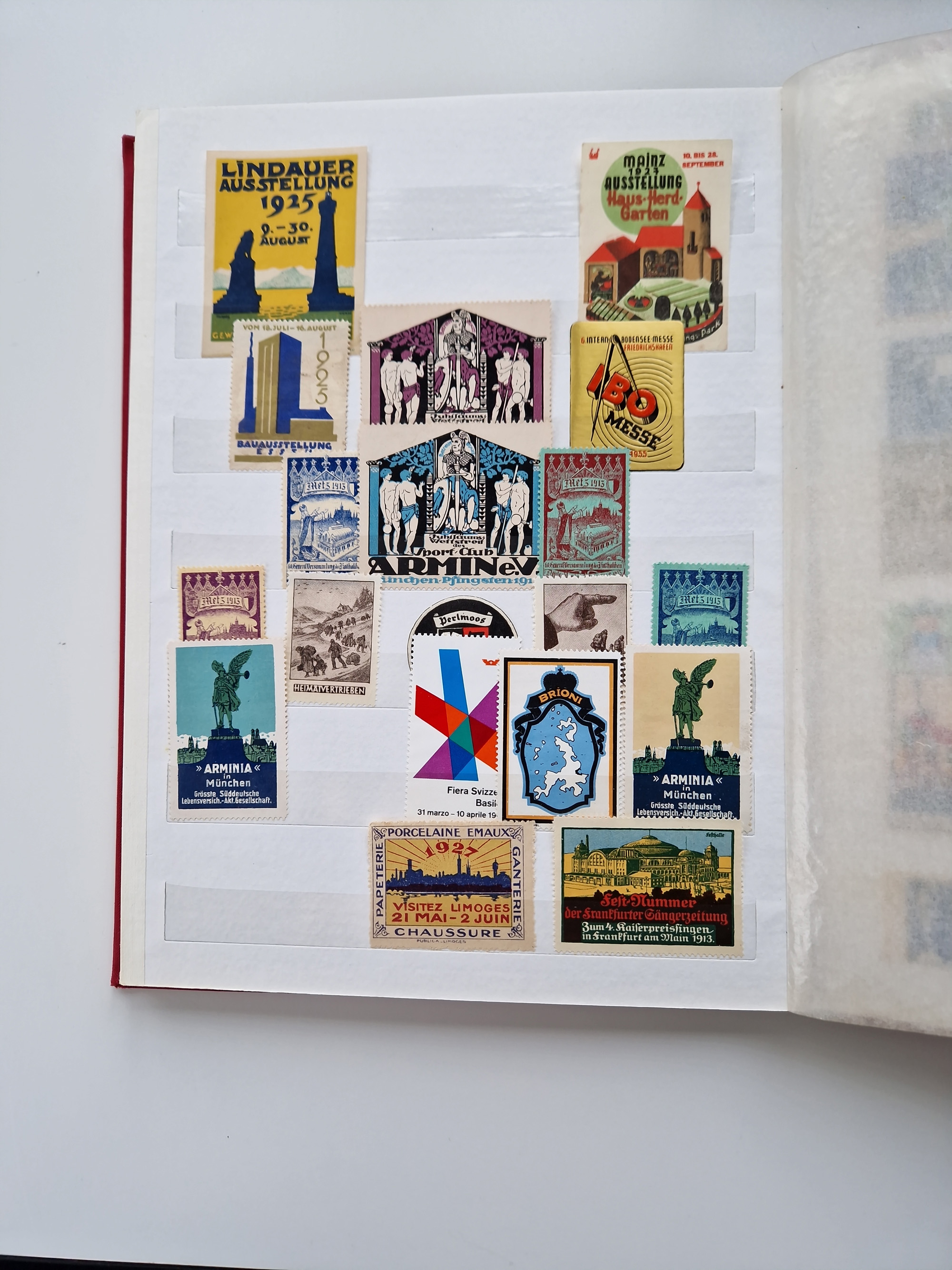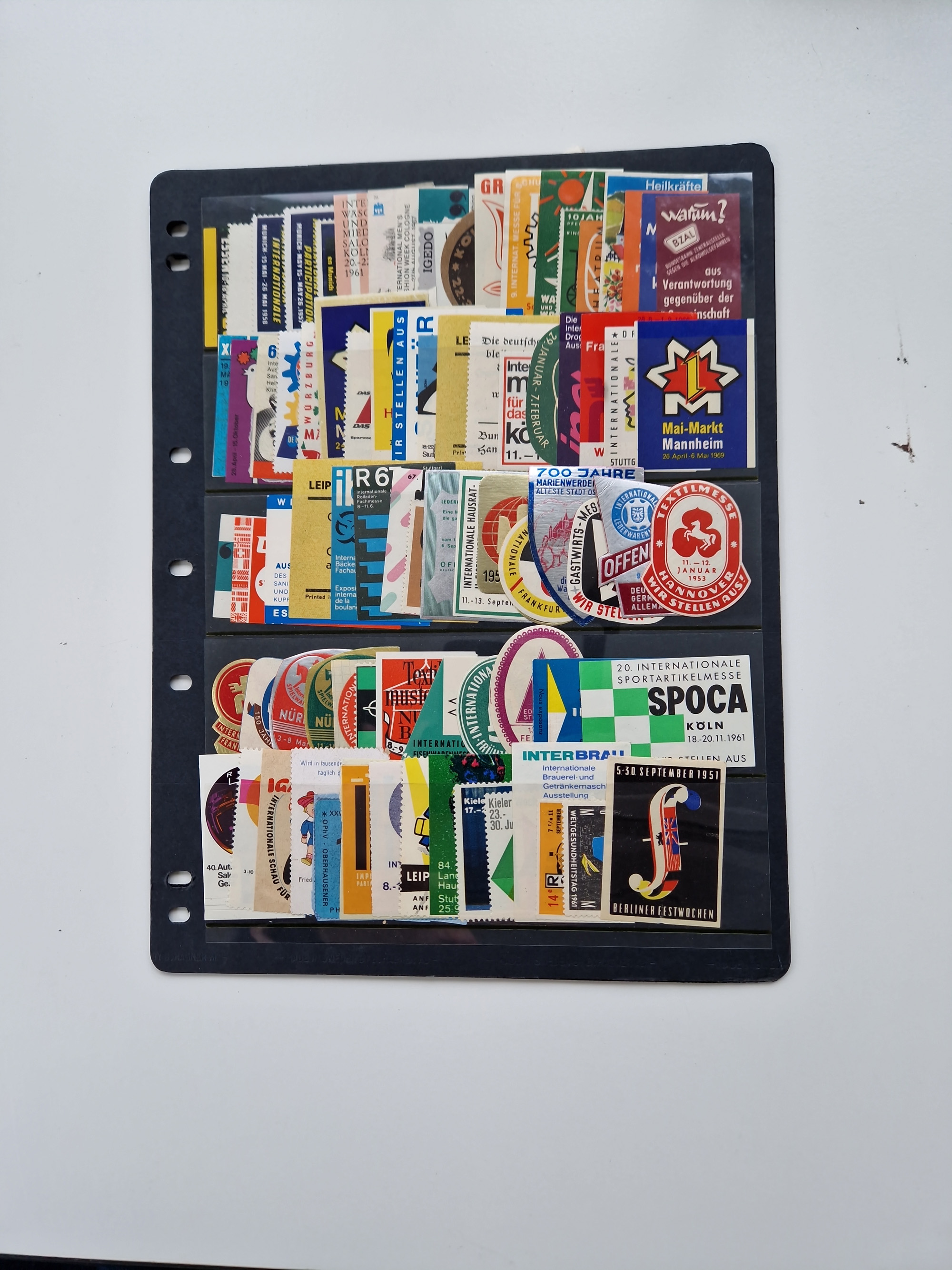 VIGNETTEN: 1896/1960 (ca.), hochinteressanter Bestand mit einigen Tausend Vignetten, Verschluss- und Siegelmarken, später Spendenvignetten und -Blocks, dabei viele zu unterschiedlichen Ausstellungen, meist aus Berlin, München, Nürnberg, Leipzig mit Export-Messe, ferner aber auch Luftpost-Ausstellung, Gewerbe- und Industrieschau, Landwirtschaft, Kunst, Firmenvignetten, etc., etwas zu Briefmarken-Ausstellungen, dabei auch drei Hessheimer Entwürfe, vieles auf amerikanischen Händlerkarten und Loskarten, in drei Kartons