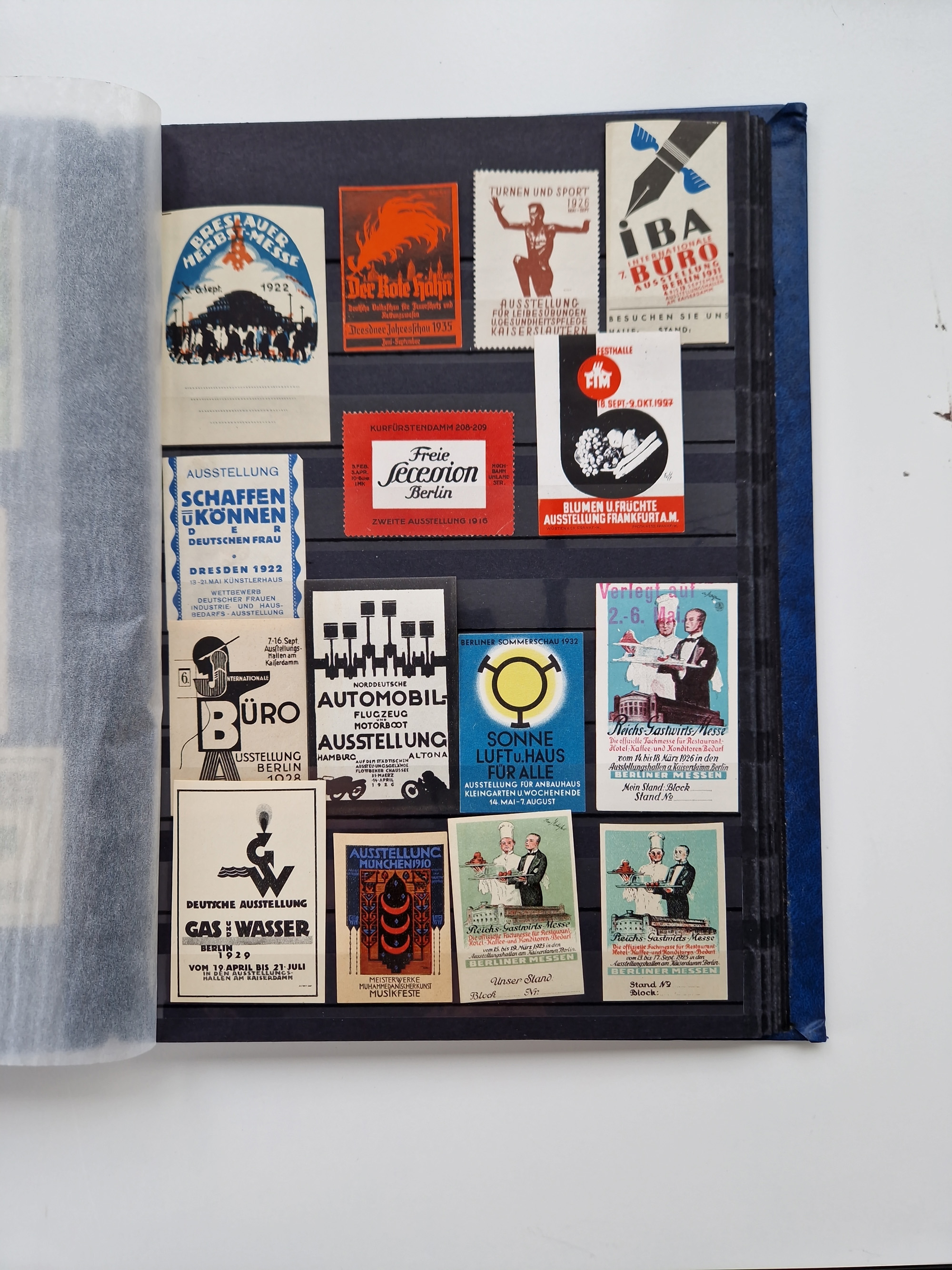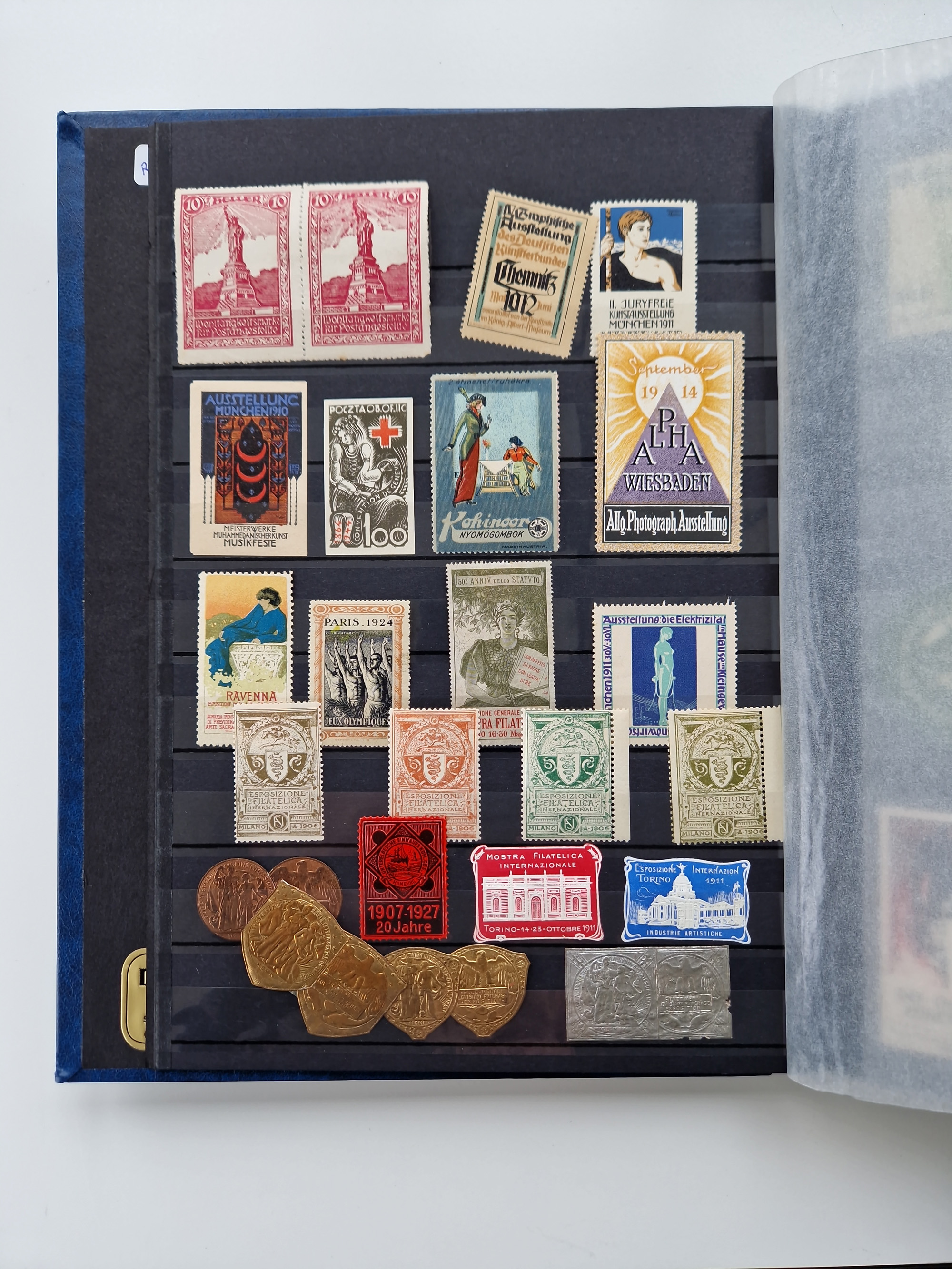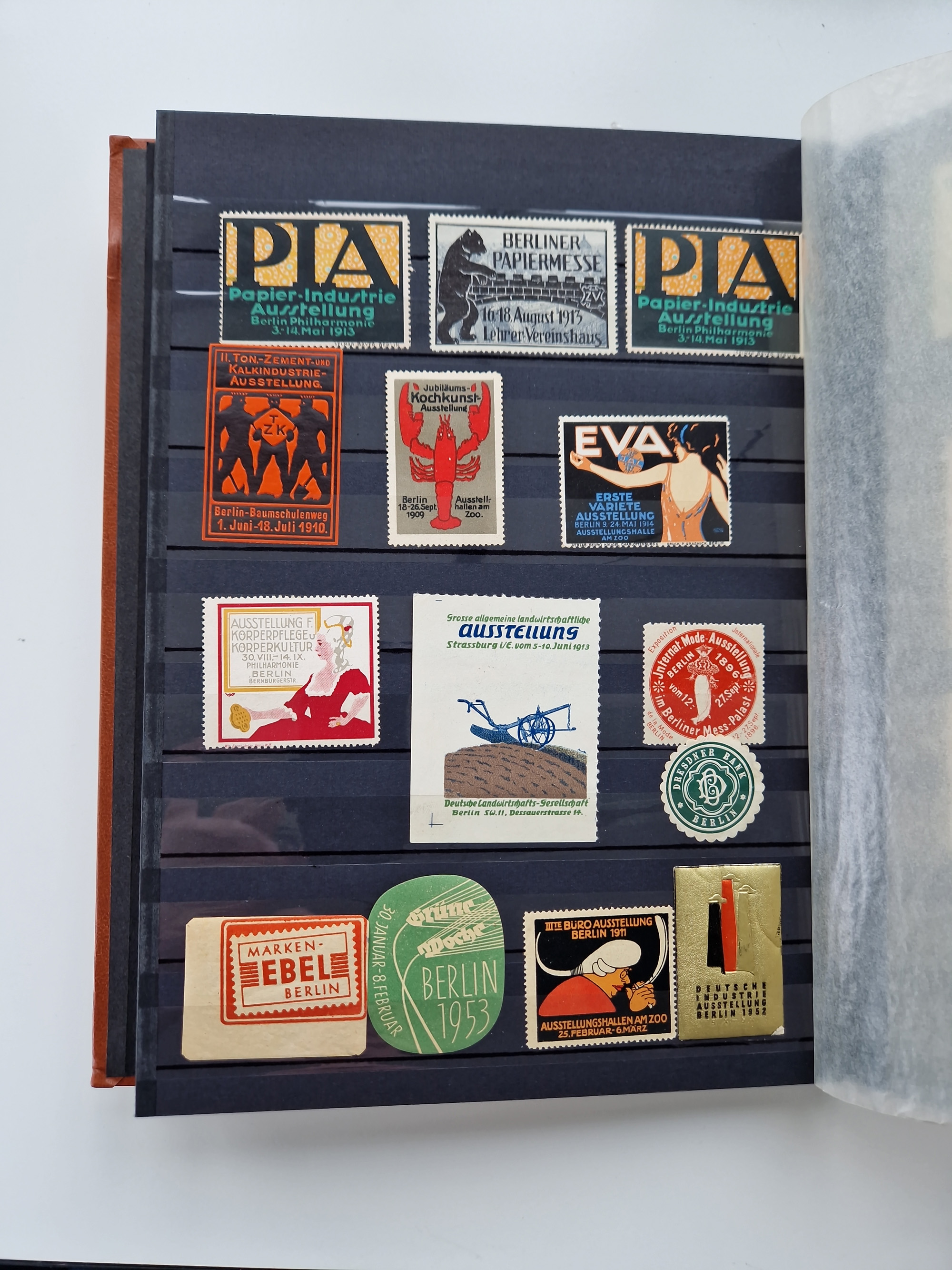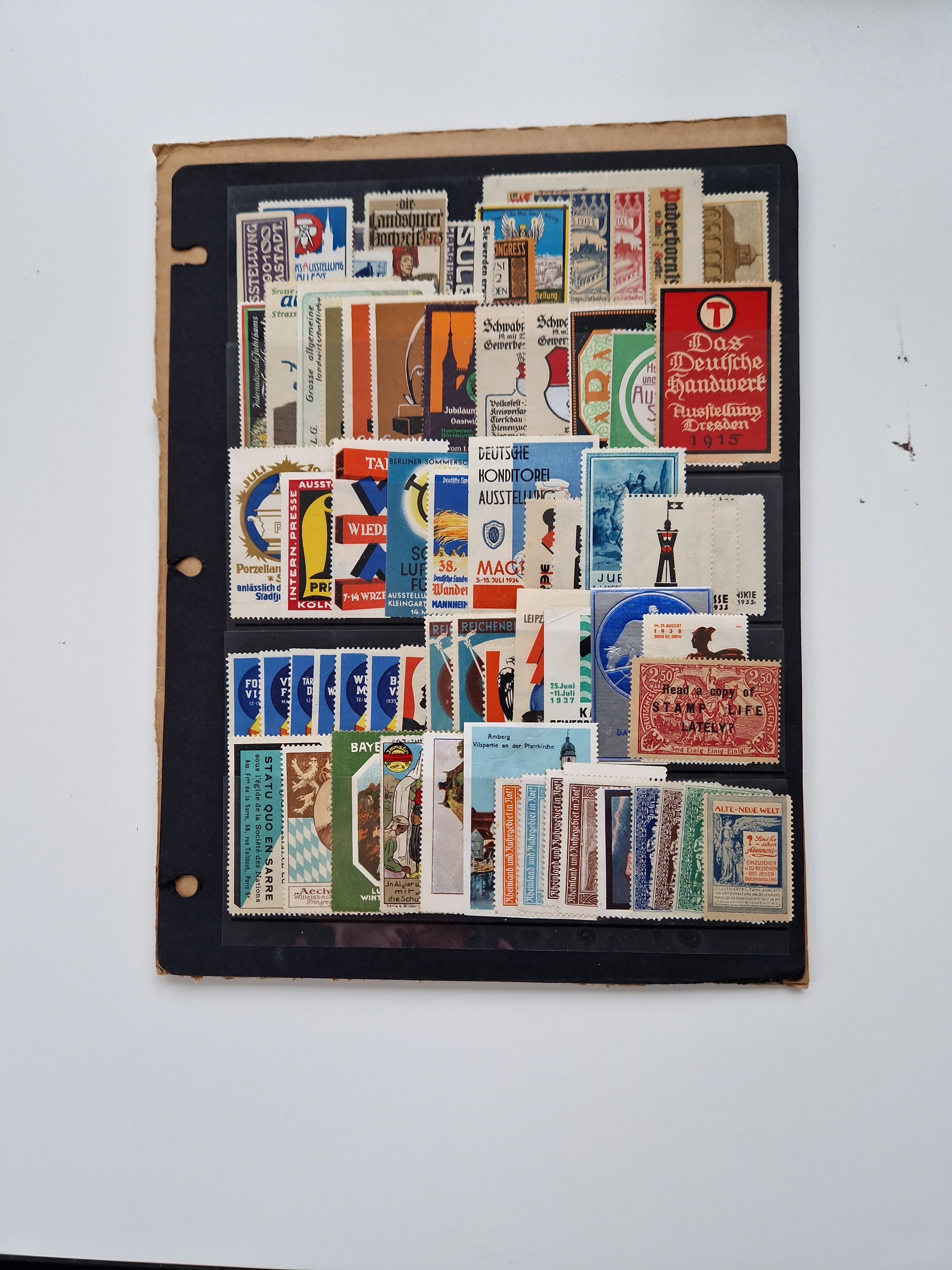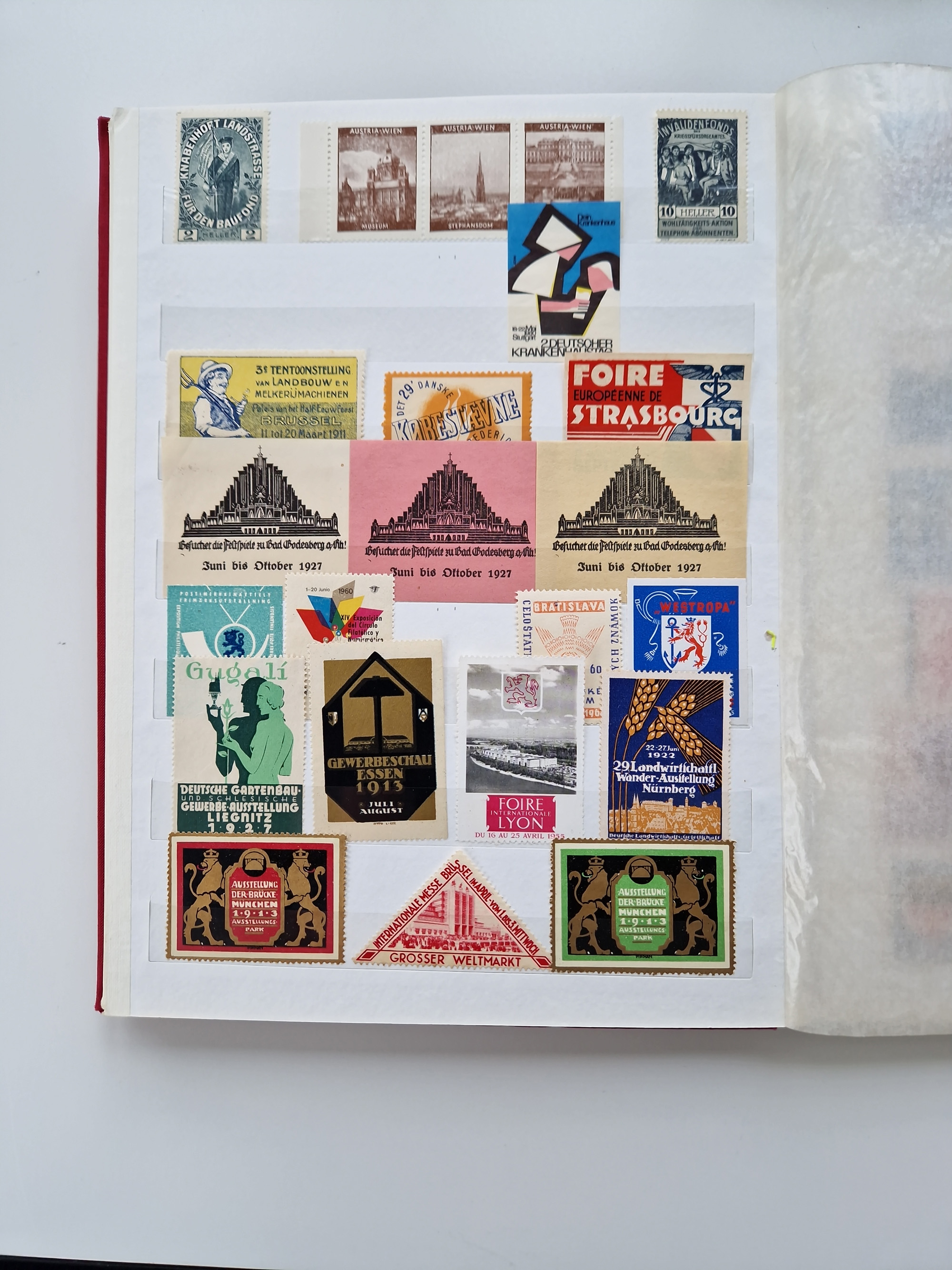 VIGNETTEN: 1896/1960 (ca.), hochinteressanter Bestand mit einigen Tausend Vignetten, Verschluss- und Siegelmarken, später Spendenvignetten und -Blocks, dabei viele zu unterschiedlichen Ausstellungen, meist aus Berlin, München, Nürnberg, Leipzig mit Export-Messe, ferner aber auch Luftpost-Ausstellung, Gewerbe- und Industrieschau, Landwirtschaft, Kunst, Firmenvignetten, etc., etwas zu Briefmarken-Ausstellungen, dabei auch drei Hessheimer Entwürfe, vieles auf amerikanischen Händlerkarten und Loskarten, in drei Kartons