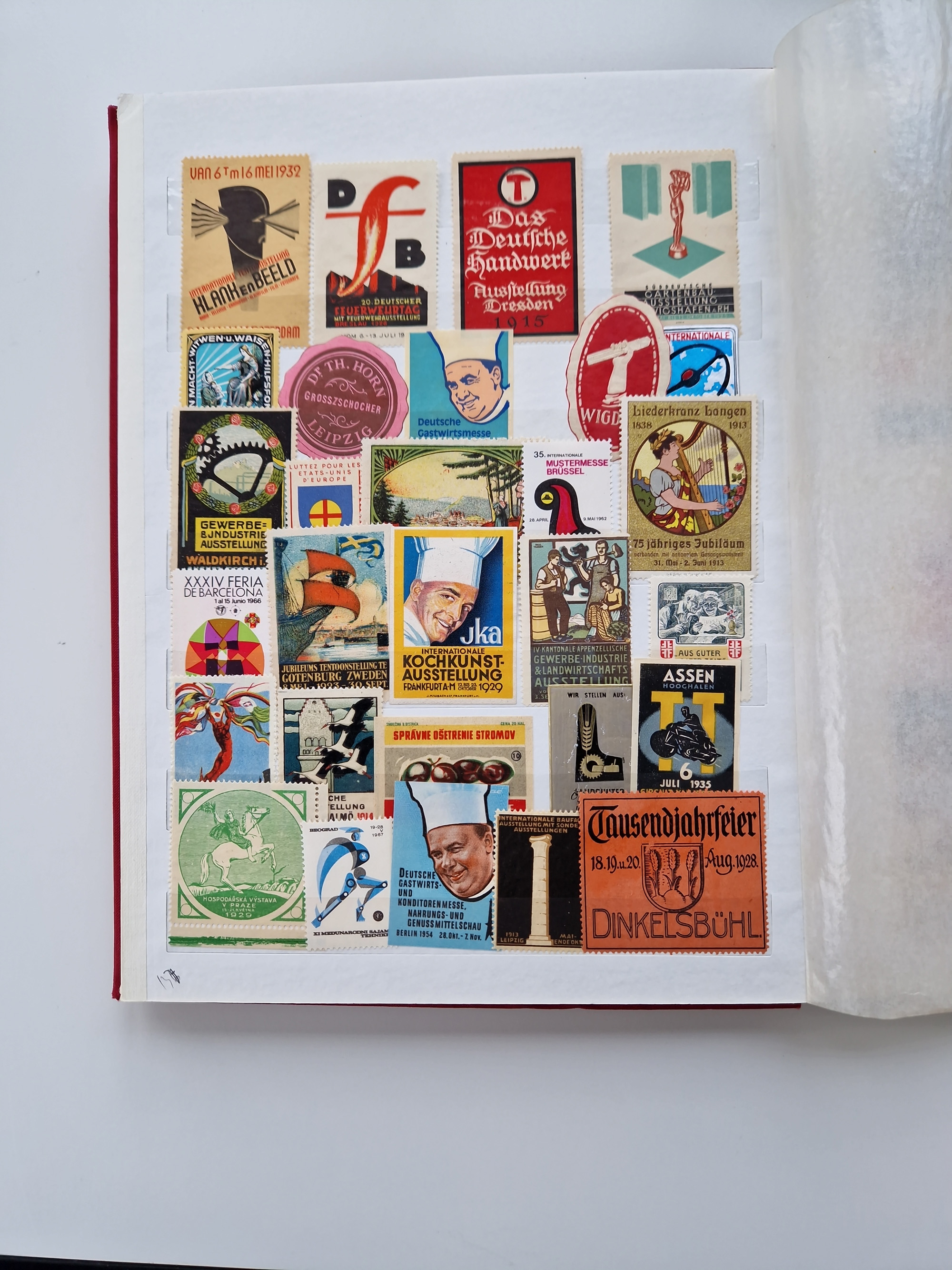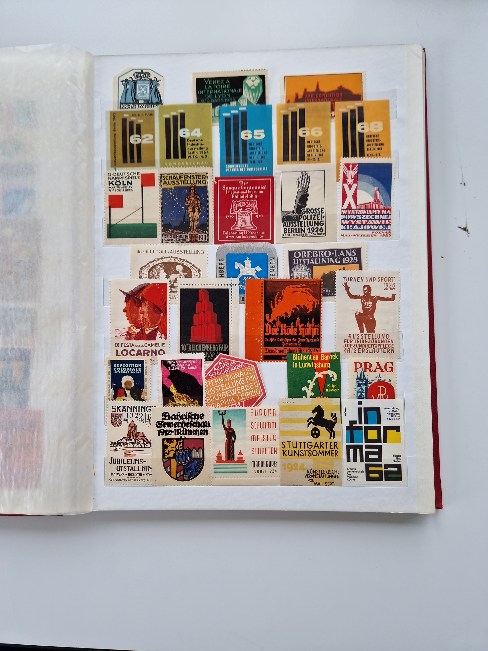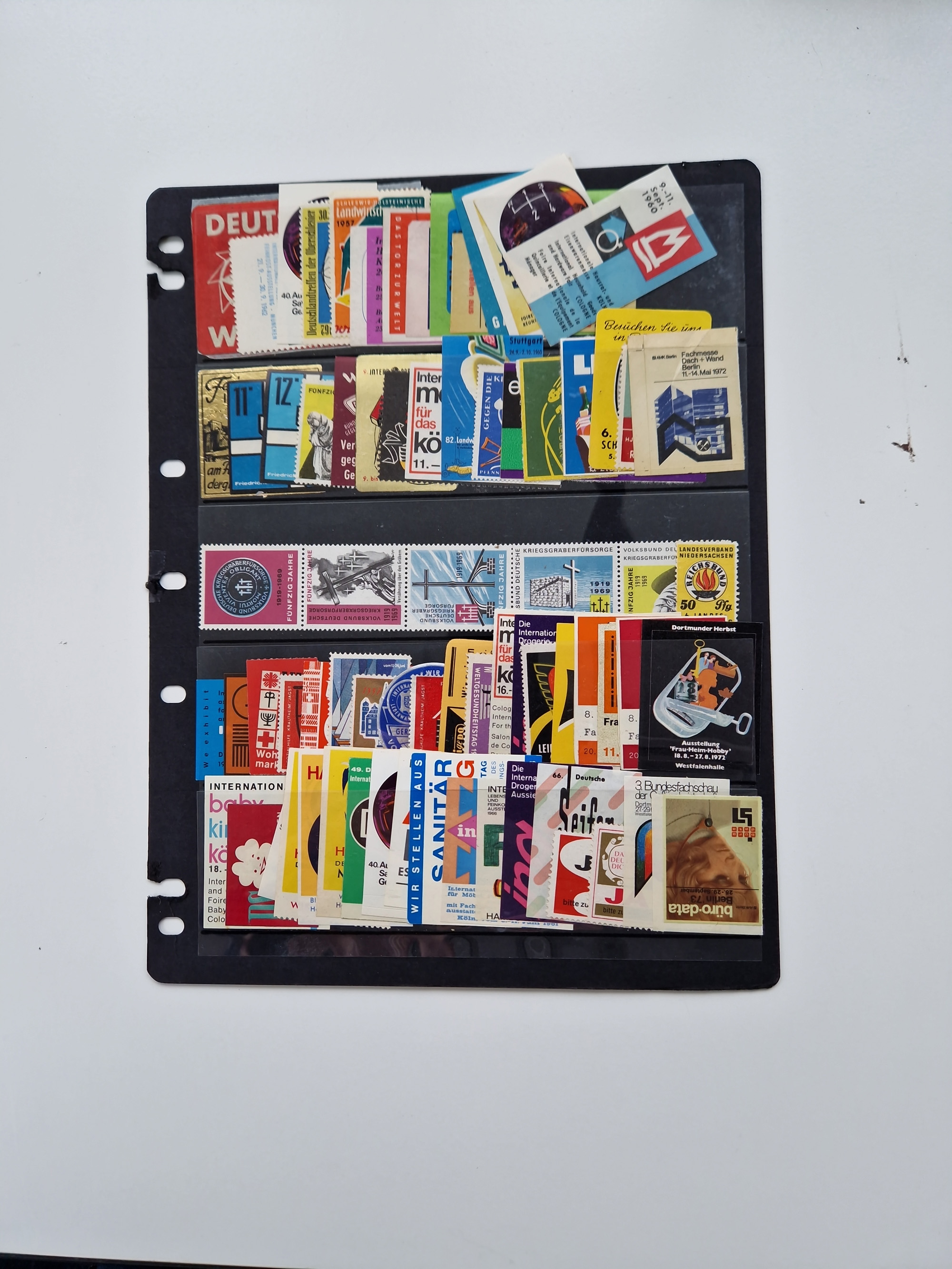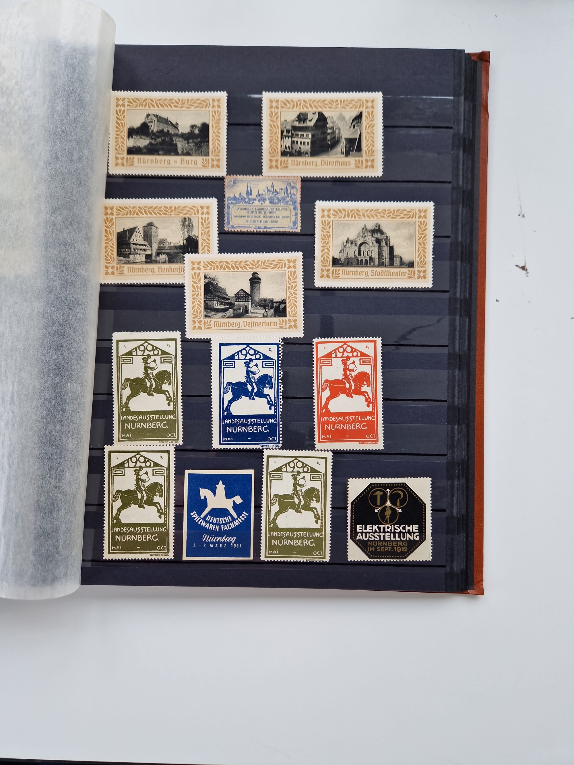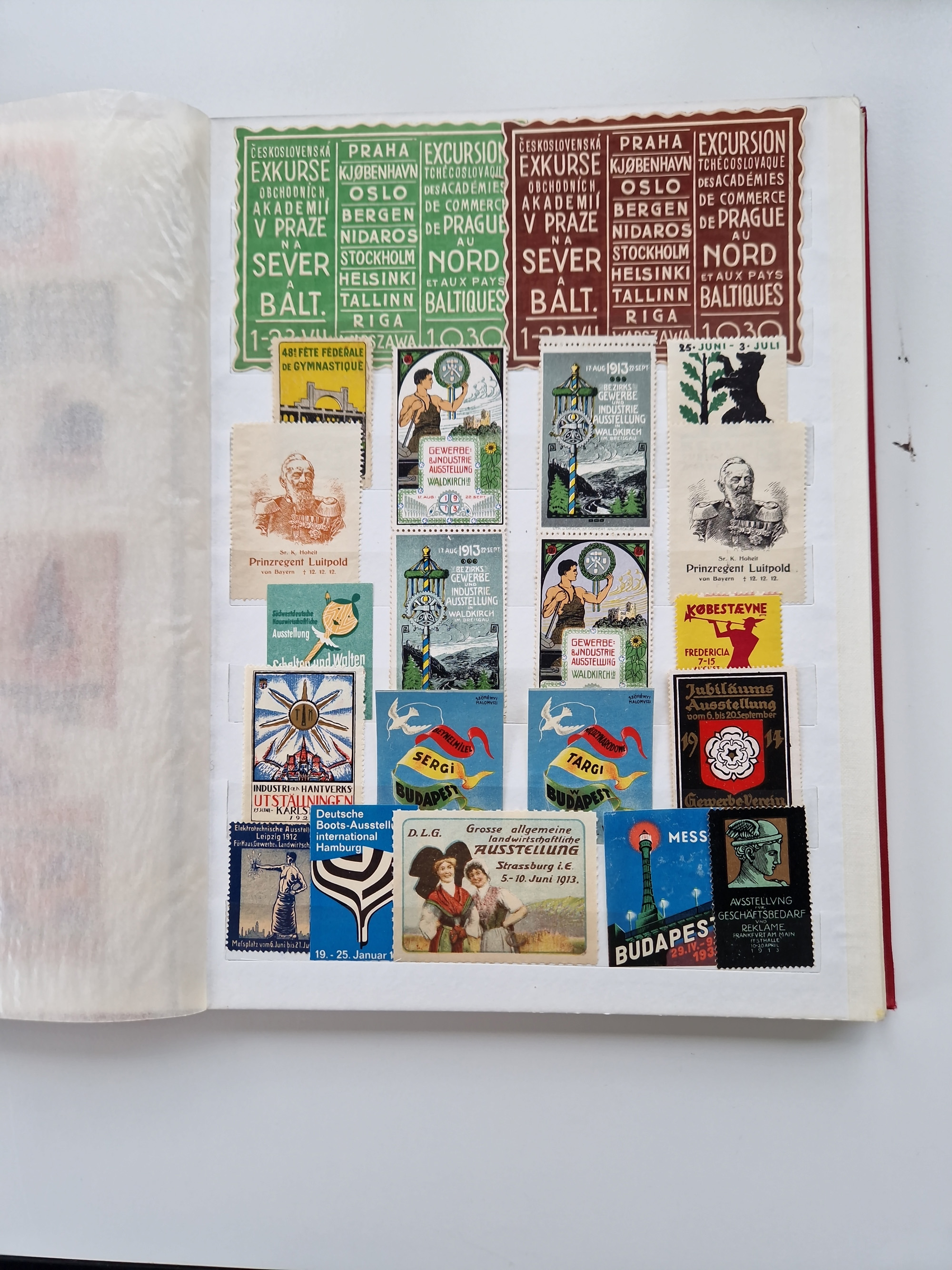 VIGNETTEN: 1896/1960 (ca.), hochinteressanter Bestand mit einigen Tausend Vignetten, Verschluss- und Siegelmarken, später Spendenvignetten und -Blocks, dabei viele zu unterschiedlichen Ausstellungen, meist aus Berlin, München, Nürnberg, Leipzig mit Export-Messe, ferner aber auch Luftpost-Ausstellung, Gewerbe- und Industrieschau, Landwirtschaft, Kunst, Firmenvignetten, etc., etwas zu Briefmarken-Ausstellungen, dabei auch drei Hessheimer Entwürfe, vieles auf amerikanischen Händlerkarten und Loskarten, in drei Kartons