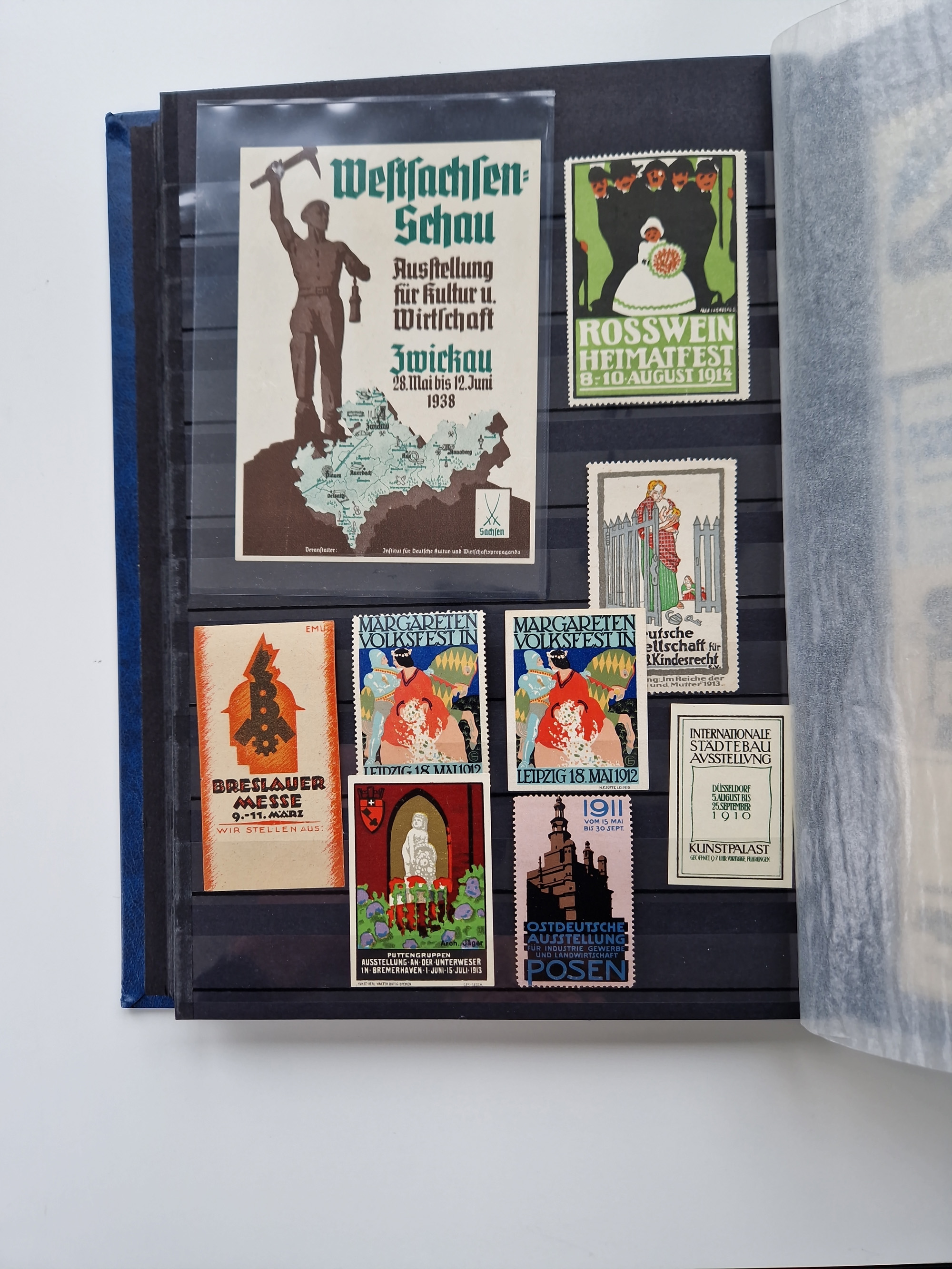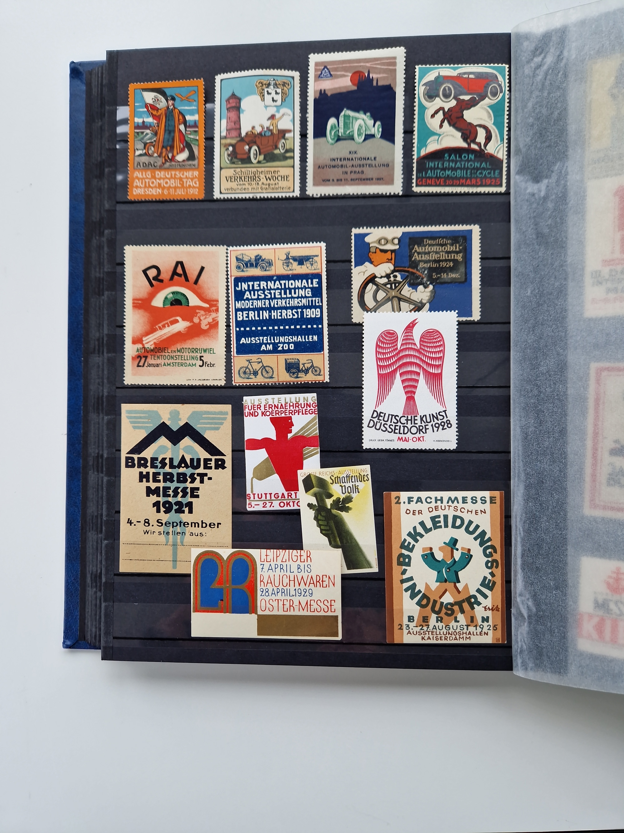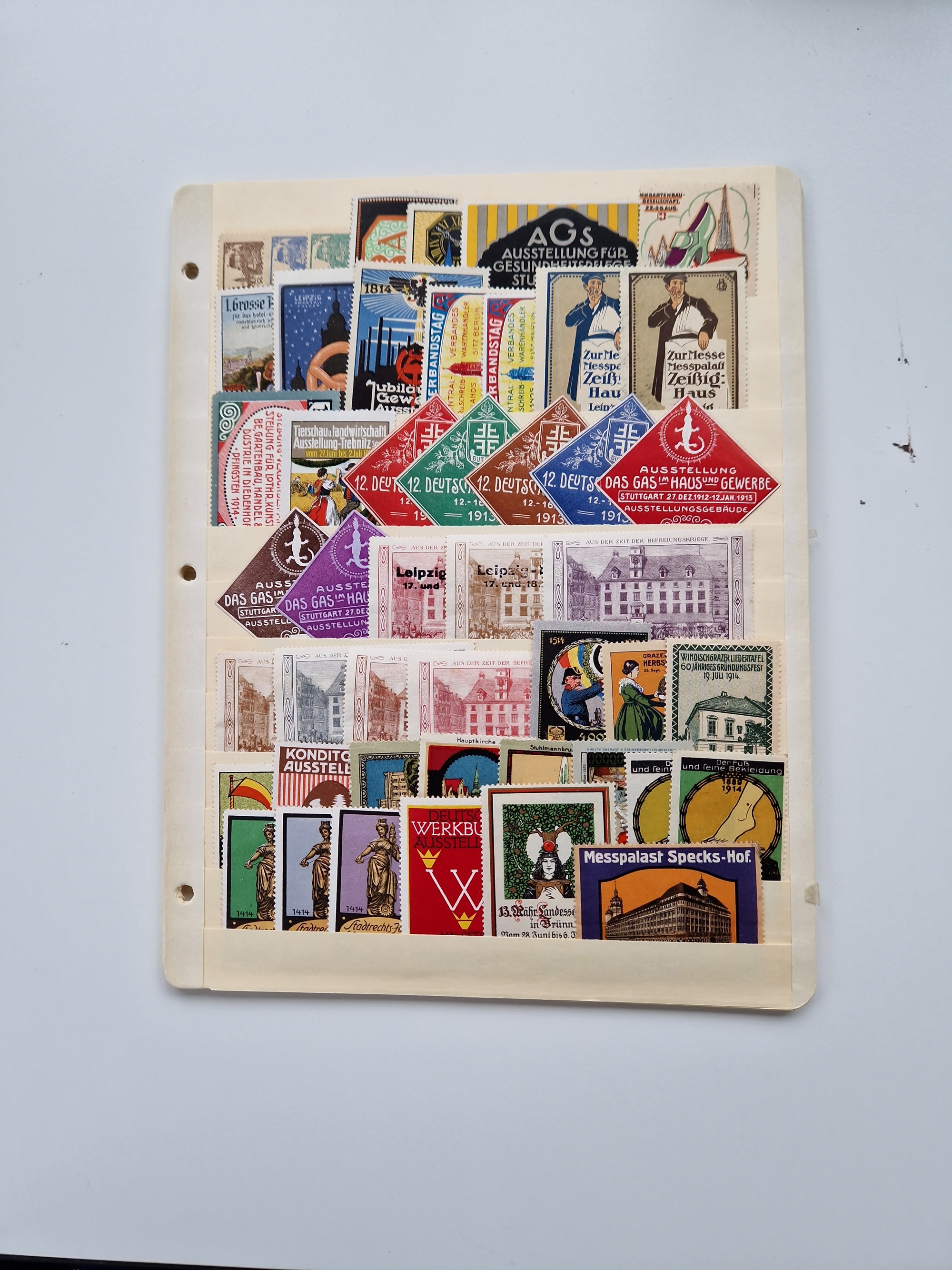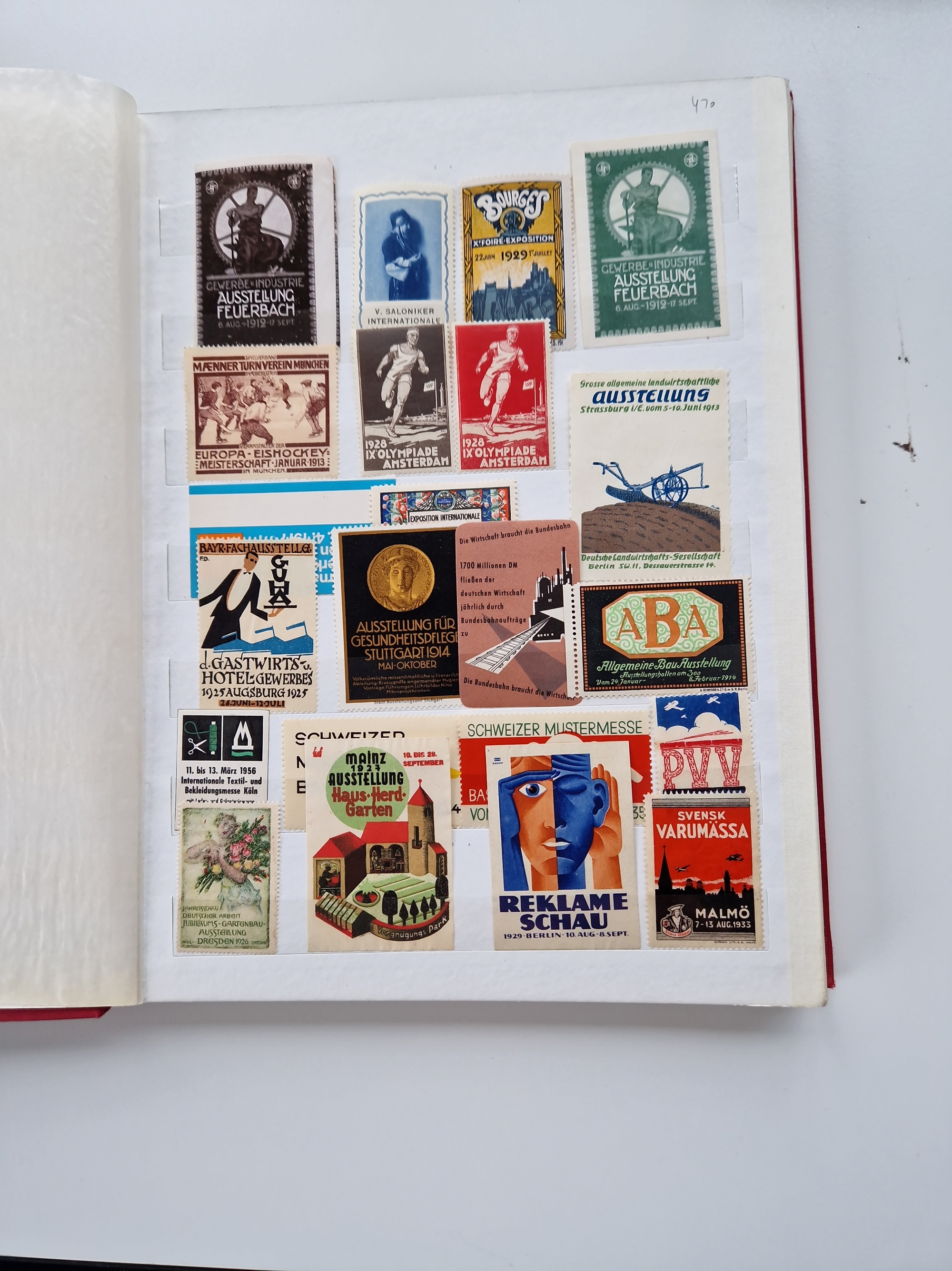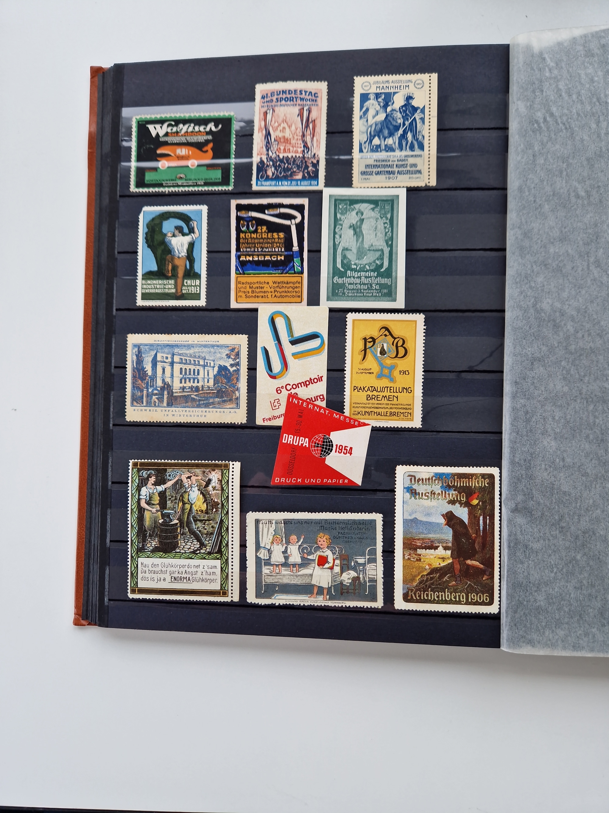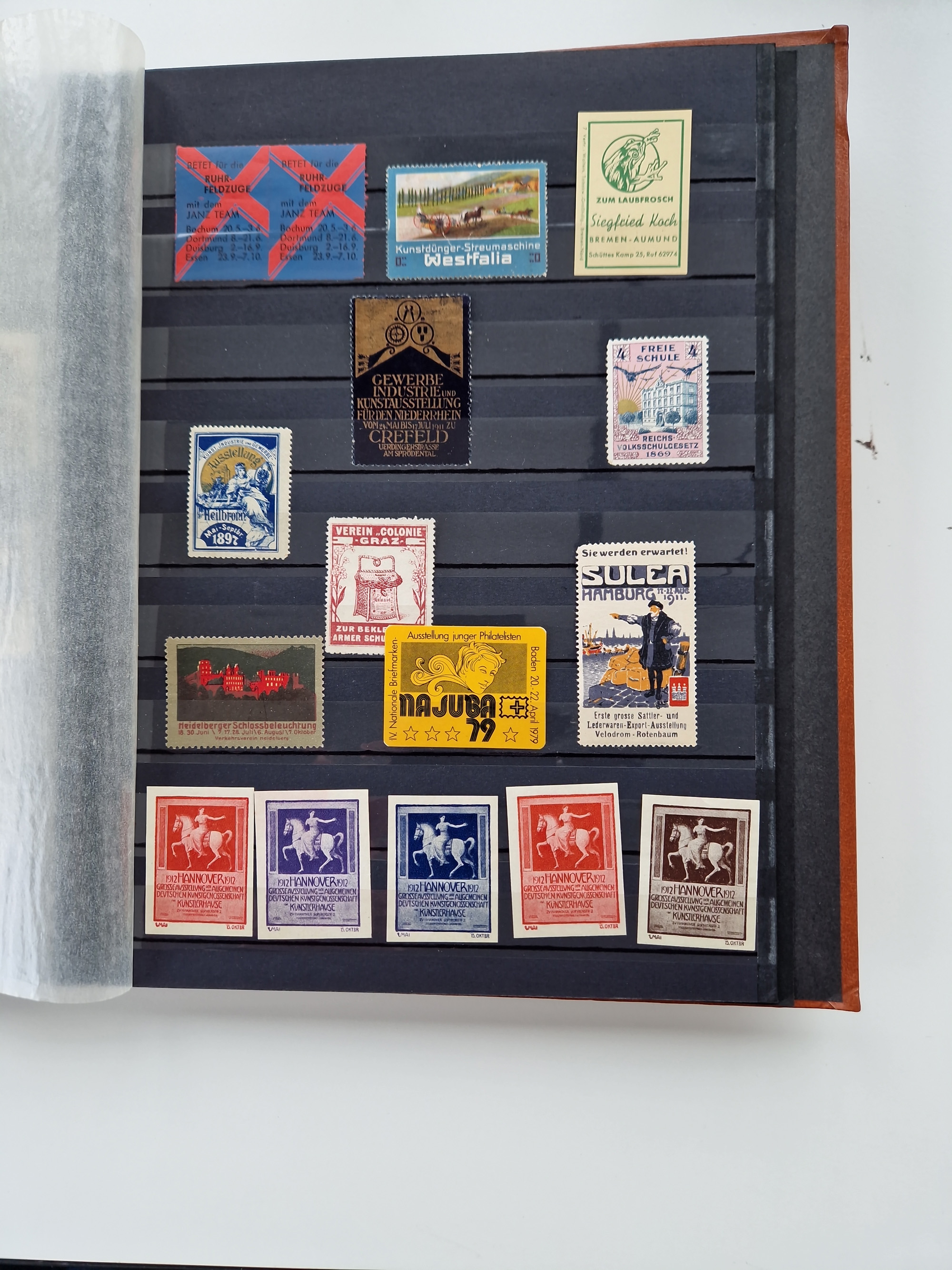 VIGNETTEN: 1896/1960 (ca.), hochinteressanter Bestand mit einigen Tausend Vignetten, Verschluss- und Siegelmarken, später Spendenvignetten und -Blocks, dabei viele zu unterschiedlichen Ausstellungen, meist aus Berlin, München, Nürnberg, Leipzig mit Export-Messe, ferner aber auch Luftpost-Ausstellung, Gewerbe- und Industrieschau, Landwirtschaft, Kunst, Firmenvignetten, etc., etwas zu Briefmarken-Ausstellungen, dabei auch drei Hessheimer Entwürfe, vieles auf amerikanischen Händlerkarten und Loskarten, in drei Kartons