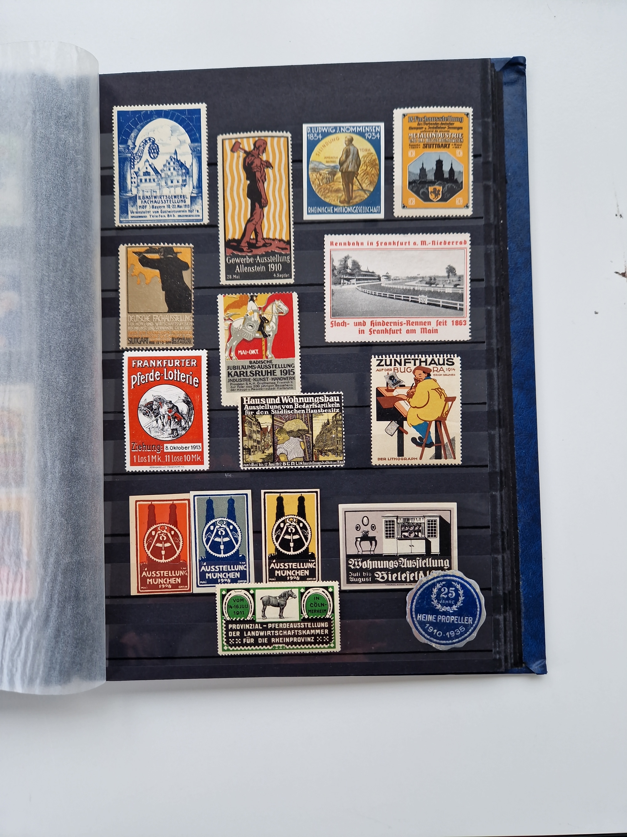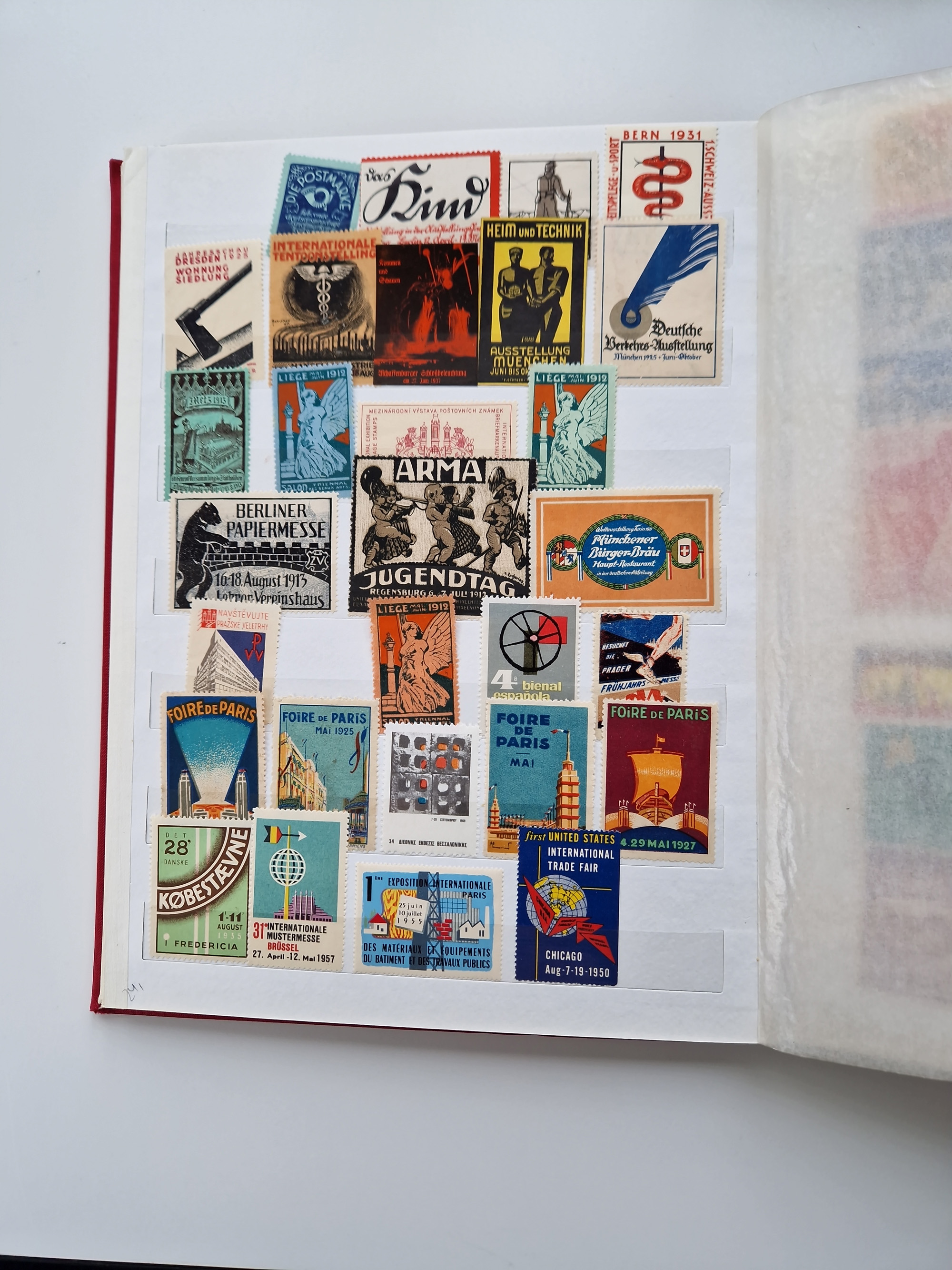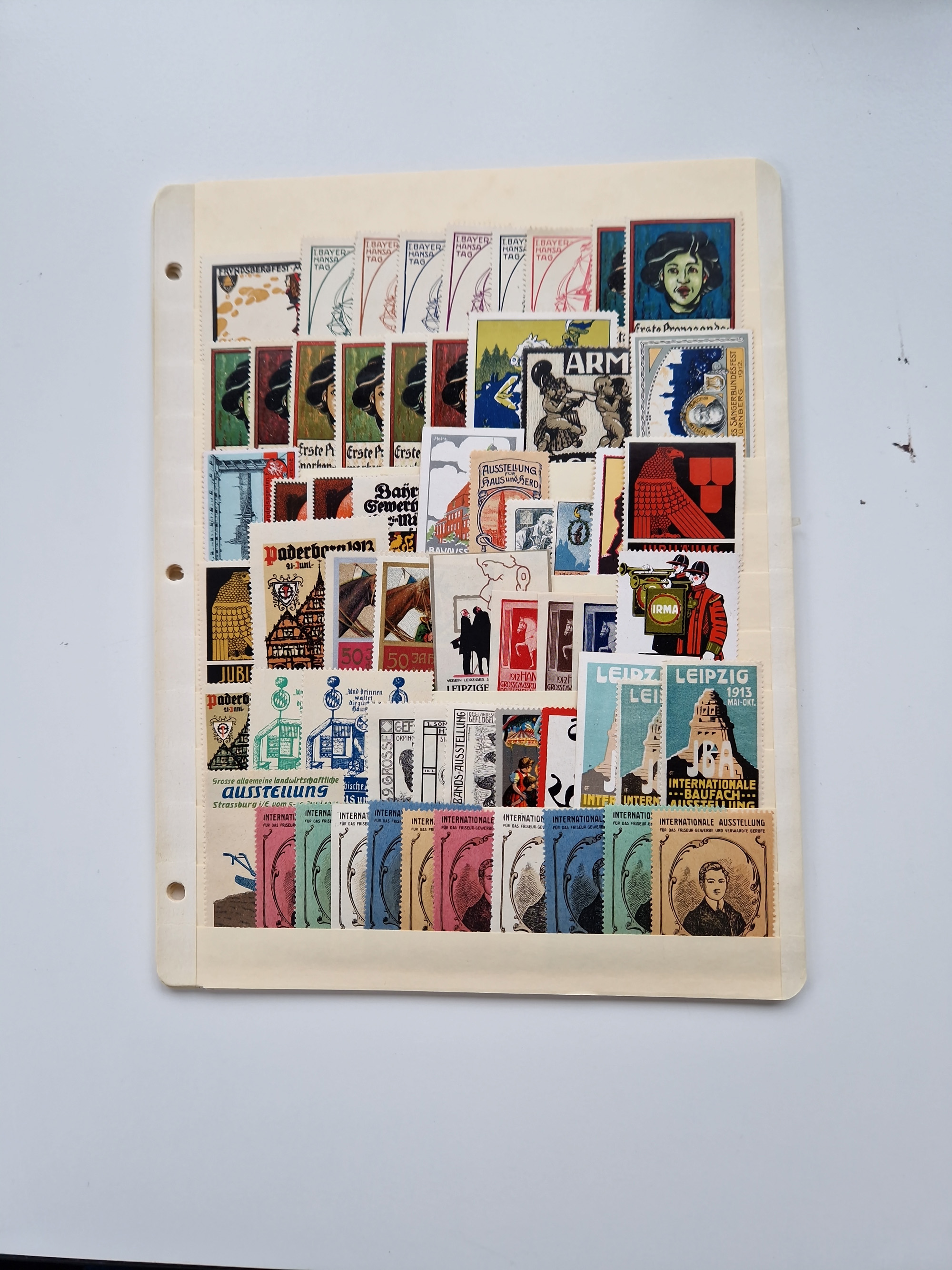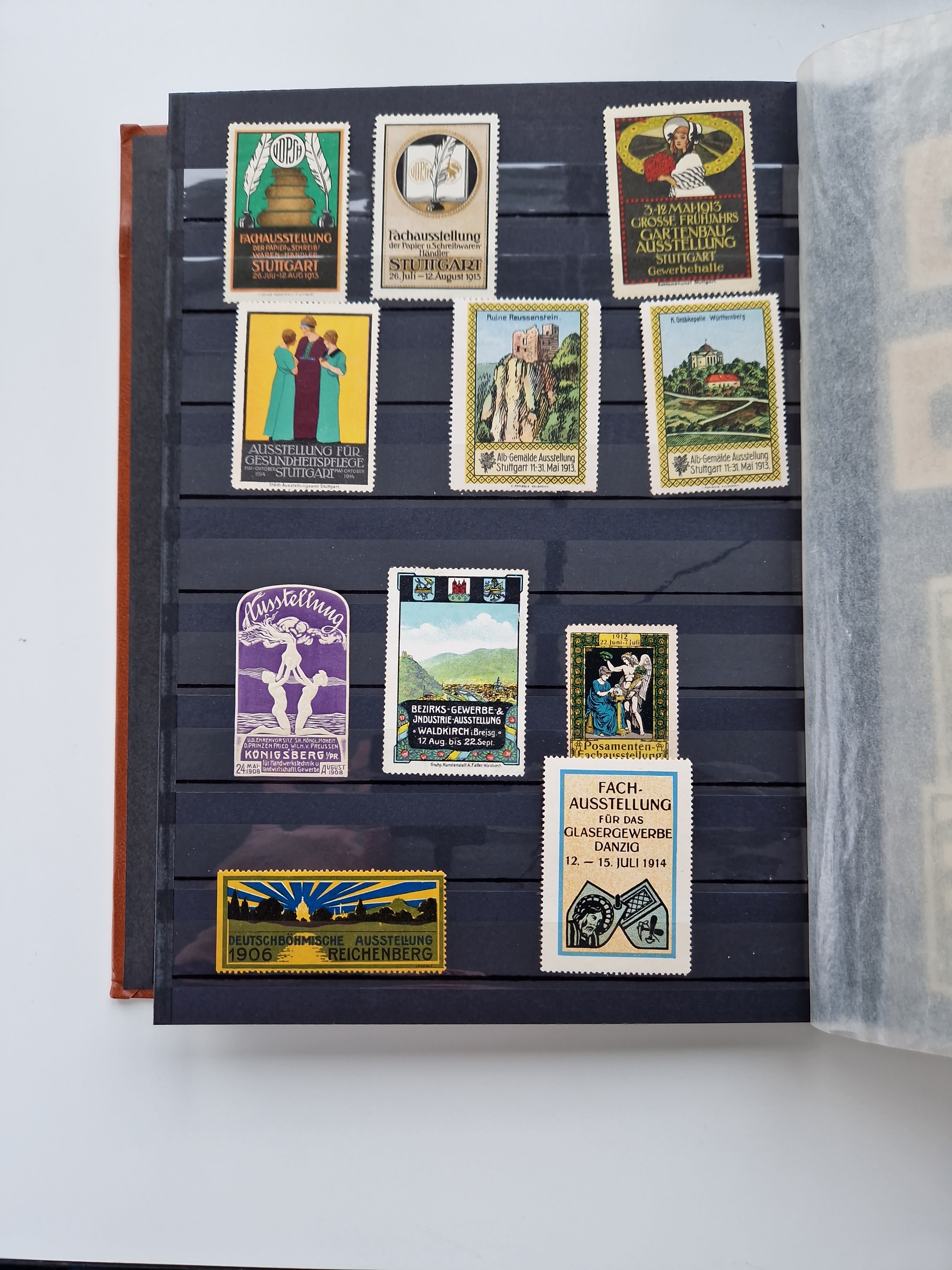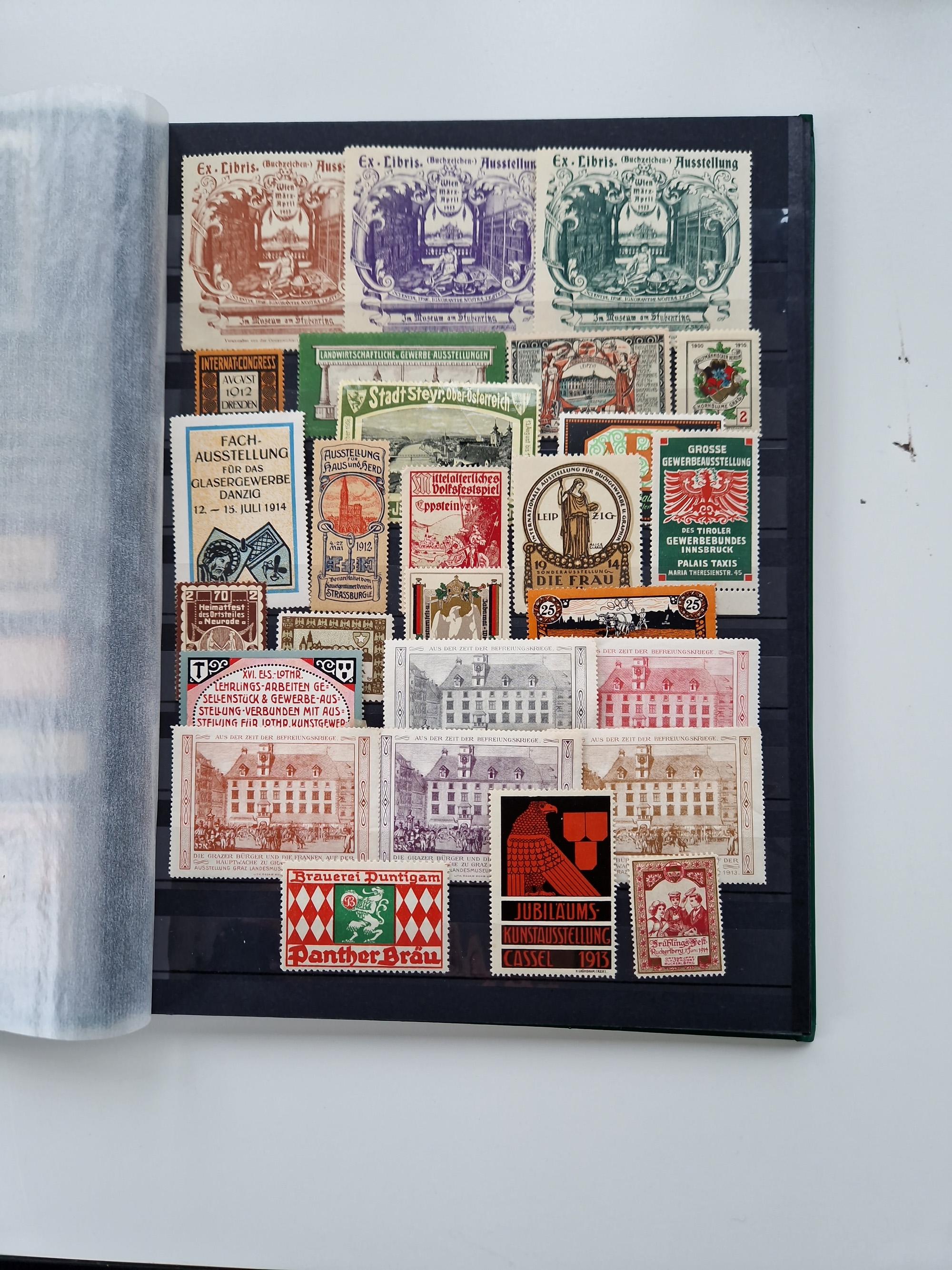 VIGNETTEN: 1896/1960 (ca.), hochinteressanter Bestand mit einigen Tausend Vignetten, Verschluss- und Siegelmarken, später Spendenvignetten und -Blocks, dabei viele zu unterschiedlichen Ausstellungen, meist aus Berlin, München, Nürnberg, Leipzig mit Export-Messe, ferner aber auch Luftpost-Ausstellung, Gewerbe- und Industrieschau, Landwirtschaft, Kunst, Firmenvignetten, etc., etwas zu Briefmarken-Ausstellungen, dabei auch drei Hessheimer Entwürfe, vieles auf amerikanischen Händlerkarten und Loskarten, in drei Kartons