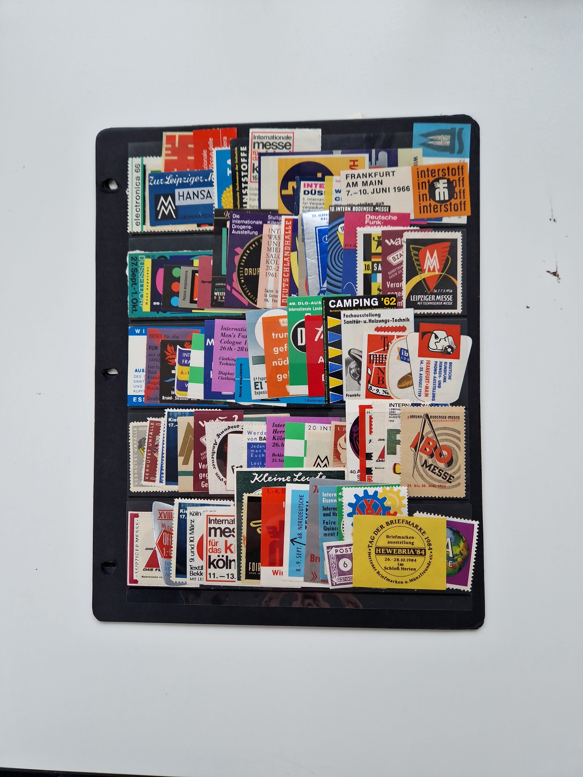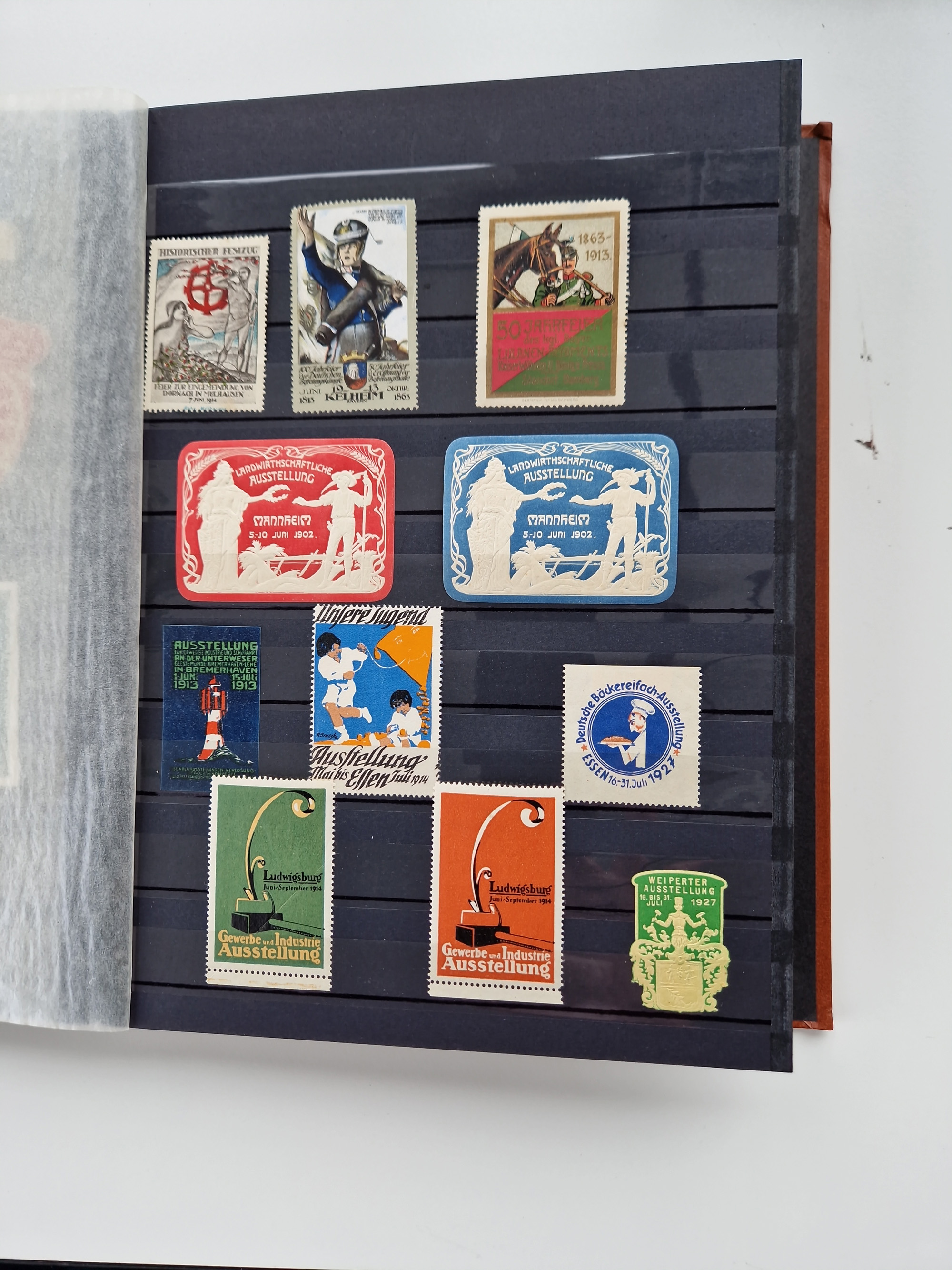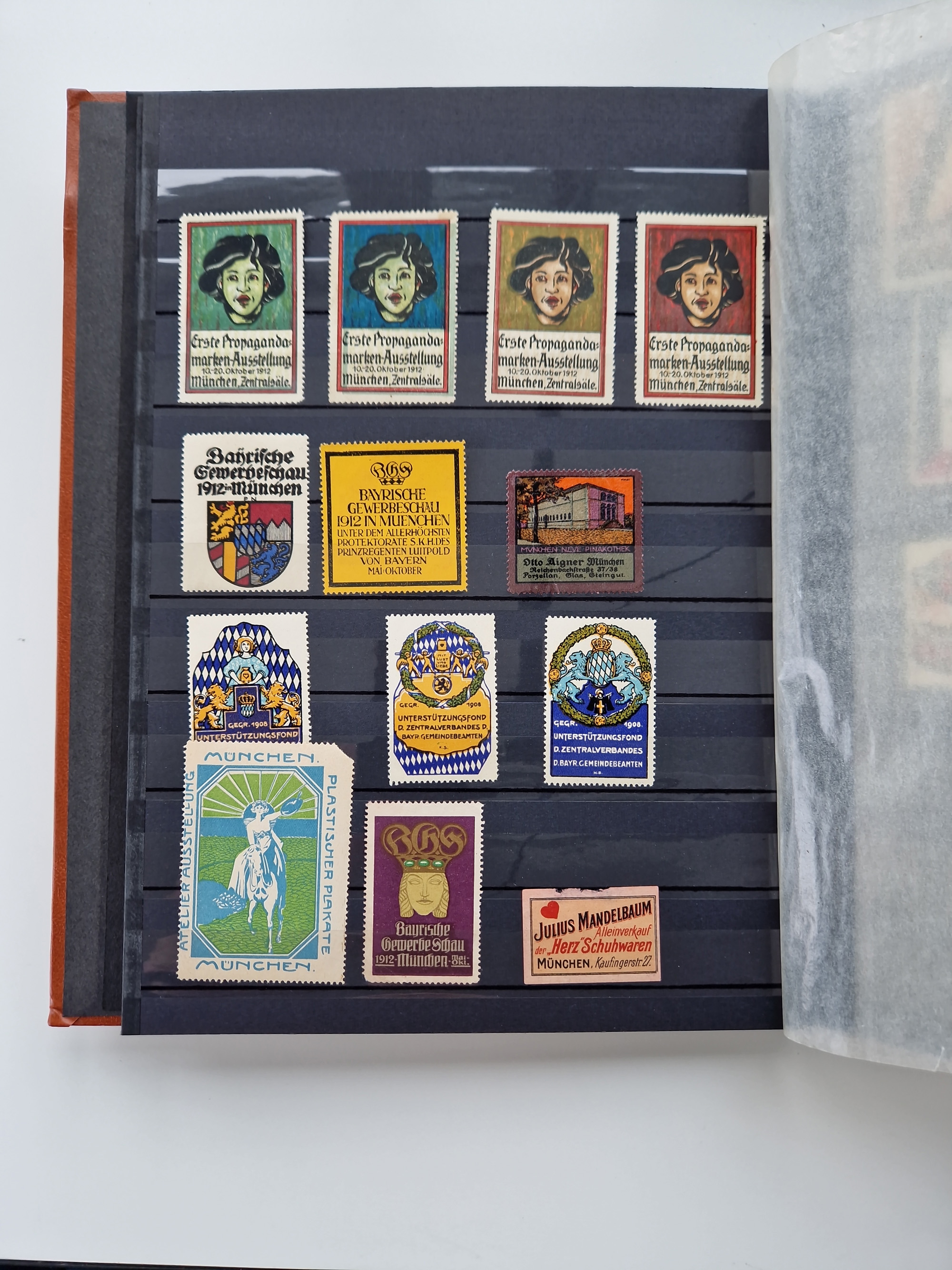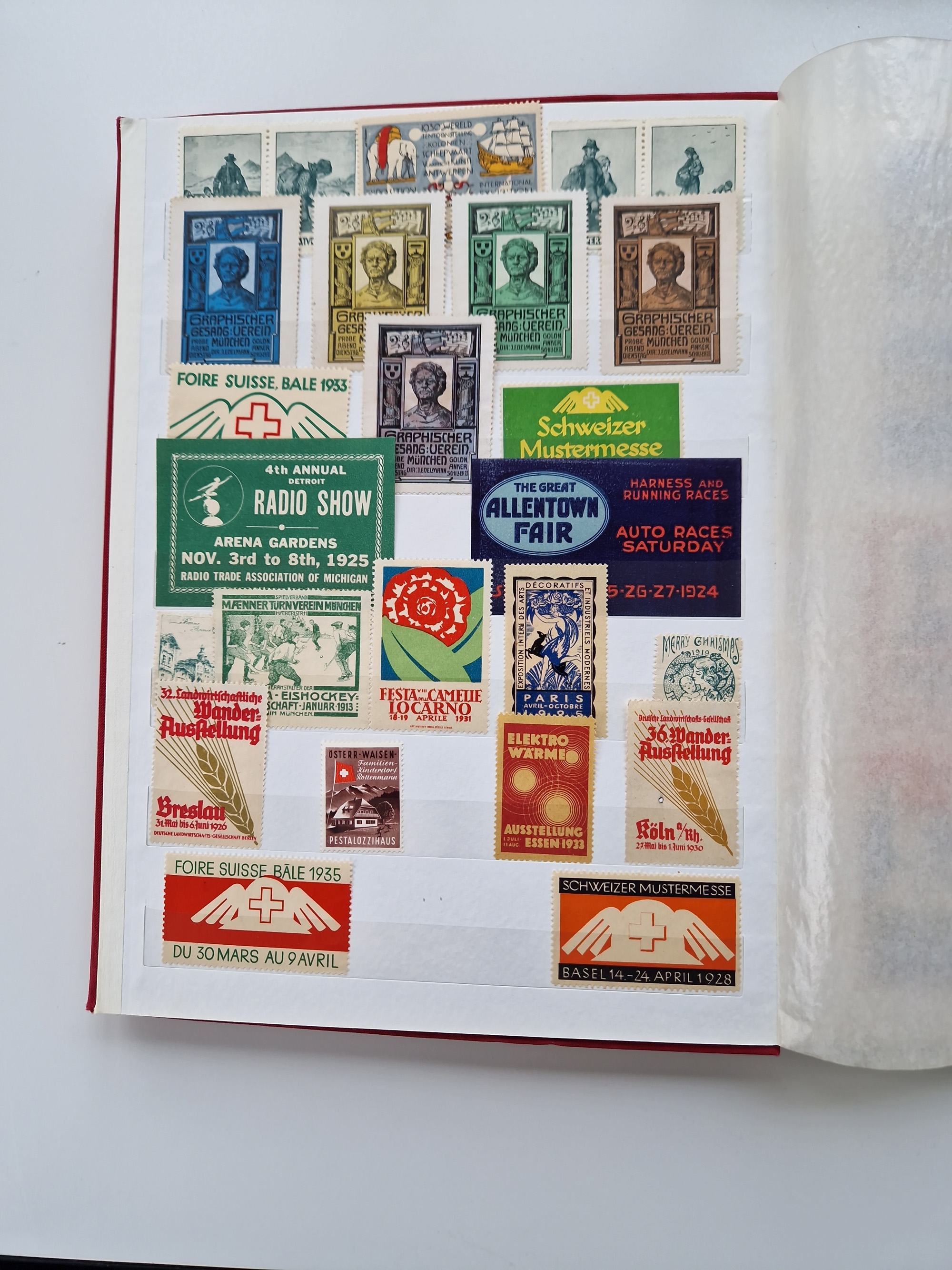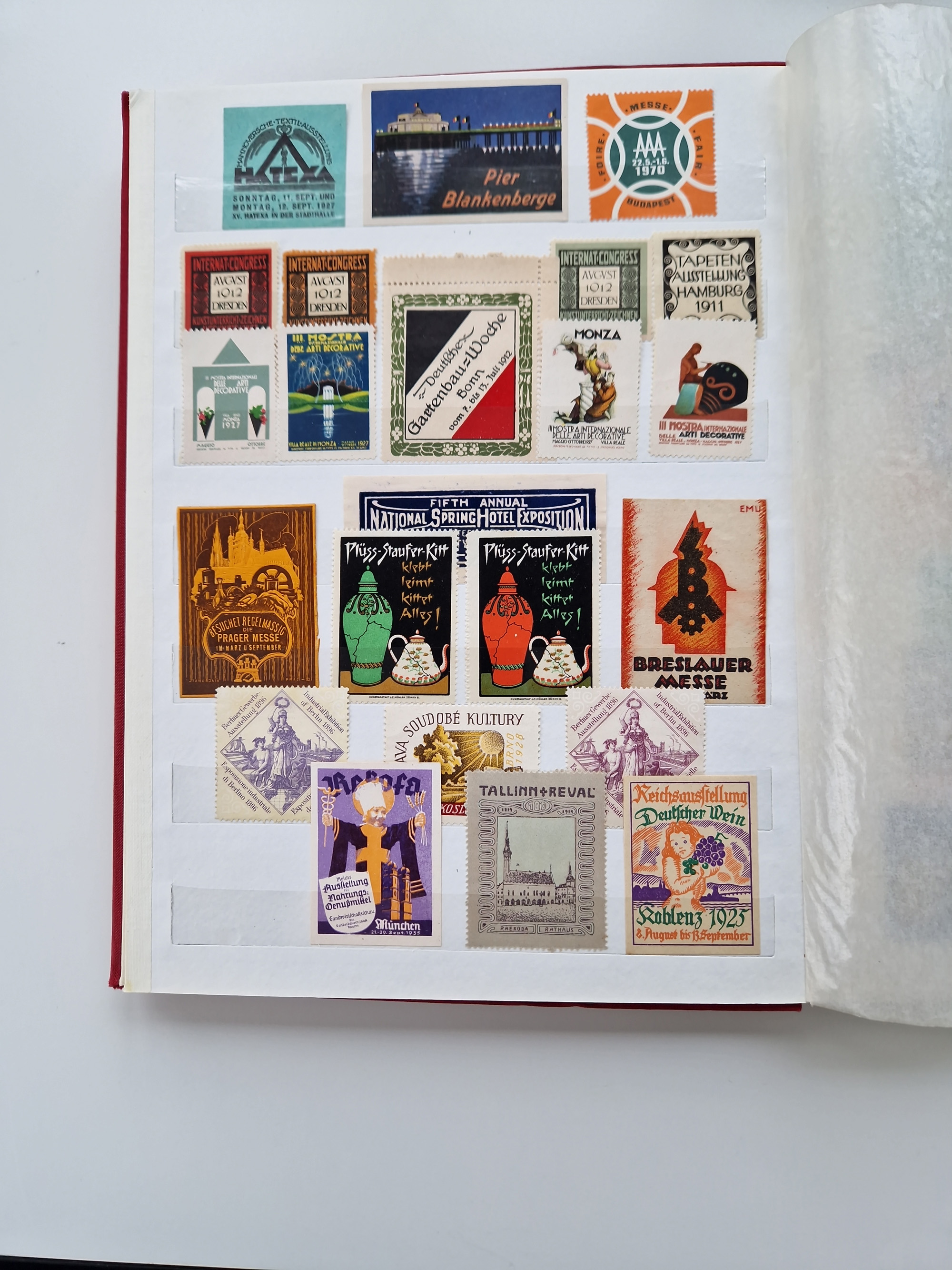 VIGNETTEN: 1896/1960 (ca.), hochinteressanter Bestand mit einigen Tausend Vignetten, Verschluss- und Siegelmarken, später Spendenvignetten und -Blocks, dabei viele zu unterschiedlichen Ausstellungen, meist aus Berlin, München, Nürnberg, Leipzig mit Export-Messe, ferner aber auch Luftpost-Ausstellung, Gewerbe- und Industrieschau, Landwirtschaft, Kunst, Firmenvignetten, etc., etwas zu Briefmarken-Ausstellungen, dabei auch drei Hessheimer Entwürfe, vieles auf amerikanischen Händlerkarten und Loskarten, in drei Kartons