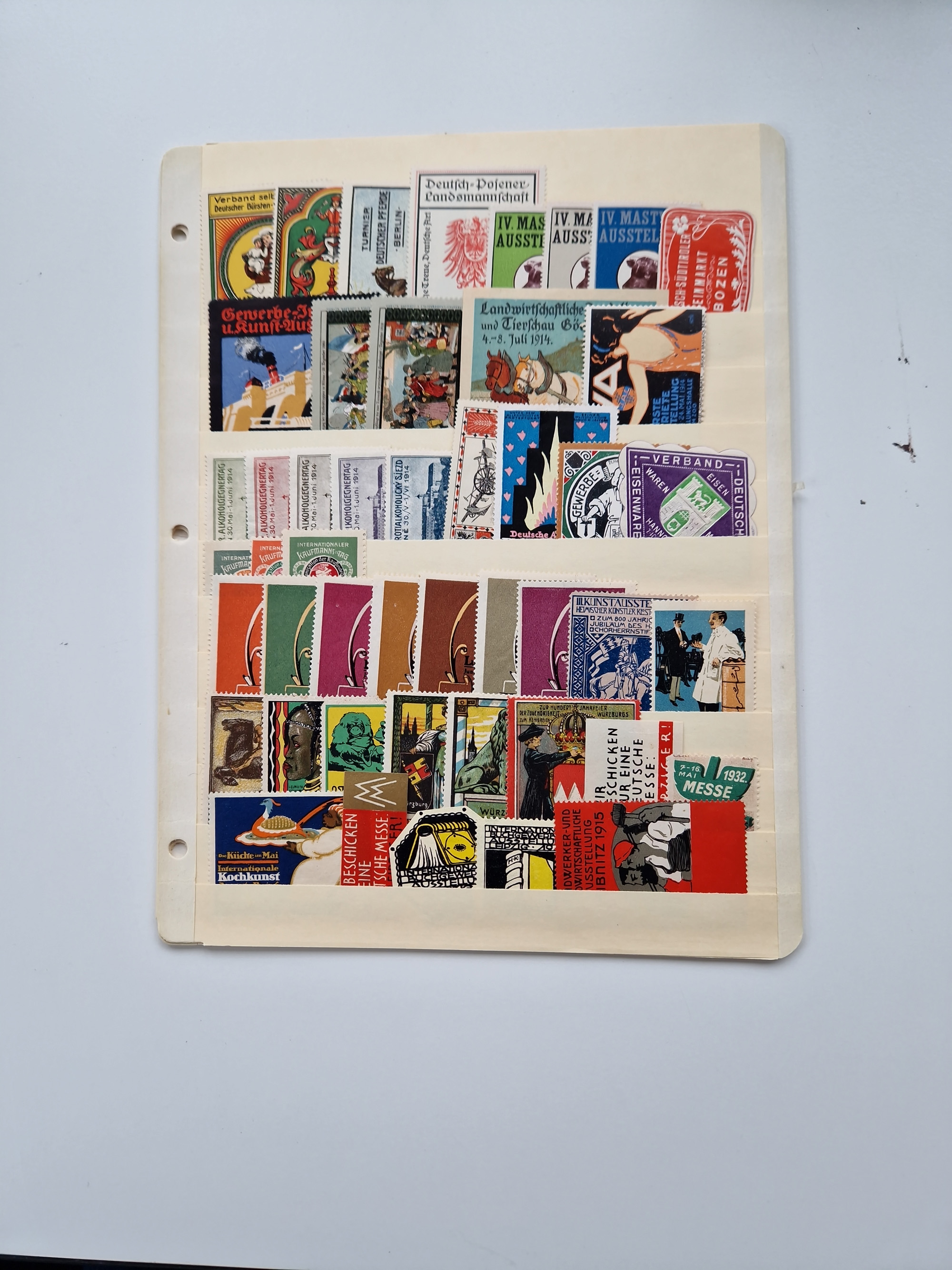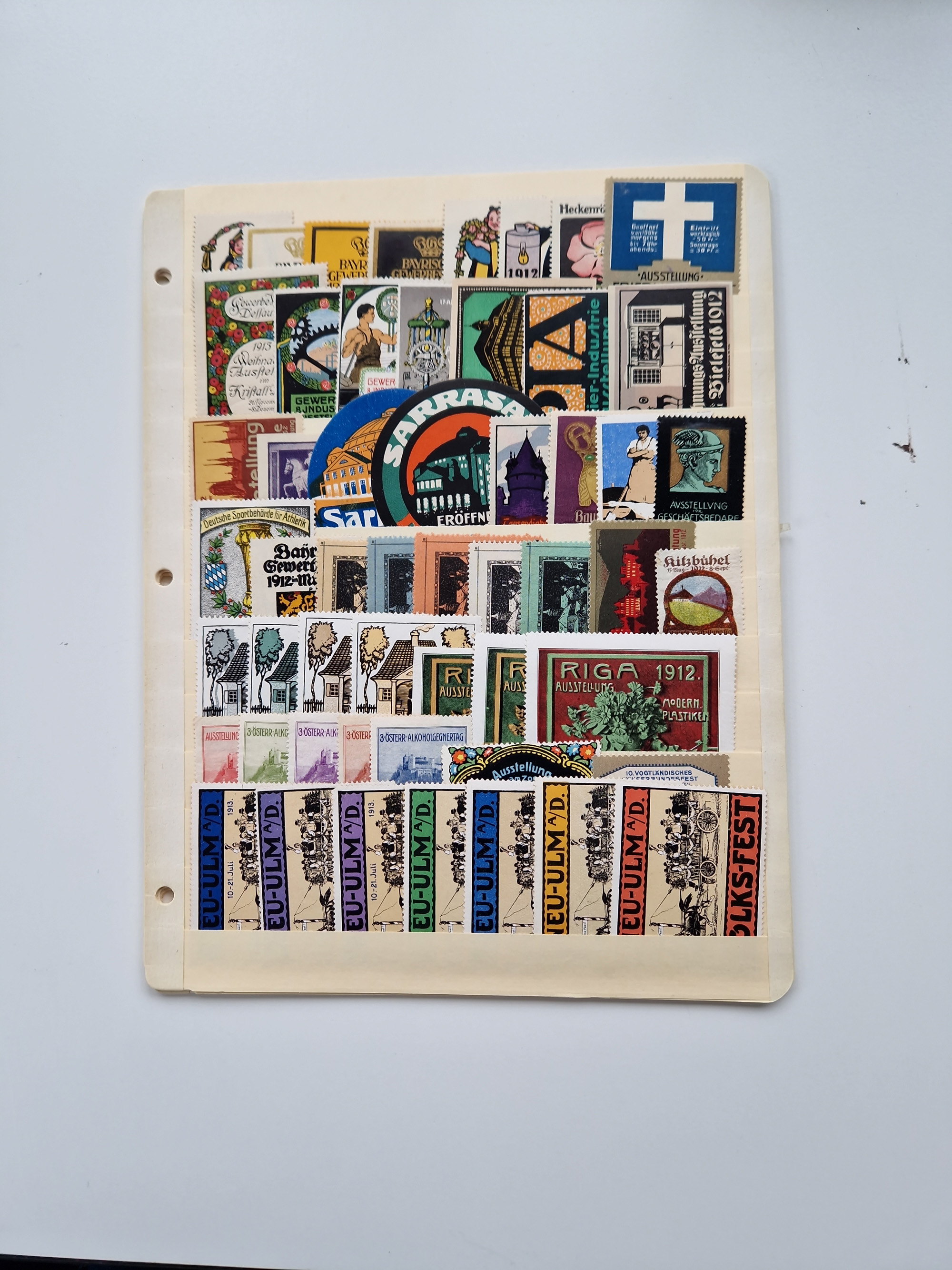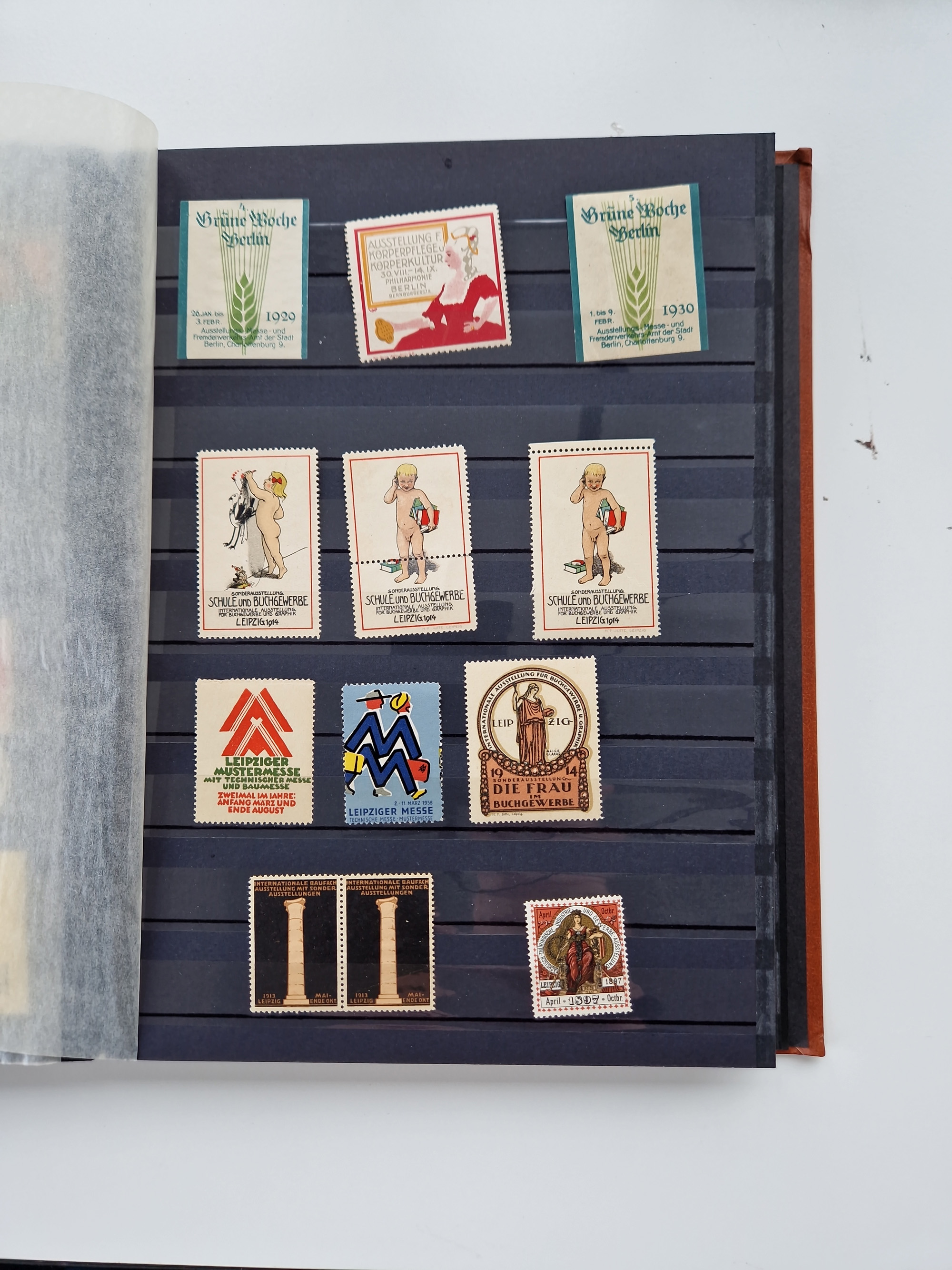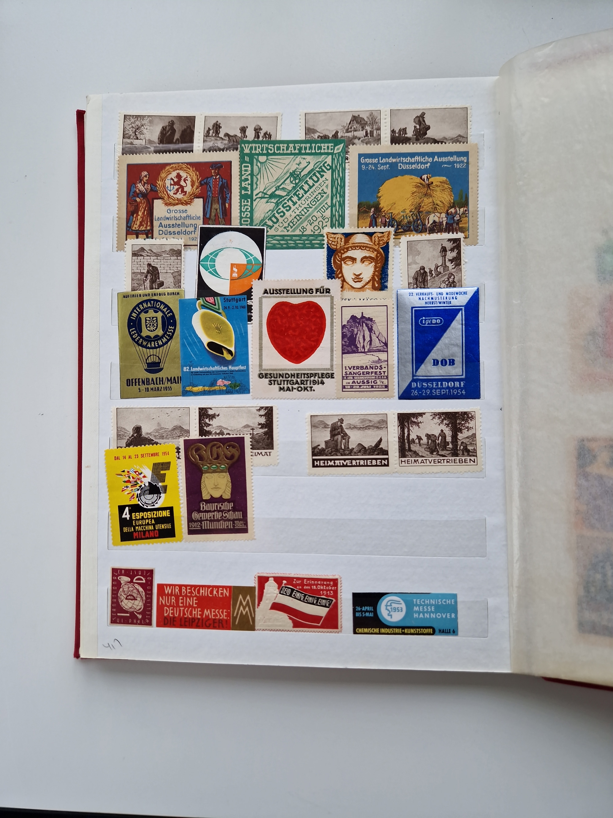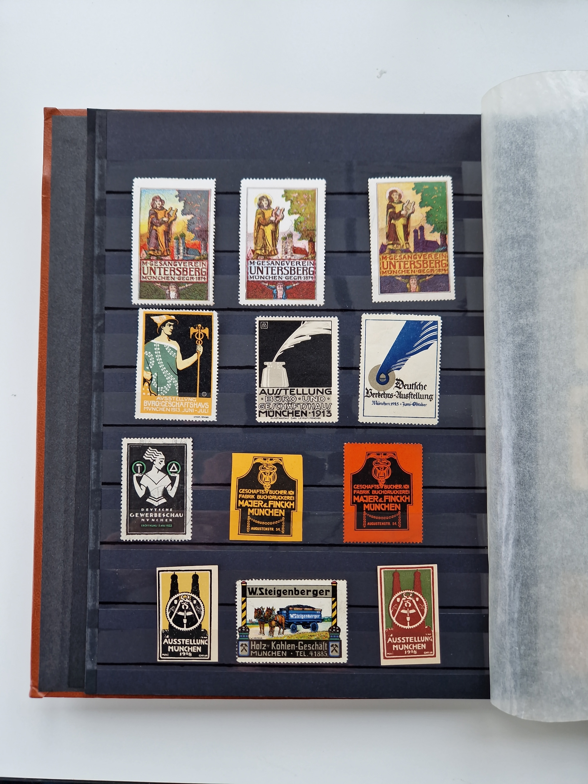 VIGNETTEN: 1896/1960 (ca.), hochinteressanter Bestand mit einigen Tausend Vignetten, Verschluss- und Siegelmarken, später Spendenvignetten und -Blocks, dabei viele zu unterschiedlichen Ausstellungen, meist aus Berlin, München, Nürnberg, Leipzig mit Export-Messe, ferner aber auch Luftpost-Ausstellung, Gewerbe- und Industrieschau, Landwirtschaft, Kunst, Firmenvignetten, etc., etwas zu Briefmarken-Ausstellungen, dabei auch drei Hessheimer Entwürfe, vieles auf amerikanischen Händlerkarten und Loskarten, in drei Kartons