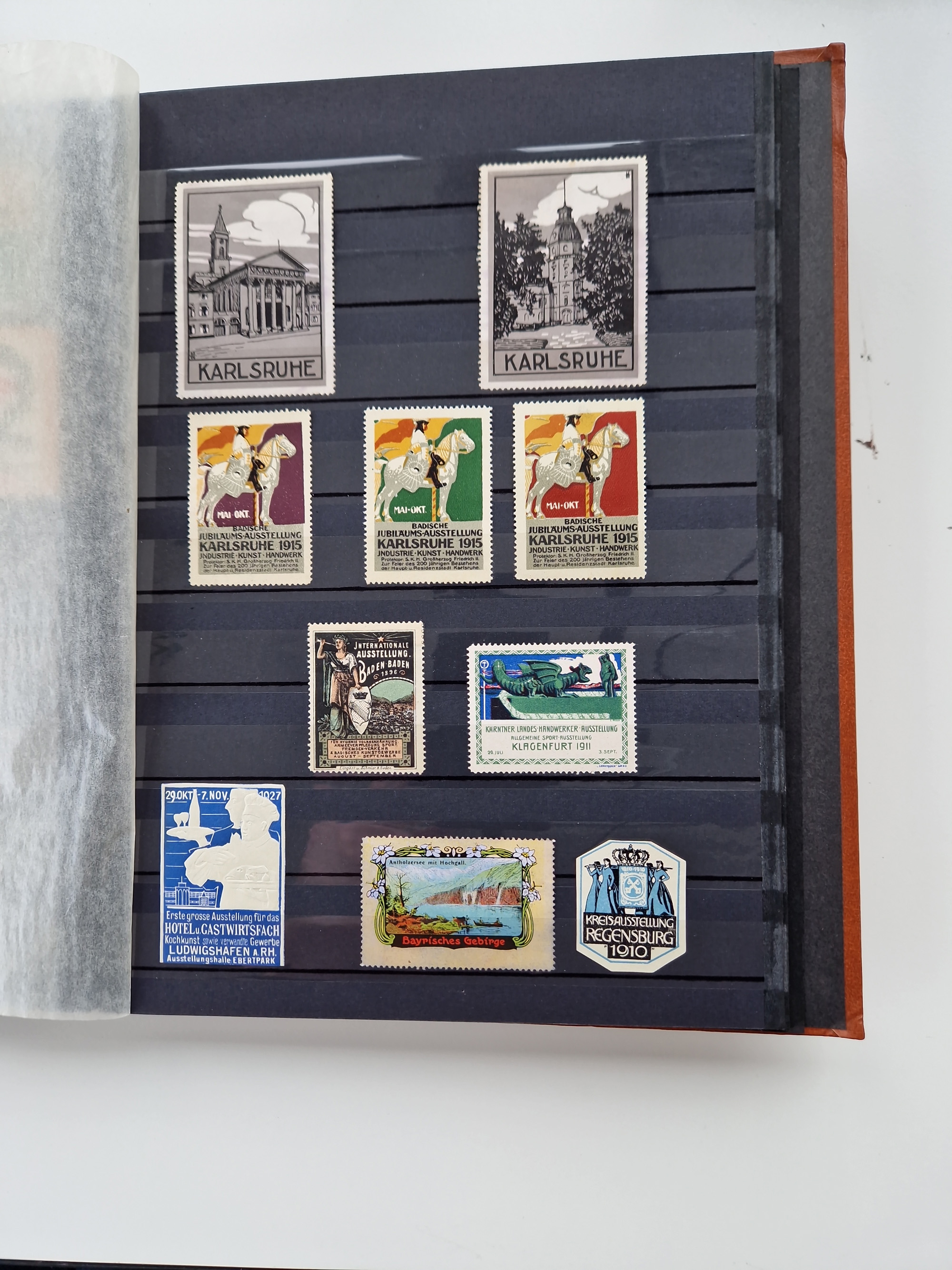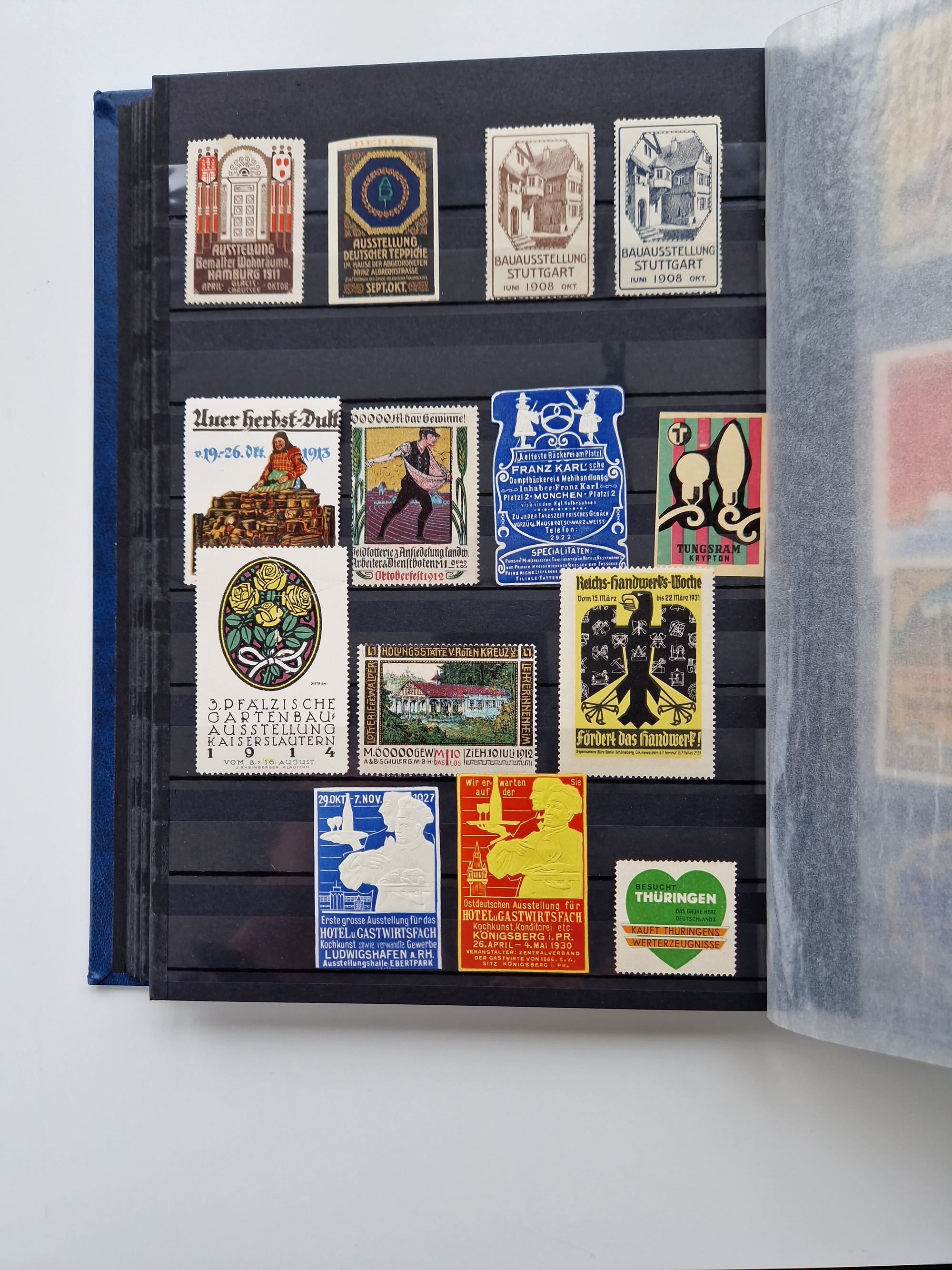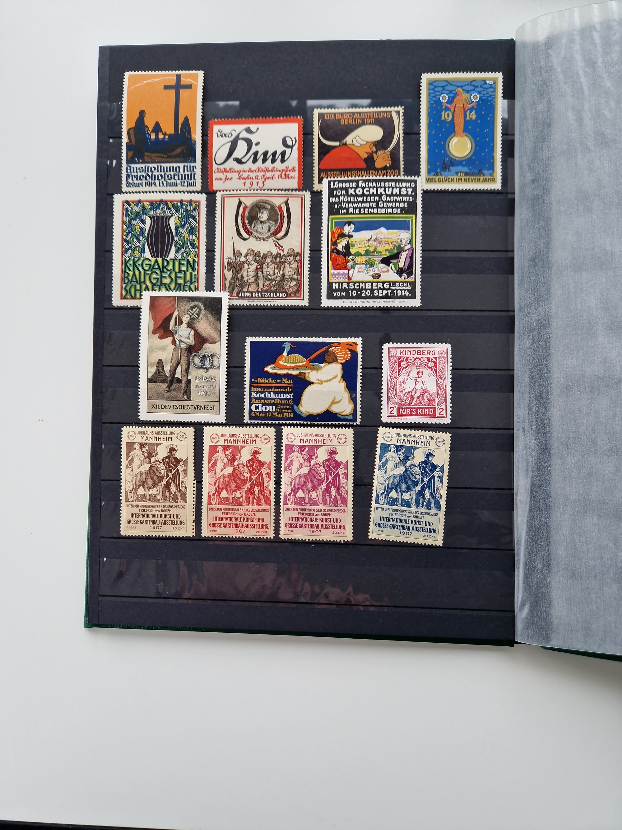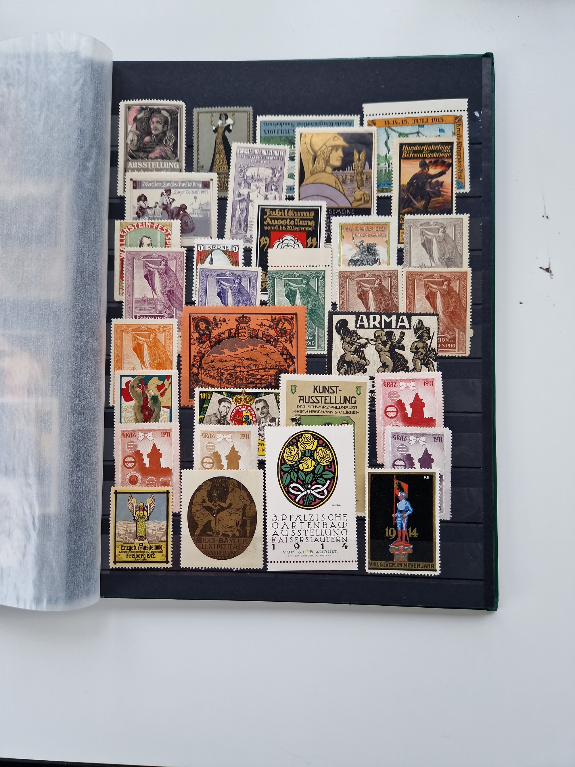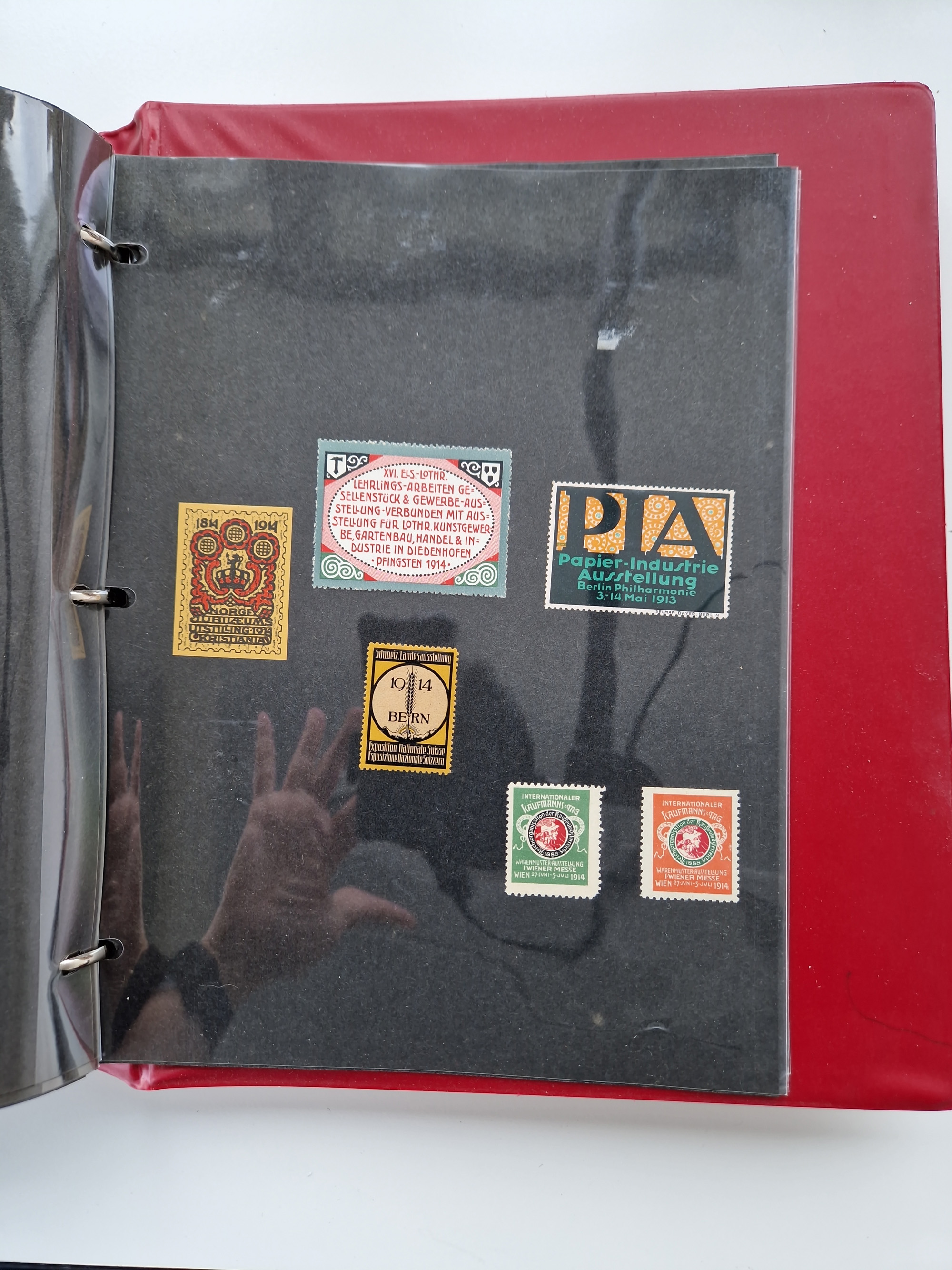 VIGNETTEN: 1896/1960 (ca.), hochinteressanter Bestand mit einigen Tausend Vignetten, Verschluss- und Siegelmarken, später Spendenvignetten und -Blocks, dabei viele zu unterschiedlichen Ausstellungen, meist aus Berlin, München, Nürnberg, Leipzig mit Export-Messe, ferner aber auch Luftpost-Ausstellung, Gewerbe- und Industrieschau, Landwirtschaft, Kunst, Firmenvignetten, etc., etwas zu Briefmarken-Ausstellungen, dabei auch drei Hessheimer Entwürfe, vieles auf amerikanischen Händlerkarten und Loskarten, in drei Kartons