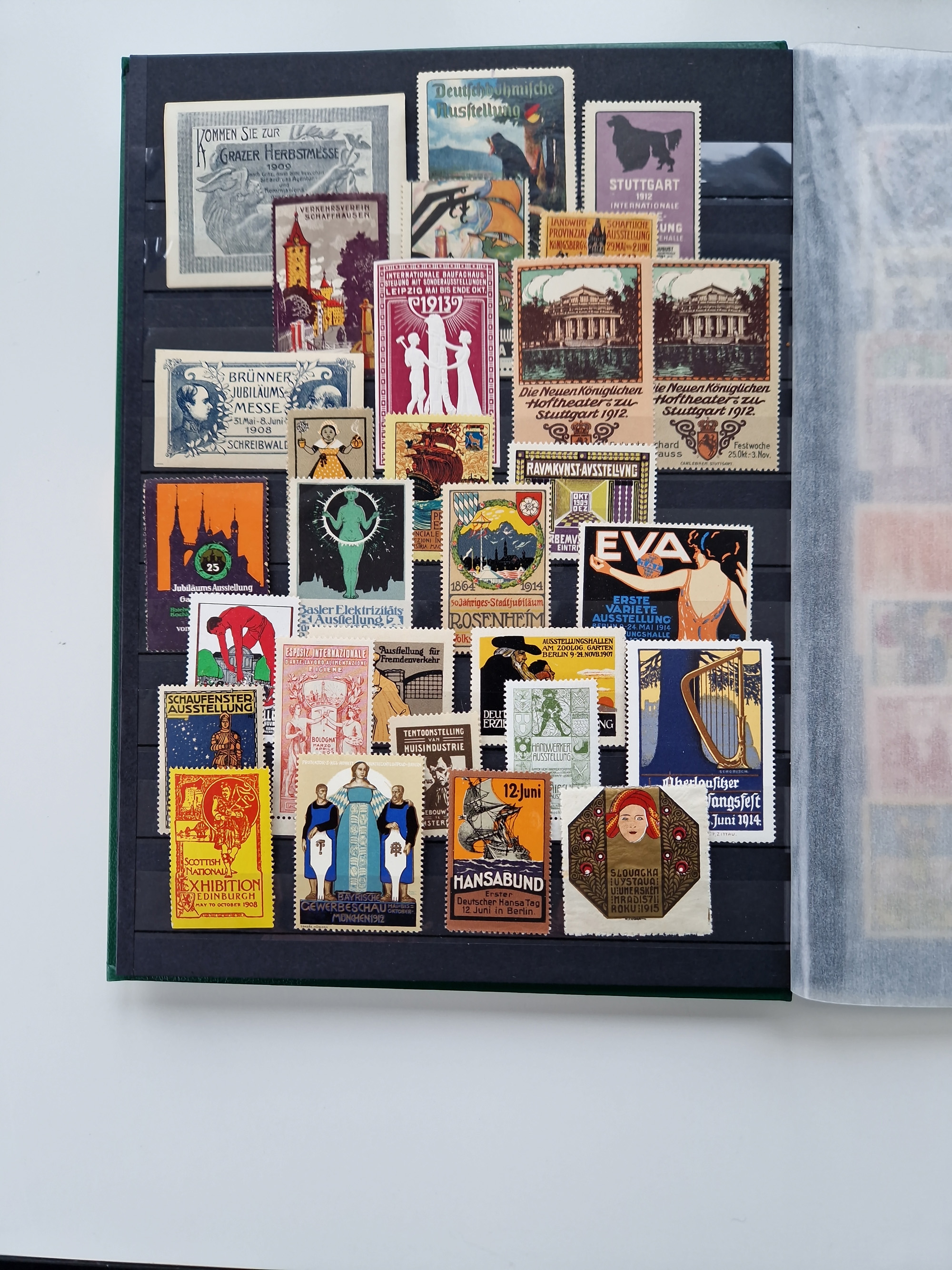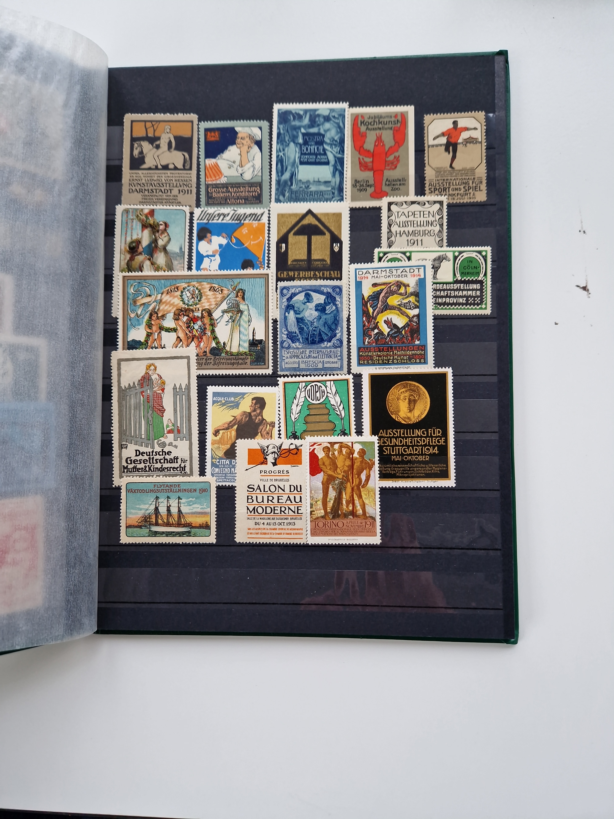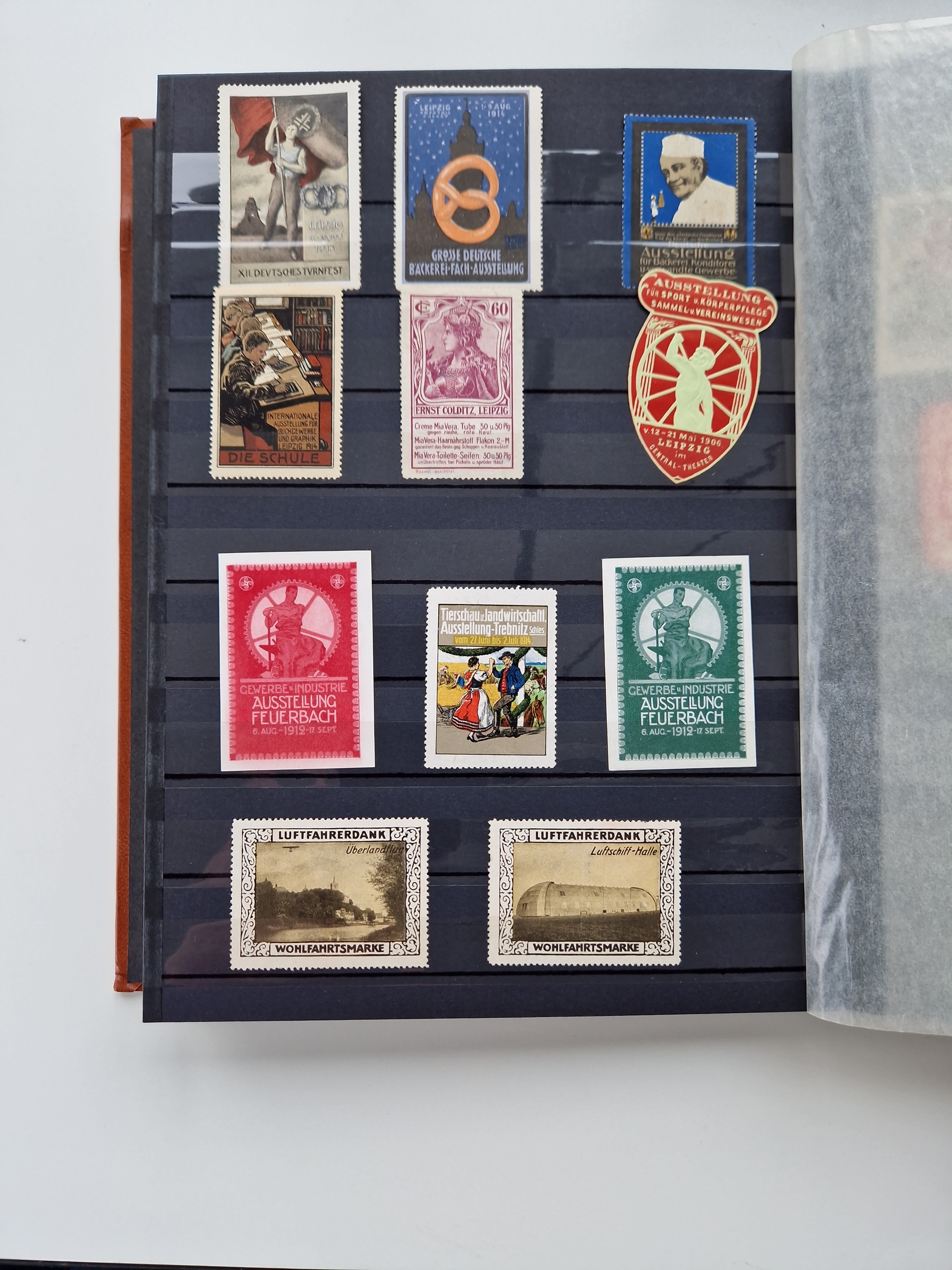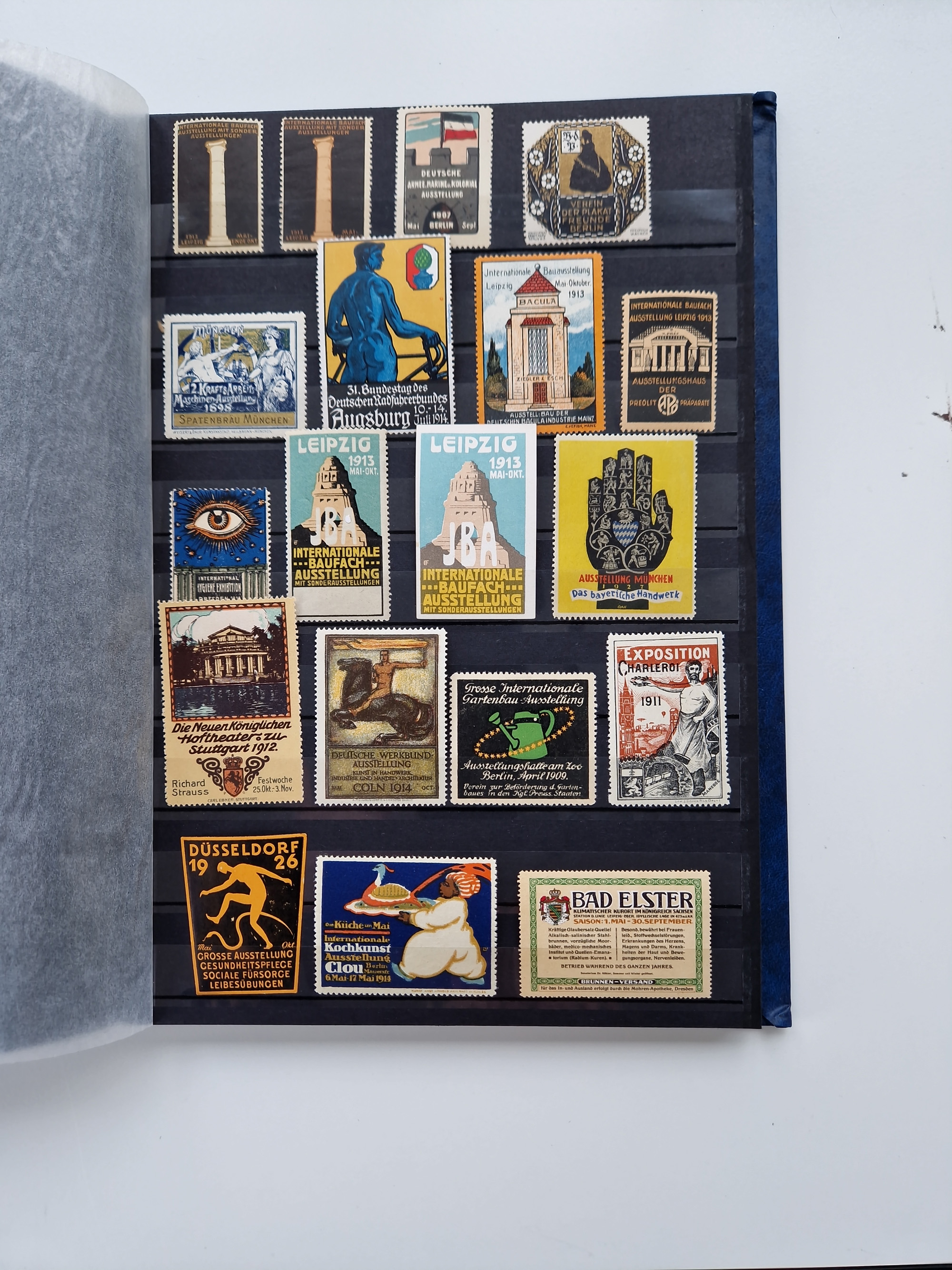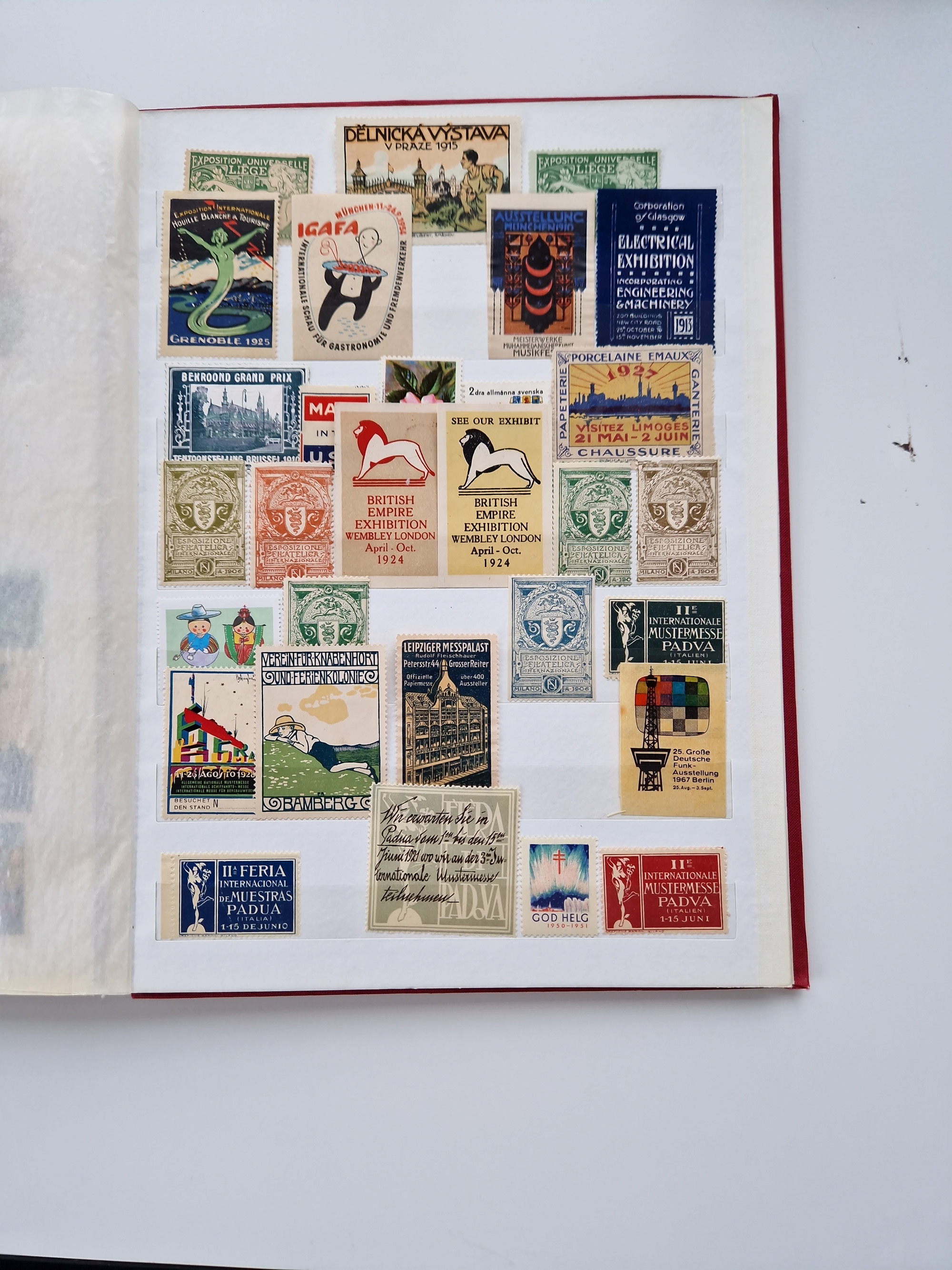 VIGNETTEN: 1896/1960 (ca.), hochinteressanter Bestand mit einigen Tausend Vignetten, Verschluss- und Siegelmarken, später Spendenvignetten und -Blocks, dabei viele zu unterschiedlichen Ausstellungen, meist aus Berlin, München, Nürnberg, Leipzig mit Export-Messe, ferner aber auch Luftpost-Ausstellung, Gewerbe- und Industrieschau, Landwirtschaft, Kunst, Firmenvignetten, etc., etwas zu Briefmarken-Ausstellungen, dabei auch drei Hessheimer Entwürfe, vieles auf amerikanischen Händlerkarten und Loskarten, in drei Kartons