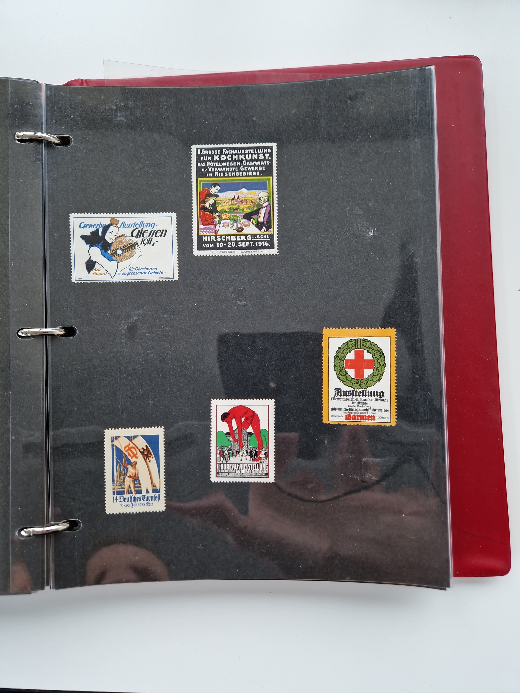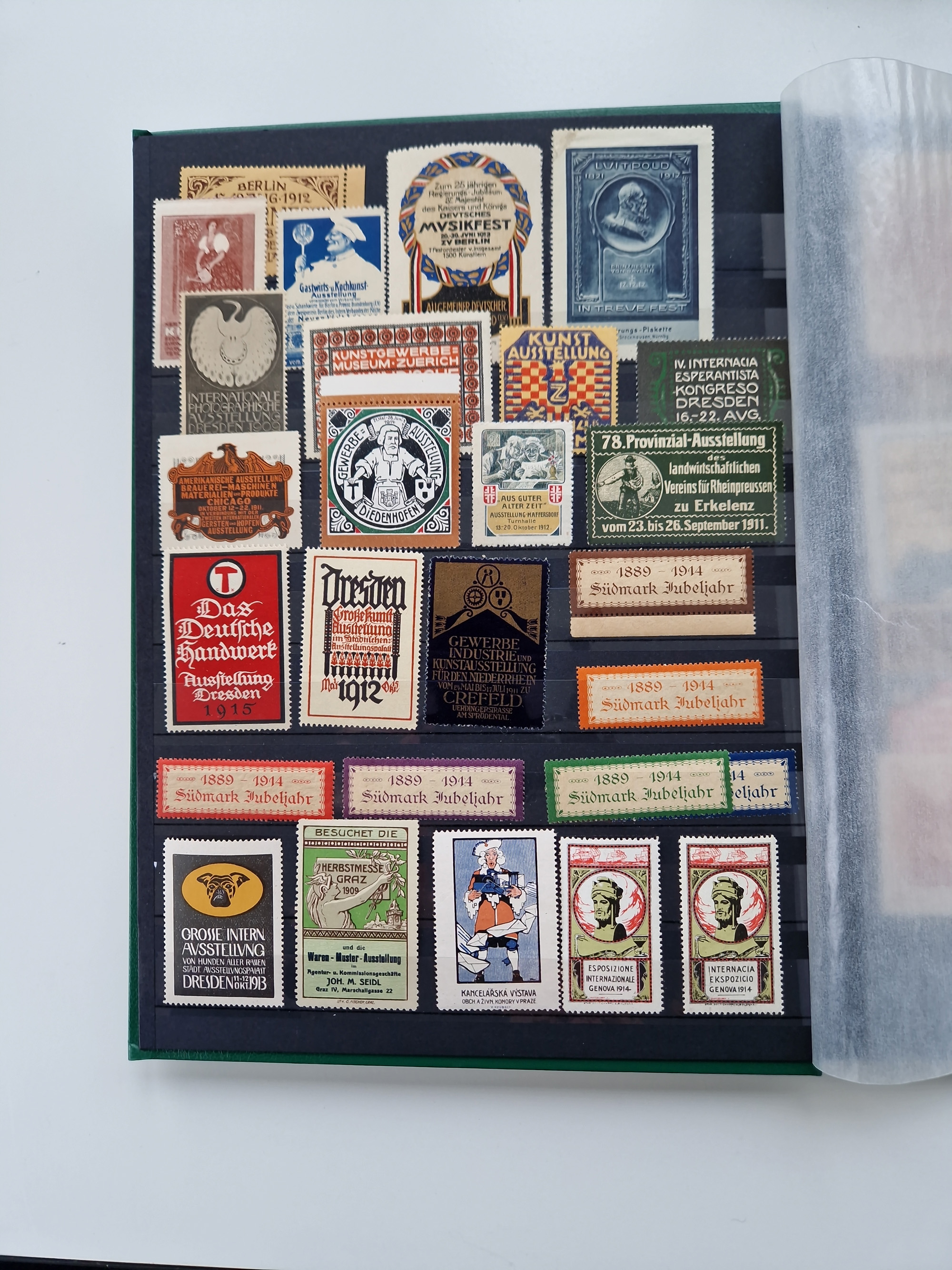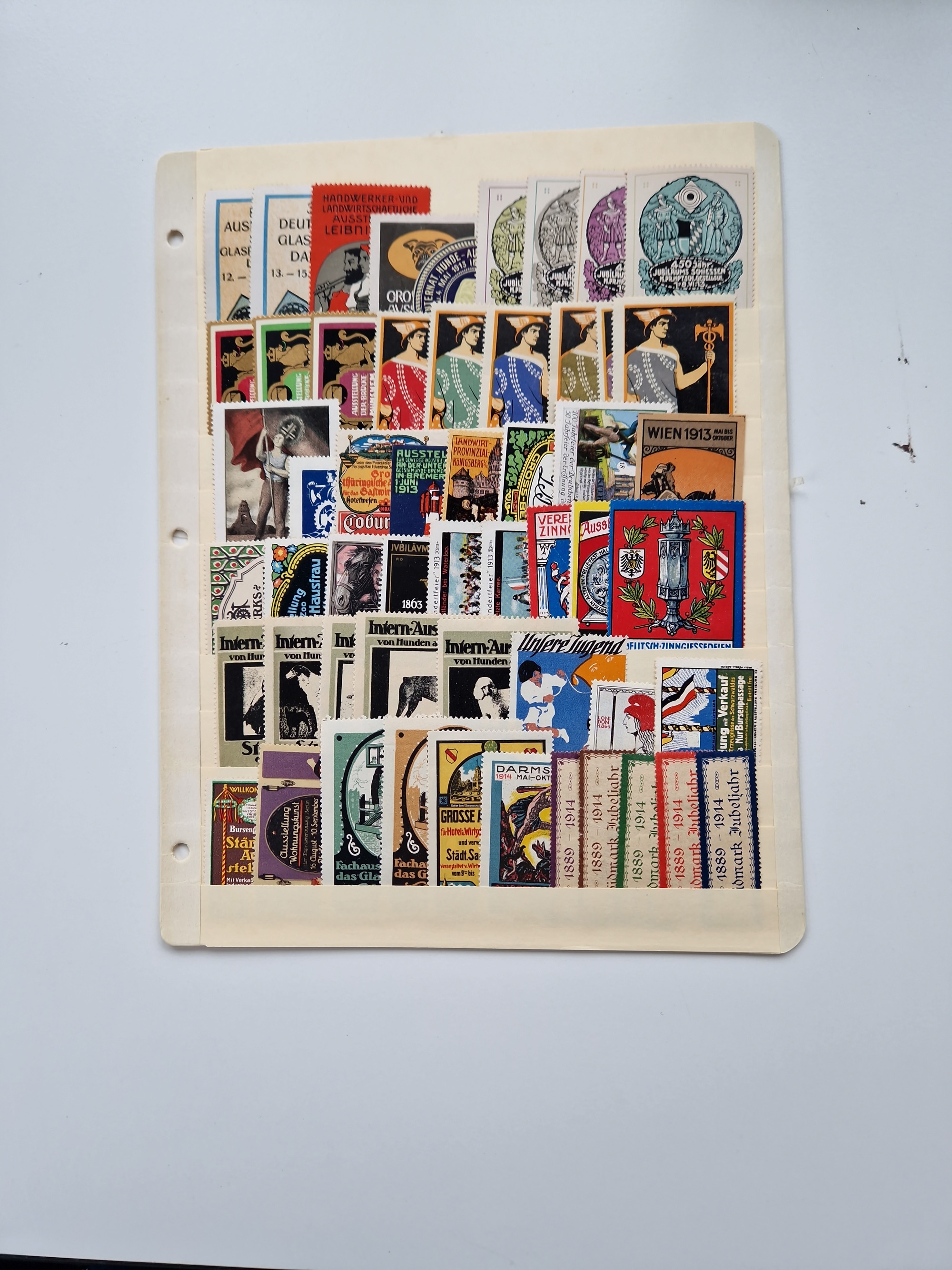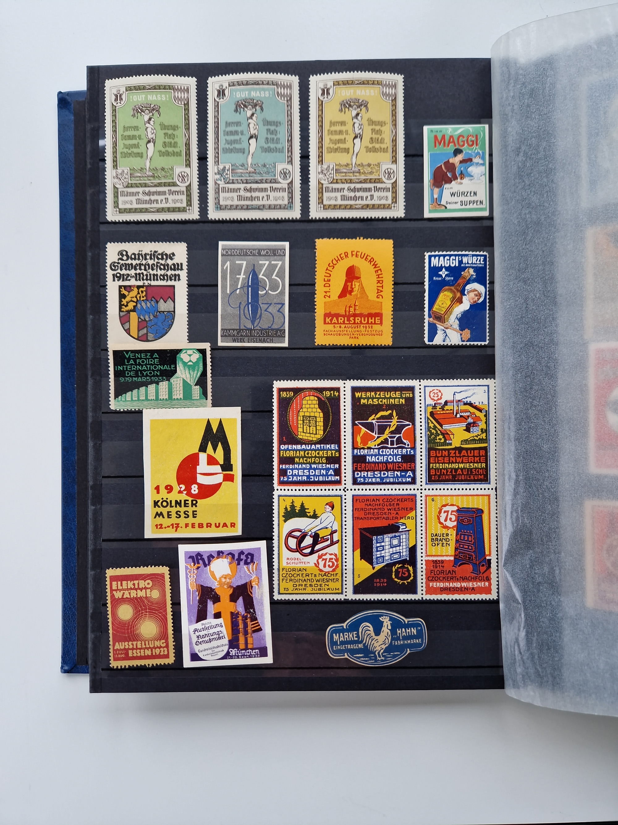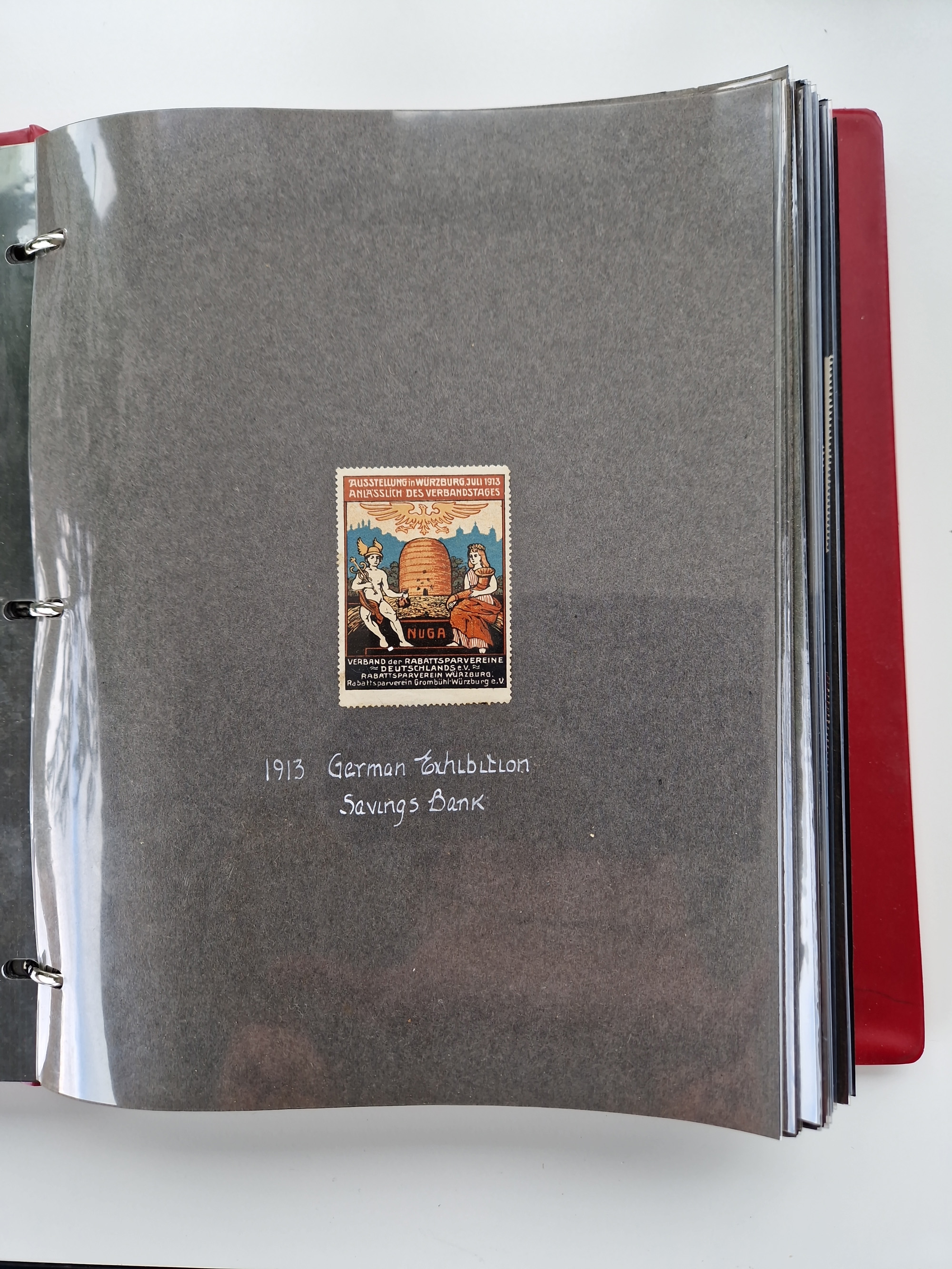 VIGNETTEN: 1896/1960 (ca.), hochinteressanter Bestand mit einigen Tausend Vignetten, Verschluss- und Siegelmarken, später Spendenvignetten und -Blocks, dabei viele zu unterschiedlichen Ausstellungen, meist aus Berlin, München, Nürnberg, Leipzig mit Export-Messe, ferner aber auch Luftpost-Ausstellung, Gewerbe- und Industrieschau, Landwirtschaft, Kunst, Firmenvignetten, etc., etwas zu Briefmarken-Ausstellungen, dabei auch drei Hessheimer Entwürfe, vieles auf amerikanischen Händlerkarten und Loskarten, in drei Kartons