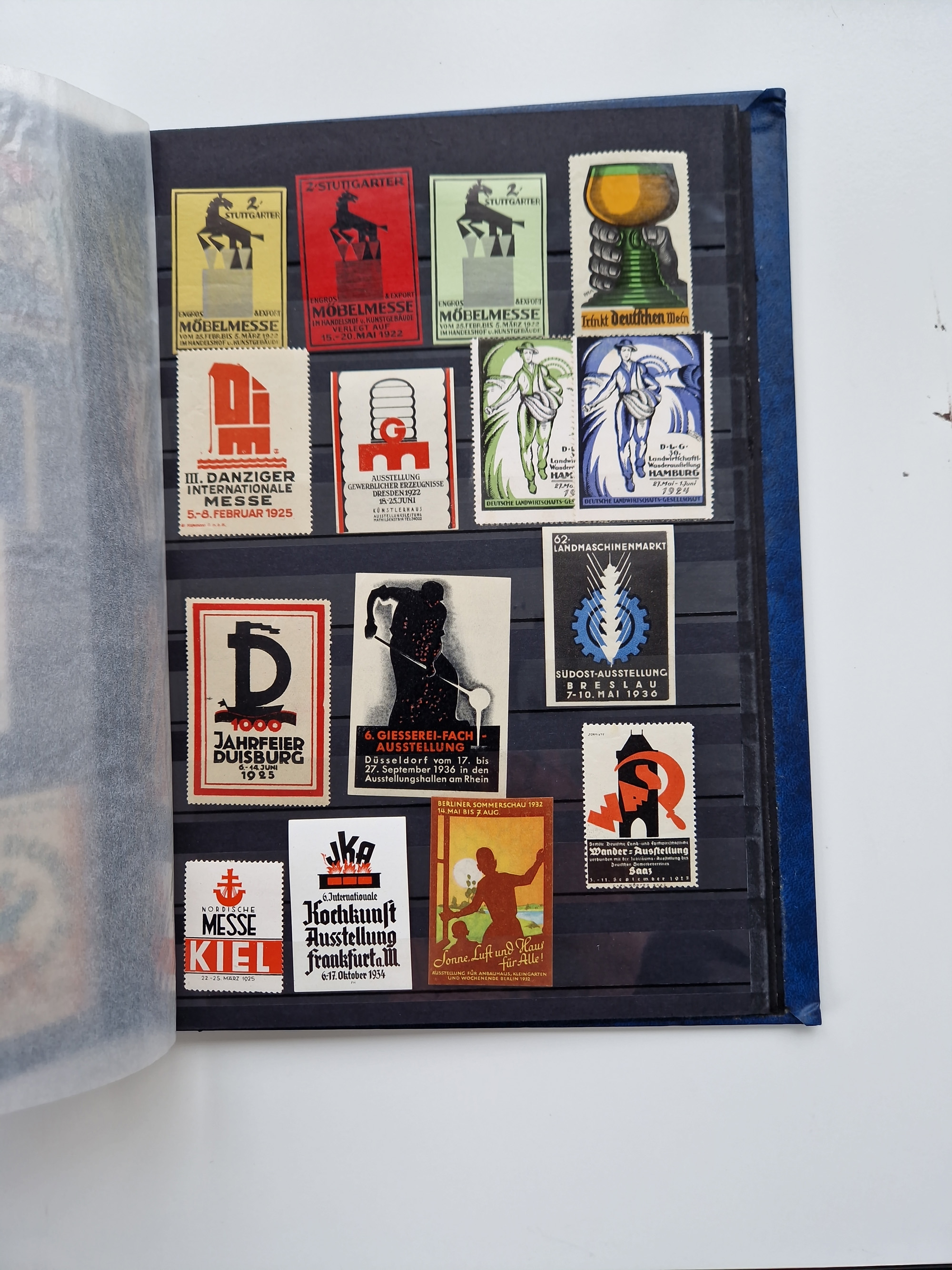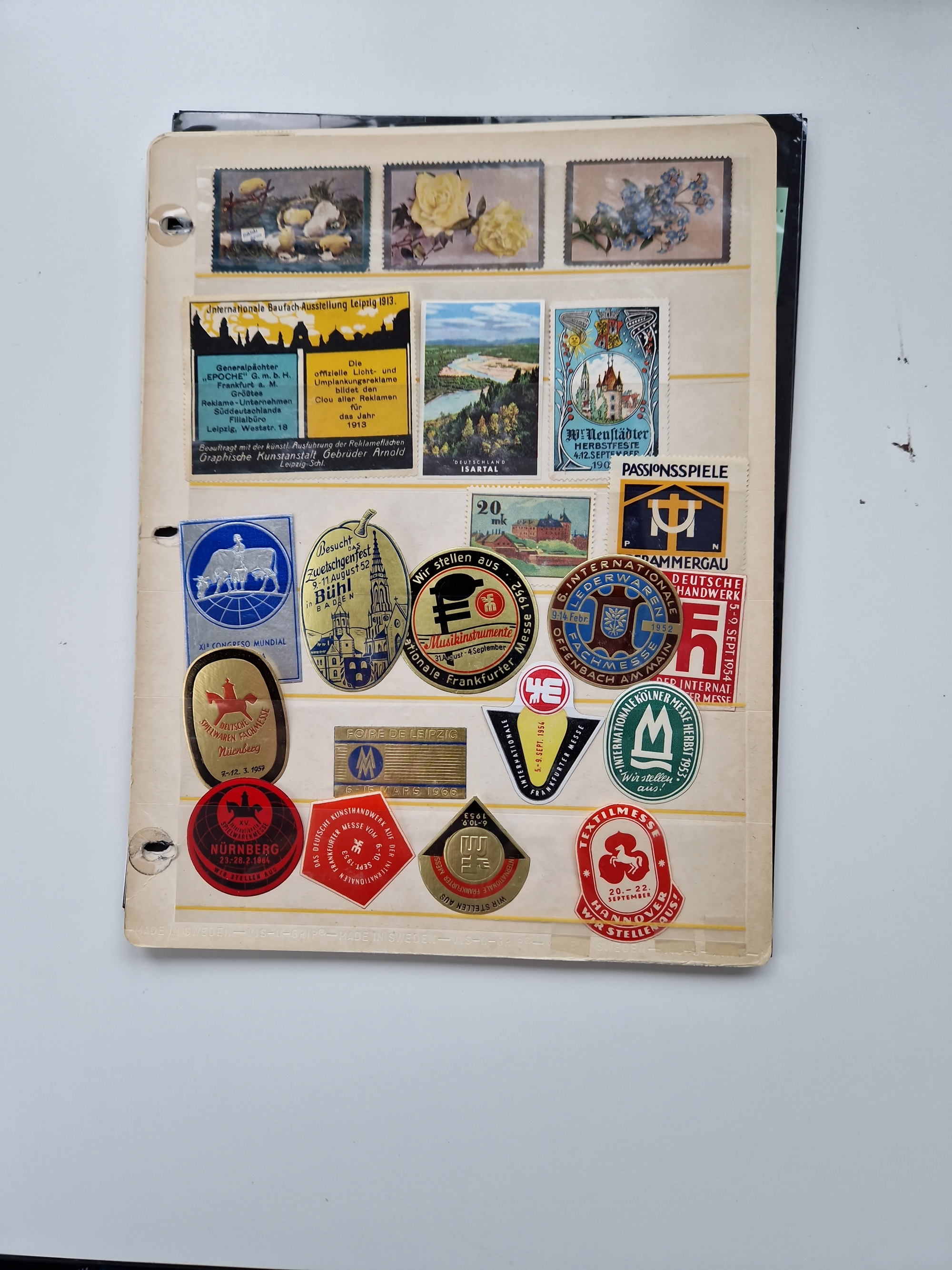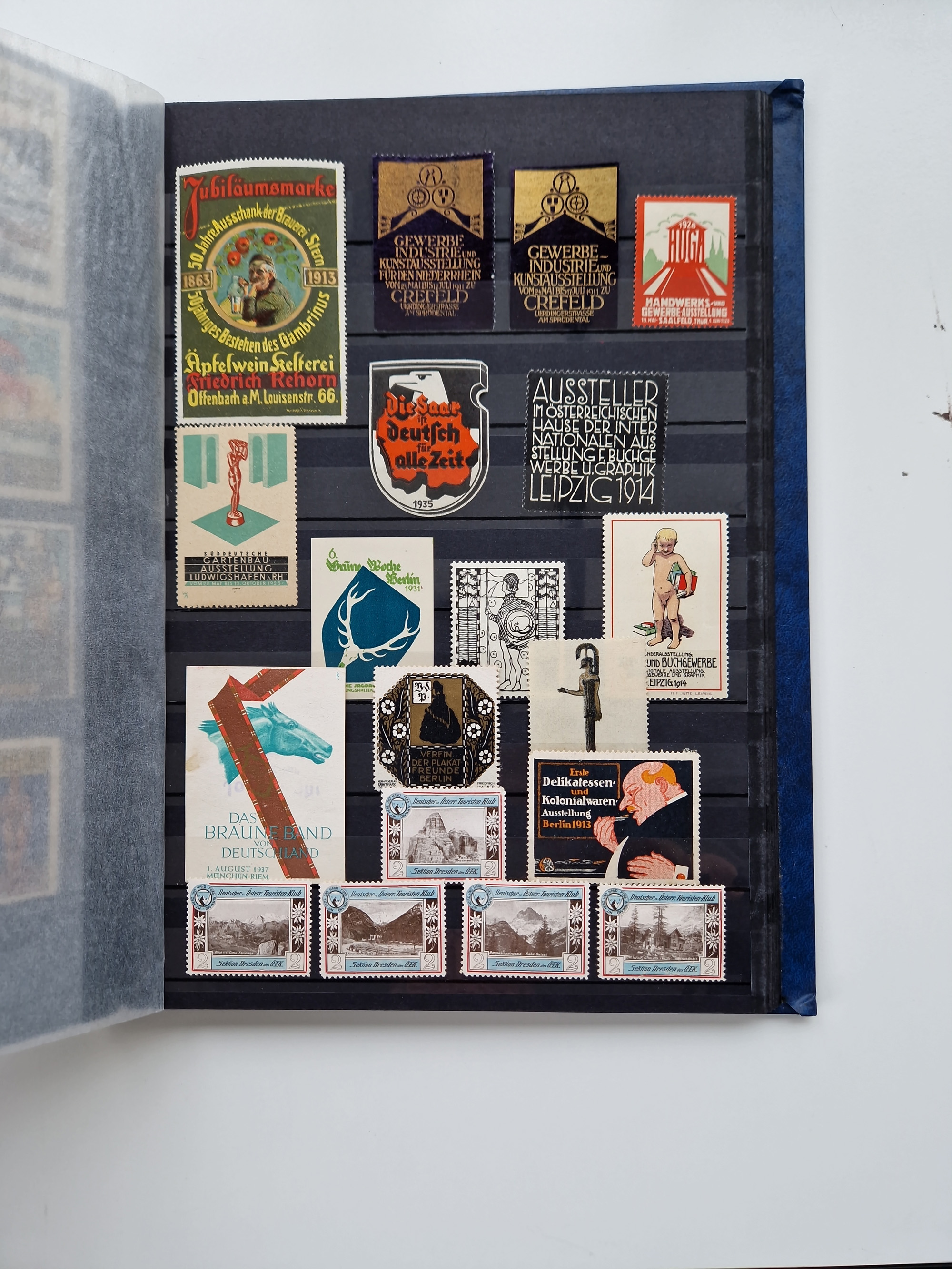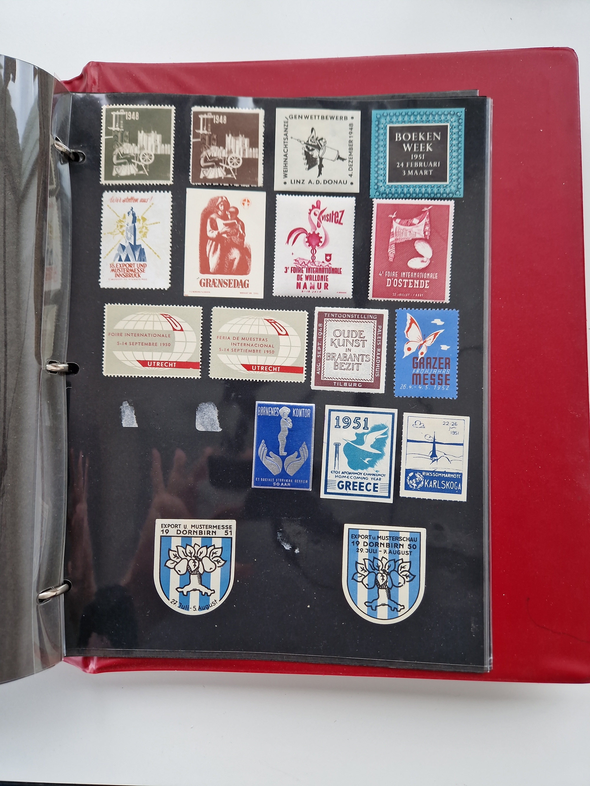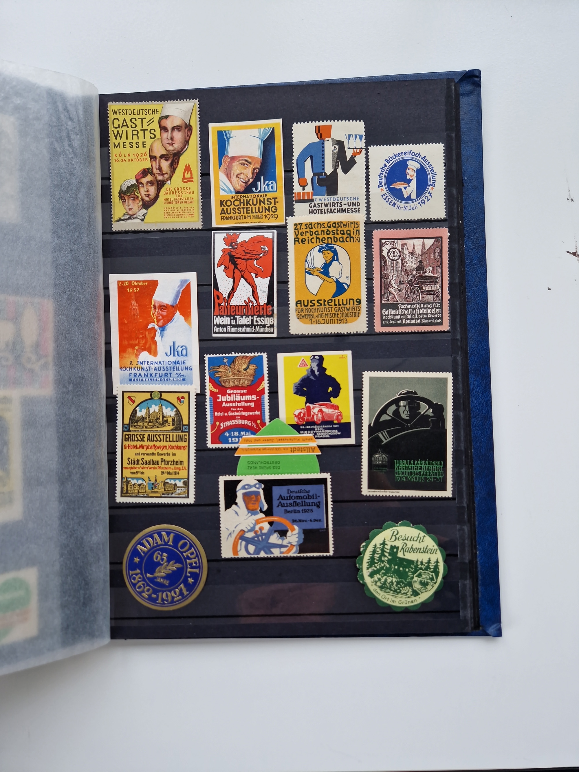 VIGNETTEN: 1896/1960 (ca.), hochinteressanter Bestand mit einigen Tausend Vignetten, Verschluss- und Siegelmarken, später Spendenvignetten und -Blocks, dabei viele zu unterschiedlichen Ausstellungen, meist aus Berlin, München, Nürnberg, Leipzig mit Export-Messe, ferner aber auch Luftpost-Ausstellung, Gewerbe- und Industrieschau, Landwirtschaft, Kunst, Firmenvignetten, etc., etwas zu Briefmarken-Ausstellungen, dabei auch drei Hessheimer Entwürfe, vieles auf amerikanischen Händlerkarten und Loskarten, in drei Kartons