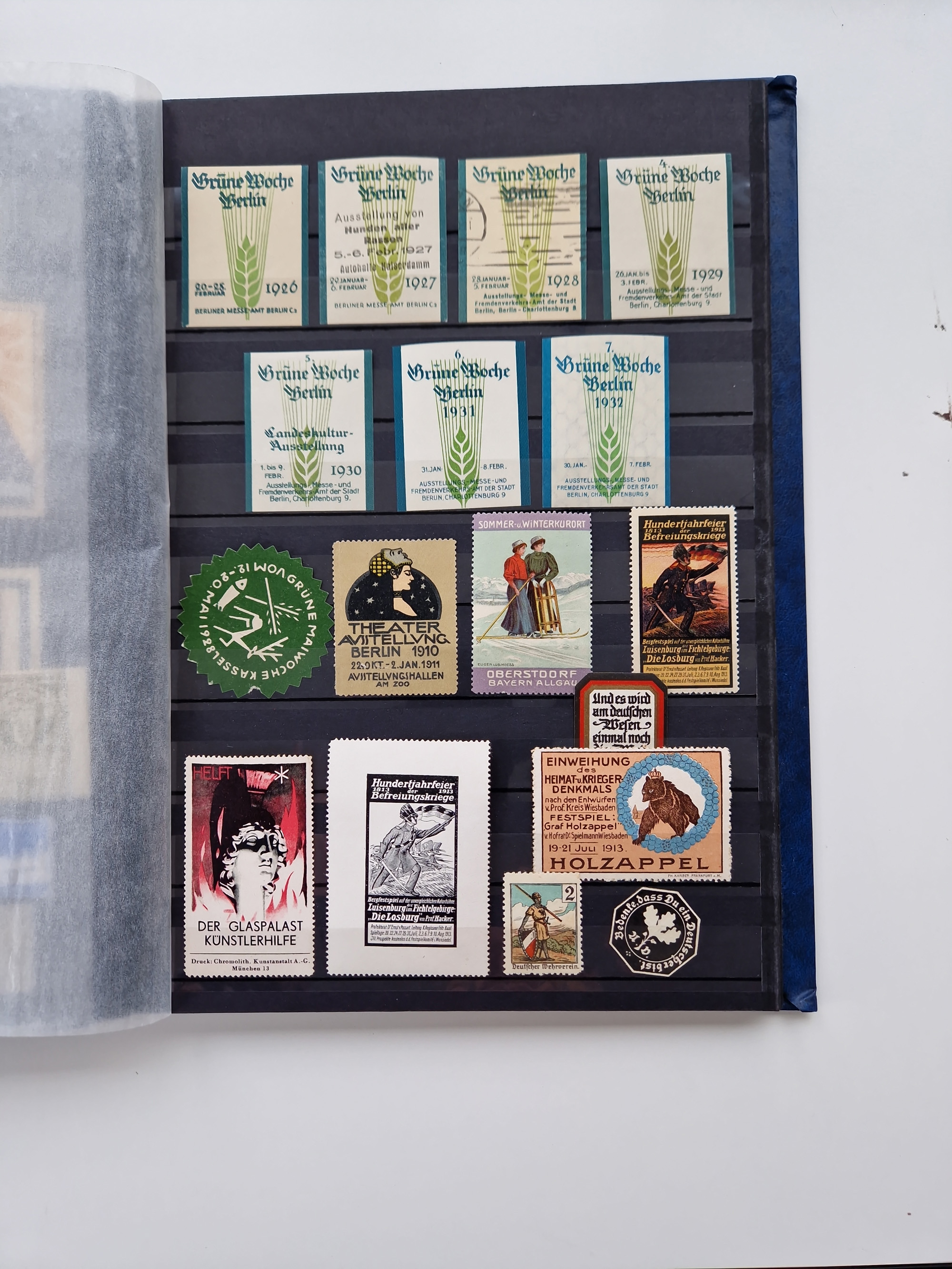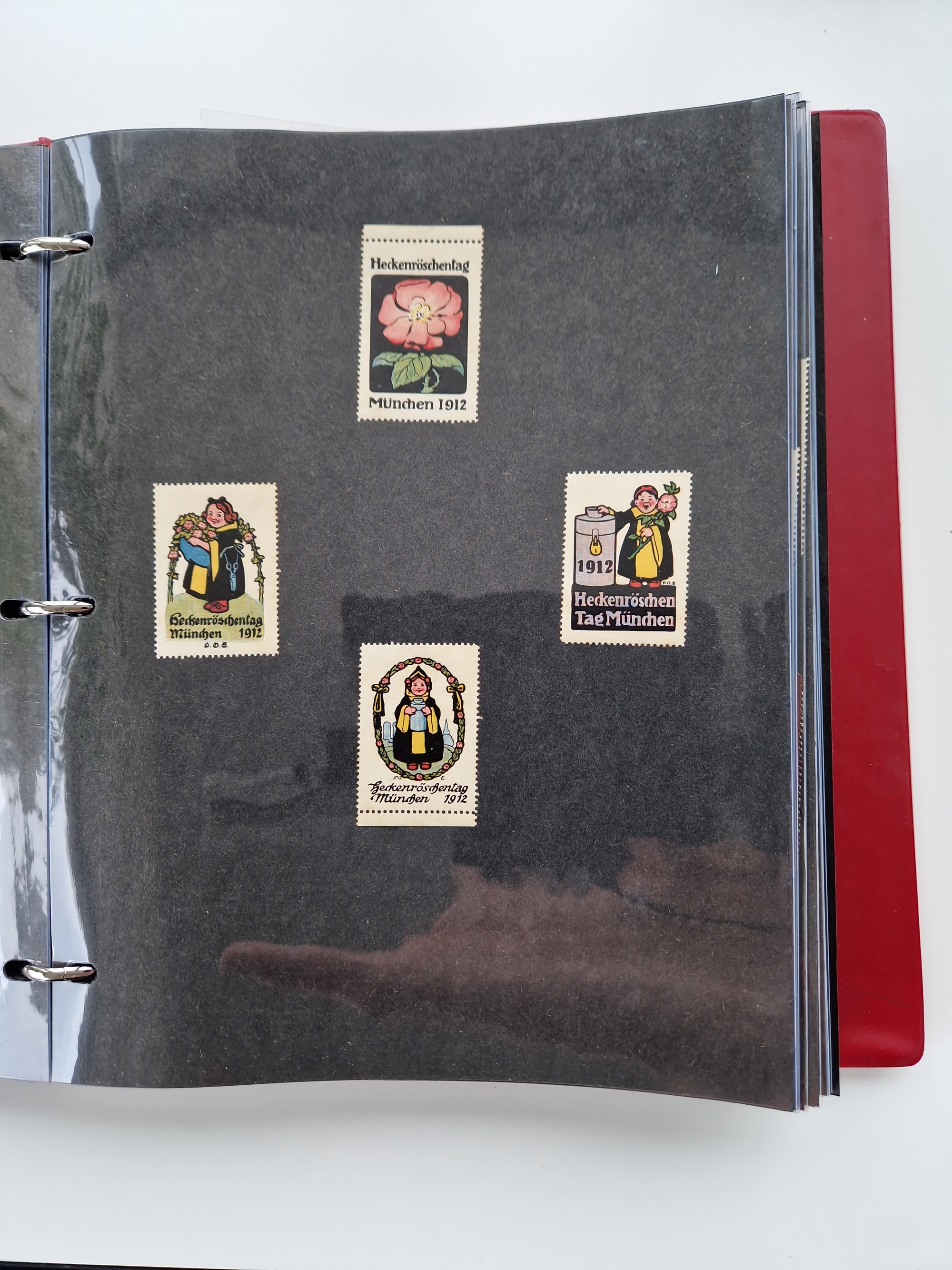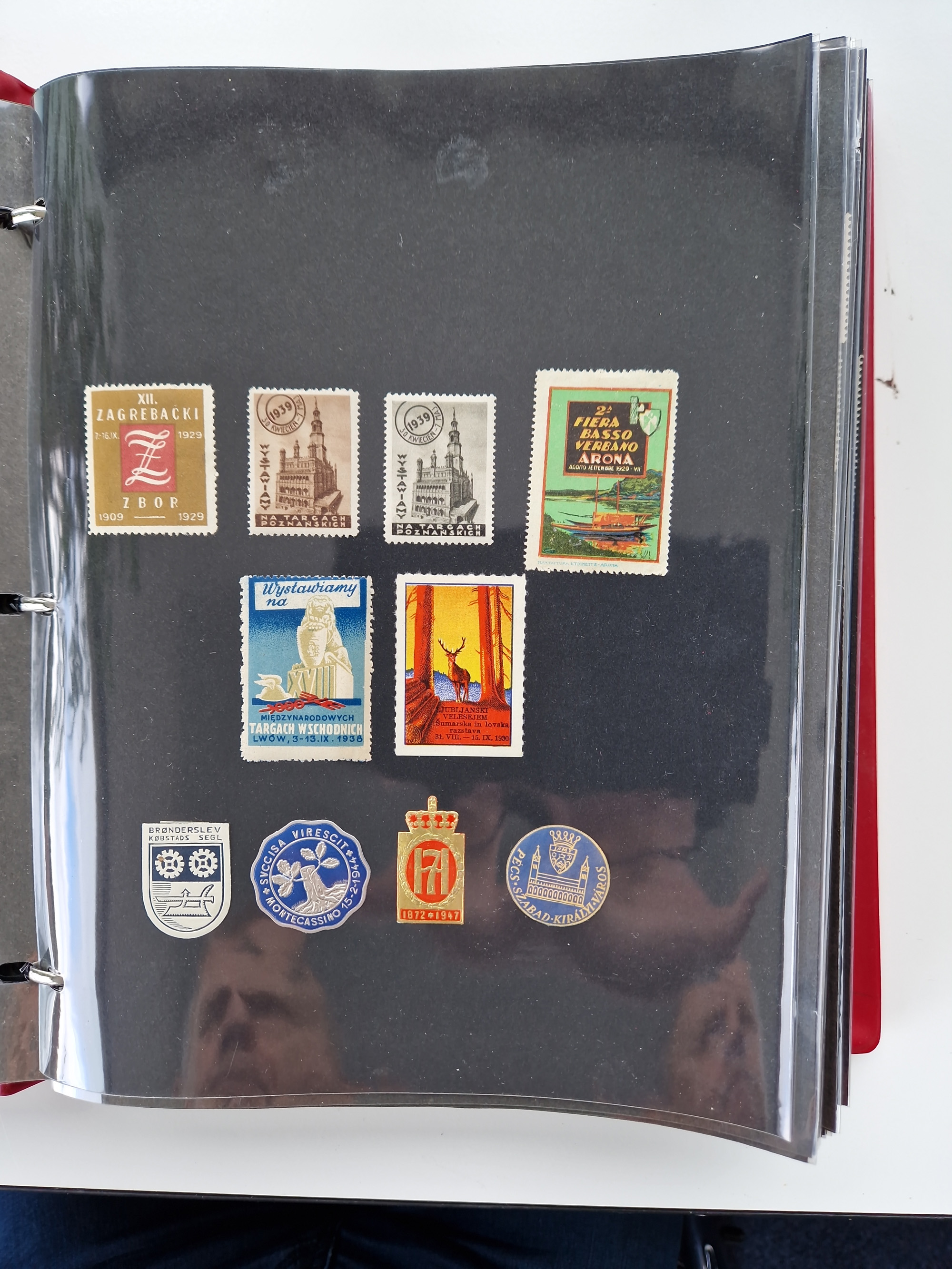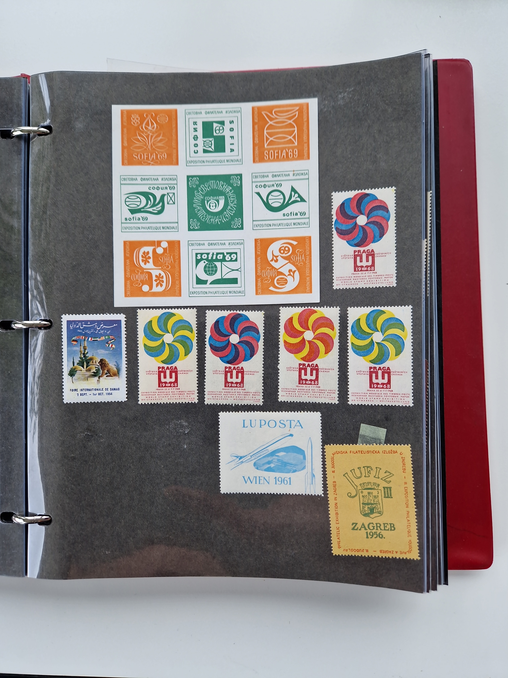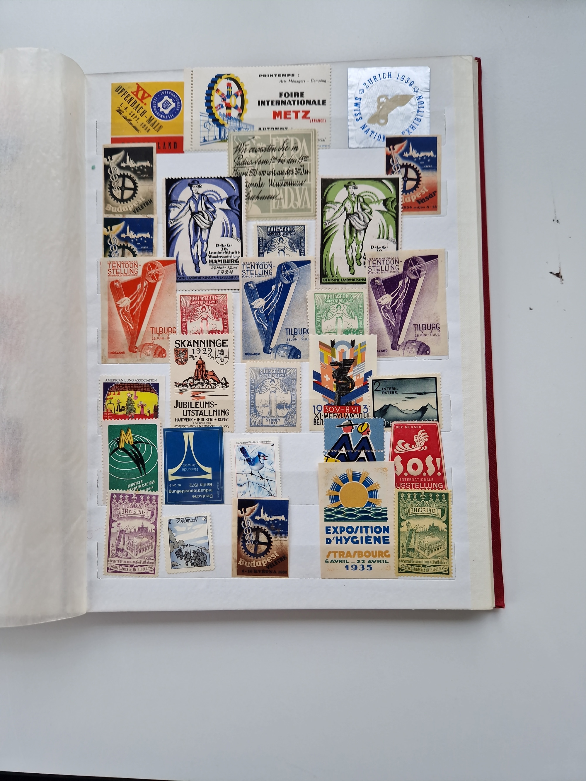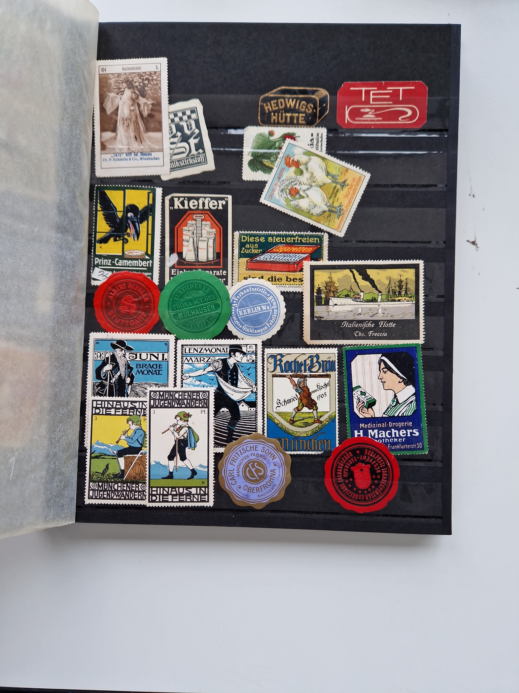 VIGNETTEN: 1896/1960 (ca.), hochinteressanter Bestand mit einigen Tausend Vignetten, Verschluss- und Siegelmarken, später Spendenvignetten und -Blocks, dabei viele zu unterschiedlichen Ausstellungen, meist aus Berlin, München, Nürnberg, Leipzig mit Export-Messe, ferner aber auch Luftpost-Ausstellung, Gewerbe- und Industrieschau, Landwirtschaft, Kunst, Firmenvignetten, etc., etwas zu Briefmarken-Ausstellungen, dabei auch drei Hessheimer Entwürfe, vieles auf amerikanischen Händlerkarten und Loskarten, in drei Kartons