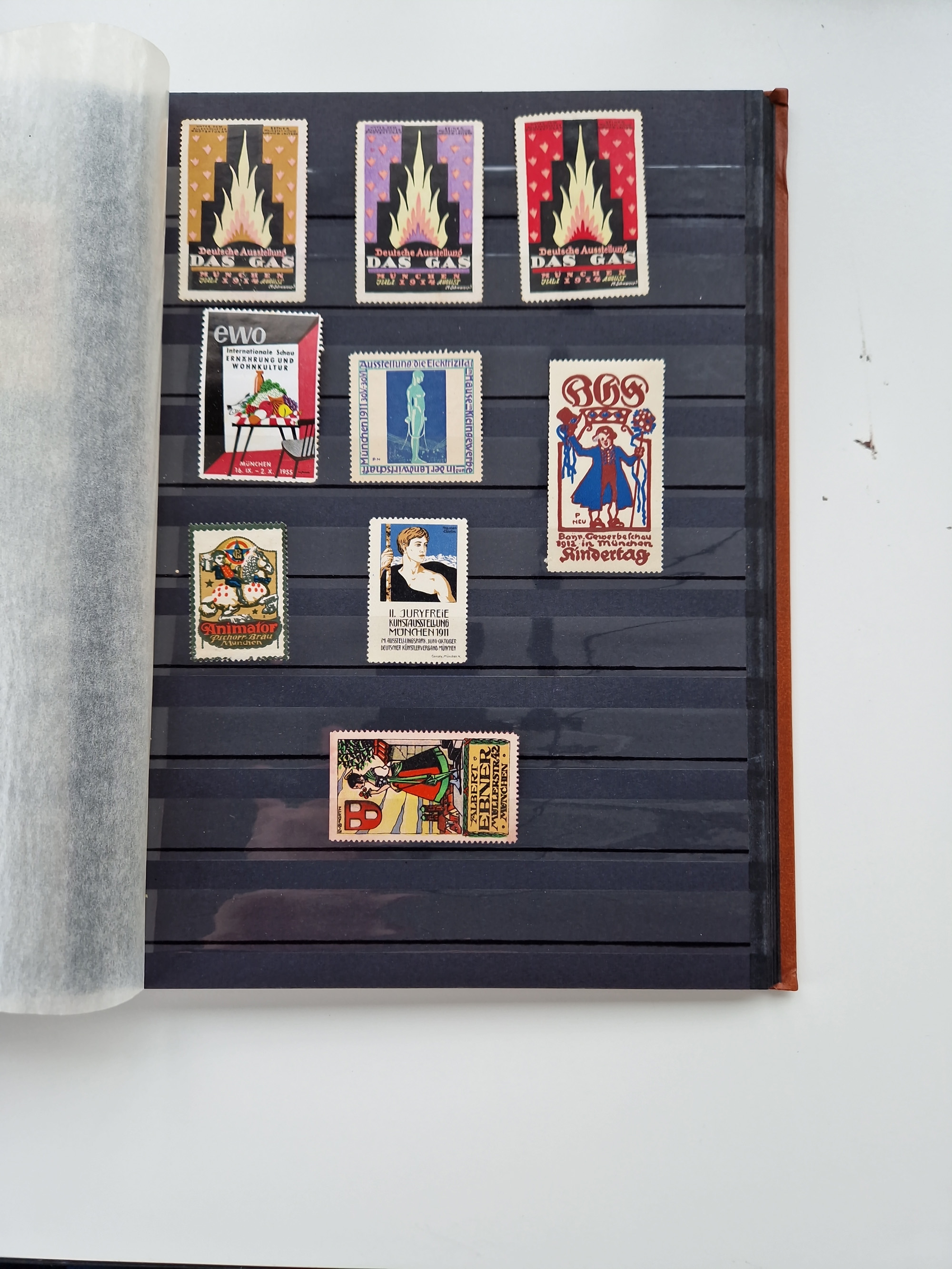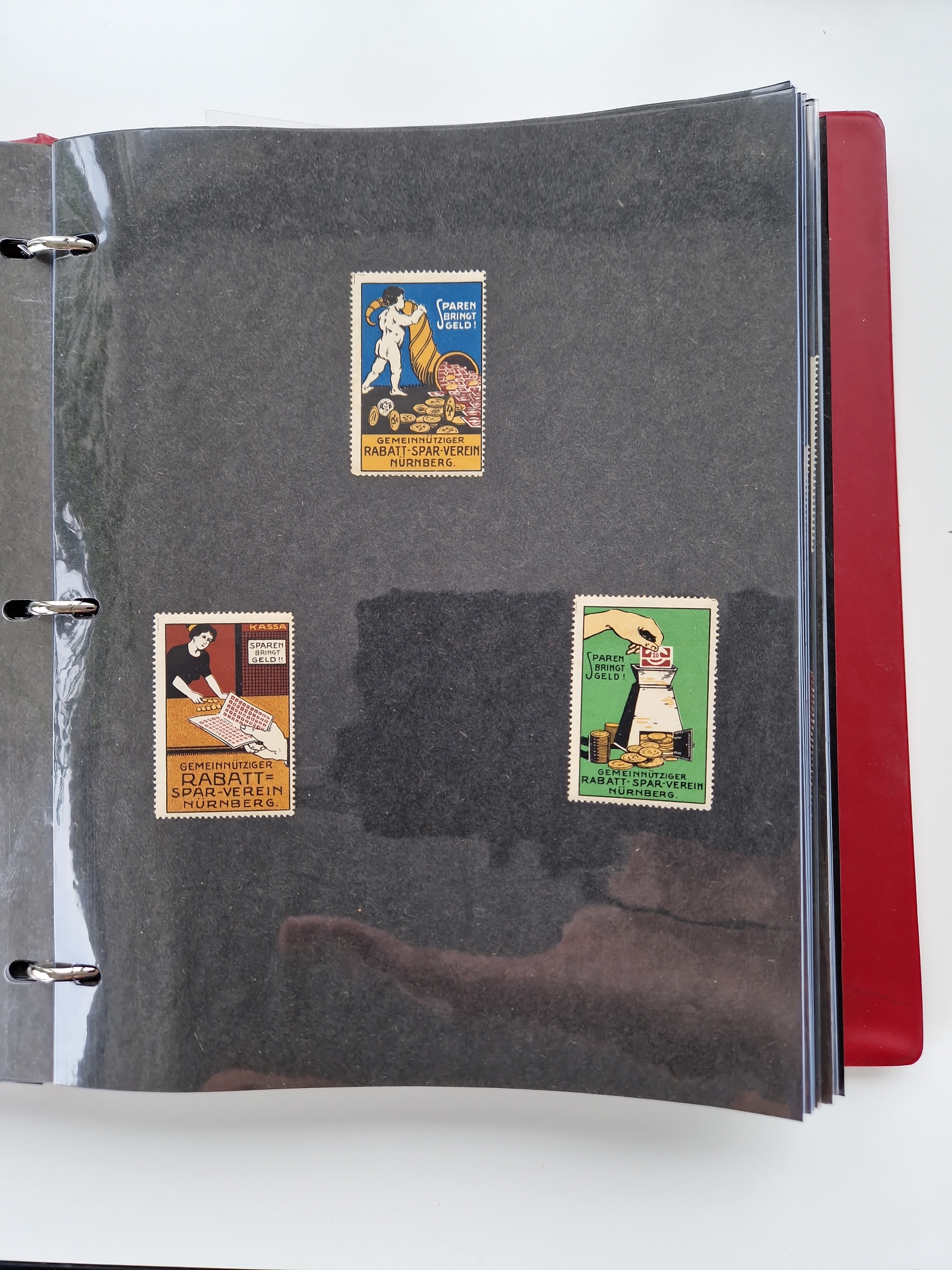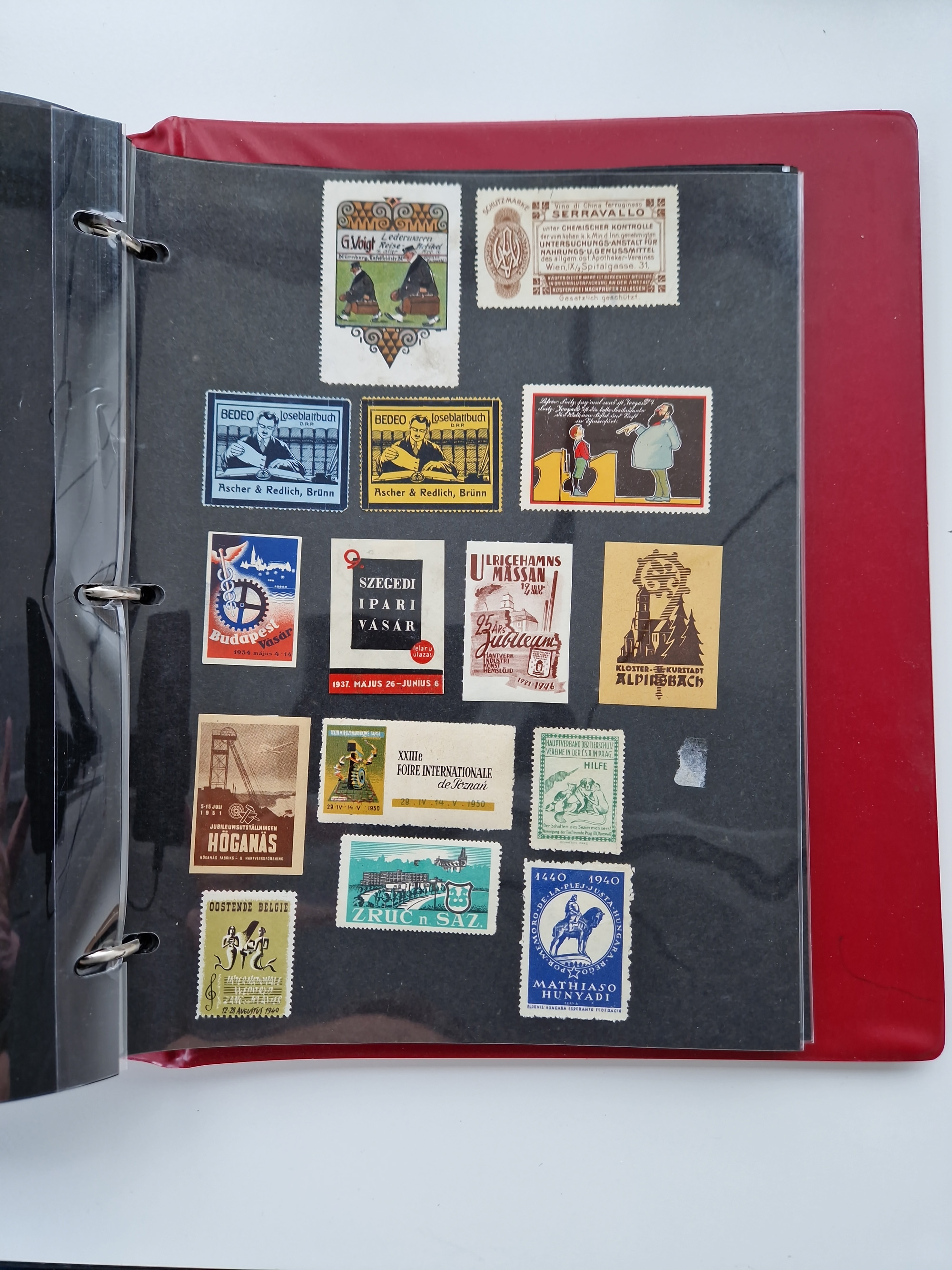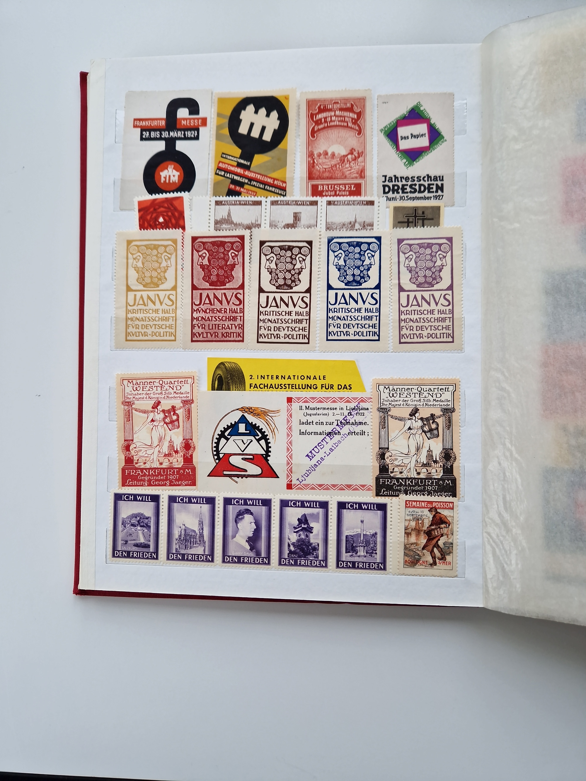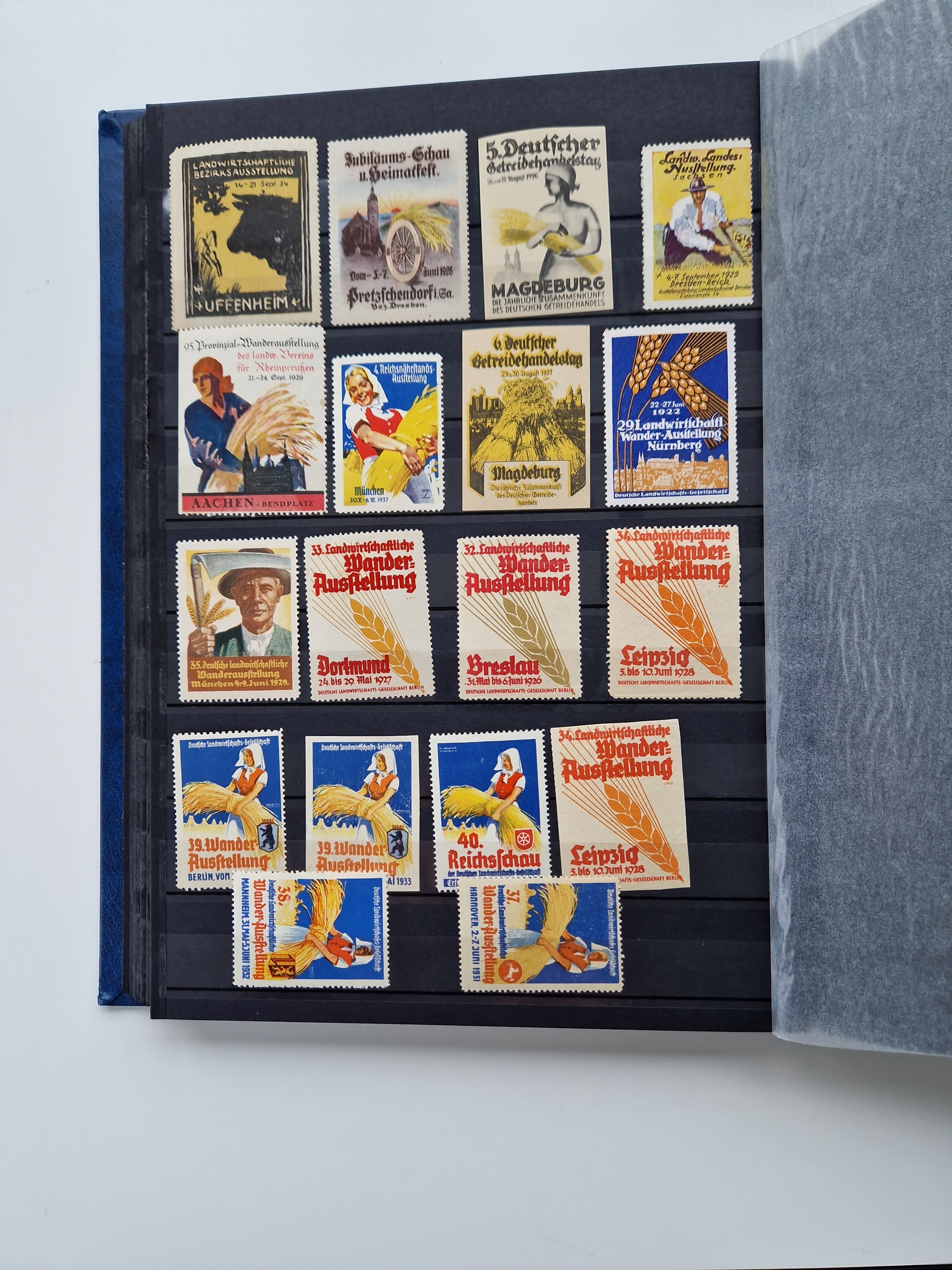 VIGNETTEN: 1896/1960 (ca.), hochinteressanter Bestand mit einigen Tausend Vignetten, Verschluss- und Siegelmarken, später Spendenvignetten und -Blocks, dabei viele zu unterschiedlichen Ausstellungen, meist aus Berlin, München, Nürnberg, Leipzig mit Export-Messe, ferner aber auch Luftpost-Ausstellung, Gewerbe- und Industrieschau, Landwirtschaft, Kunst, Firmenvignetten, etc., etwas zu Briefmarken-Ausstellungen, dabei auch drei Hessheimer Entwürfe, vieles auf amerikanischen Händlerkarten und Loskarten, in drei Kartons