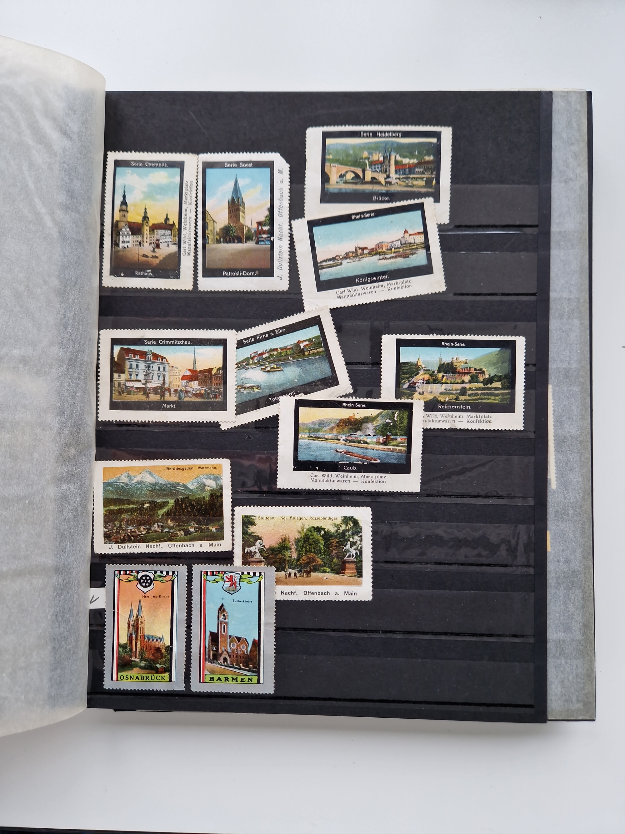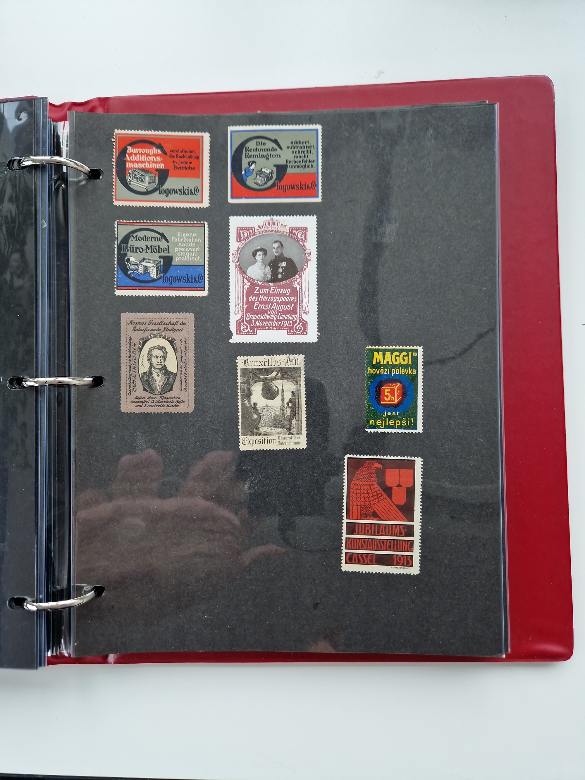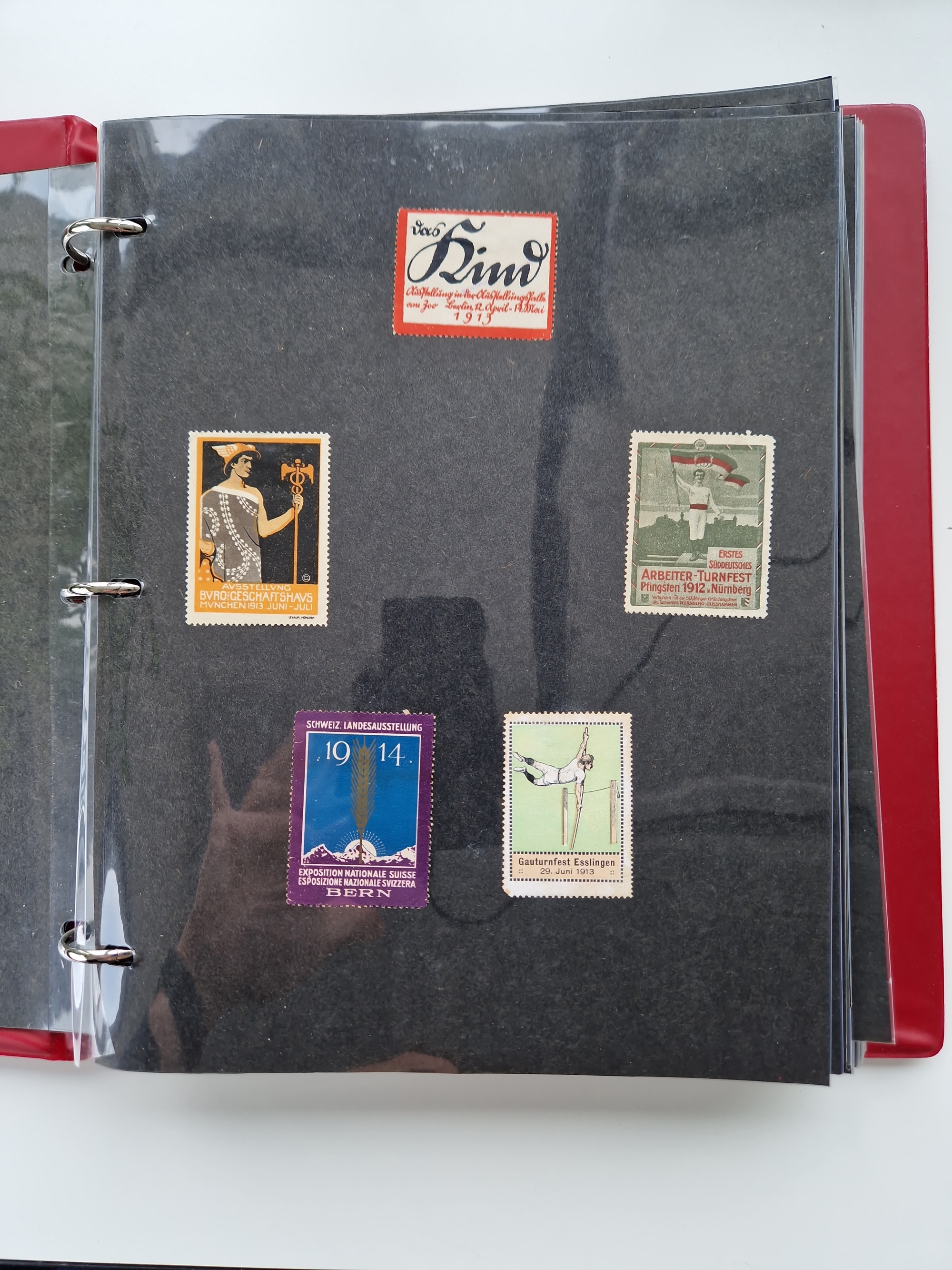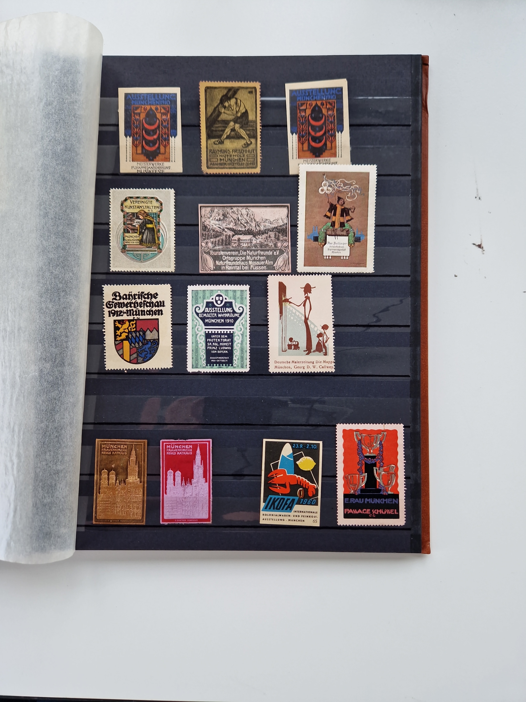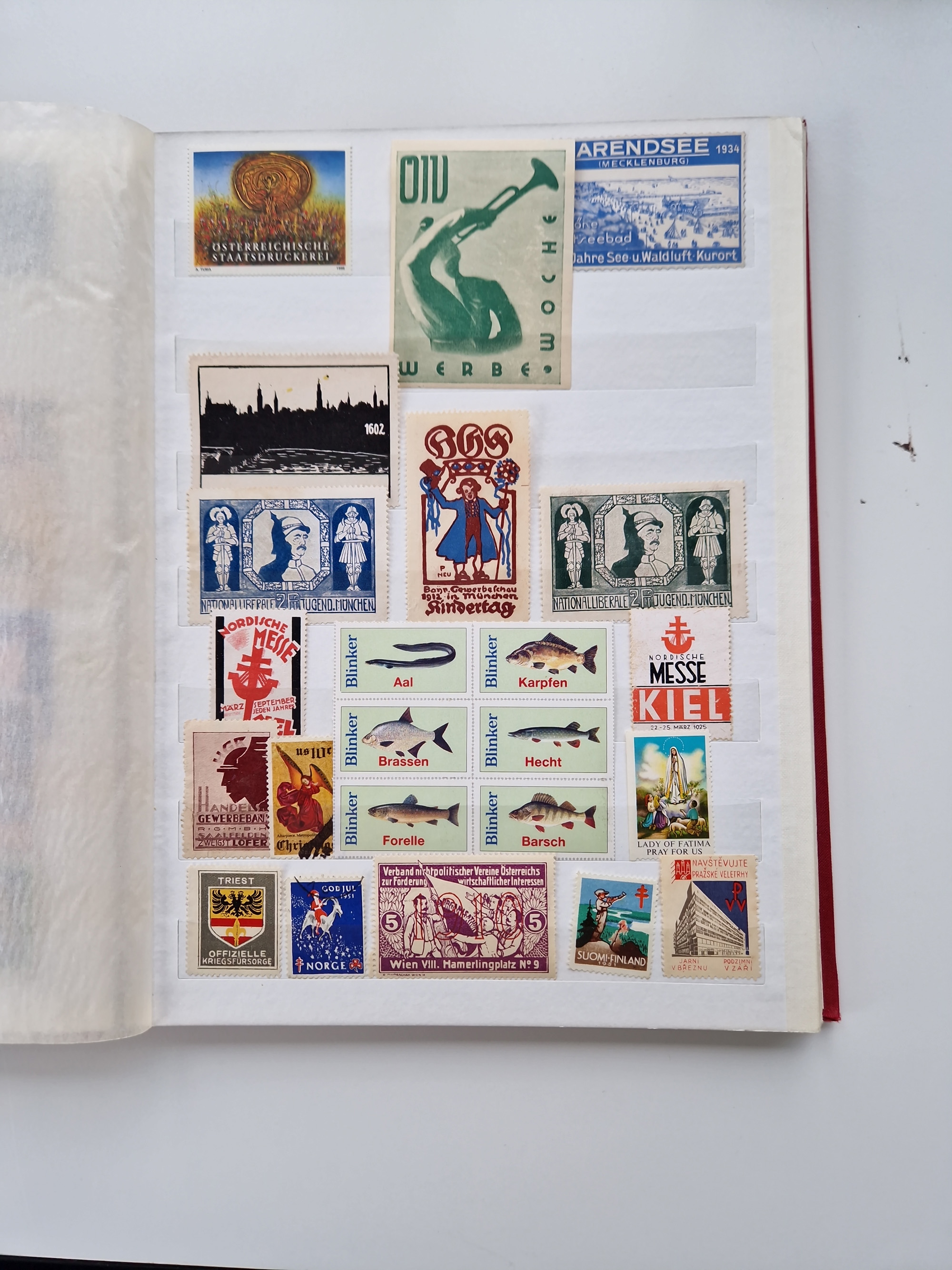 VIGNETTEN: 1896/1960 (ca.), hochinteressanter Bestand mit einigen Tausend Vignetten, Verschluss- und Siegelmarken, später Spendenvignetten und -Blocks, dabei viele zu unterschiedlichen Ausstellungen, meist aus Berlin, München, Nürnberg, Leipzig mit Export-Messe, ferner aber auch Luftpost-Ausstellung, Gewerbe- und Industrieschau, Landwirtschaft, Kunst, Firmenvignetten, etc., etwas zu Briefmarken-Ausstellungen, dabei auch drei Hessheimer Entwürfe, vieles auf amerikanischen Händlerkarten und Loskarten, in drei Kartons