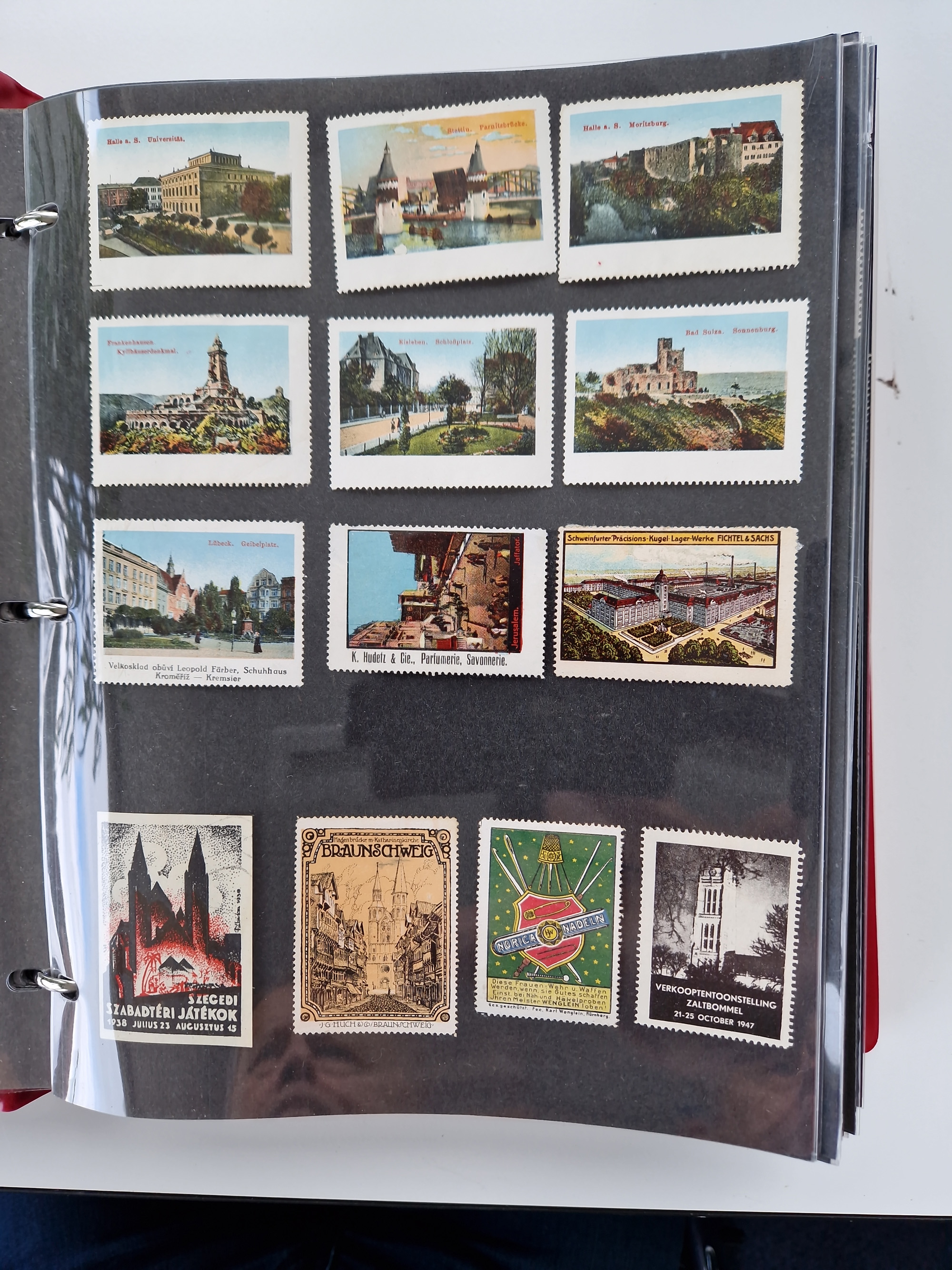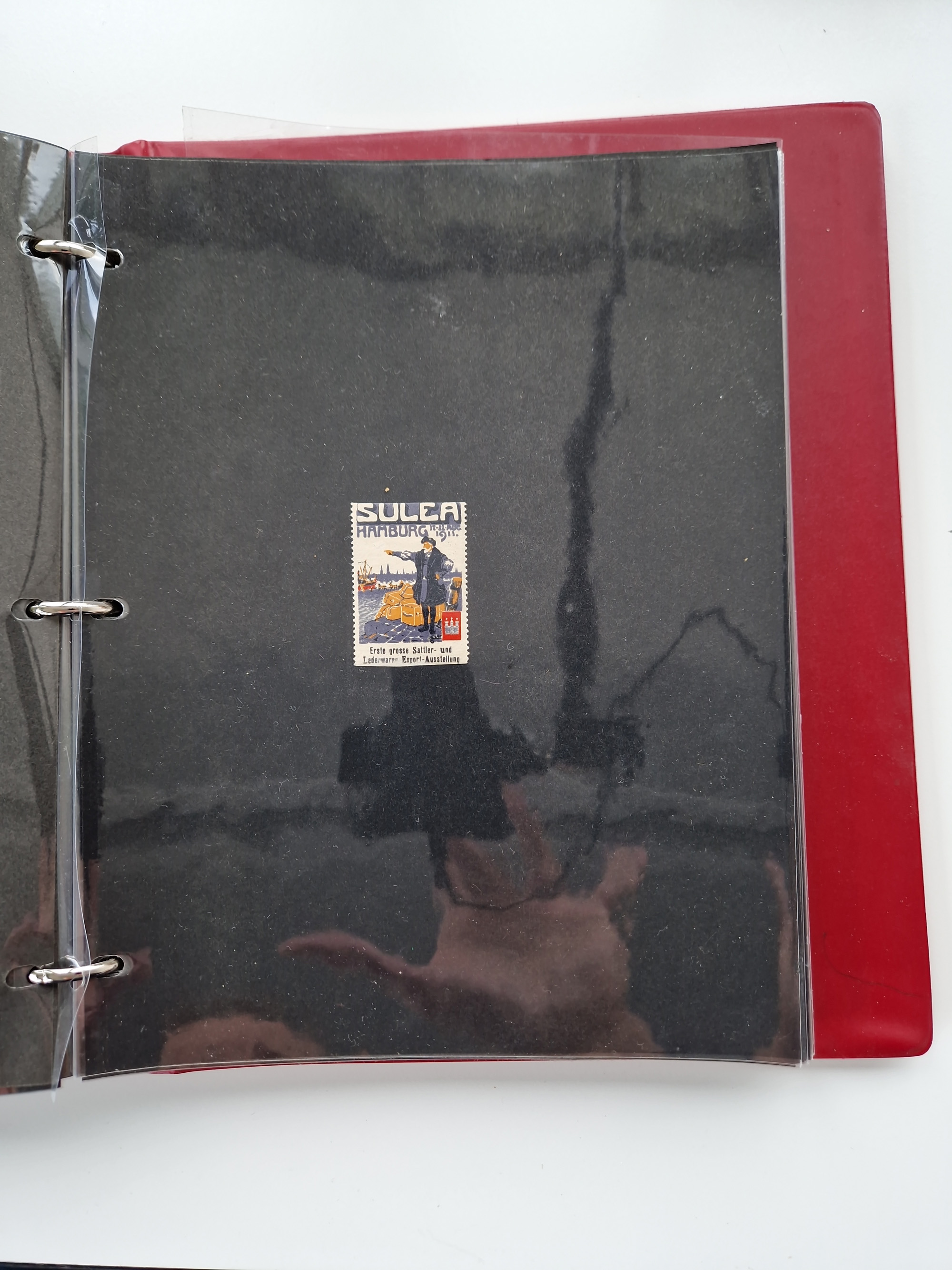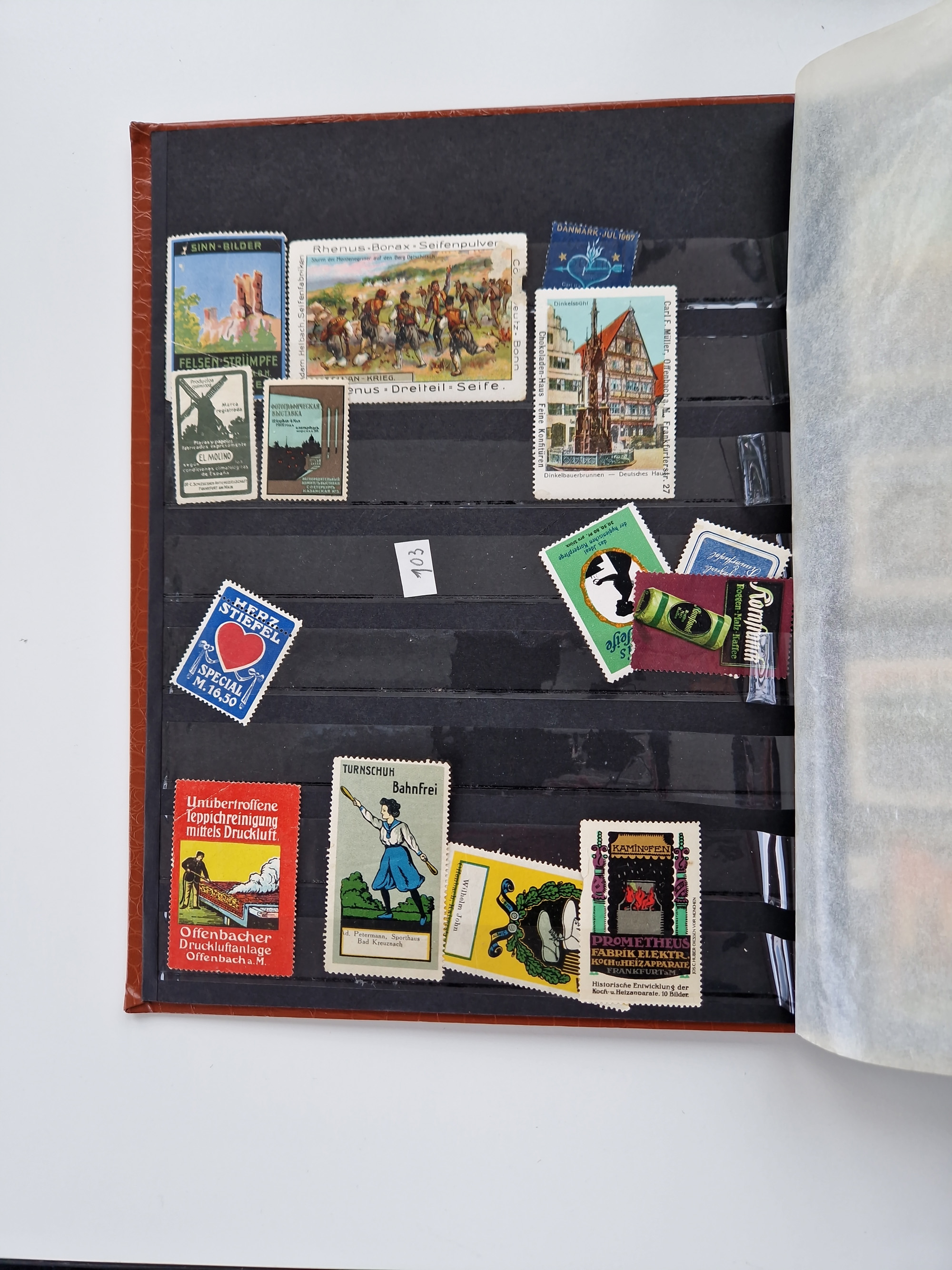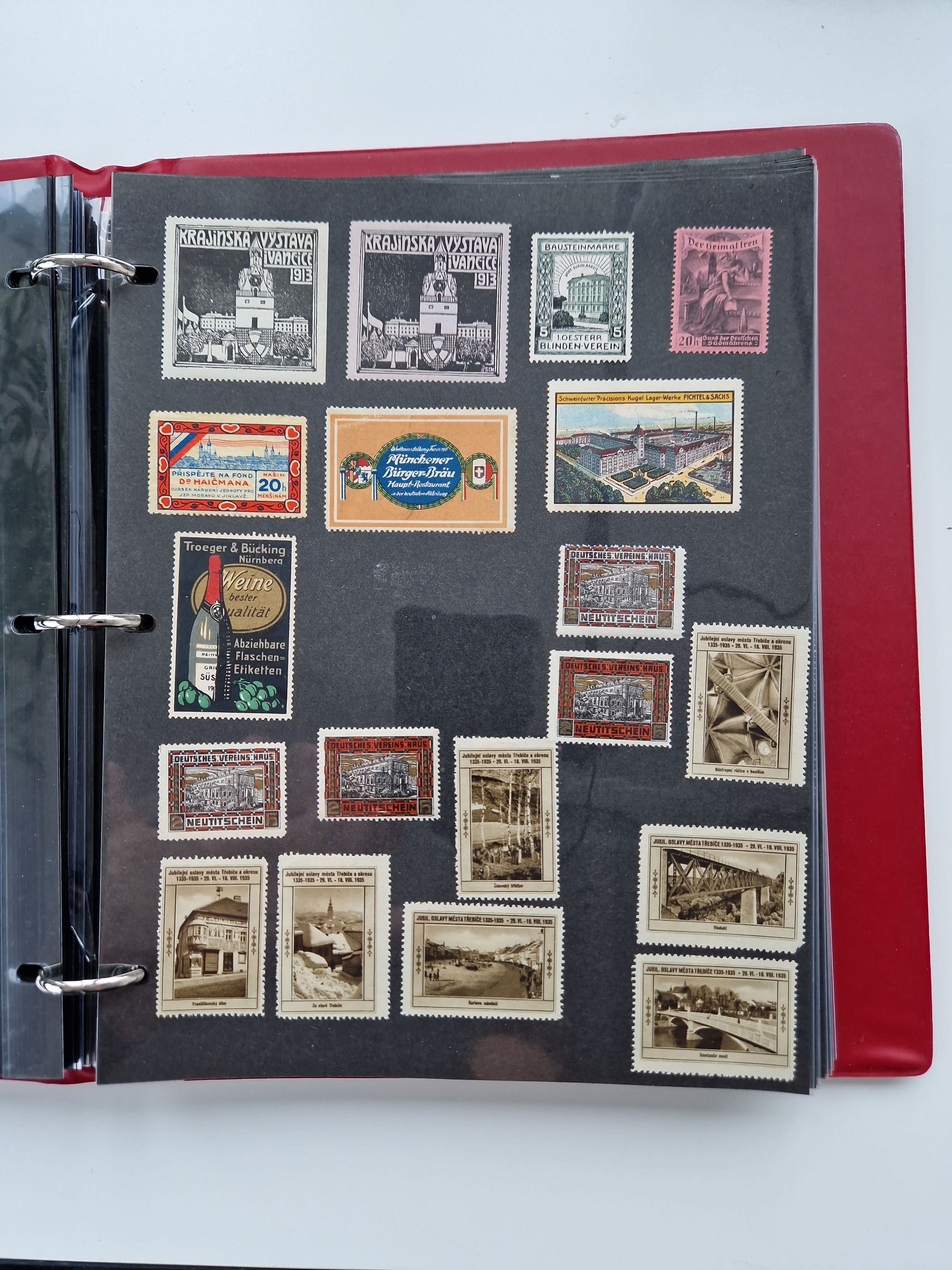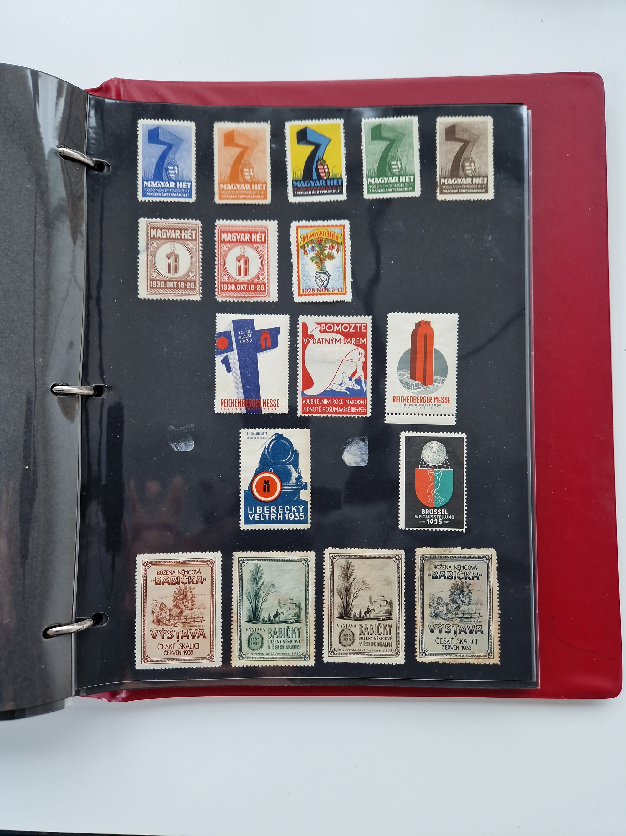 VIGNETTEN: 1896/1960 (ca.), hochinteressanter Bestand mit einigen Tausend Vignetten, Verschluss- und Siegelmarken, später Spendenvignetten und -Blocks, dabei viele zu unterschiedlichen Ausstellungen, meist aus Berlin, München, Nürnberg, Leipzig mit Export-Messe, ferner aber auch Luftpost-Ausstellung, Gewerbe- und Industrieschau, Landwirtschaft, Kunst, Firmenvignetten, etc., etwas zu Briefmarken-Ausstellungen, dabei auch drei Hessheimer Entwürfe, vieles auf amerikanischen Händlerkarten und Loskarten, in drei Kartons