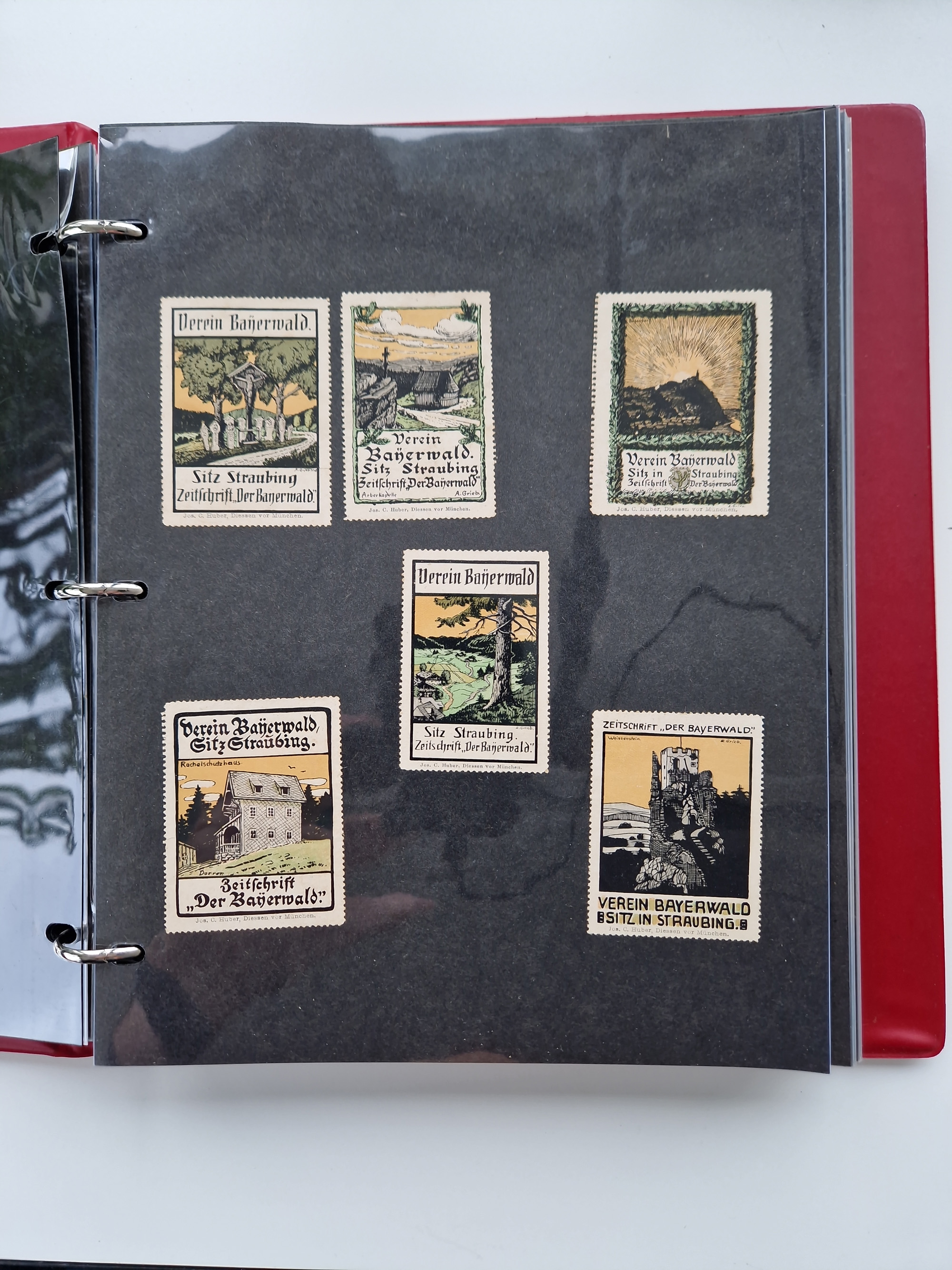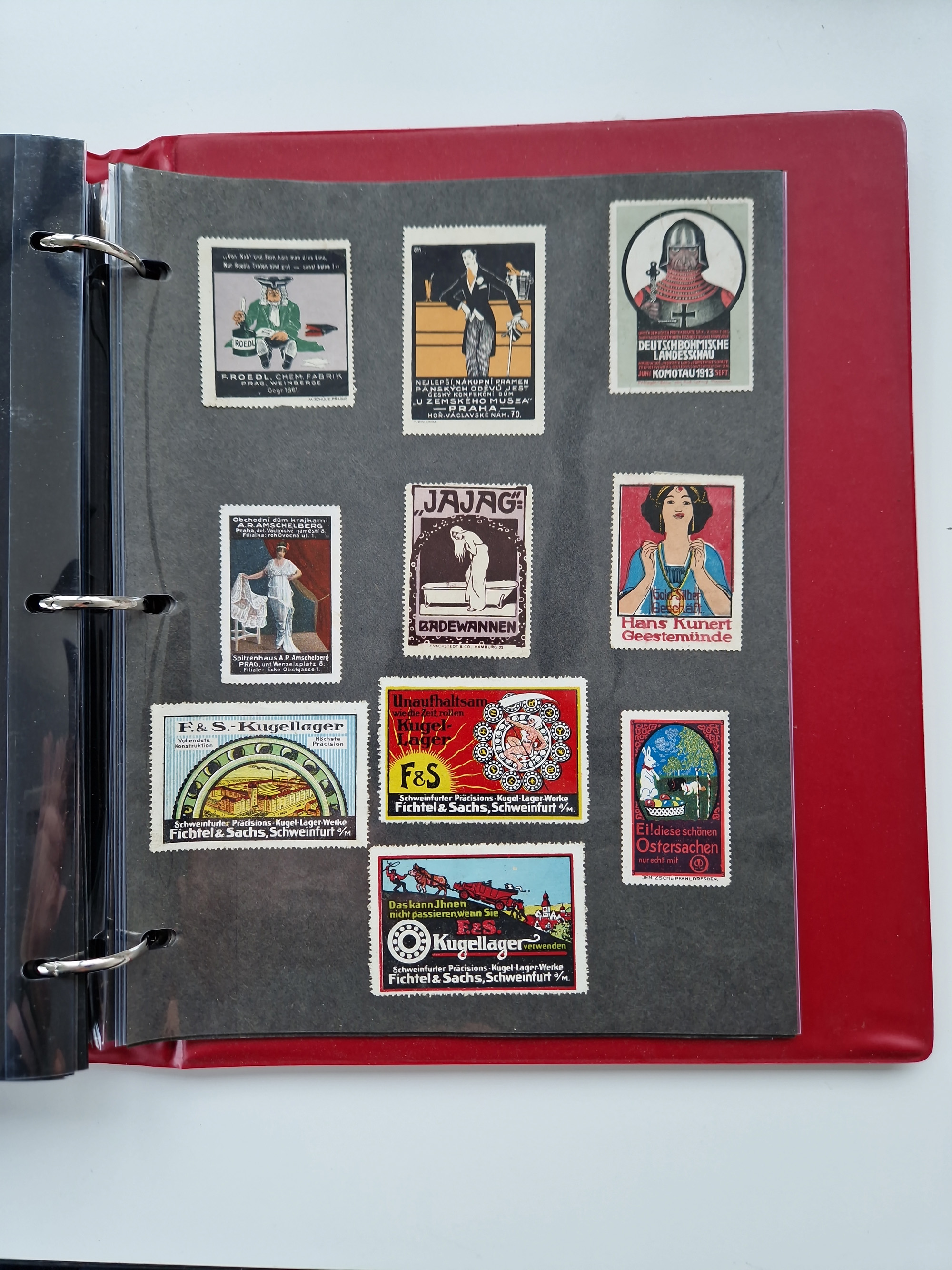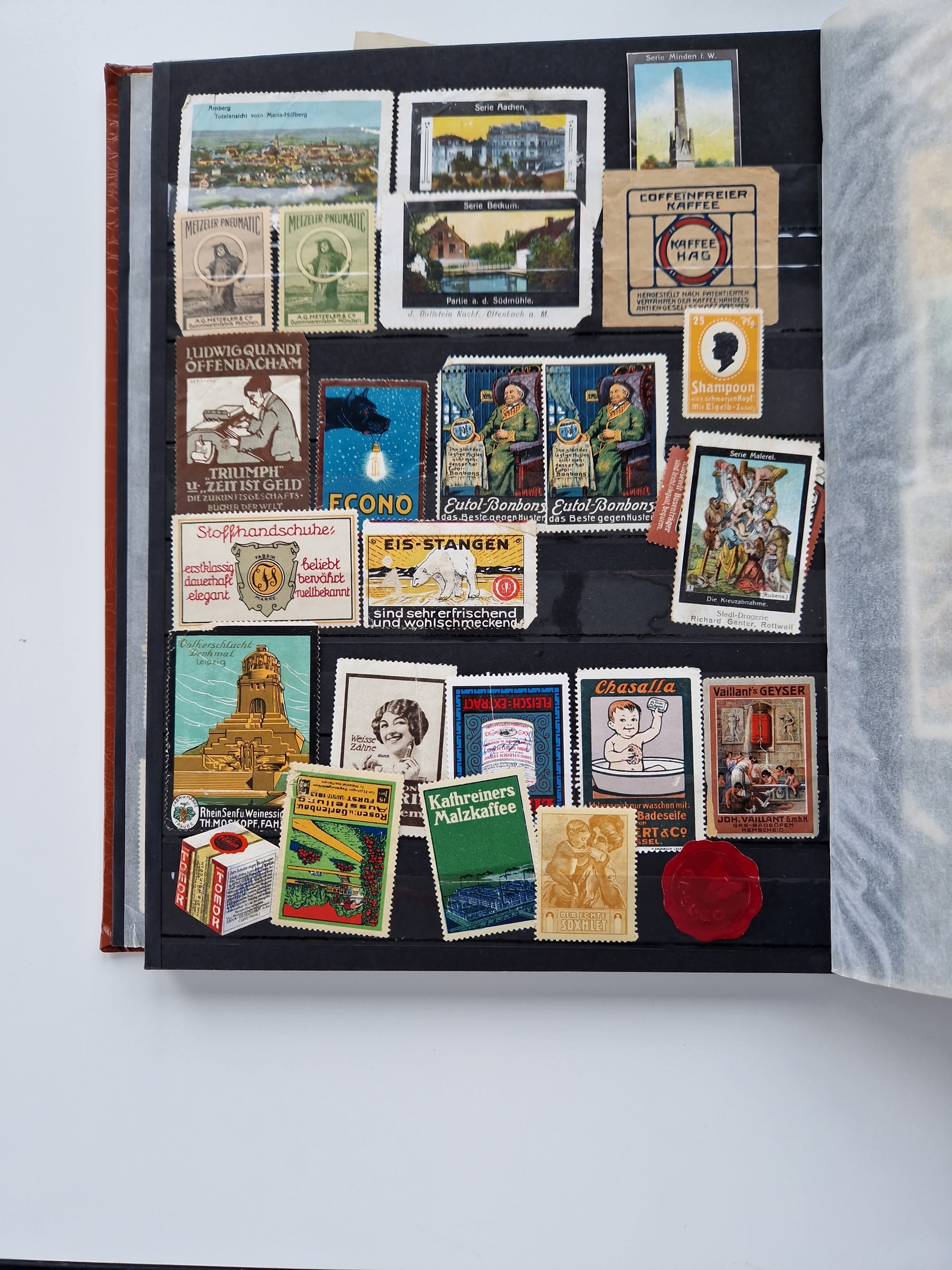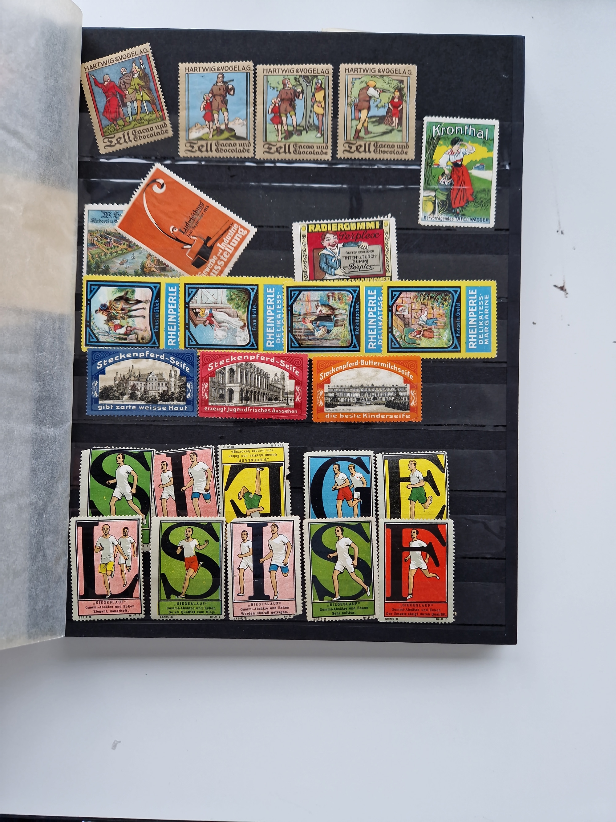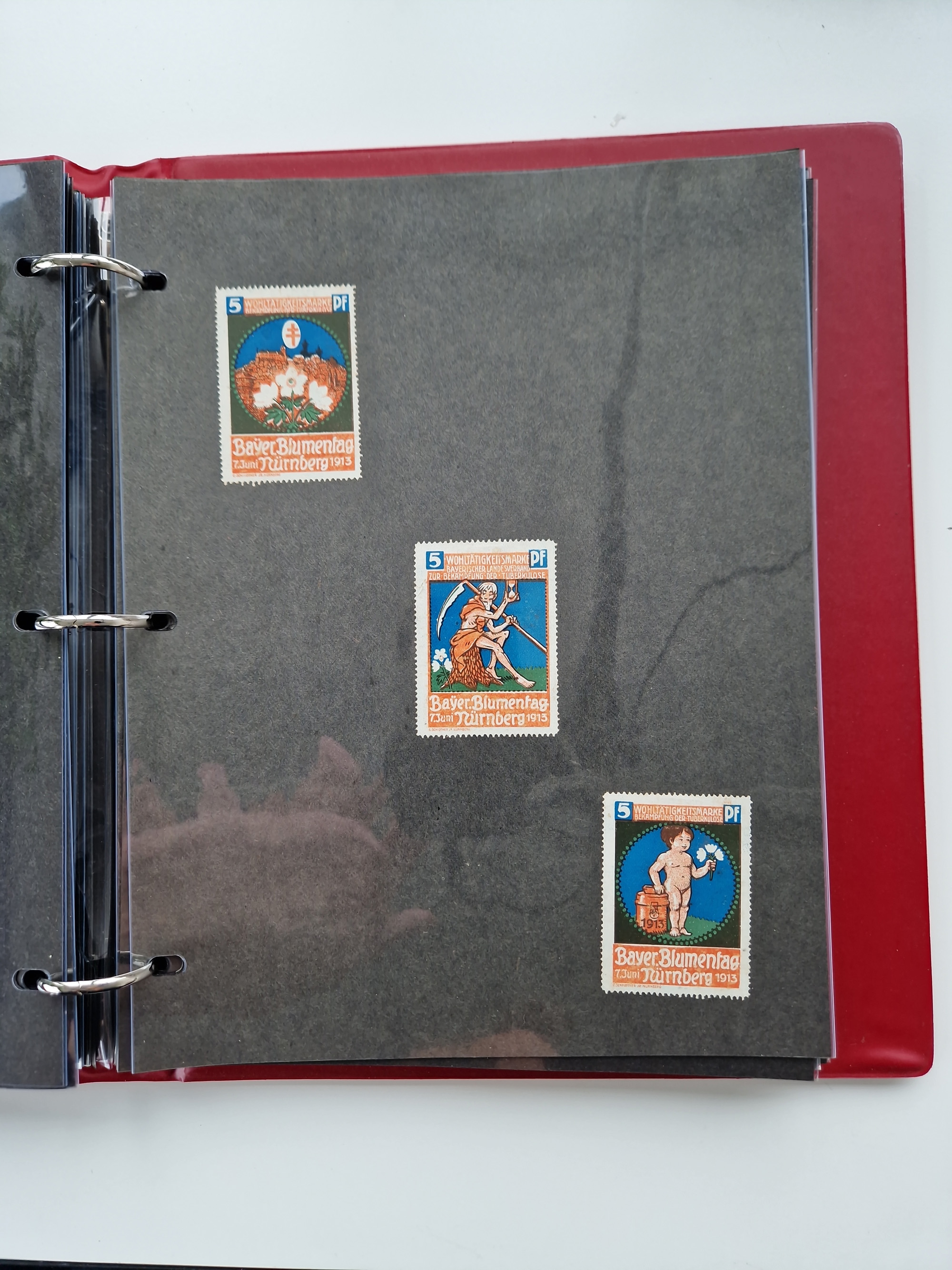 VIGNETTEN: 1896/1960 (ca.), hochinteressanter Bestand mit einigen Tausend Vignetten, Verschluss- und Siegelmarken, später Spendenvignetten und -Blocks, dabei viele zu unterschiedlichen Ausstellungen, meist aus Berlin, München, Nürnberg, Leipzig mit Export-Messe, ferner aber auch Luftpost-Ausstellung, Gewerbe- und Industrieschau, Landwirtschaft, Kunst, Firmenvignetten, etc., etwas zu Briefmarken-Ausstellungen, dabei auch drei Hessheimer Entwürfe, vieles auf amerikanischen Händlerkarten und Loskarten, in drei Kartons