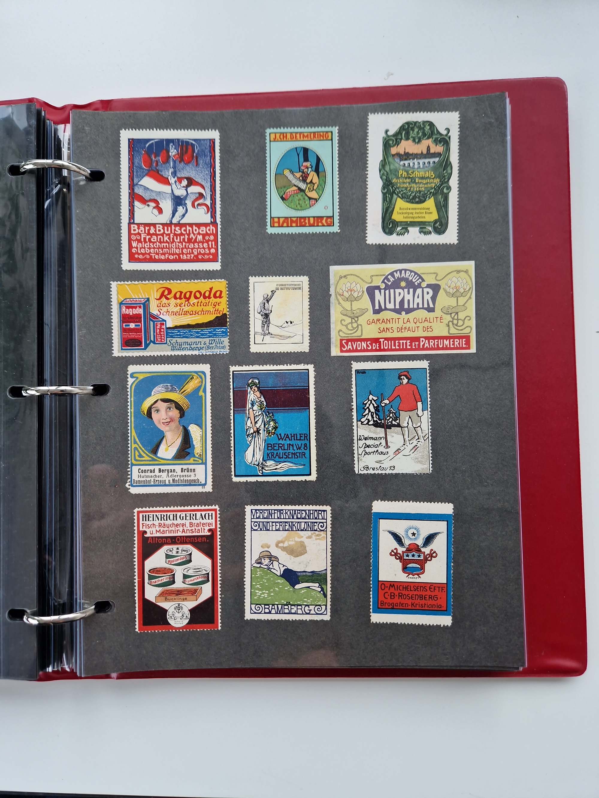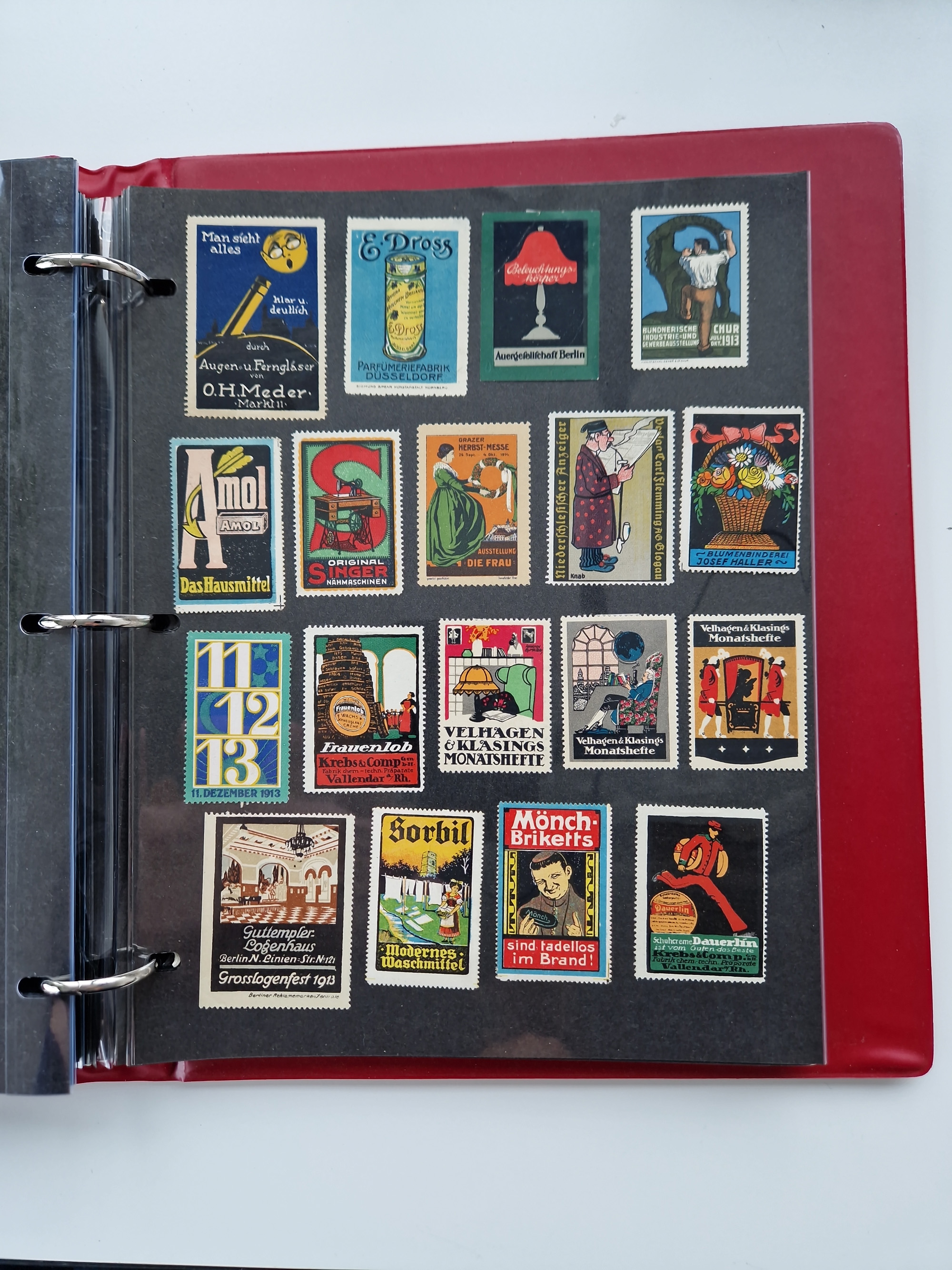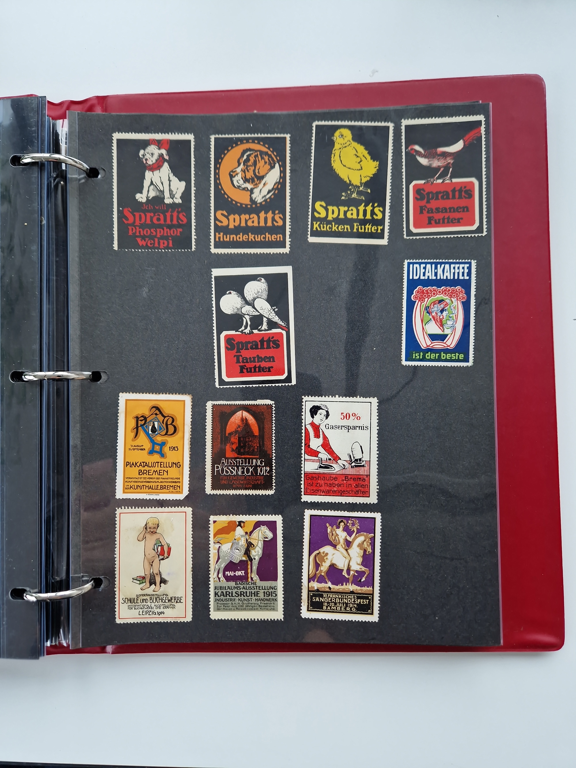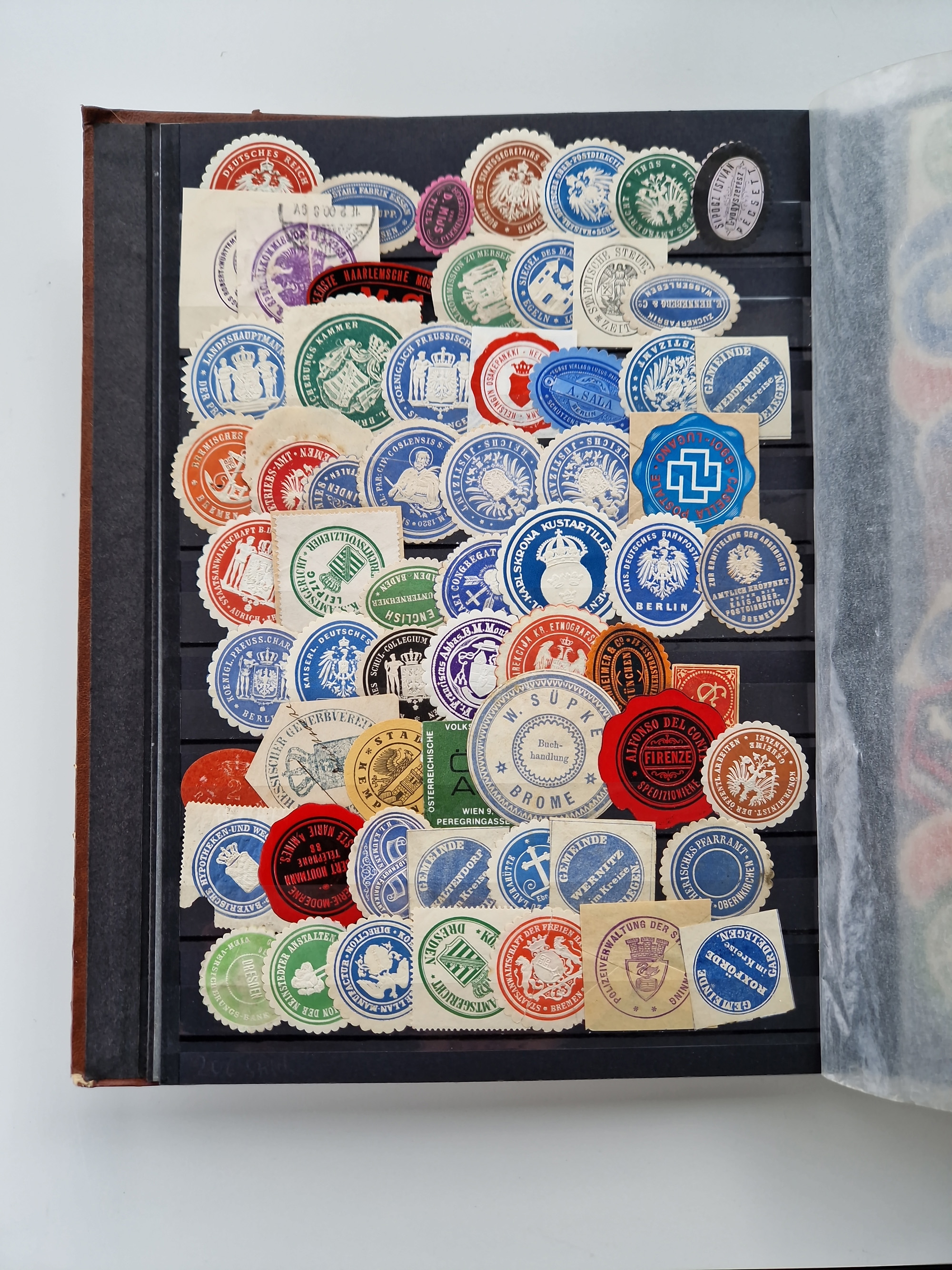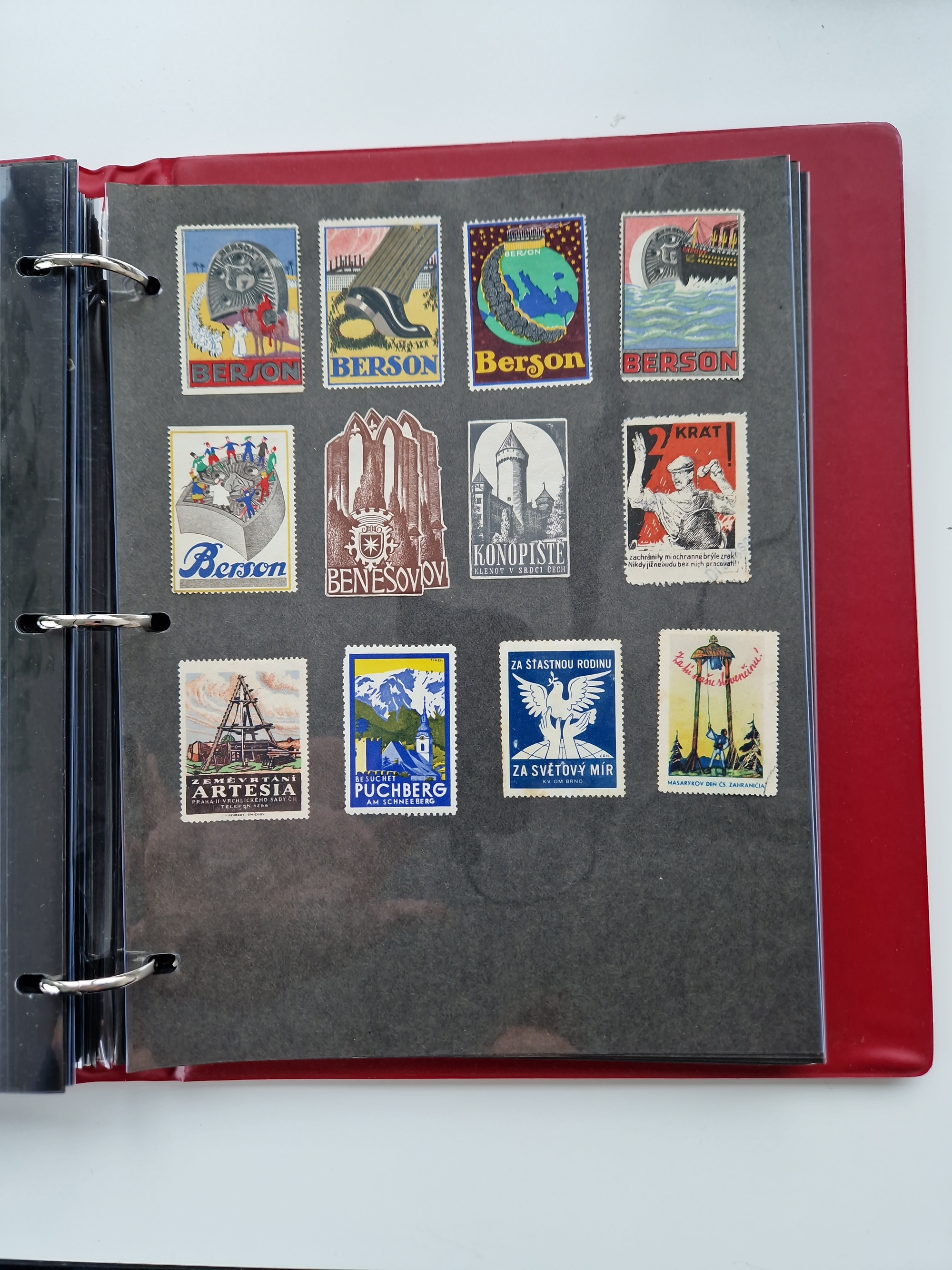 VIGNETTEN: 1896/1960 (ca.), hochinteressanter Bestand mit einigen Tausend Vignetten, Verschluss- und Siegelmarken, später Spendenvignetten und -Blocks, dabei viele zu unterschiedlichen Ausstellungen, meist aus Berlin, München, Nürnberg, Leipzig mit Export-Messe, ferner aber auch Luftpost-Ausstellung, Gewerbe- und Industrieschau, Landwirtschaft, Kunst, Firmenvignetten, etc., etwas zu Briefmarken-Ausstellungen, dabei auch drei Hessheimer Entwürfe, vieles auf amerikanischen Händlerkarten und Loskarten, in drei Kartons