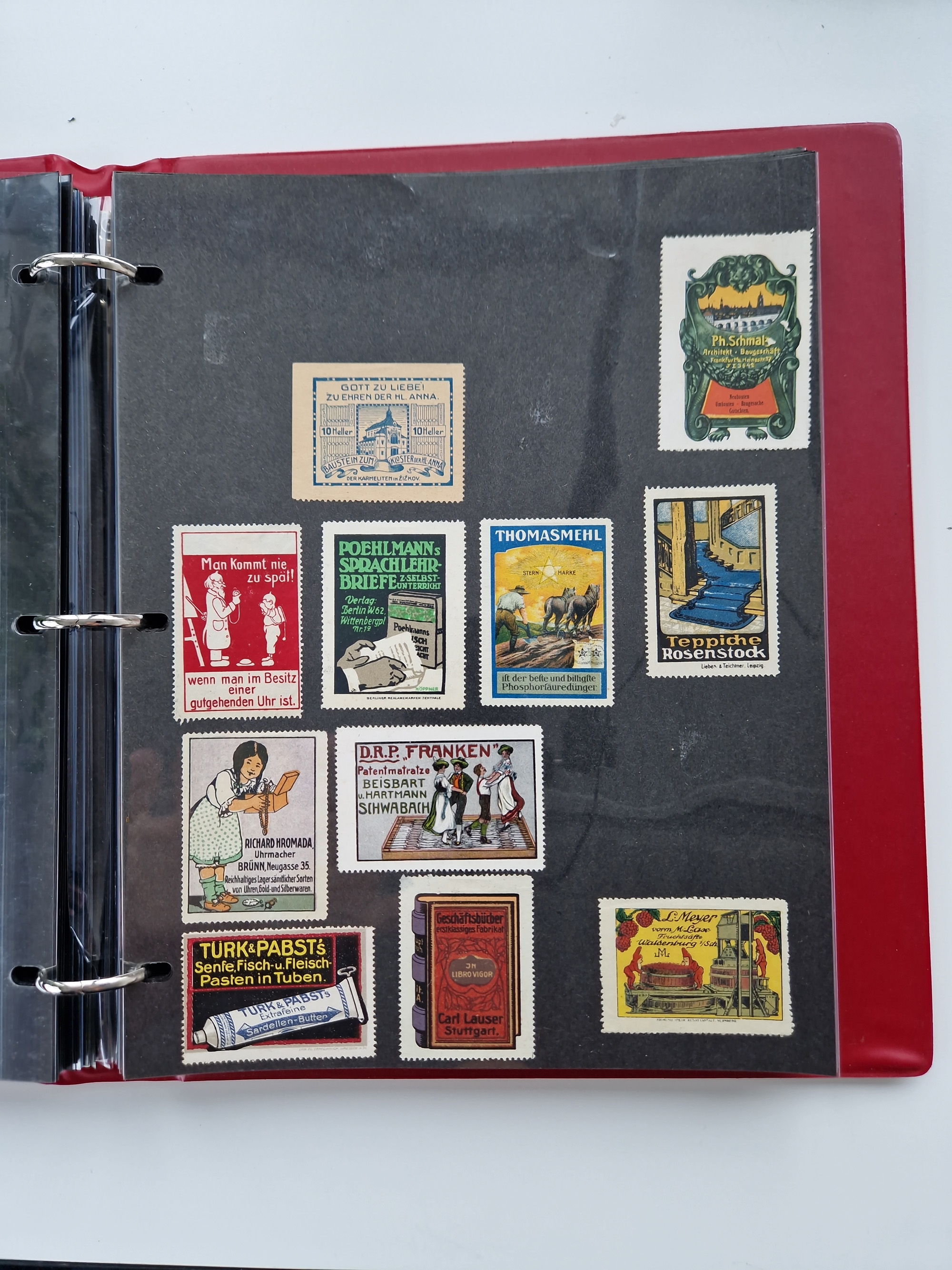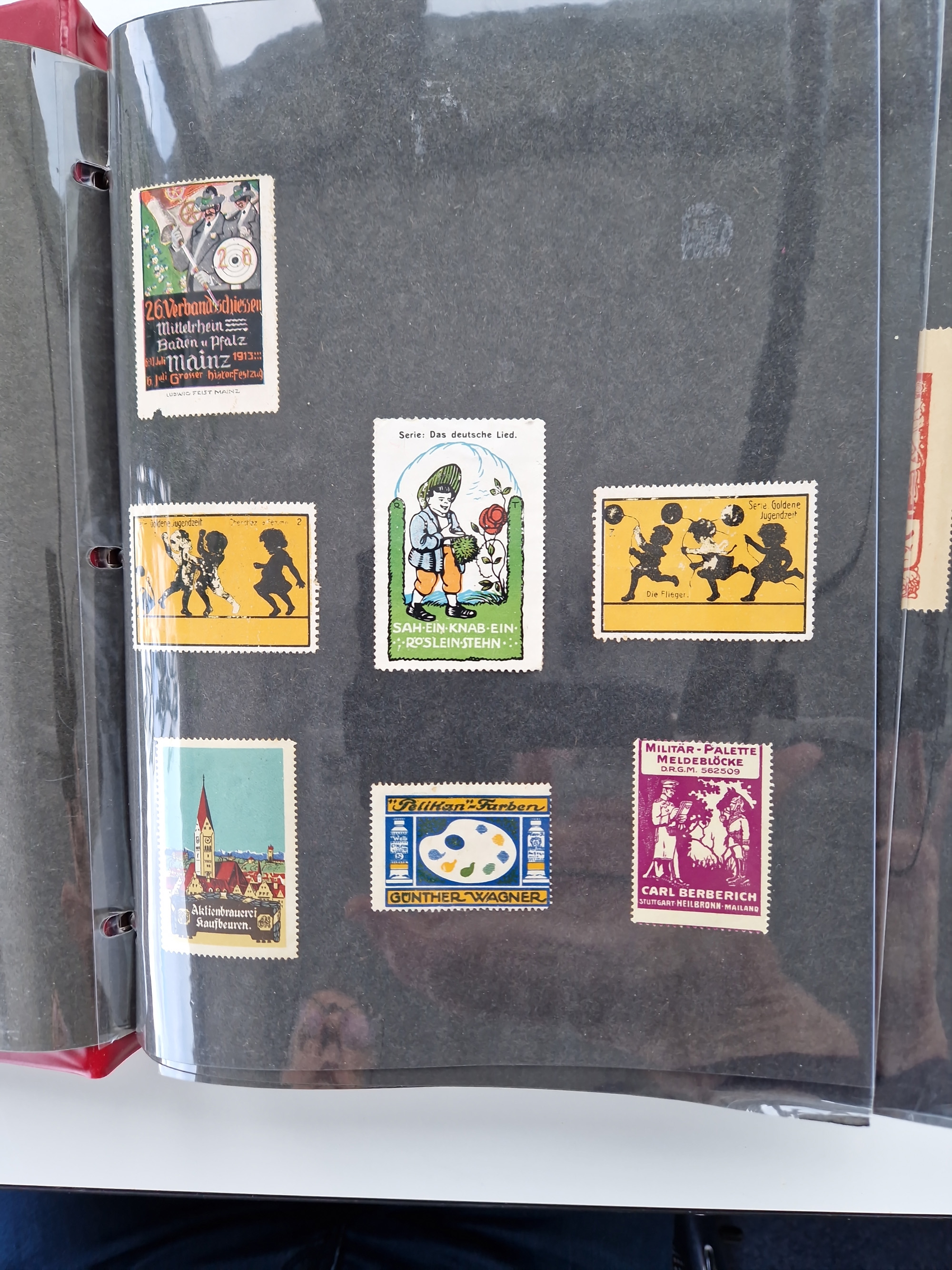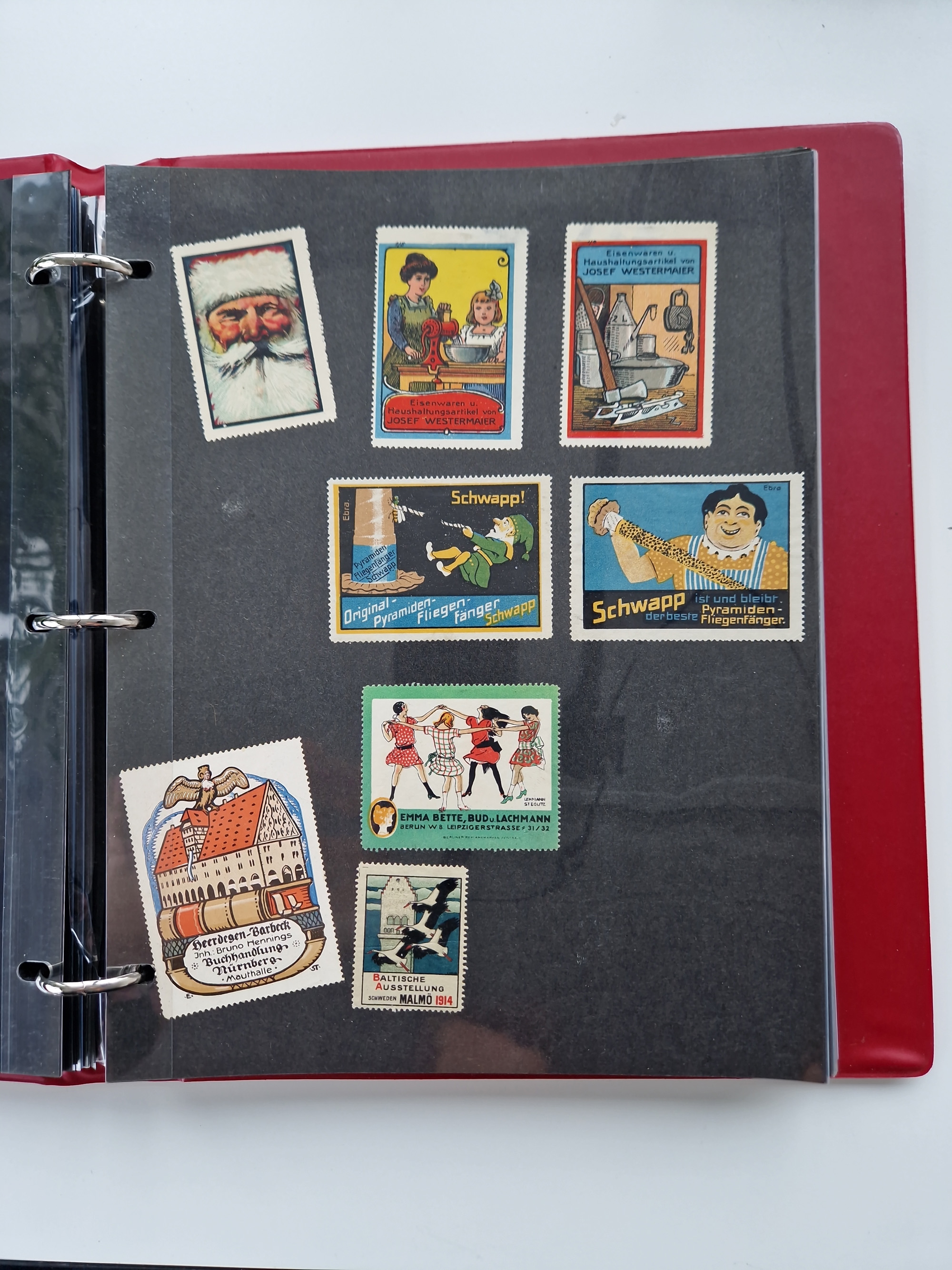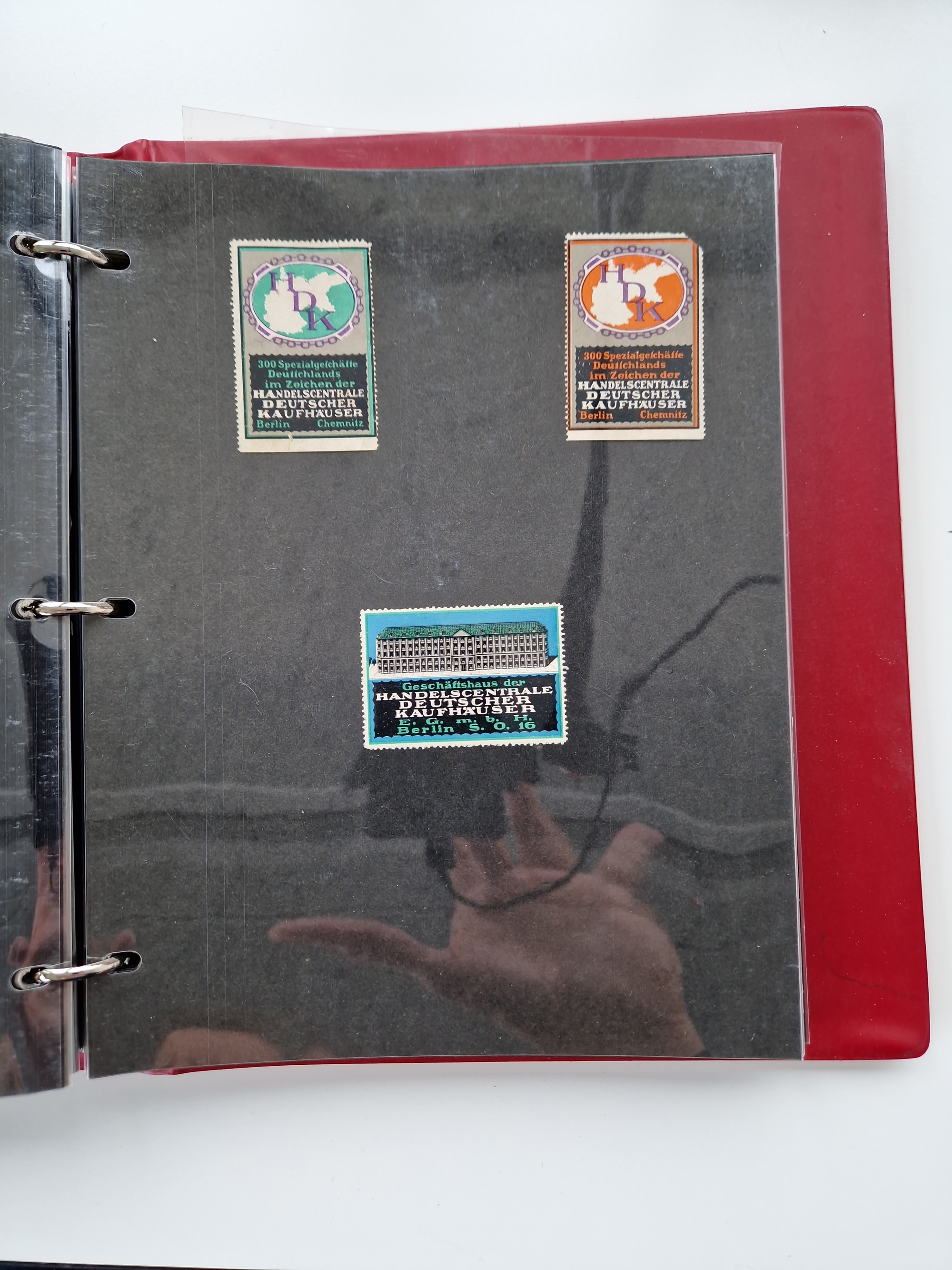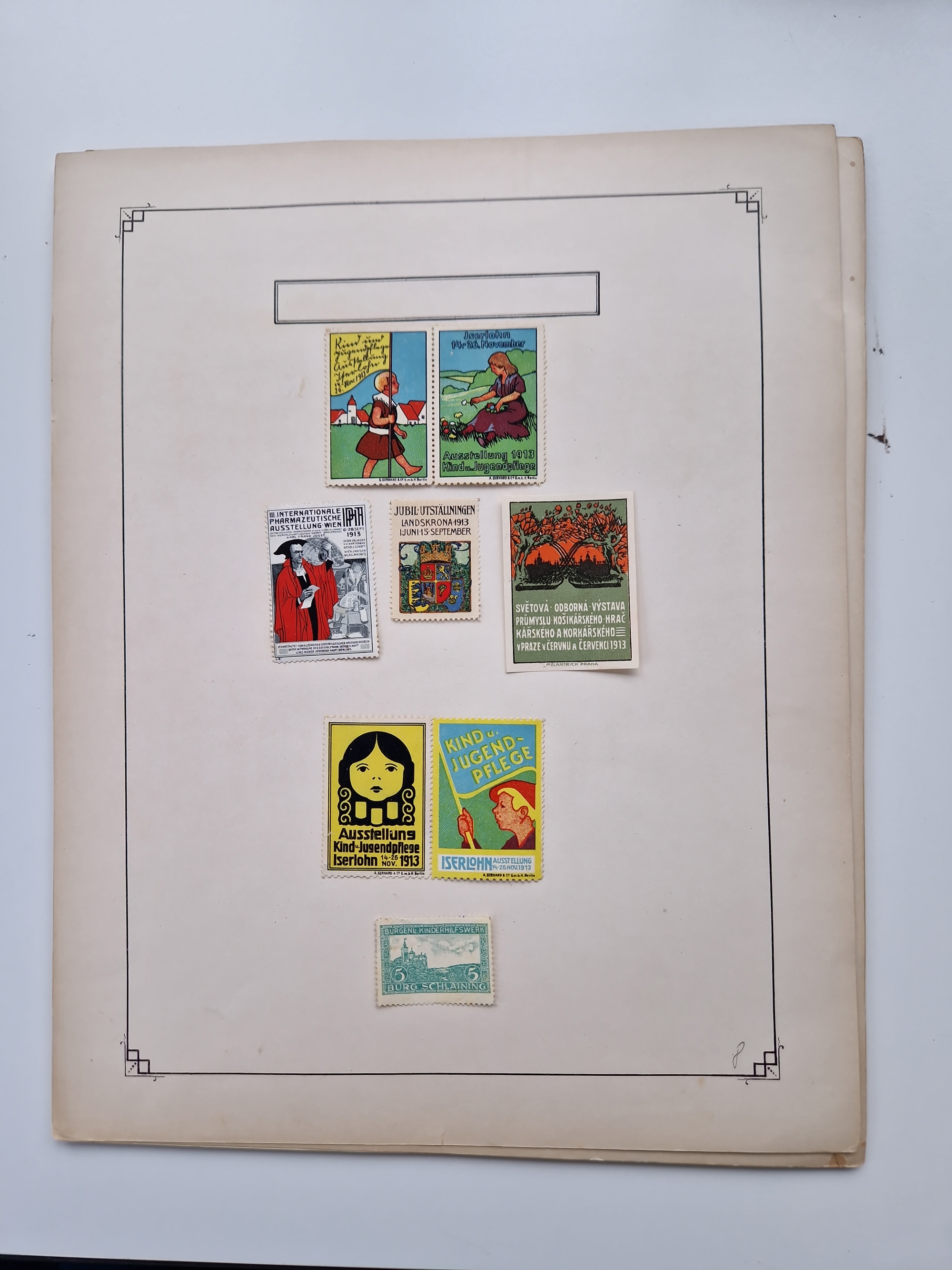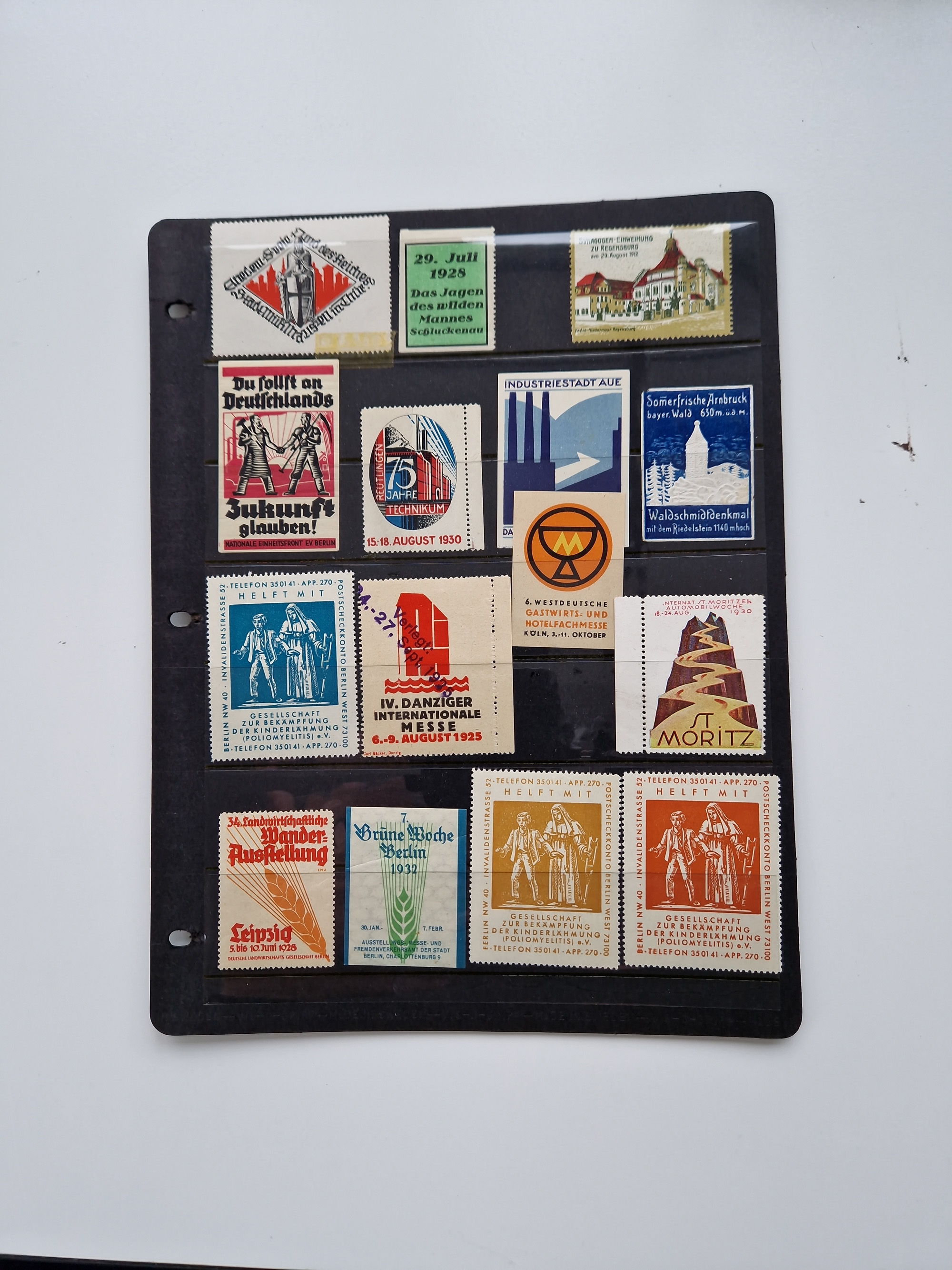 VIGNETTEN: 1896/1960 (ca.), hochinteressanter Bestand mit einigen Tausend Vignetten, Verschluss- und Siegelmarken, später Spendenvignetten und -Blocks, dabei viele zu unterschiedlichen Ausstellungen, meist aus Berlin, München, Nürnberg, Leipzig mit Export-Messe, ferner aber auch Luftpost-Ausstellung, Gewerbe- und Industrieschau, Landwirtschaft, Kunst, Firmenvignetten, etc., etwas zu Briefmarken-Ausstellungen, dabei auch drei Hessheimer Entwürfe, vieles auf amerikanischen Händlerkarten und Loskarten, in drei Kartons
