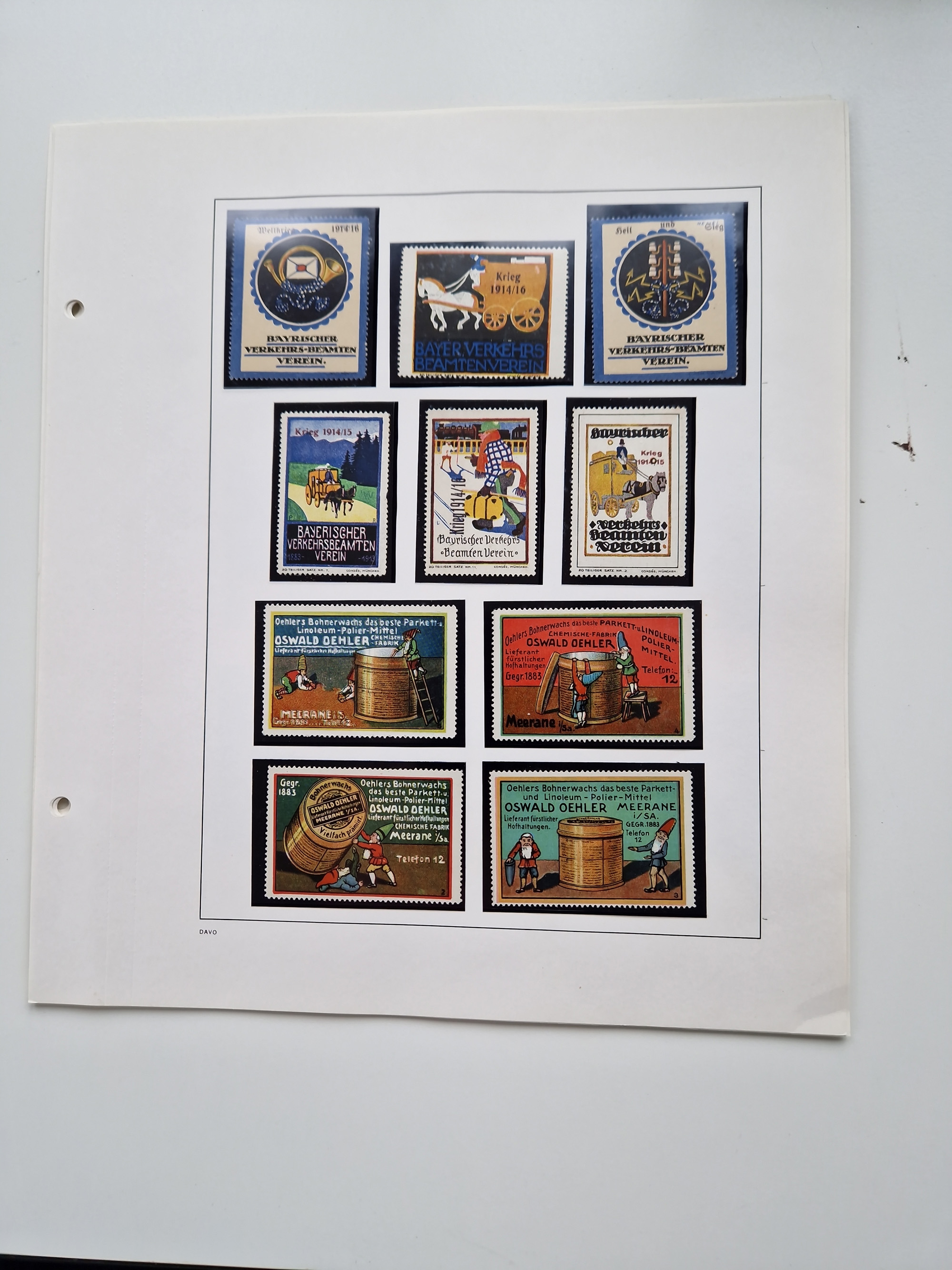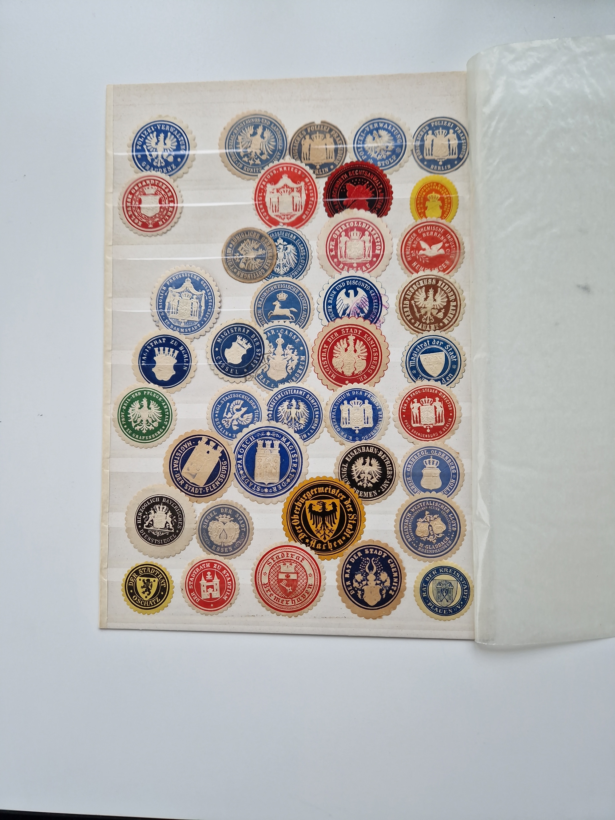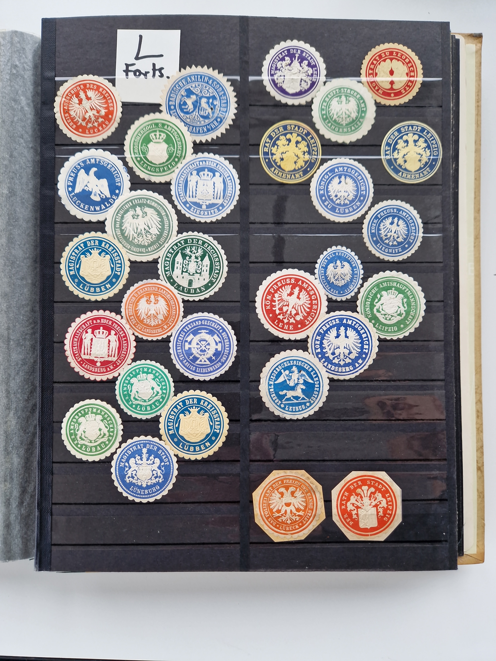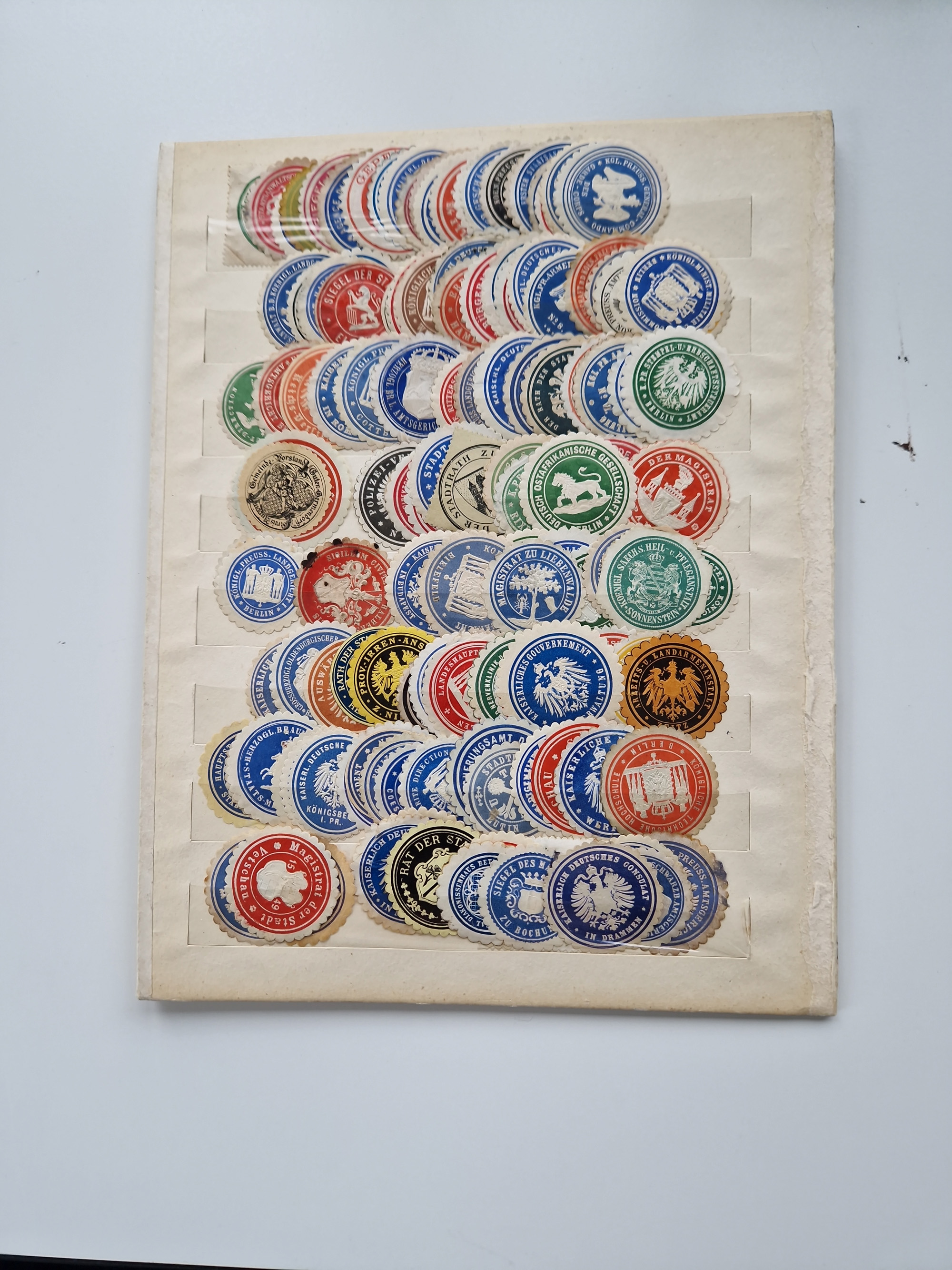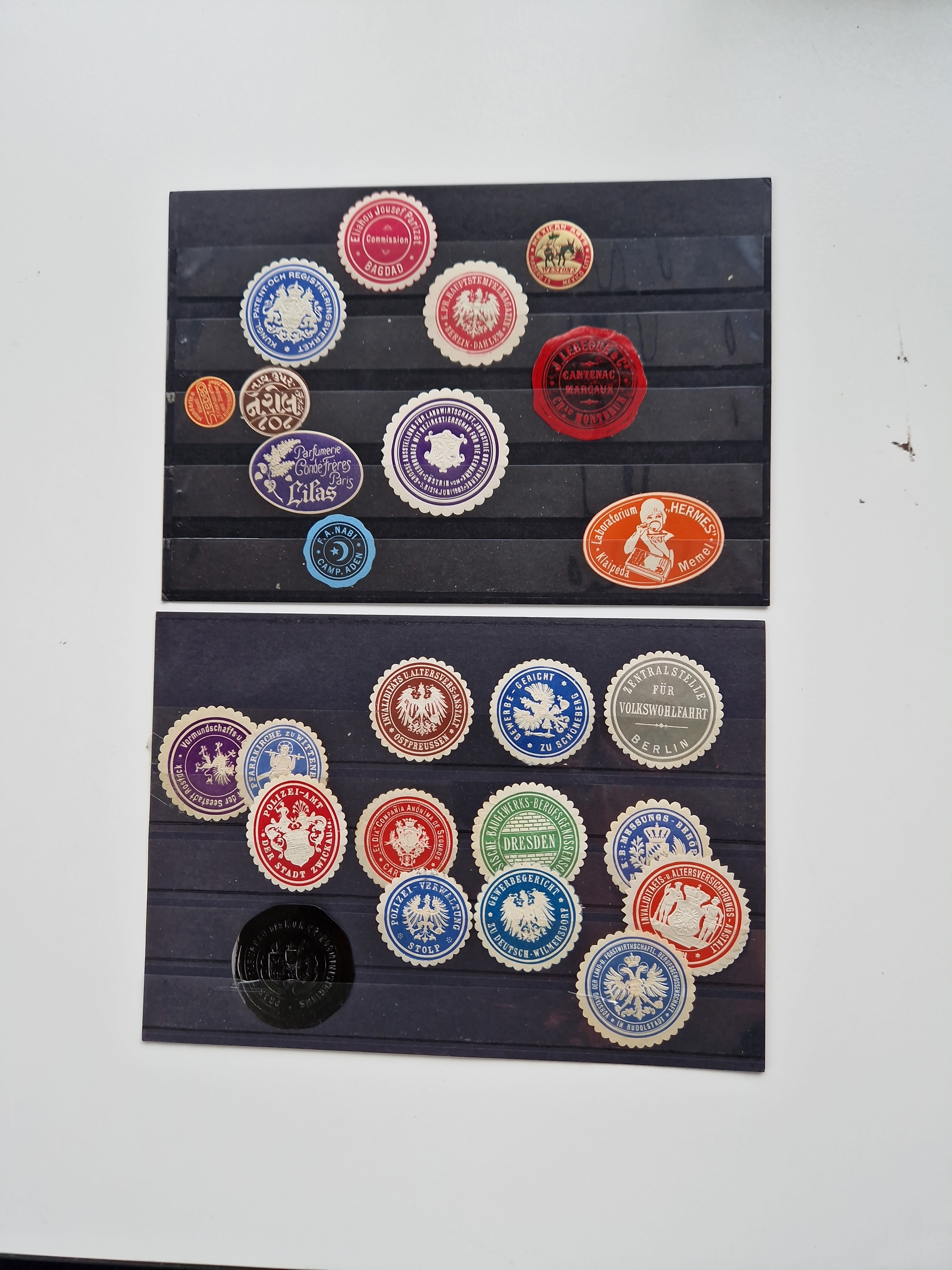 VIGNETTEN: 1896/1960 (ca.), hochinteressanter Bestand mit einigen Tausend Vignetten, Verschluss- und Siegelmarken, später Spendenvignetten und -Blocks, dabei viele zu unterschiedlichen Ausstellungen, meist aus Berlin, München, Nürnberg, Leipzig mit Export-Messe, ferner aber auch Luftpost-Ausstellung, Gewerbe- und Industrieschau, Landwirtschaft, Kunst, Firmenvignetten, etc., etwas zu Briefmarken-Ausstellungen, dabei auch drei Hessheimer Entwürfe, vieles auf amerikanischen Händlerkarten und Loskarten, in drei Kartons
