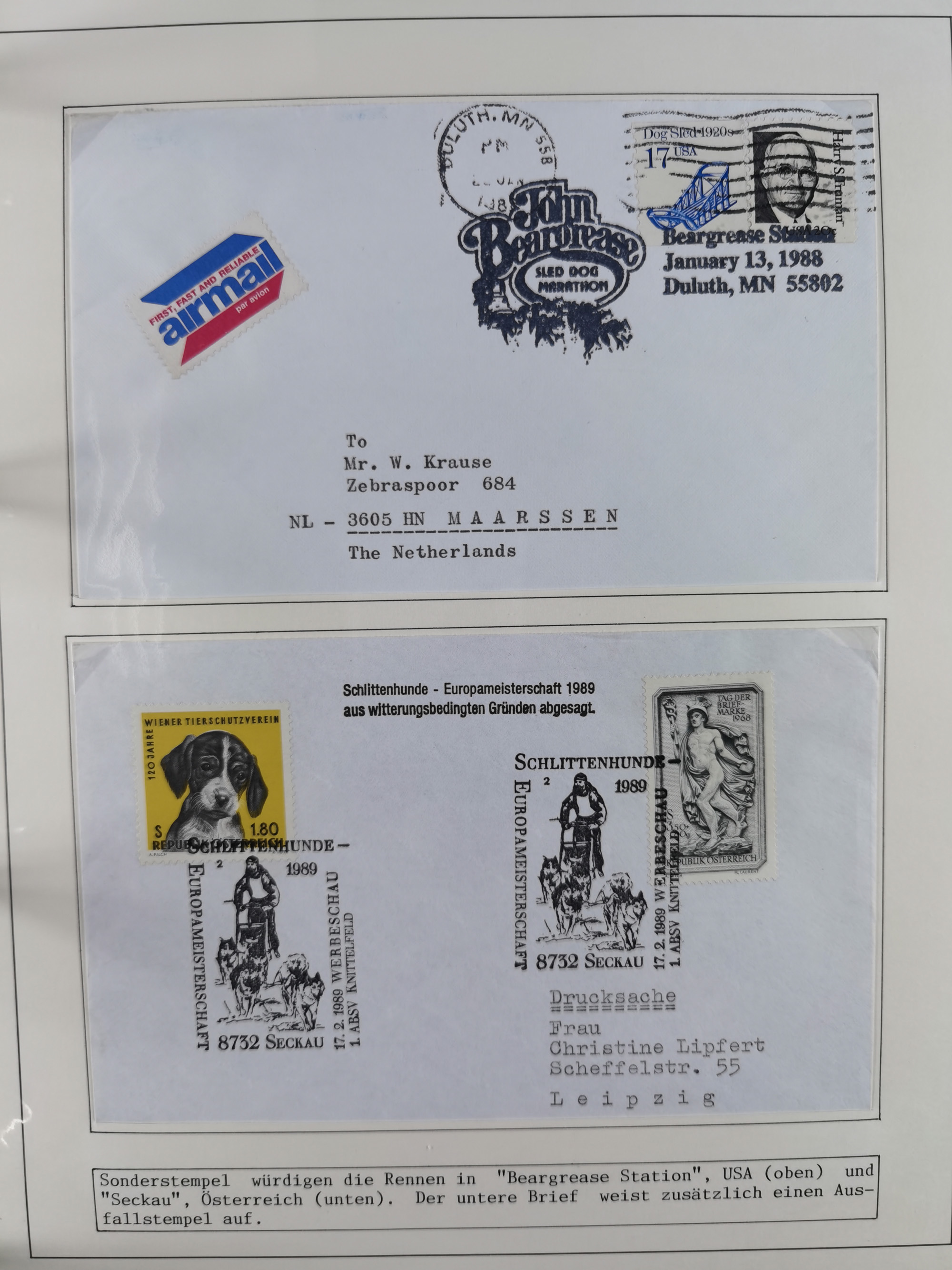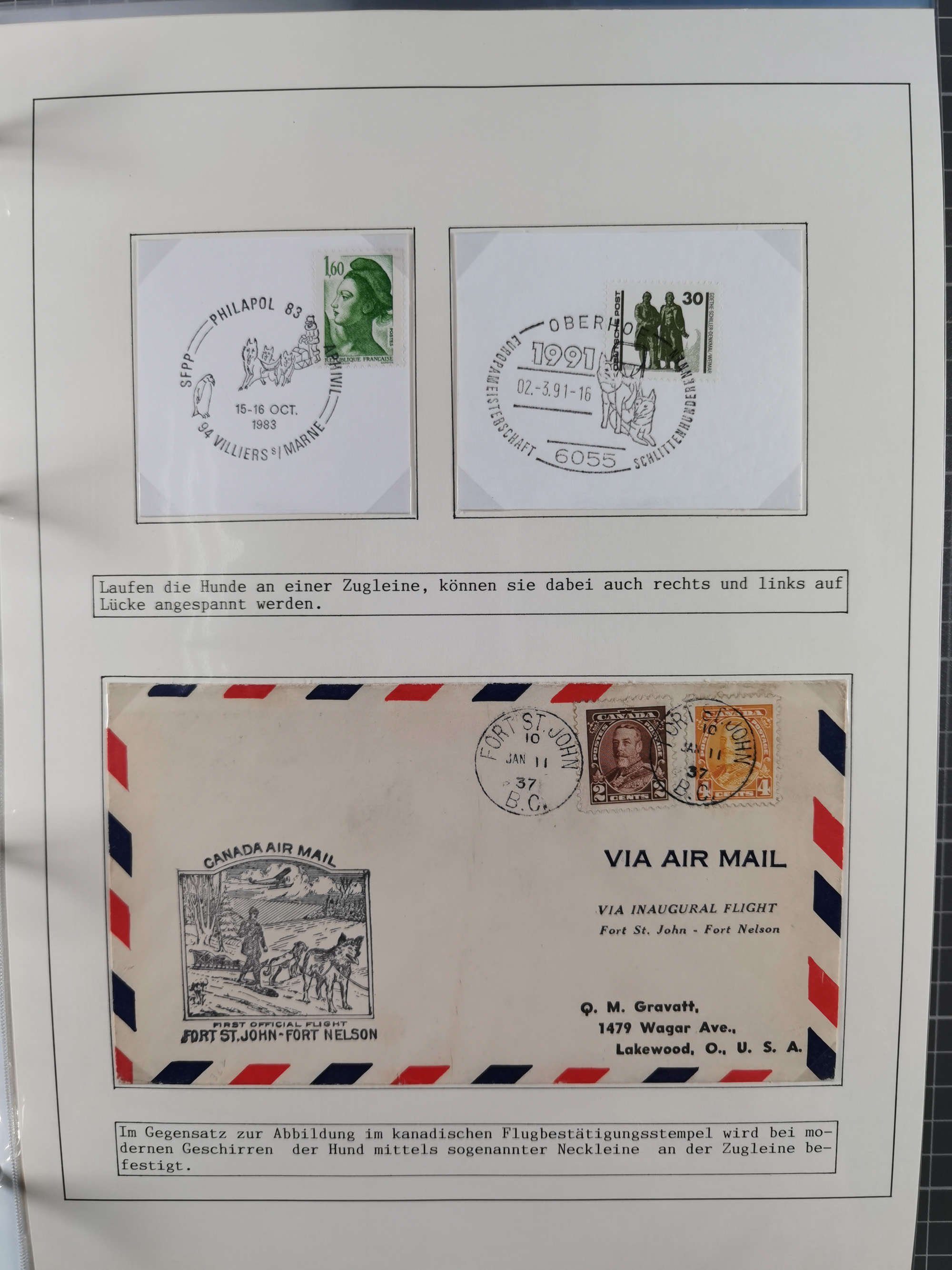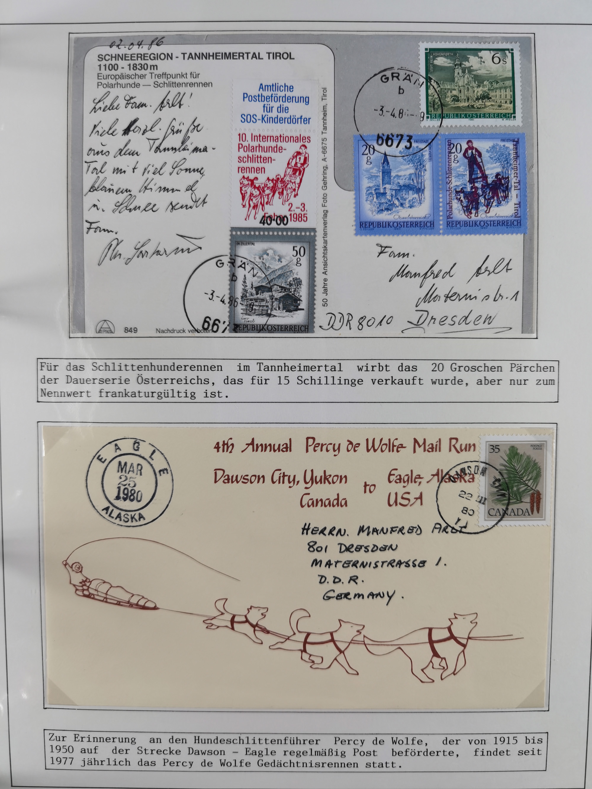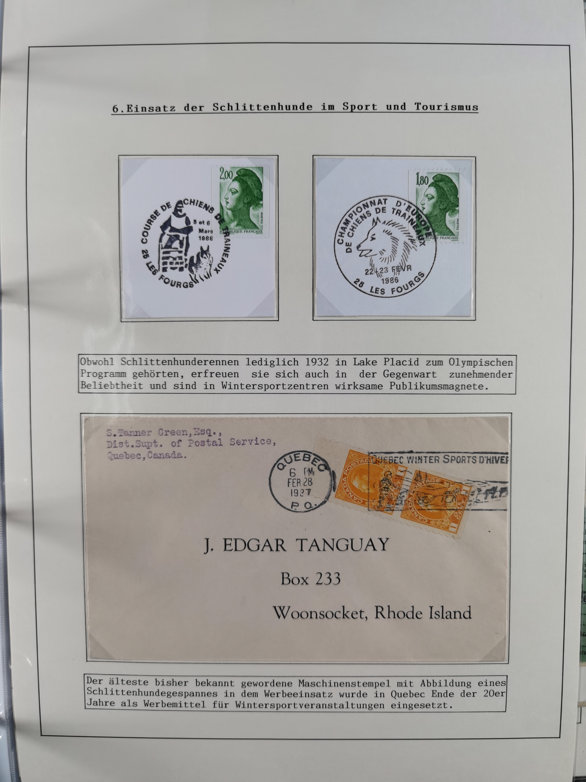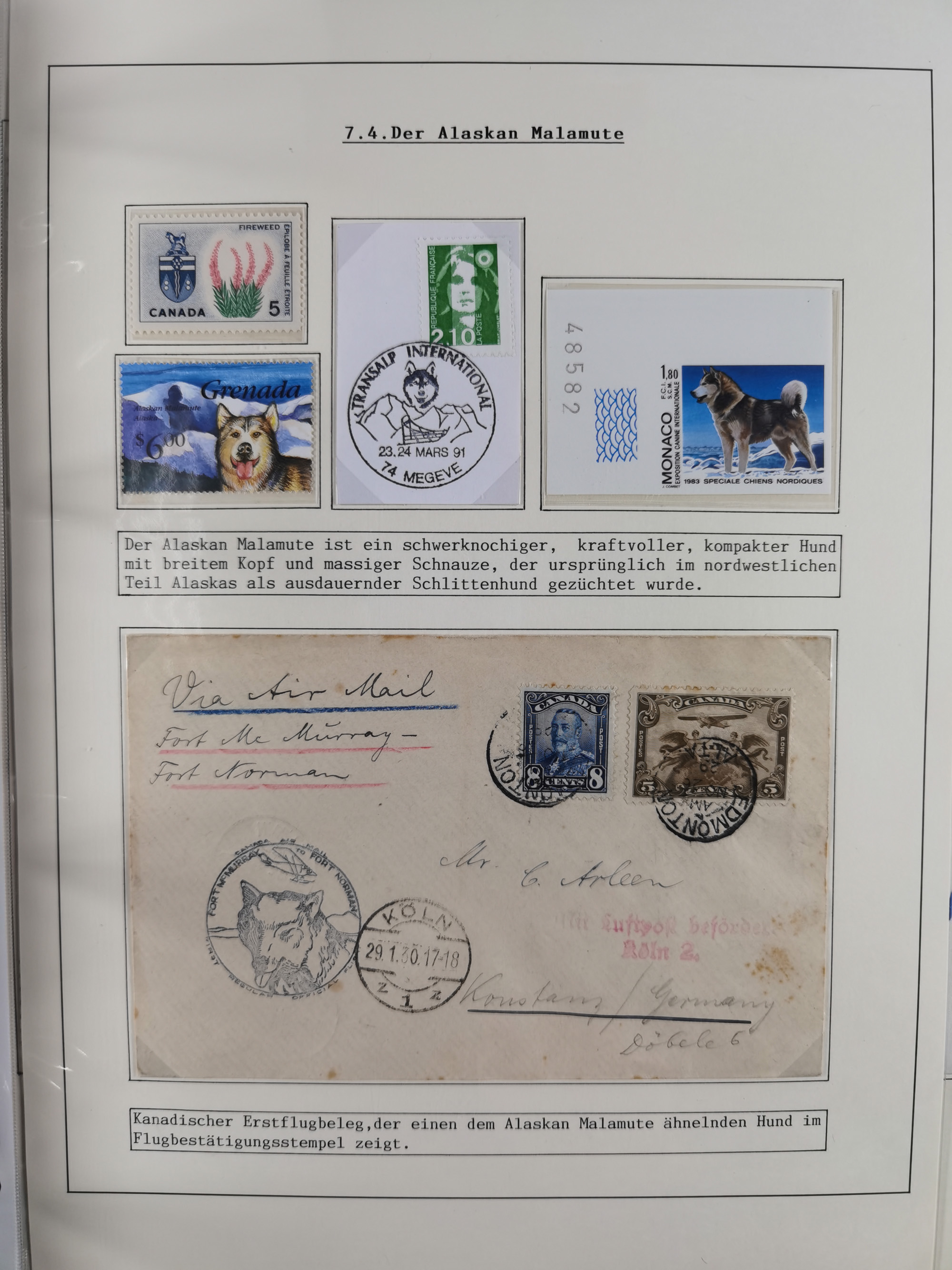 HUNDE: 1894/1992 (ca.), interessante Ausstellungssammlung “Schlittenhunde im Einsatz”, mit vielen Marken, FDCs, Schmuckbriefen, Telefonkarten, dabei frühes und besseres Material, ferner etwas Literatur, in zwei Ordnern
