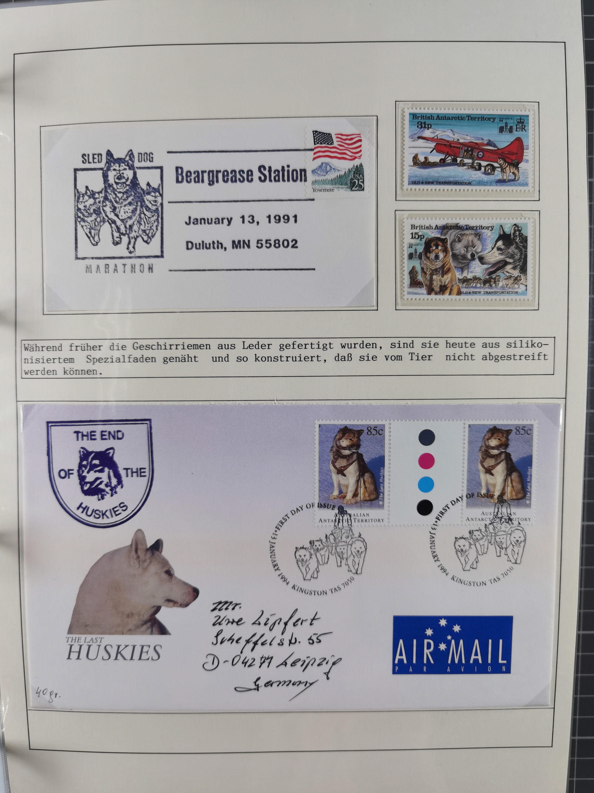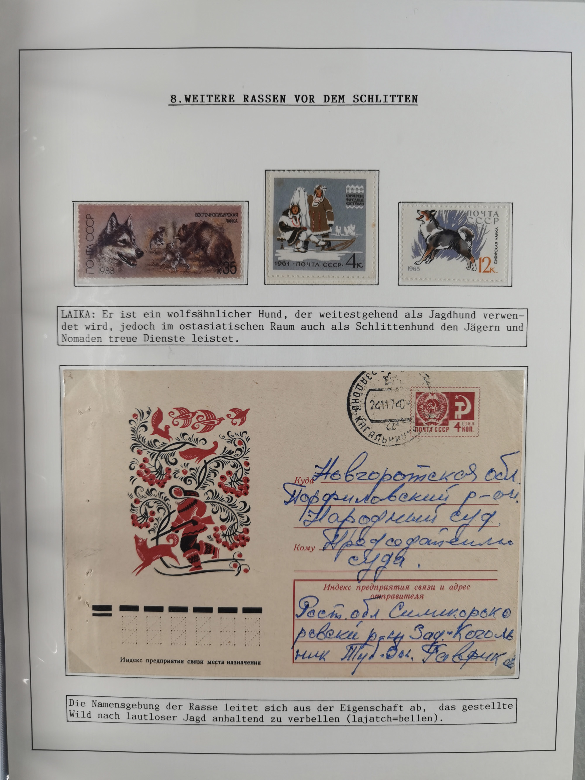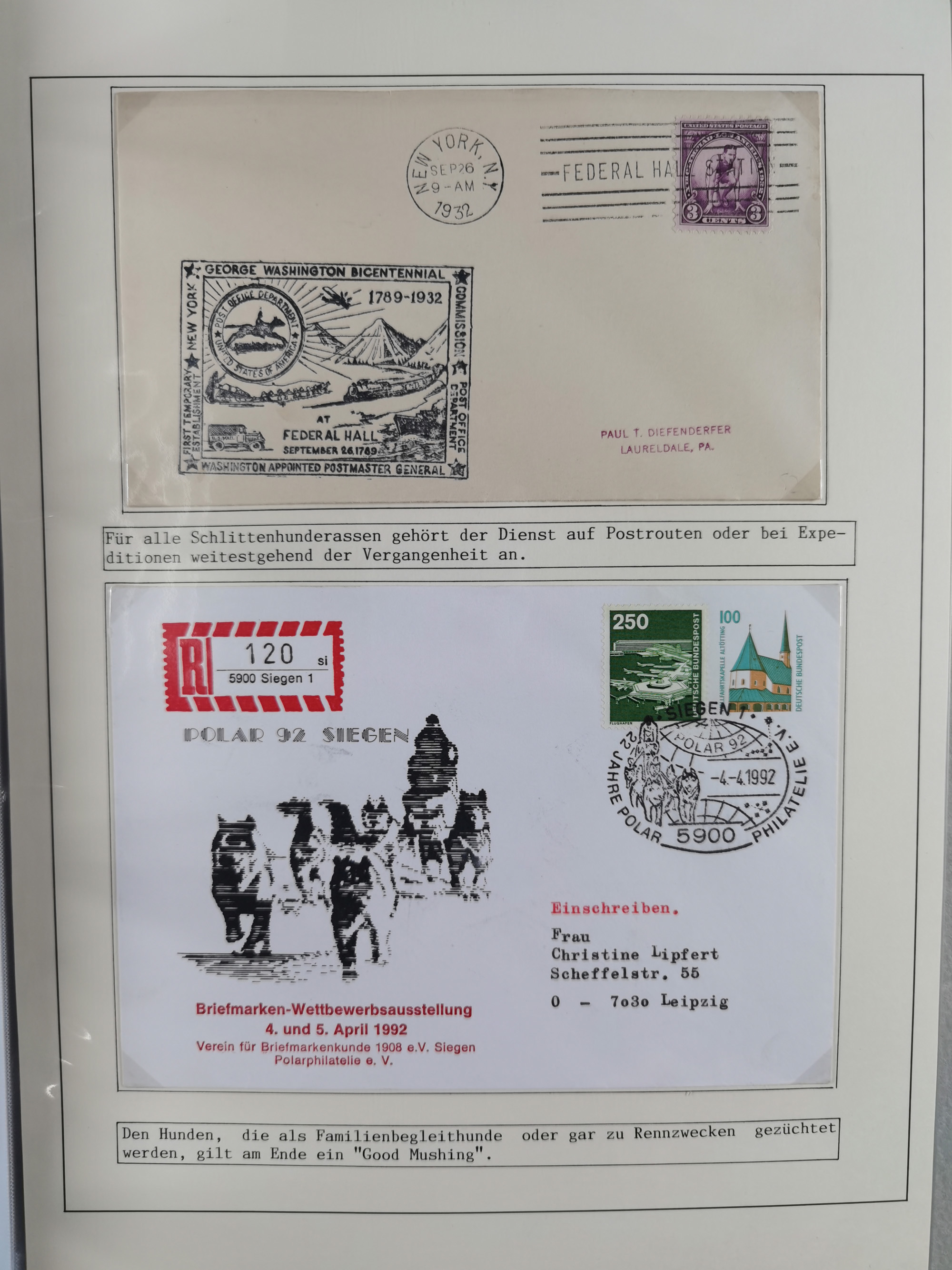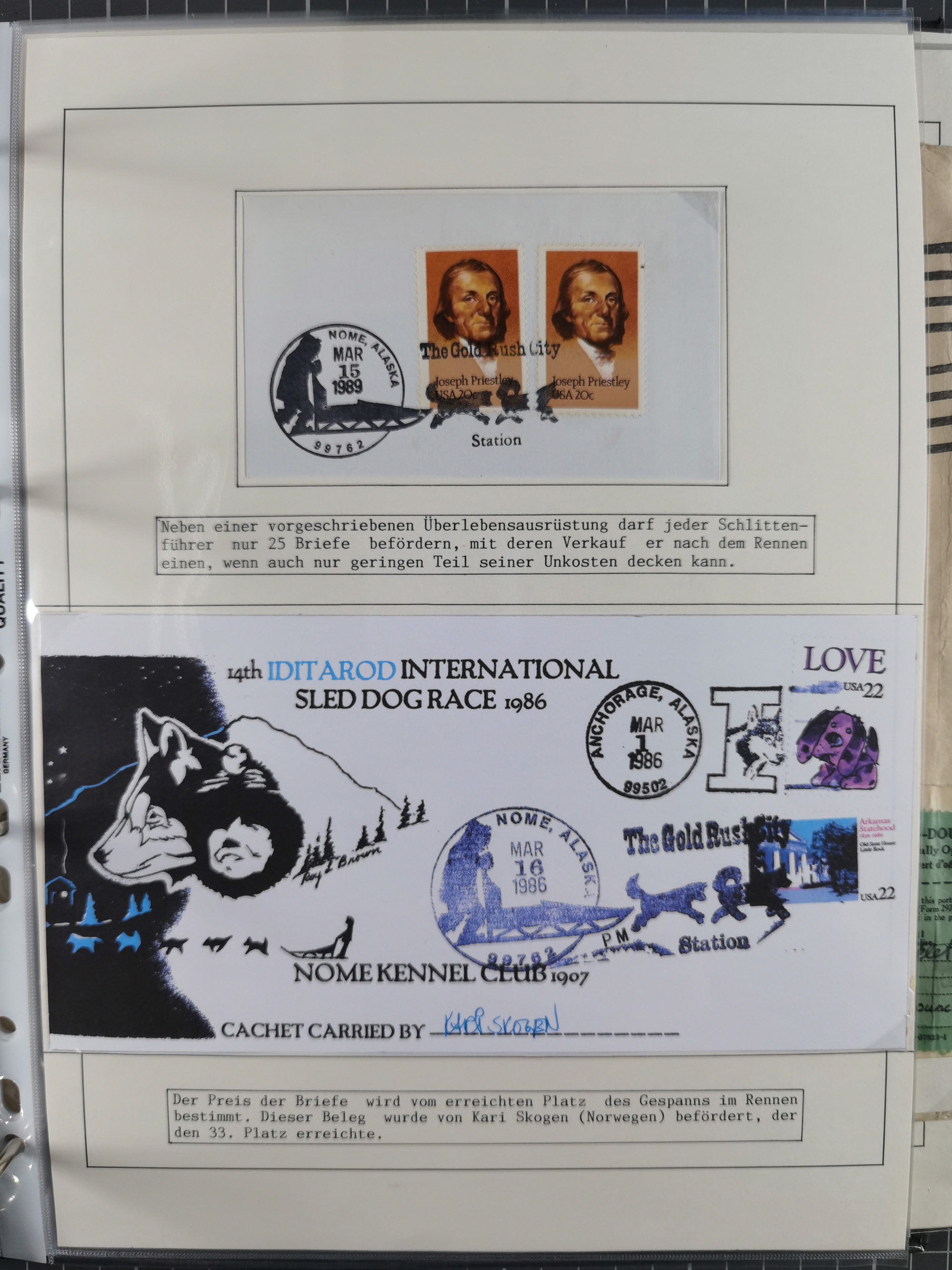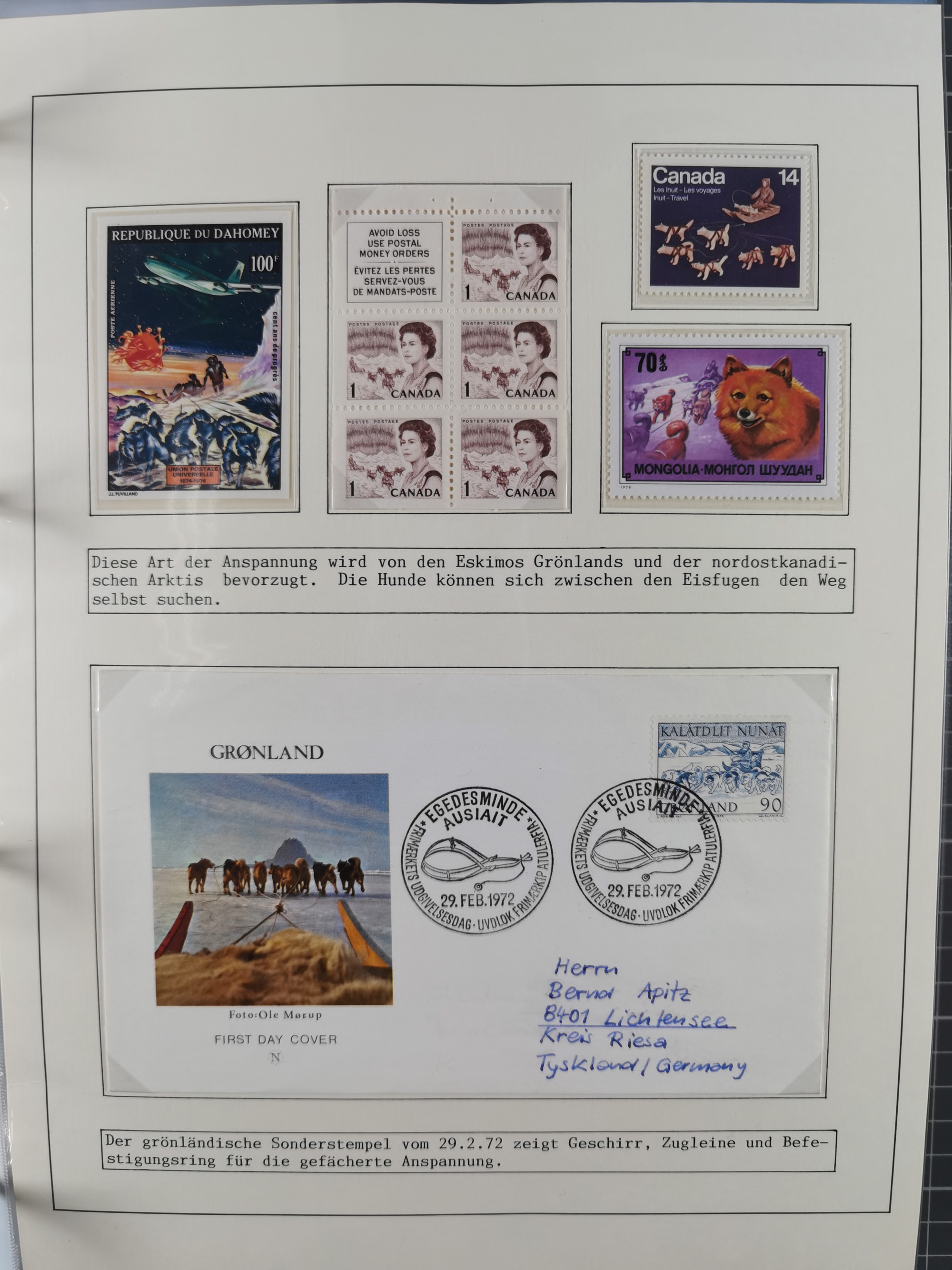 HUNDE: 1894/1992 (ca.), interessante Ausstellungssammlung “Schlittenhunde im Einsatz”, mit vielen Marken, FDCs, Schmuckbriefen, Telefonkarten, dabei frühes und besseres Material, ferner etwas Literatur, in zwei Ordnern